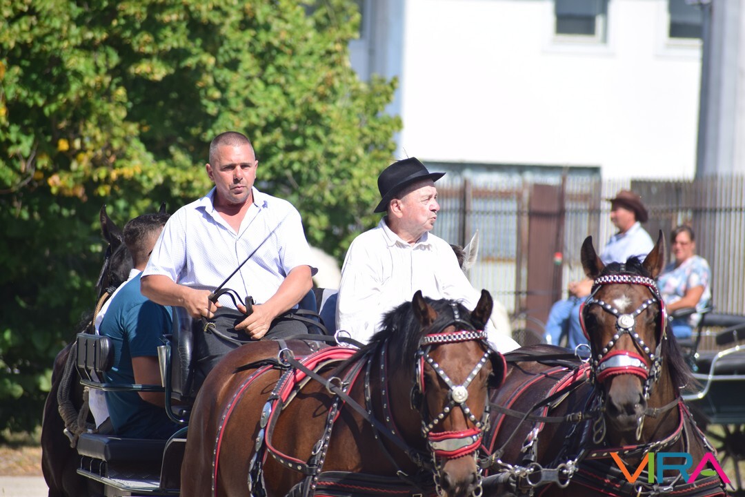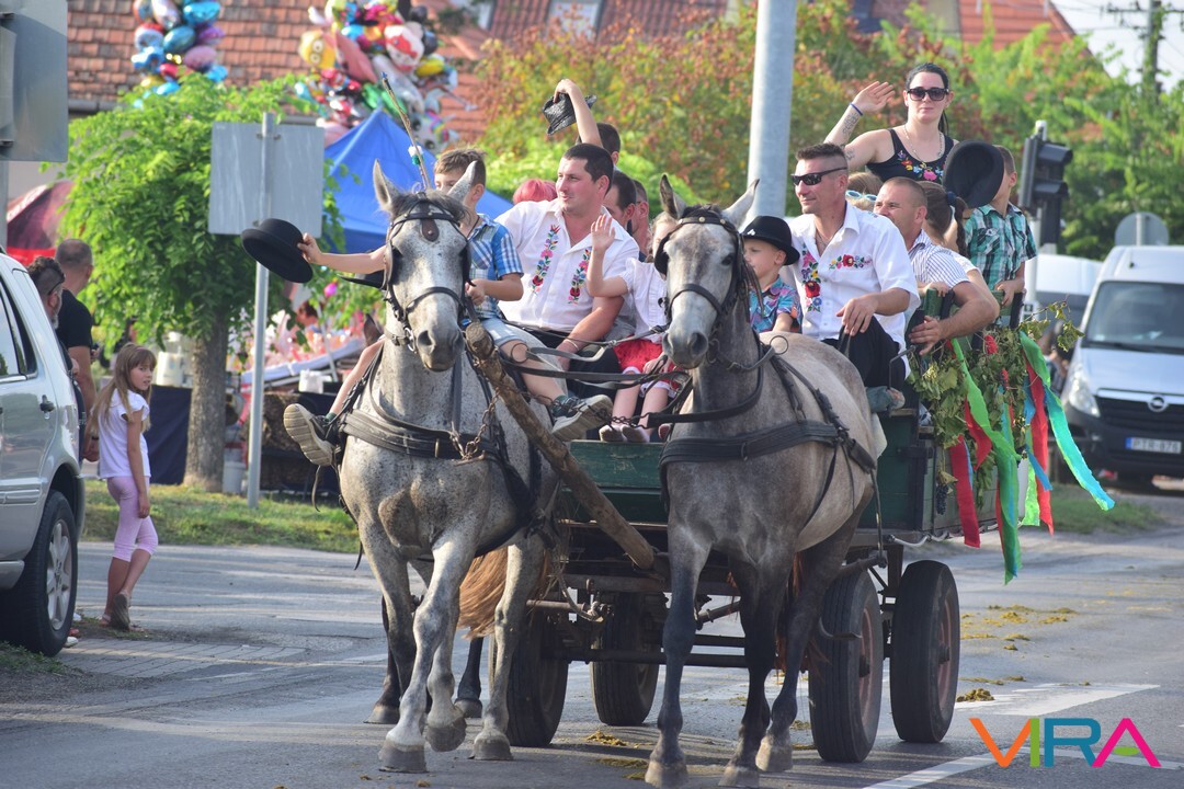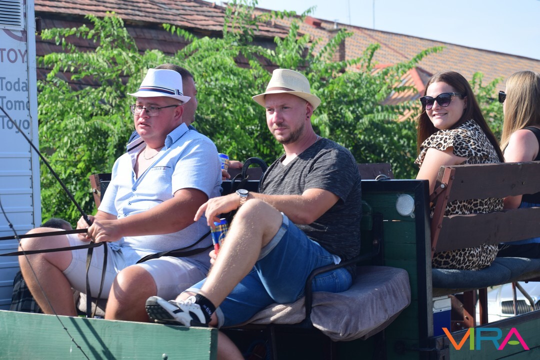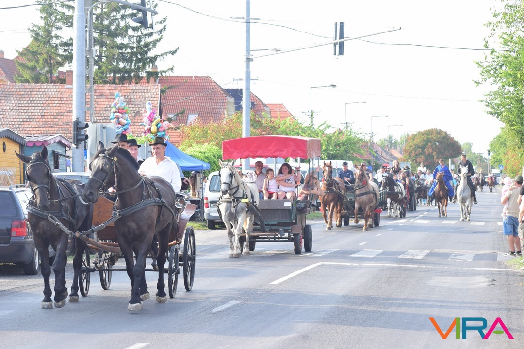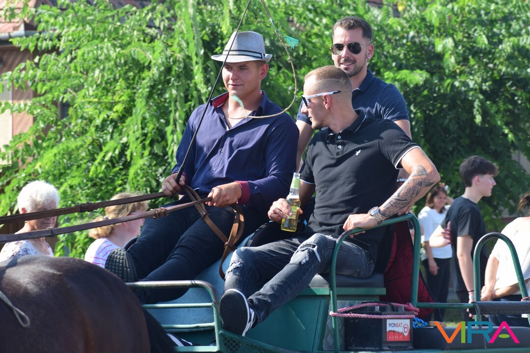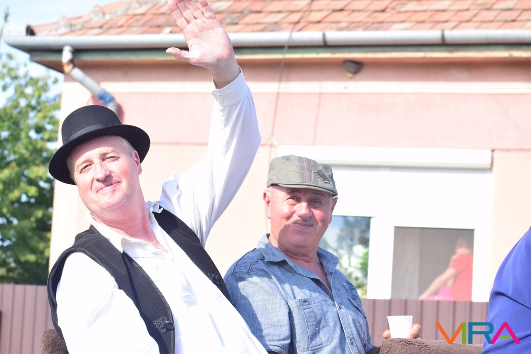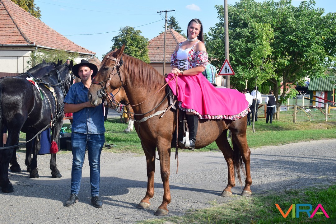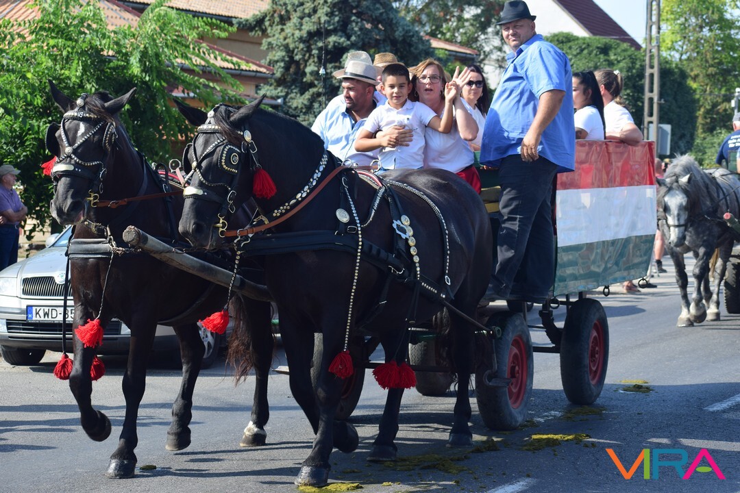 Ezt követően indult el Akasztó utcáin a közel ötven kocsit számláló szüreti menet, a csikósok, fogatosok, kocsisok és lóhátasok látványos felvonulásam melyre nem csak helyből, hanem a környező településekről is érkeztek. A gyülekező és a fogadás a Stadler Stadion mellett volt, ahol finom pörköltekkel és hideg italokkal várták a felvonulásra érkezőket. A szüreti felvonulást idén is az Akasztói Lovas Egyesület szervezte. A meneten a jó hangulathoz a talpalávalót Oroszi Sándor szolgáltatta.