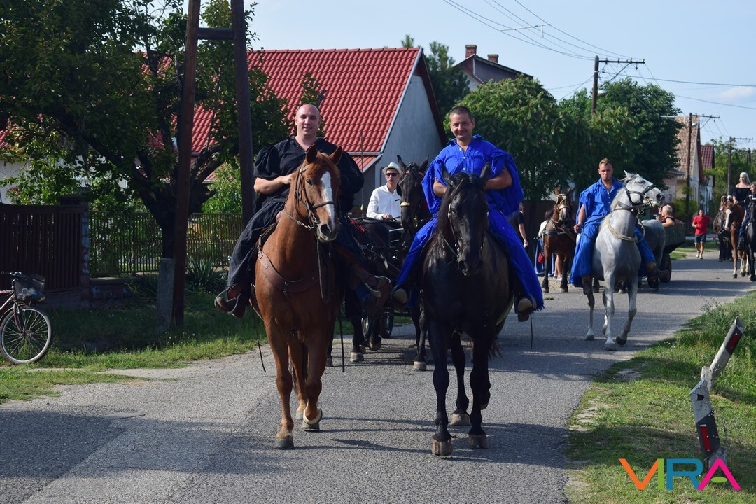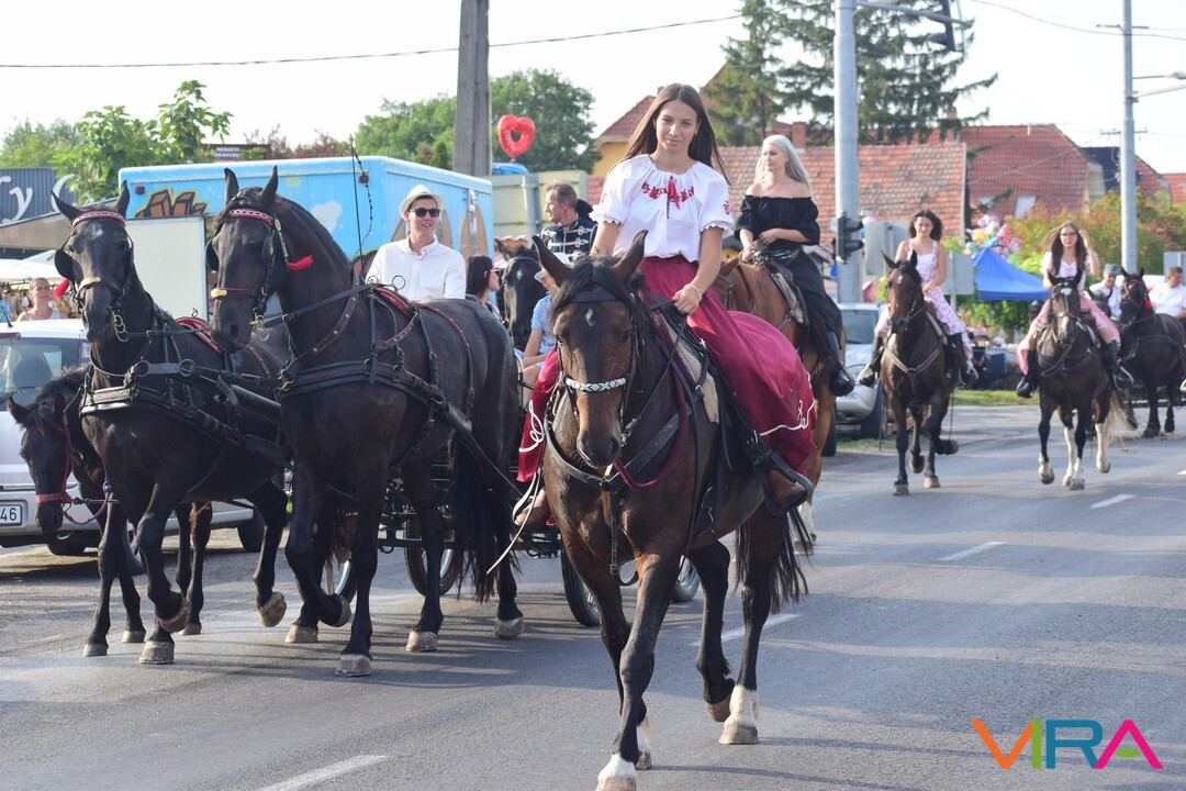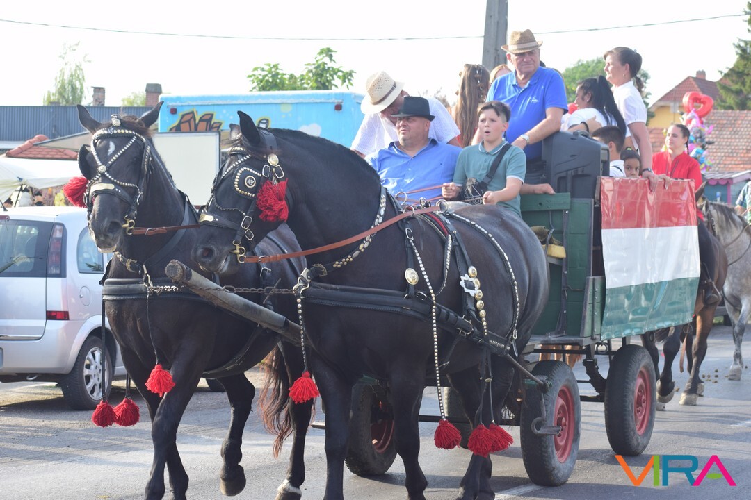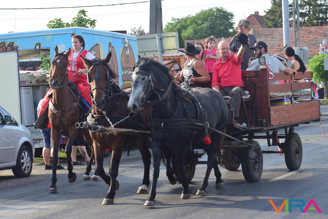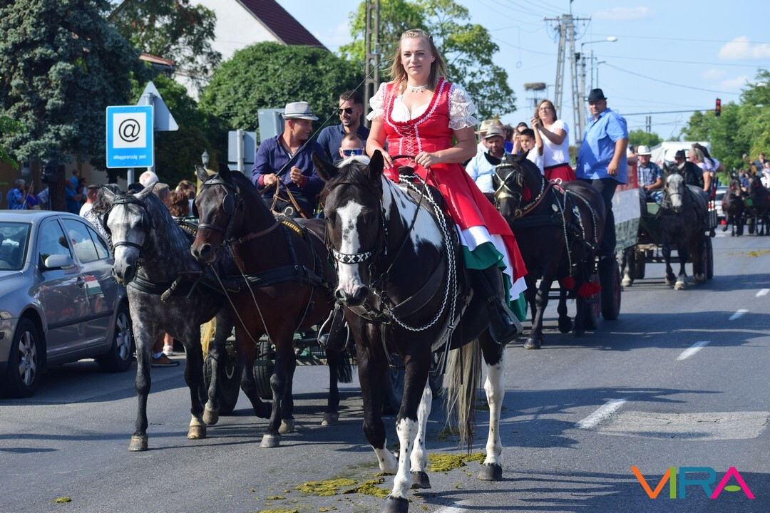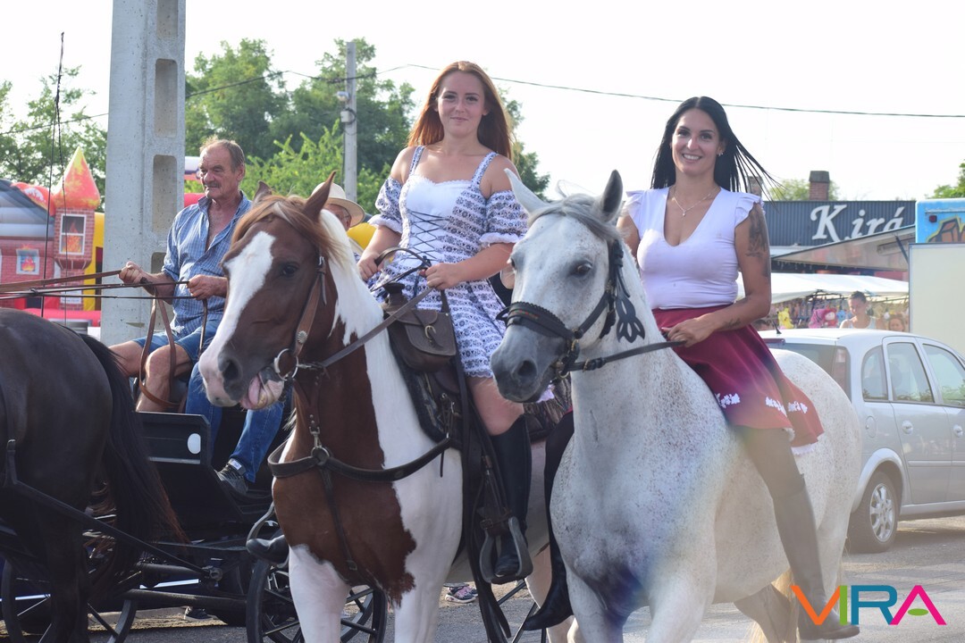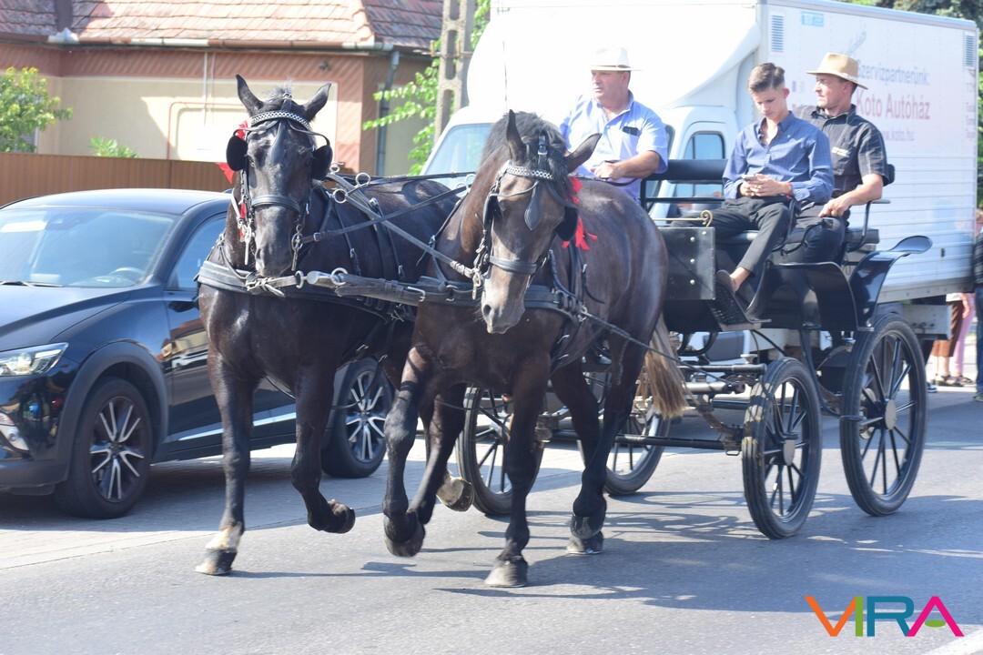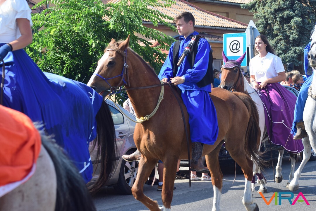 Ezt követően indult el Akasztó utcáin a közel ötven kocsit számláló szüreti menet, a csikósok, fogatosok, kocsisok és lóhátasok látványos felvonulásam melyre nem csak helyből, hanem a környező településekről is érkeztek. A gyülekező és a fogadás a Stadler Stadion mellett volt, ahol finom pörköltekkel és hideg italokkal várták a felvonulásra érkezőket. A szüreti felvonulást idén is az Akasztói Lovas Egyesület szervezte. A meneten a jó hangulathoz a talpalávalót Oroszi Sándor szolgáltatta.