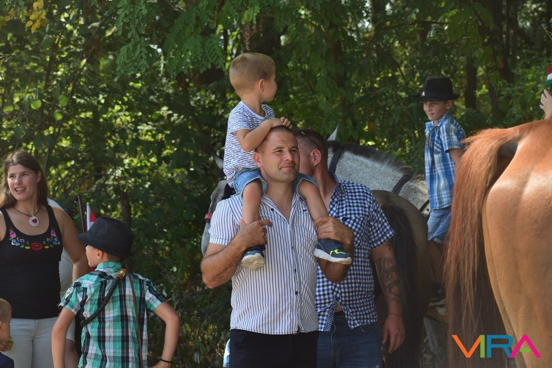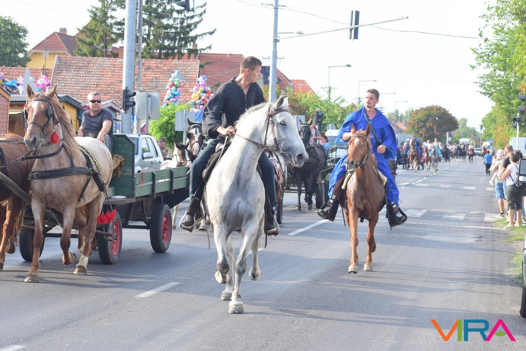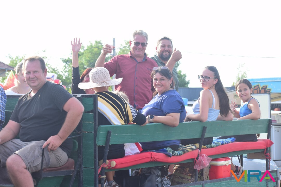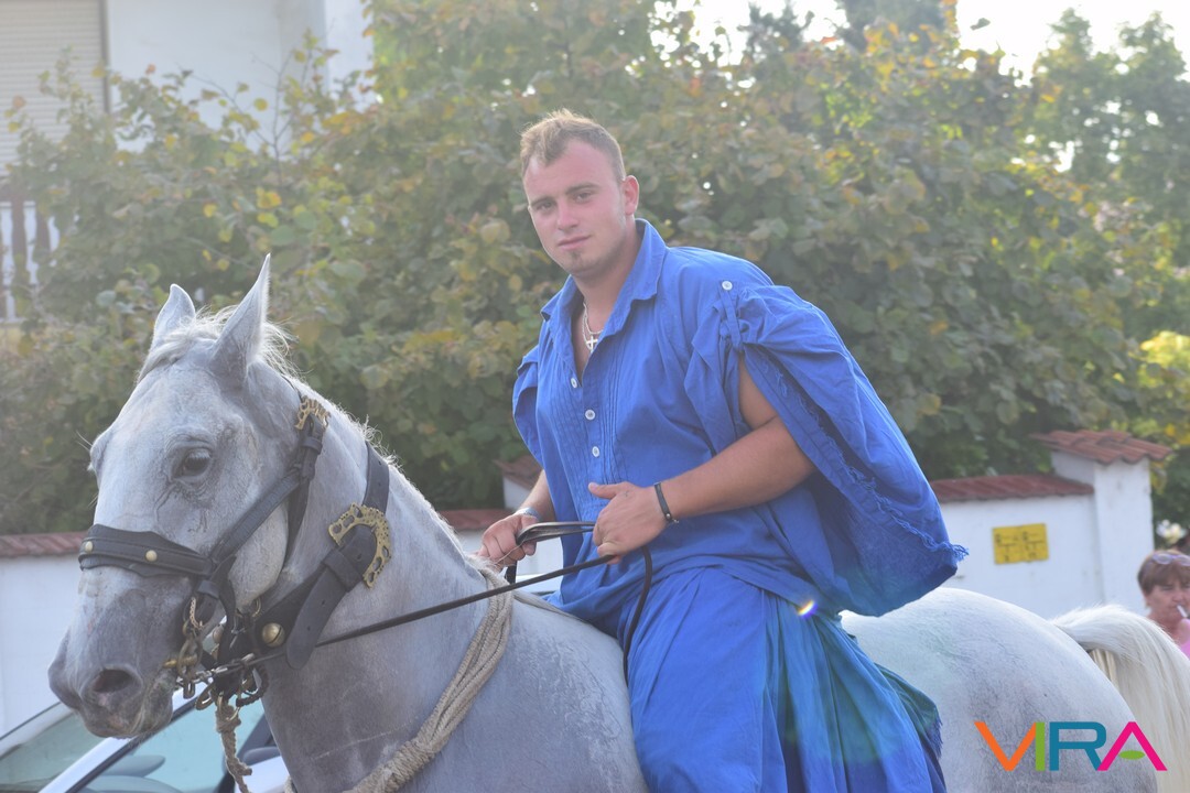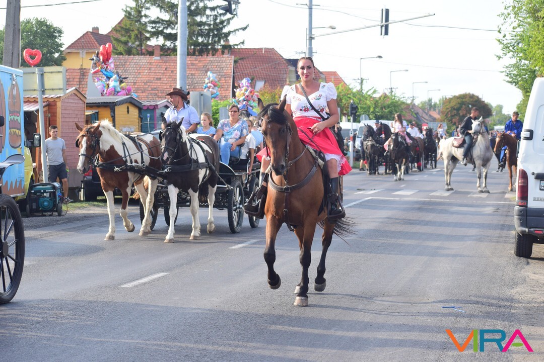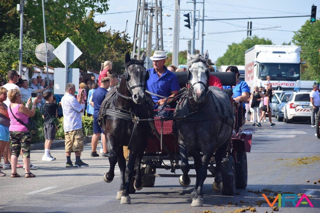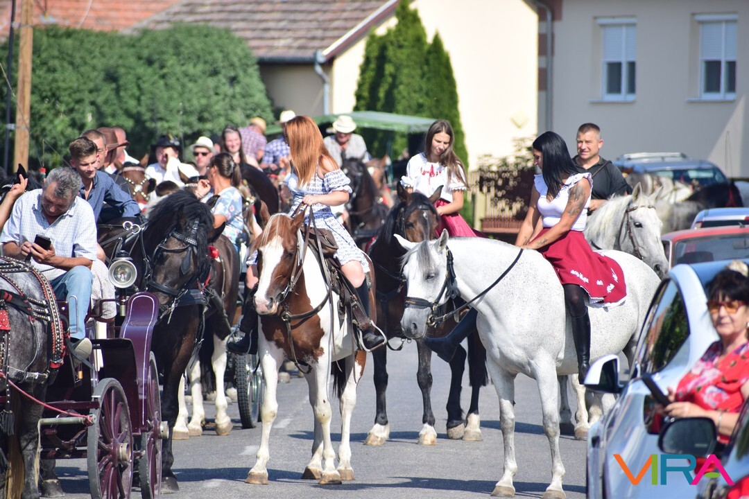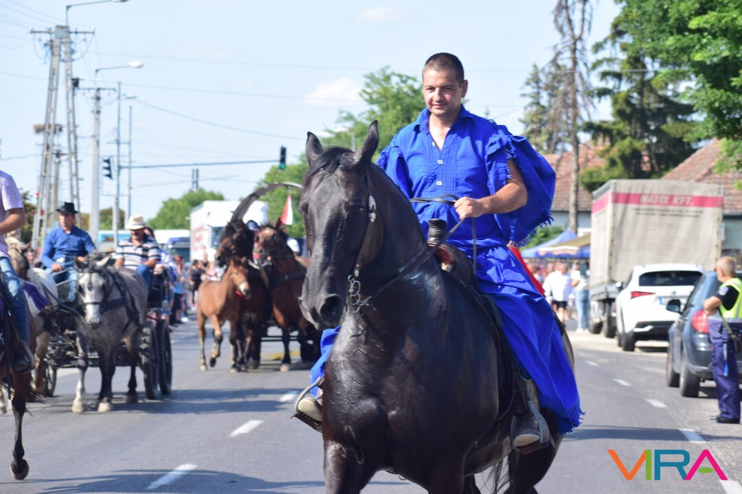 Ezt követően indult el Akasztó utcáin a közel ötven kocsit számláló szüreti menet, a csikósok, fogatosok, kocsisok és lóhátasok látványos felvonulásam melyre nem csak helyből, hanem a környező településekről is érkeztek. A gyülekező és a fogadás a Stadler Stadion mellett volt, ahol finom pörköltekkel és hideg italokkal várták a felvonulásra érkezőket. A szüreti felvonulást idén is az Akasztói Lovas Egyesület szervezte. A meneten a jó hangulathoz a talpalávalót Oroszi Sándor szolgáltatta.