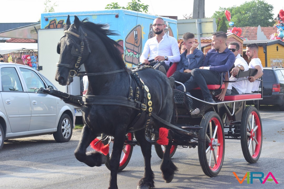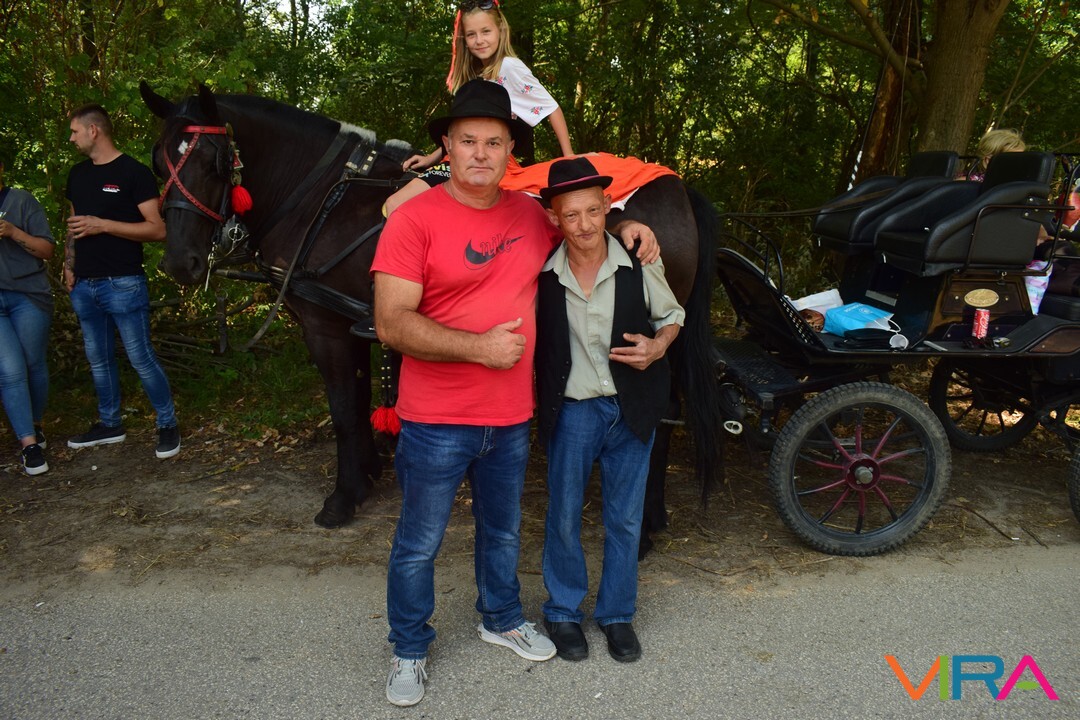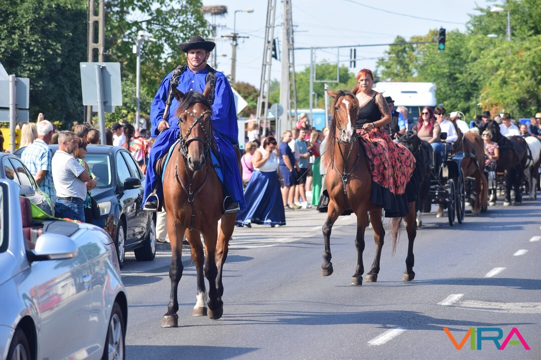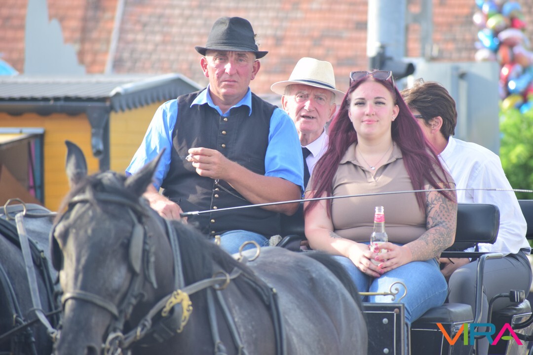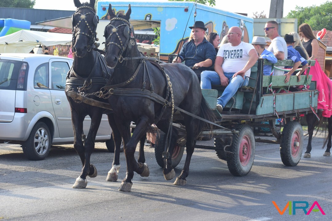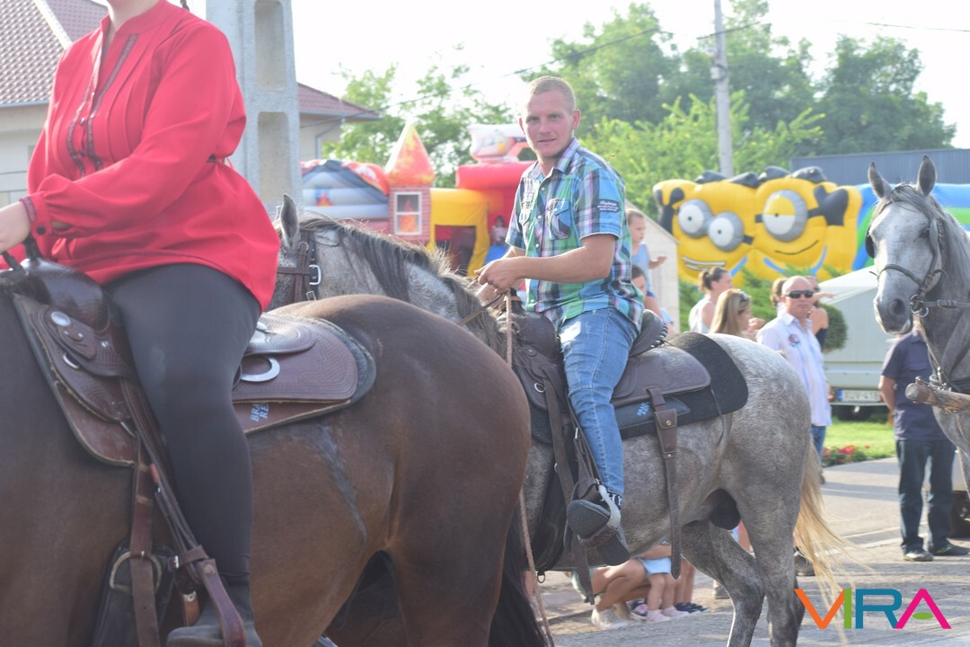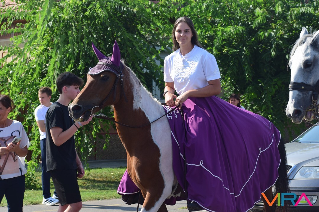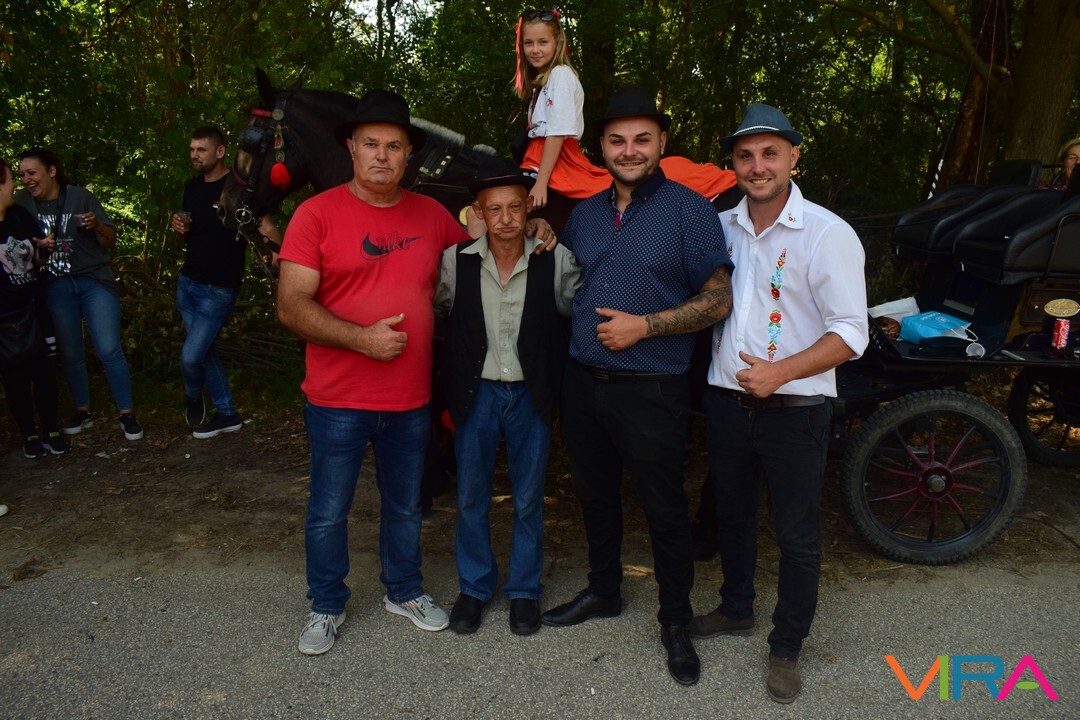 Ezt követően indult el Akasztó utcáin a közel ötven kocsit számláló szüreti menet, a csikósok, fogatosok, kocsisok és lóhátasok látványos felvonulásam melyre nem csak helyből, hanem a környező településekről is érkeztek. A gyülekező és a fogadás a Stadler Stadion mellett volt, ahol finom pörköltekkel és hideg italokkal várták a felvonulásra érkezőket. A szüreti felvonulást idén is az Akasztói Lovas Egyesület szervezte. A meneten a jó hangulathoz a talpalávalót Oroszi Sándor szolgáltatta.