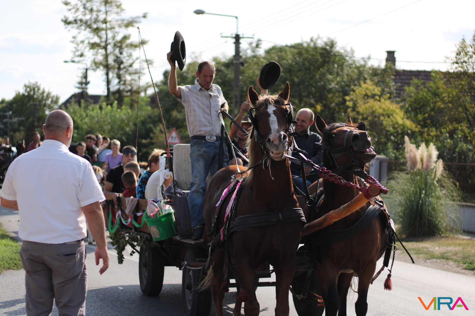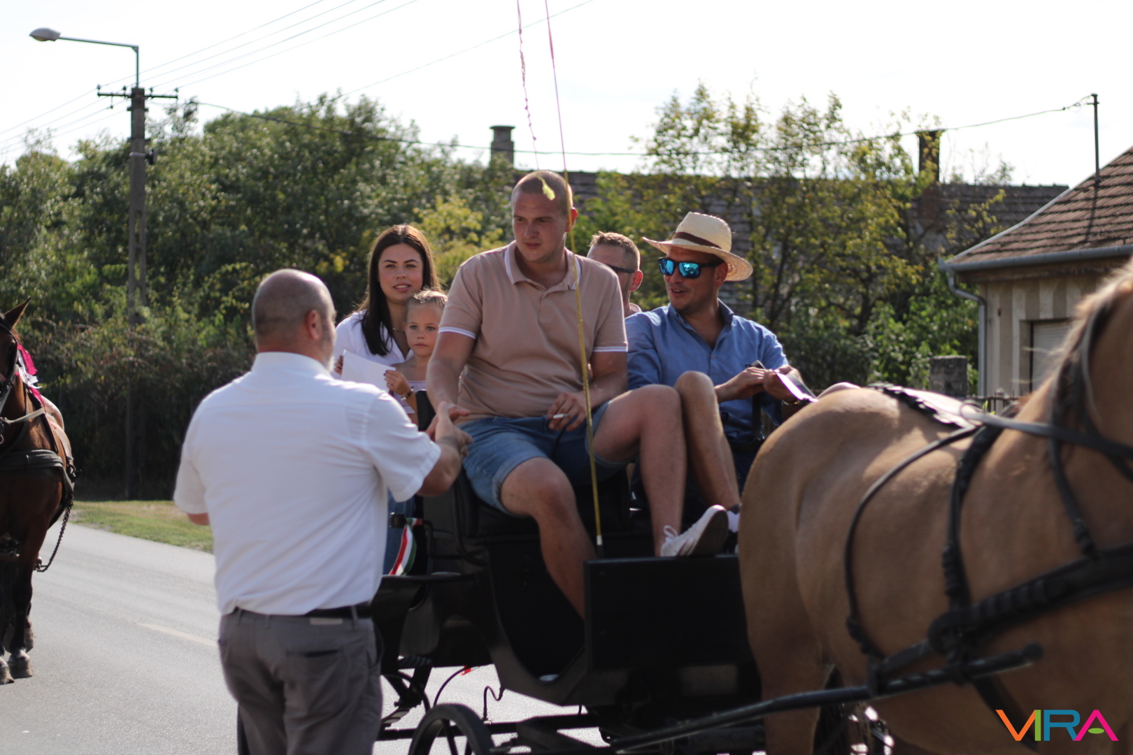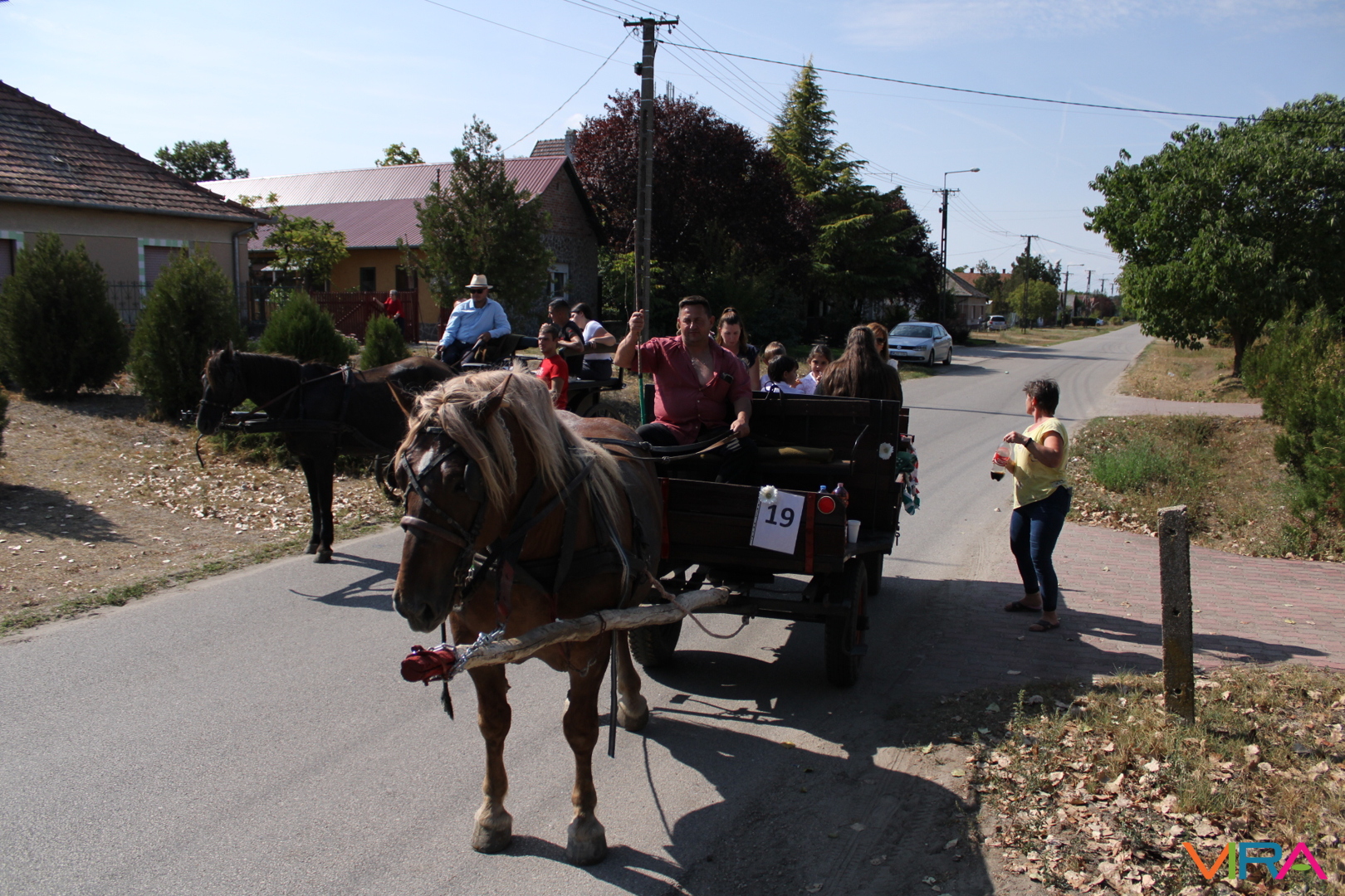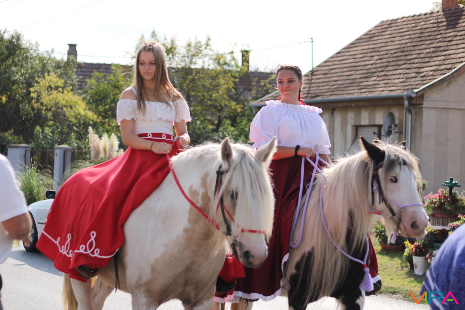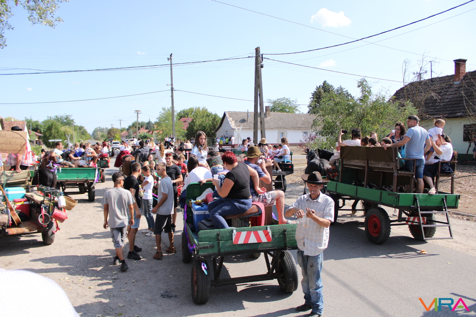 A település focipályáján gyülekeztek a lelkes lovasok, akik szebbnél szebb fogatokkal érkezve várták sorukat a minden évben megrendezésre kerülő szüreti felvonulásra. Szerencsére a menetet kellemes idő kísérte végig, így az útközben megszomjazó lovasokat és barátaikat frissítő pontok várták, ahol finomabbnál finomabb süteményekkel és üdítőkkel vendégelték meg a helyi asszonyok. A menetet a polgárőrség és a rendőrség biztosította, hogy mindenki biztonságban vonulhasson végig a község utcáin. A hangos zeneszó mellett a kisbíró hangja is felcsendült, furfangosan elmesélte az elmúlt év eseményeit, szórakoztatva a falu népét. A körmenet végén minden résztvevő egy-egy üveg bort és emléklapot kapott a szervezők hálájának jeléül.
