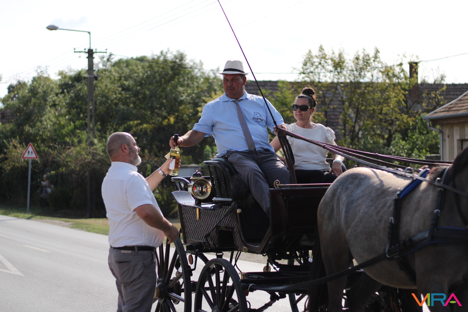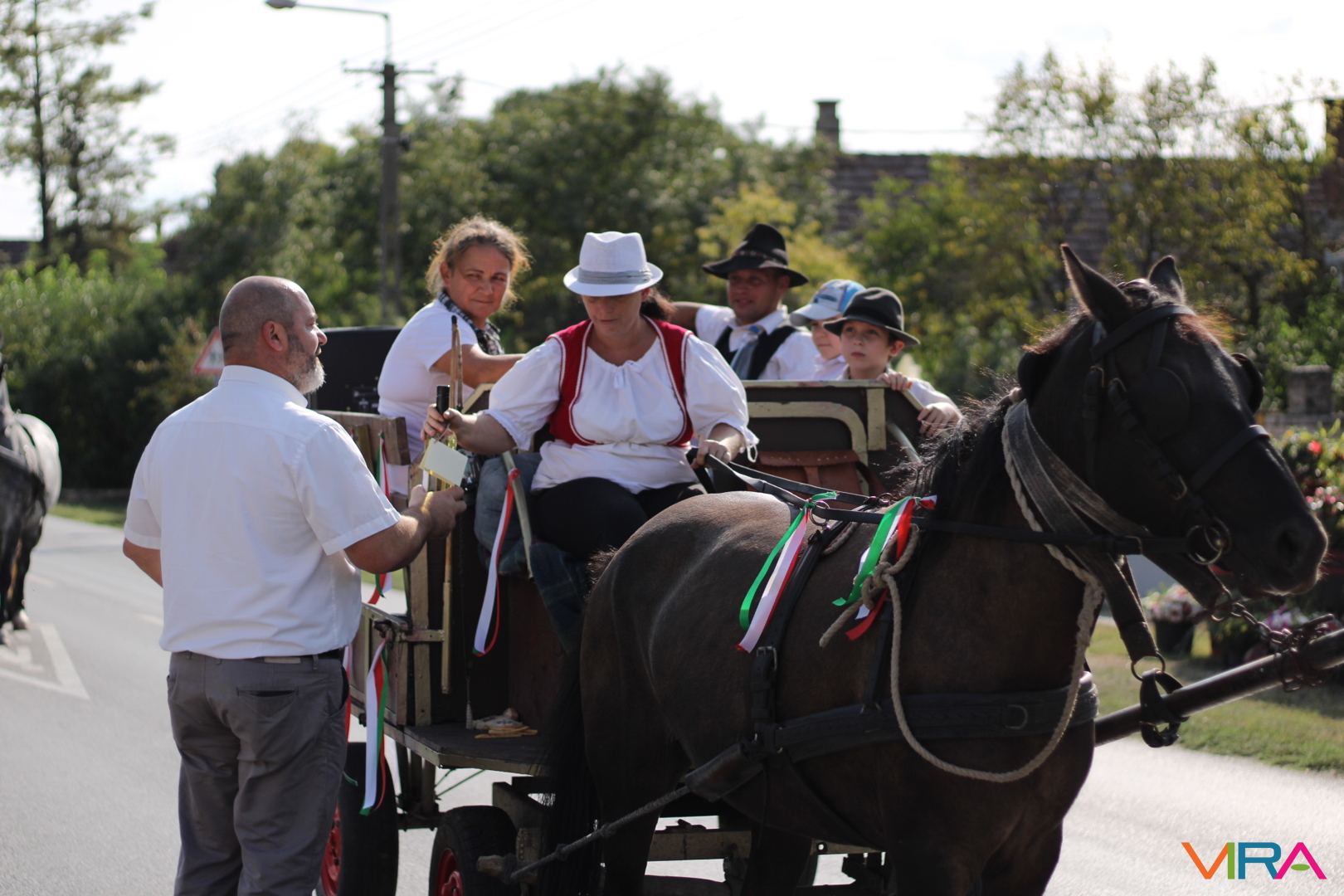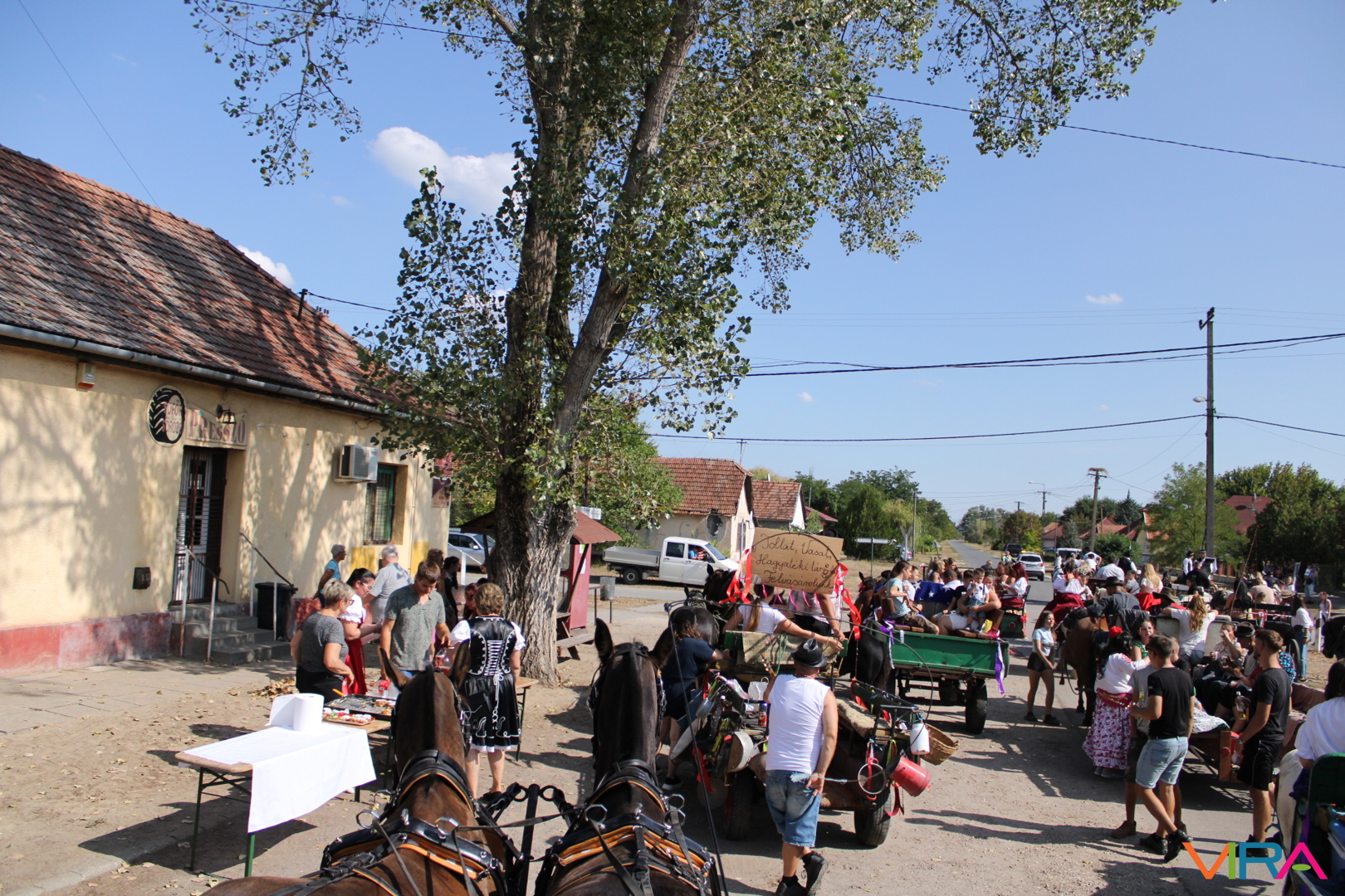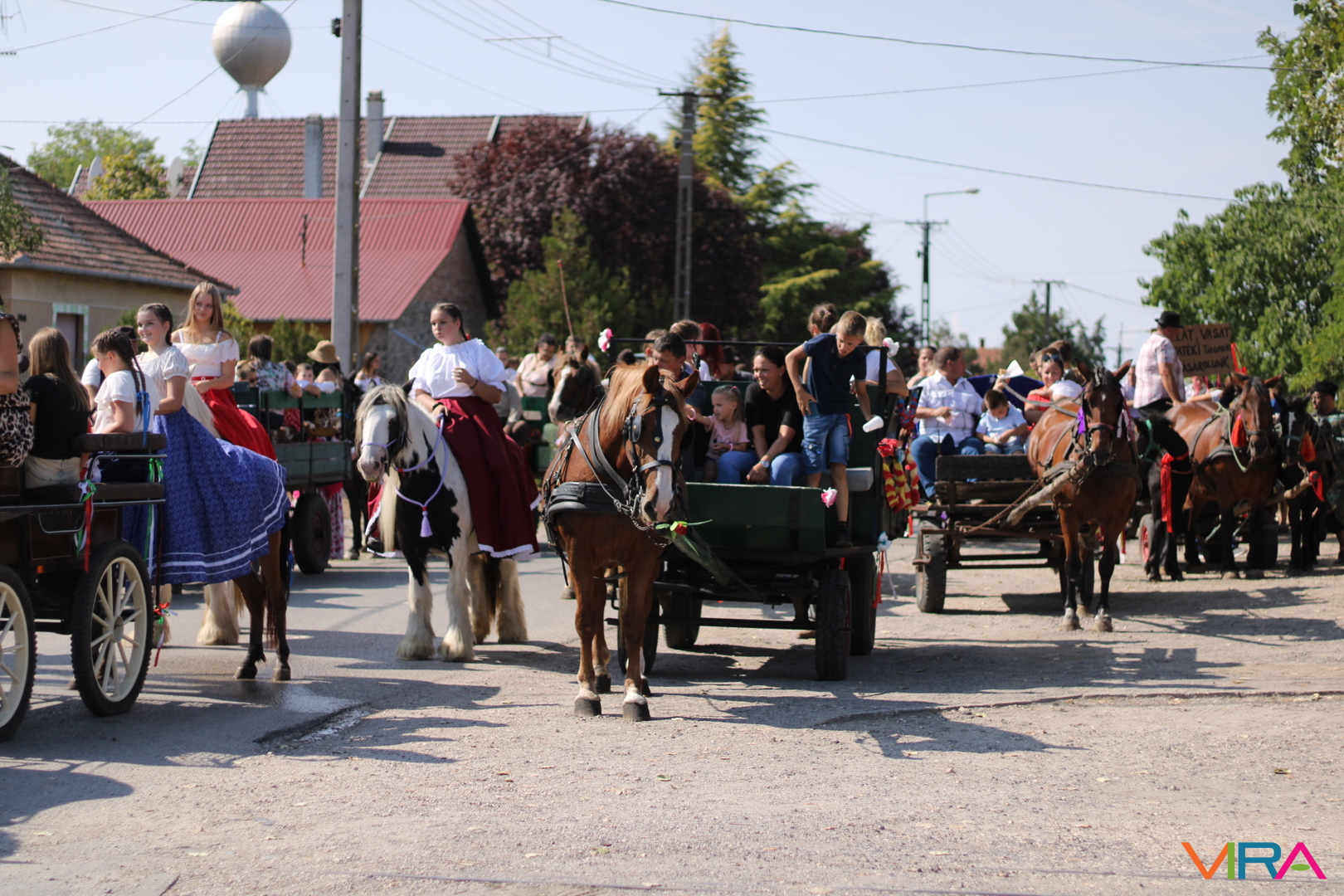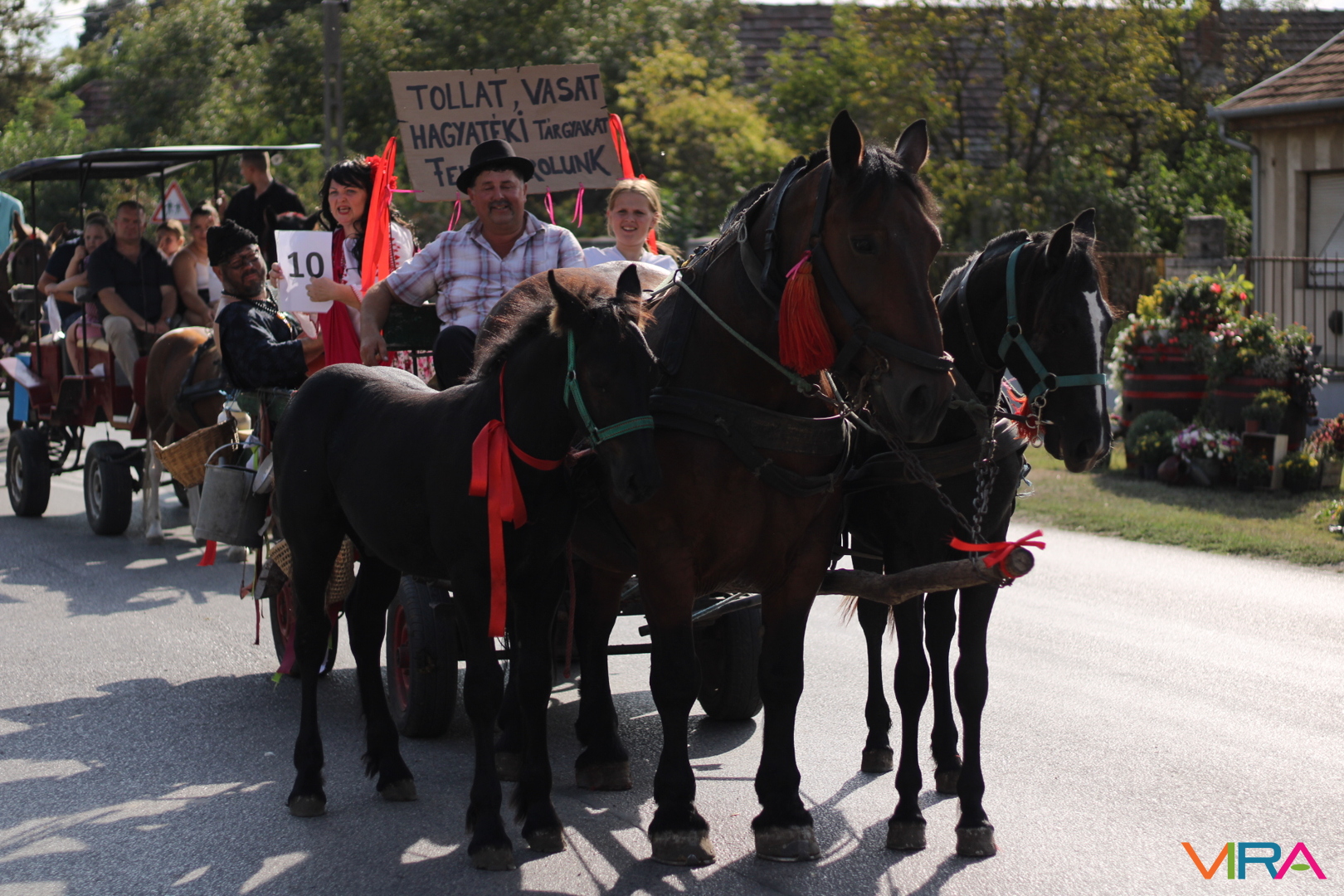 A település focipályáján gyülekeztek a lelkes lovasok, akik szebbnél szebb fogatokkal érkezve várták sorukat a minden évben megrendezésre kerülő szüreti felvonulásra. Szerencsére a menetet kellemes idő kísérte végig, így az útközben megszomjazó lovasokat és barátaikat frissítő pontok várták, ahol finomabbnál finomabb süteményekkel és üdítőkkel vendégelték meg a helyi asszonyok. A menetet a polgárőrség és a rendőrség biztosította, hogy mindenki biztonságban vonulhasson végig a község utcáin. A hangos zeneszó mellett a kisbíró hangja is felcsendült, furfangosan elmesélte az elmúlt év eseményeit, szórakoztatva a falu népét. A körmenet végén minden résztvevő egy-egy üveg bort és emléklapot kapott a szervezők hálájának jeléül.