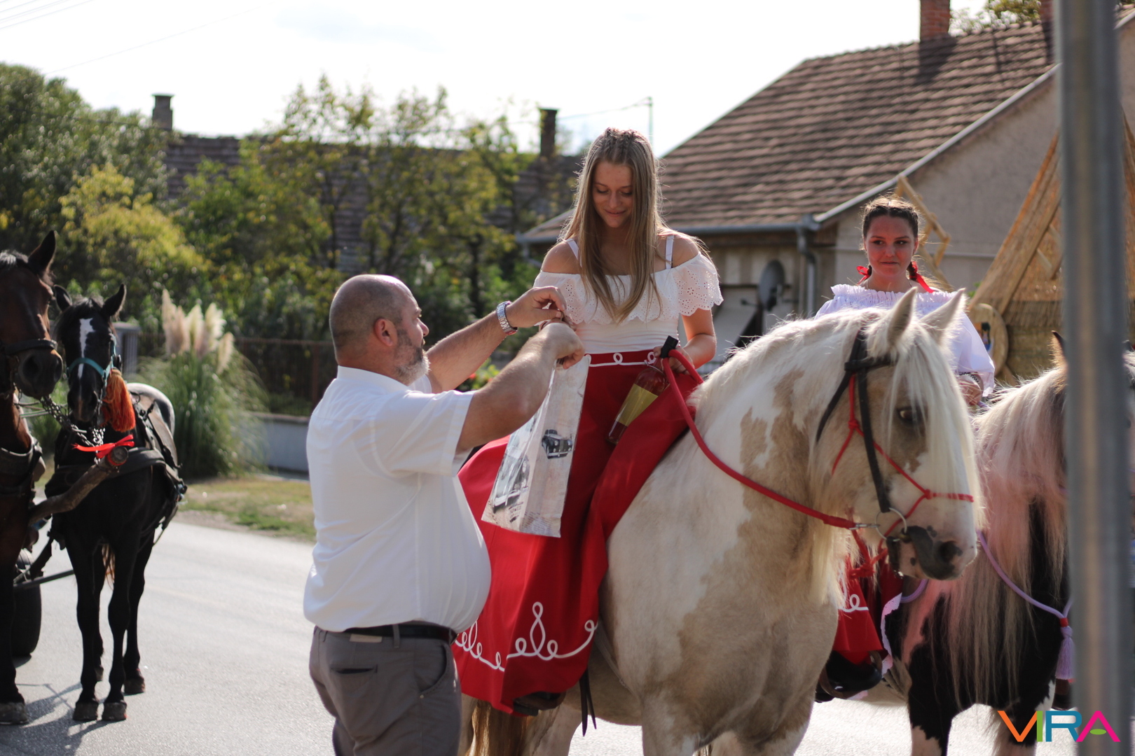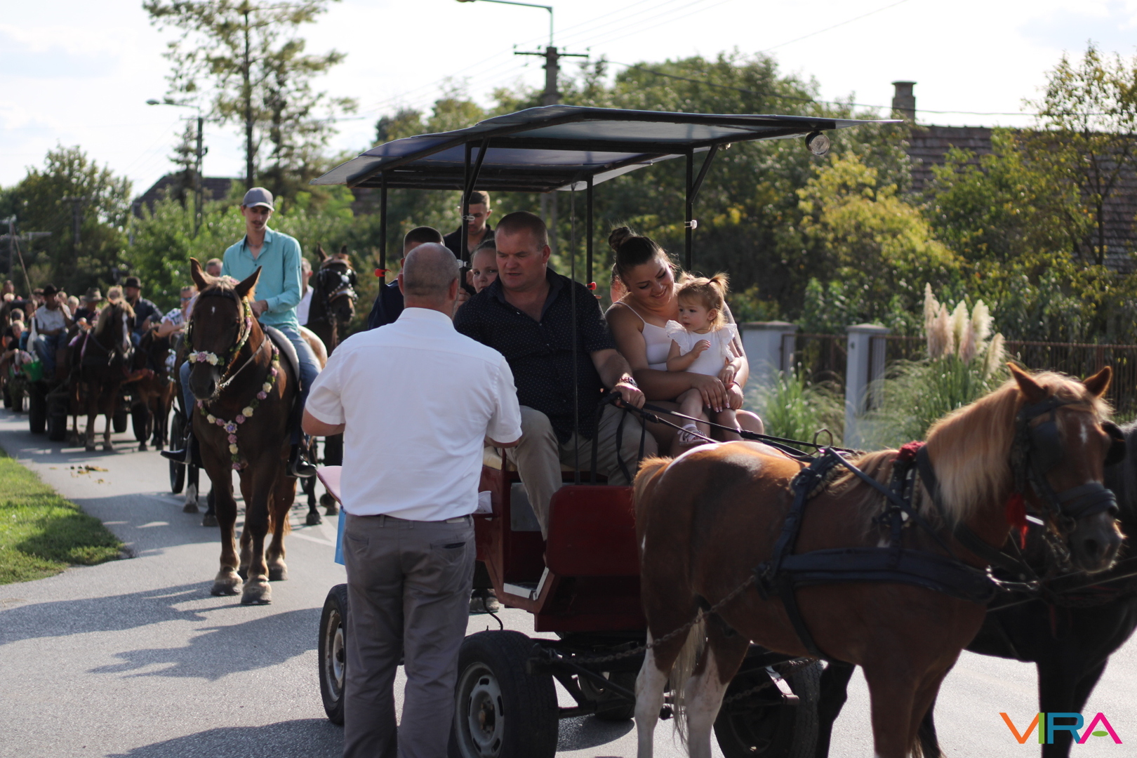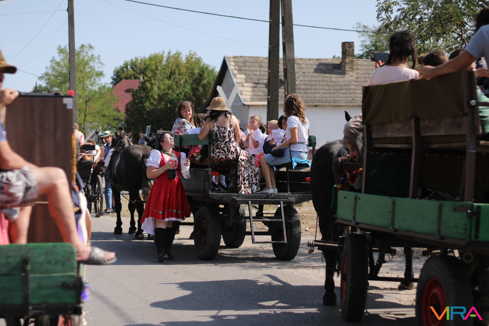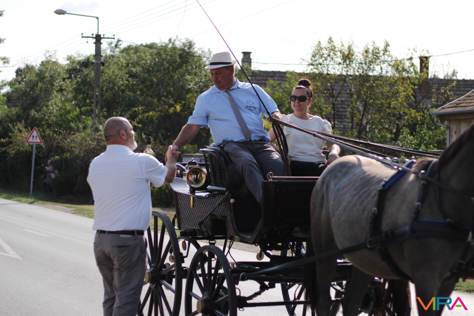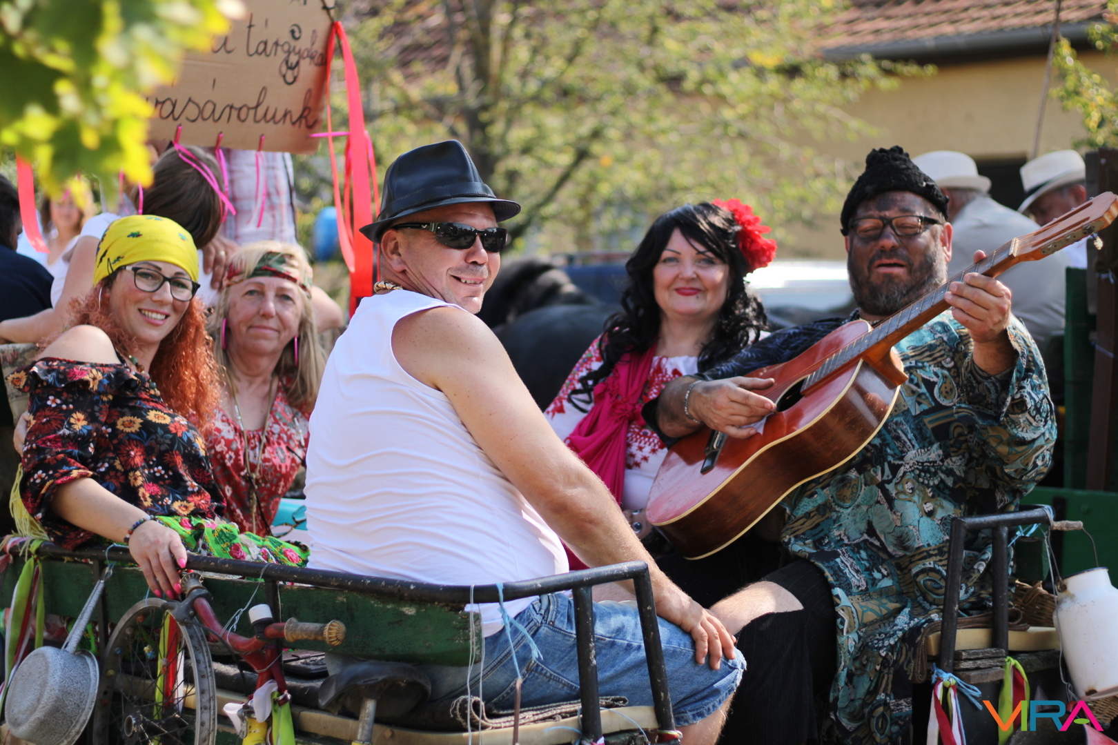 A település focipályáján gyülekeztek a lelkes lovasok, akik szebbnél szebb fogatokkal érkezve várták sorukat a minden évben megrendezésre kerülő szüreti felvonulásra. Szerencsére a menetet kellemes idő kísérte végig, így az útközben megszomjazó lovasokat és barátaikat frissítő pontok várták, ahol finomabbnál finomabb süteményekkel és üdítőkkel vendégelték meg a helyi asszonyok. A menetet a polgárőrség és a rendőrség biztosította, hogy mindenki biztonságban vonulhasson végig a község utcáin. A hangos zeneszó mellett a kisbíró hangja is felcsendült, furfangosan elmesélte az elmúlt év eseményeit, szórakoztatva a falu népét. A körmenet végén minden résztvevő egy-egy üveg bort és emléklapot kapott a szervezők hálájának jeléül.