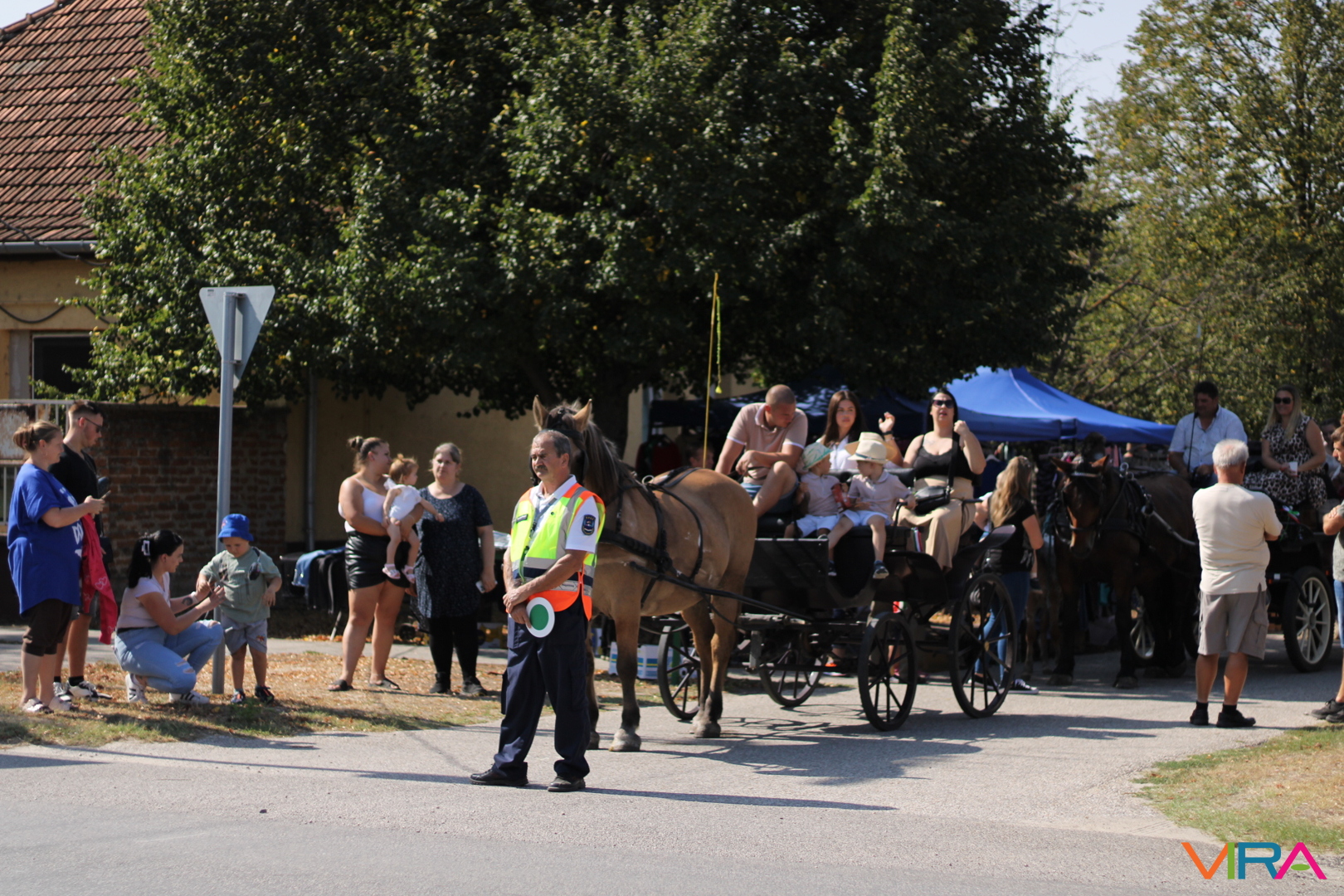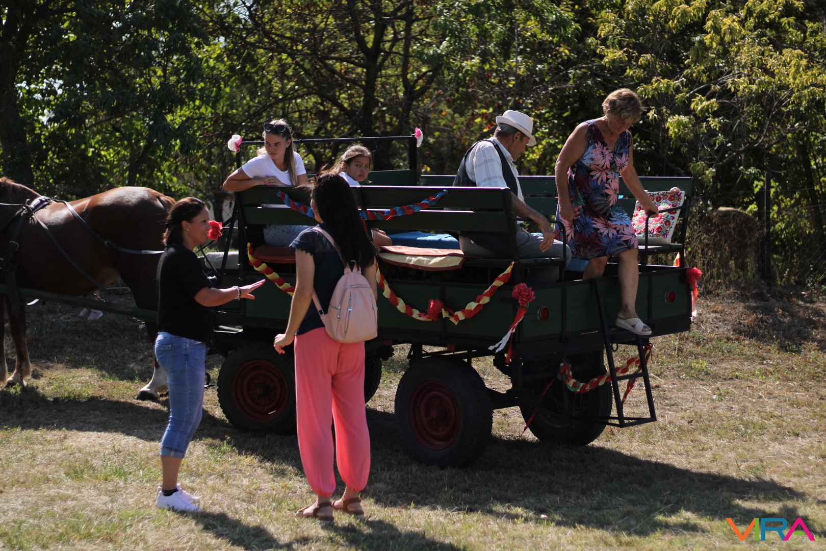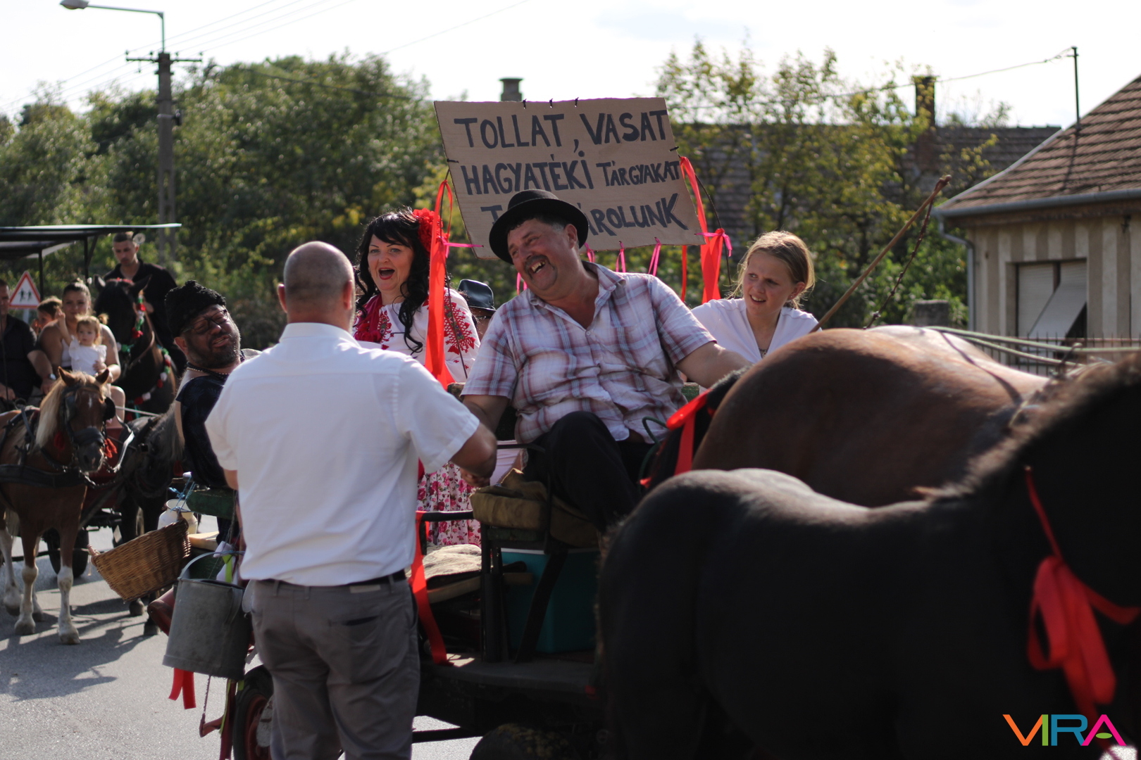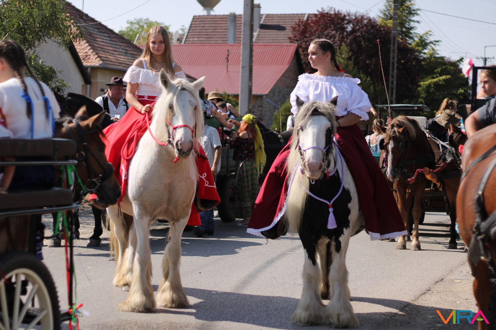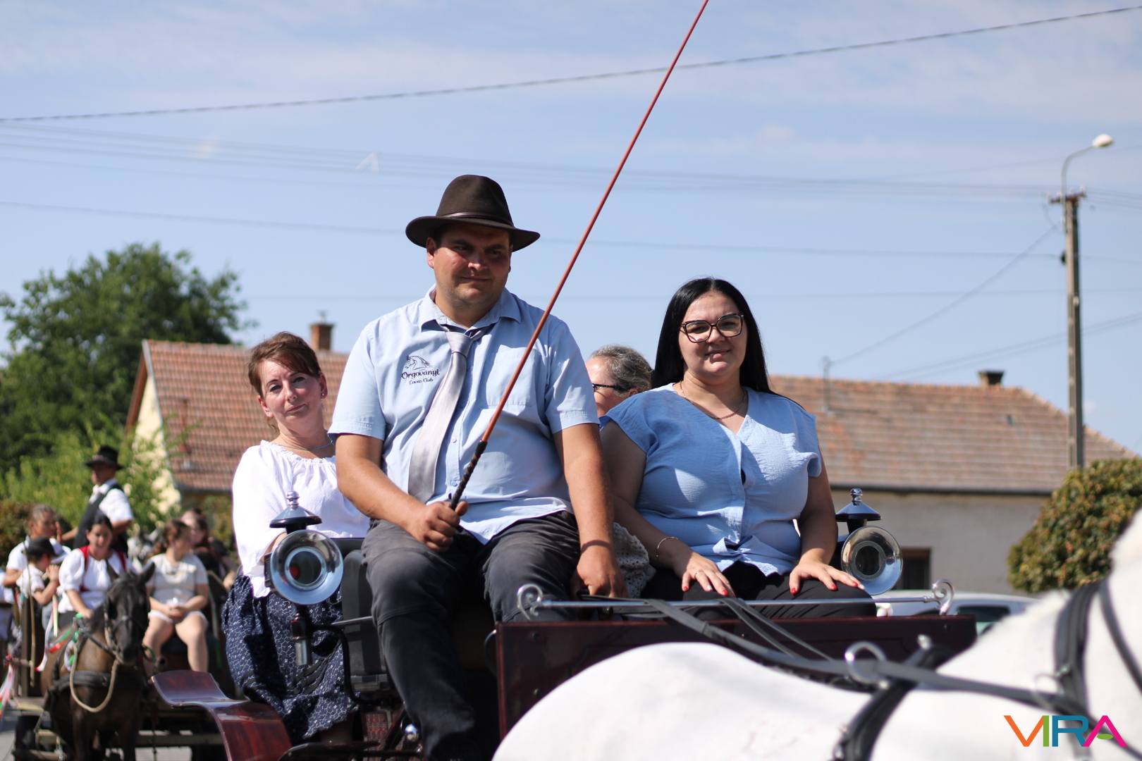 A település focipályáján gyülekeztek a lelkes lovasok, akik szebbnél szebb fogatokkal érkezve várták sorukat a minden évben megrendezésre kerülő szüreti felvonulásra. Szerencsére a menetet kellemes idő kísérte végig, így az útközben megszomjazó lovasokat és barátaikat frissítő pontok várták, ahol finomabbnál finomabb süteményekkel és üdítőkkel vendégelték meg a helyi asszonyok. A menetet a polgárőrség és a rendőrség biztosította, hogy mindenki biztonságban vonulhasson végig a község utcáin. A hangos zeneszó mellett a kisbíró hangja is felcsendült, furfangosan elmesélte az elmúlt év eseményeit, szórakoztatva a falu népét. A körmenet végén minden résztvevő egy-egy üveg bort és emléklapot kapott a szervezők hálájának jeléül.