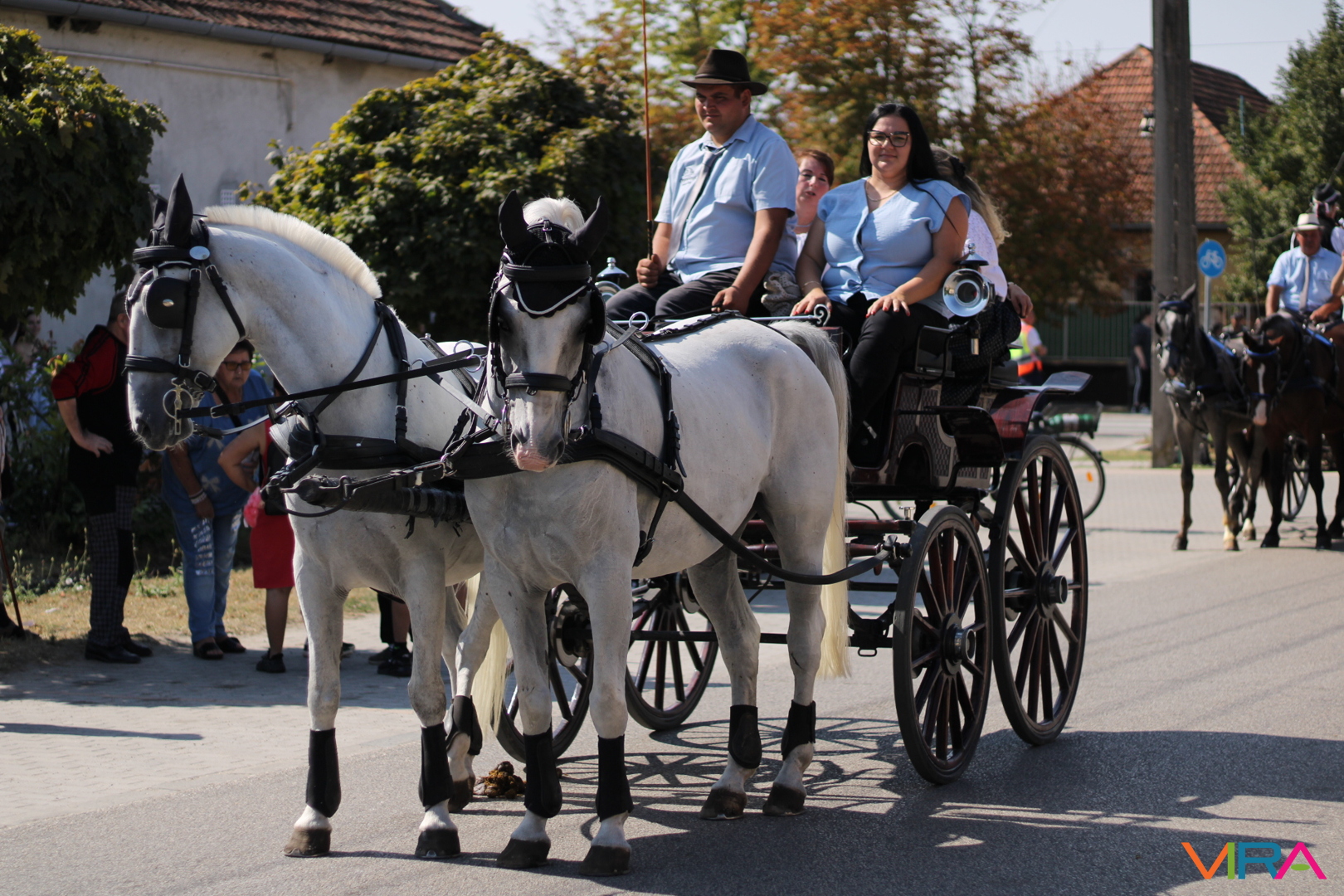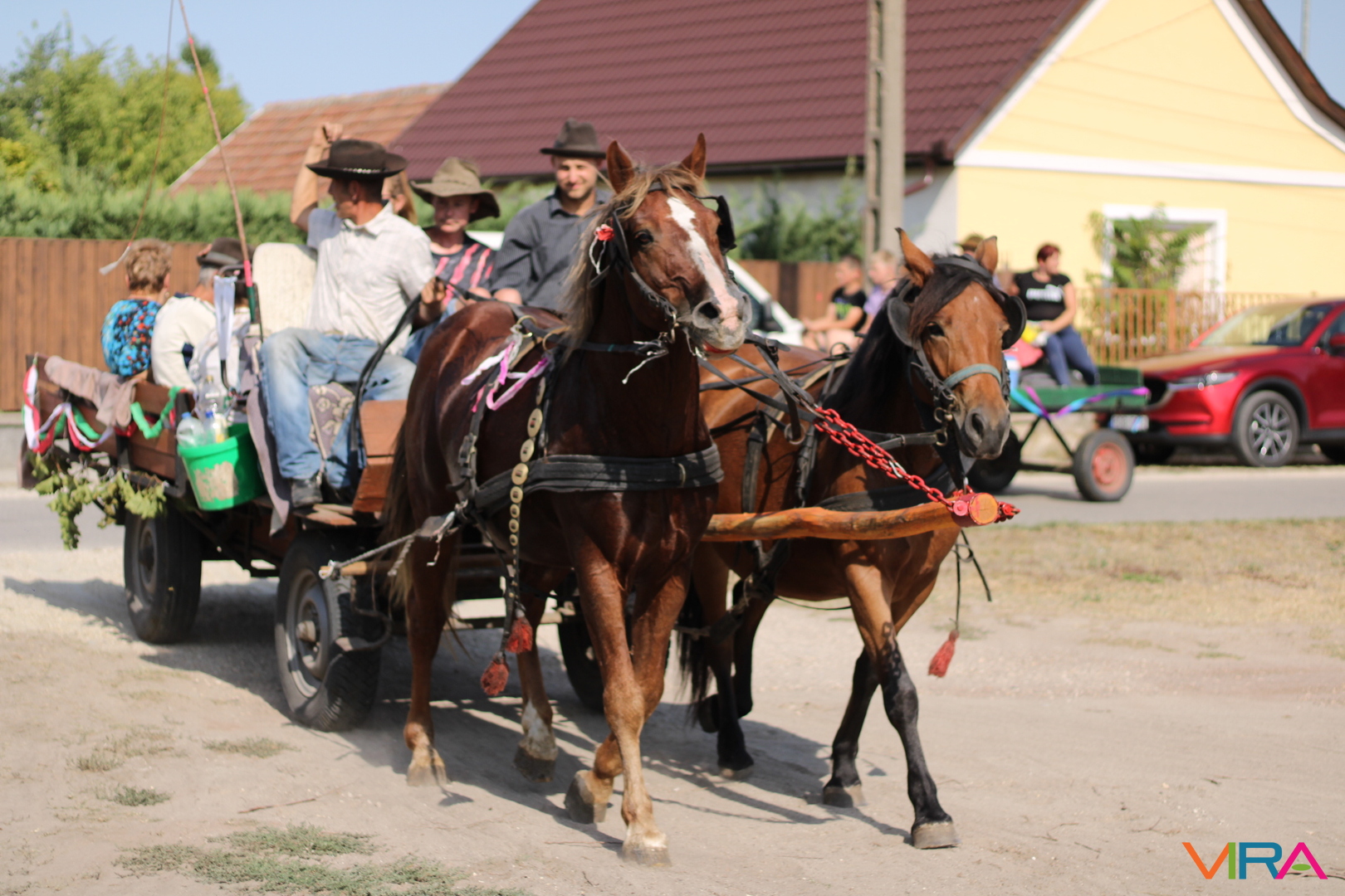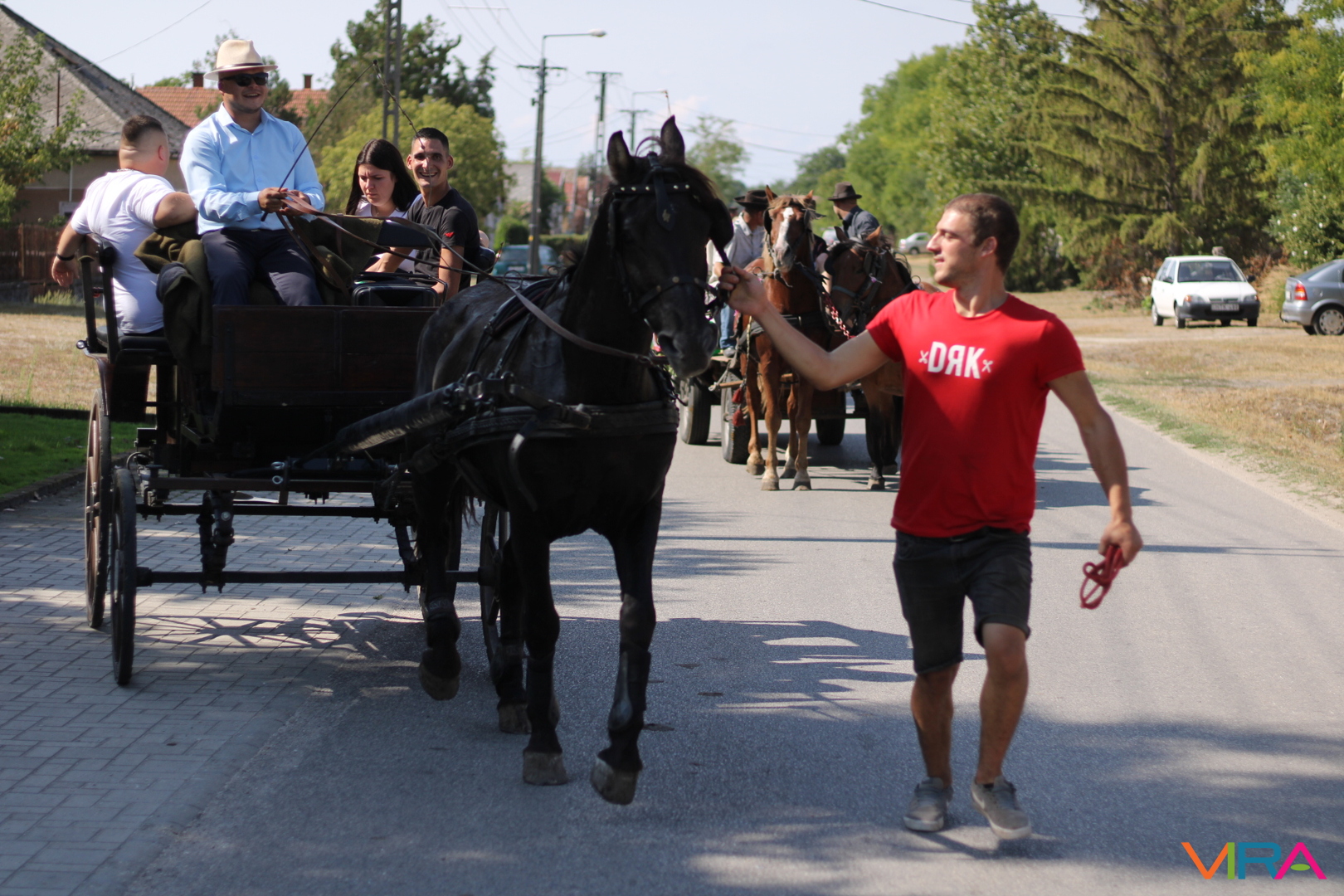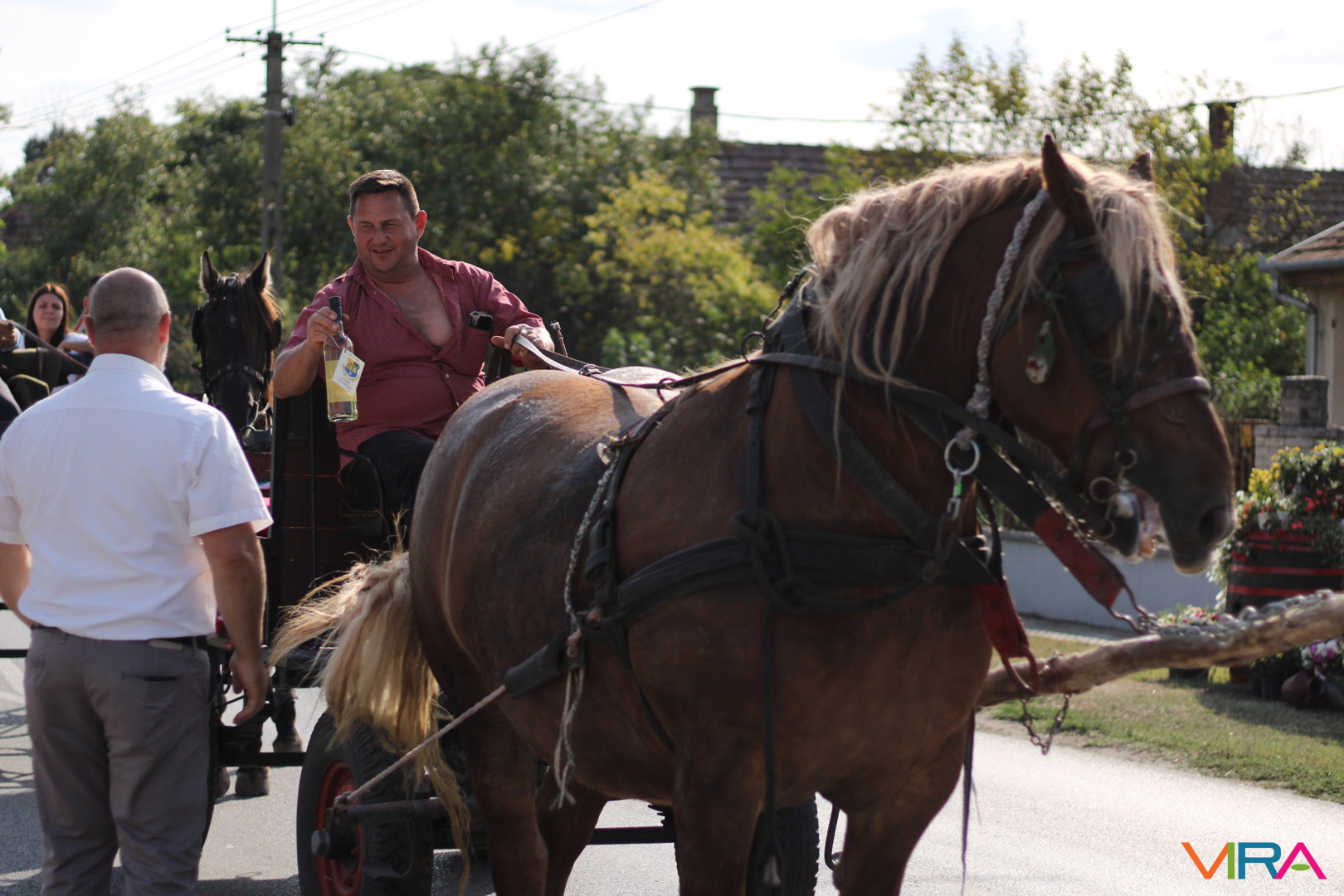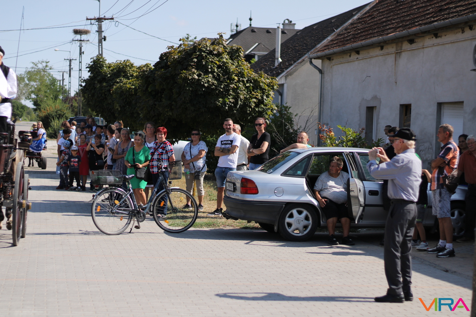 A település focipályáján gyülekeztek a lelkes lovasok, akik szebbnél szebb fogatokkal érkezve várták sorukat a minden évben megrendezésre kerülő szüreti felvonulásra. Szerencsére a menetet kellemes idő kísérte végig, így az útközben megszomjazó lovasokat és barátaikat frissítő pontok várták, ahol finomabbnál finomabb süteményekkel és üdítőkkel vendégelték meg a helyi asszonyok. A menetet a polgárőrség és a rendőrség biztosította, hogy mindenki biztonságban vonulhasson végig a község utcáin. A hangos zeneszó mellett a kisbíró hangja is felcsendült, furfangosan elmesélte az elmúlt év eseményeit, szórakoztatva a falu népét. A körmenet végén minden résztvevő egy-egy üveg bort és emléklapot kapott a szervezők hálájának jeléül.