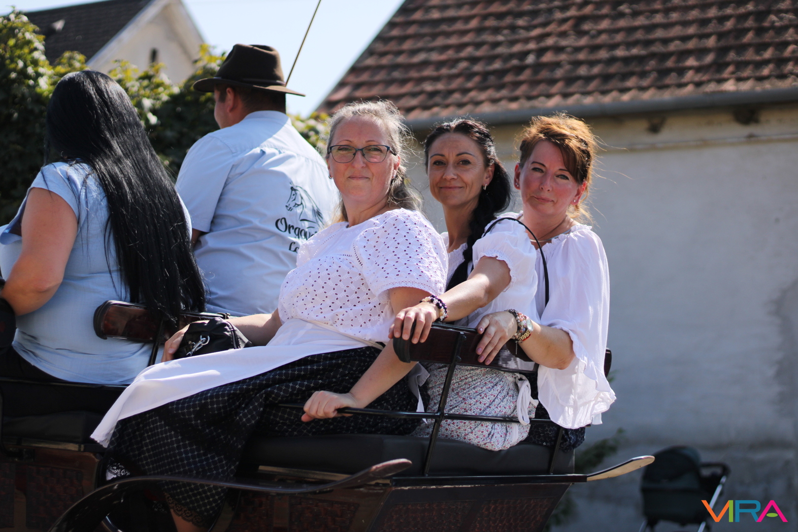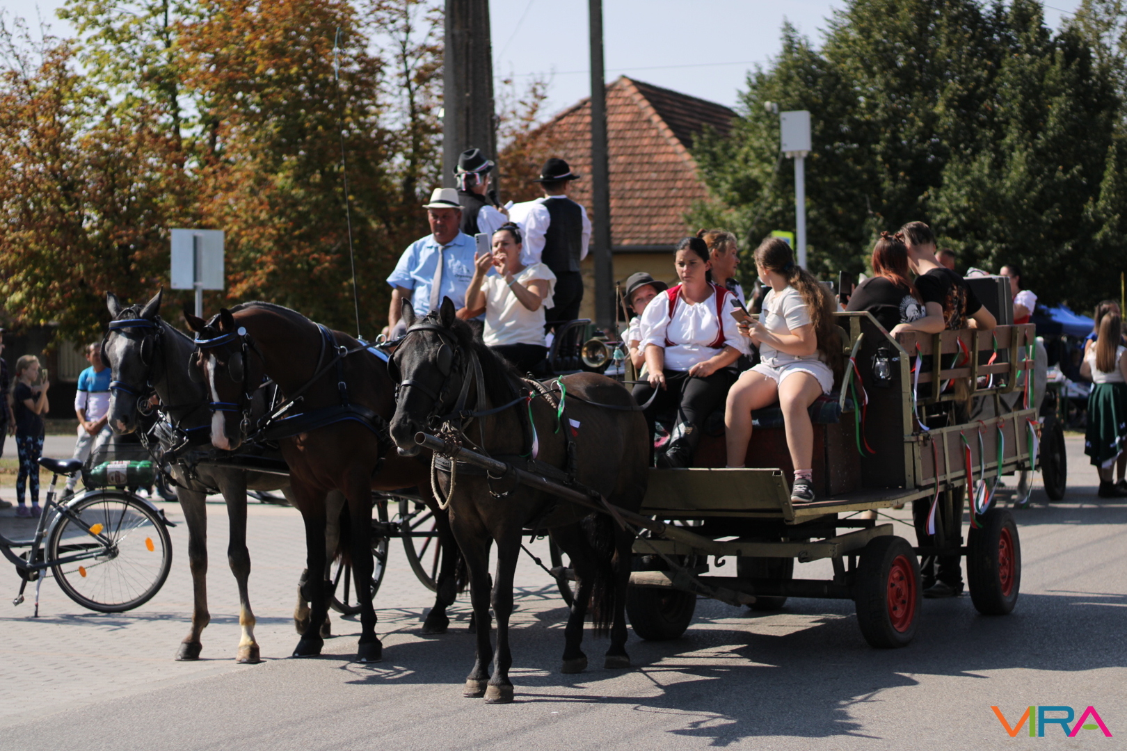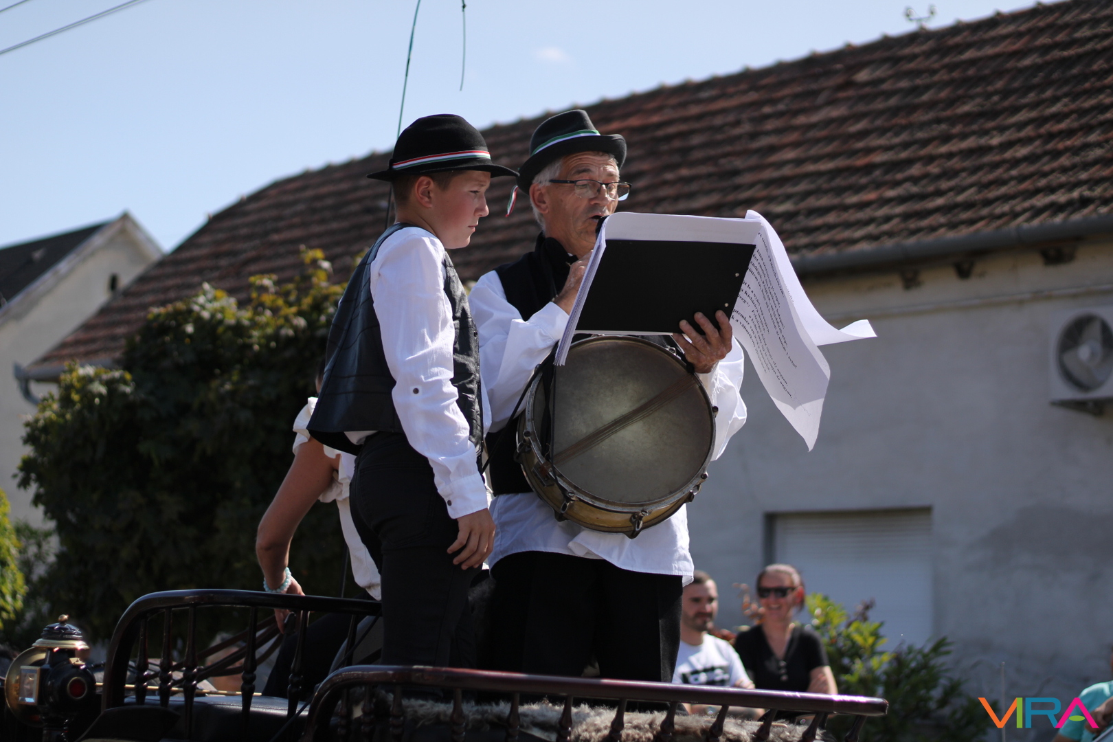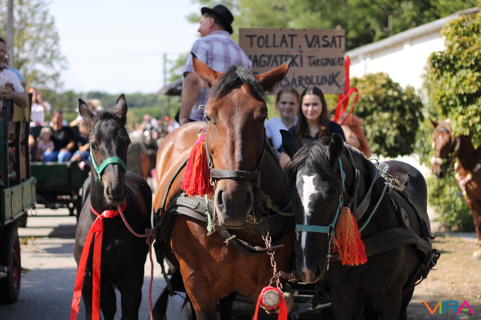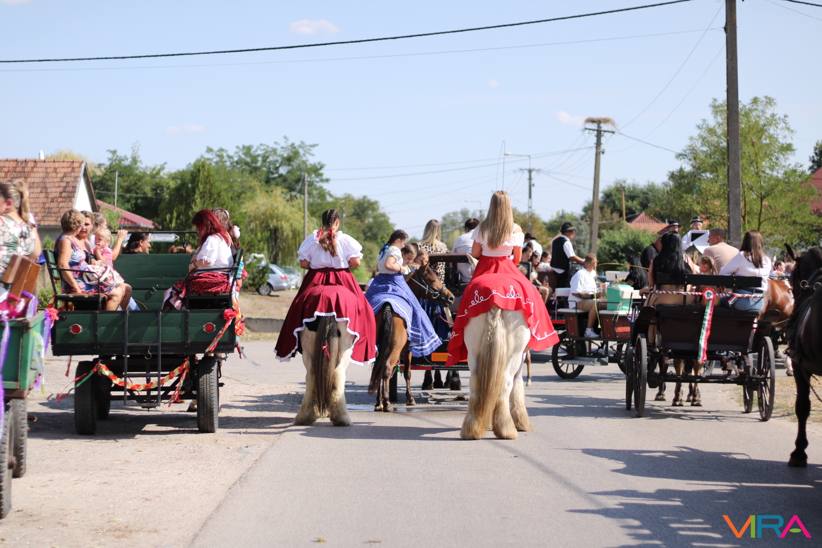 A település focipályáján gyülekeztek a lelkes lovasok, akik szebbnél szebb fogatokkal érkezve várták sorukat a minden évben megrendezésre kerülő szüreti felvonulásra. Szerencsére a menetet kellemes idő kísérte végig, így az útközben megszomjazó lovasokat és barátaikat frissítő pontok várták, ahol finomabbnál finomabb süteményekkel és üdítőkkel vendégelték meg a helyi asszonyok. A menetet a polgárőrség és a rendőrség biztosította, hogy mindenki biztonságban vonulhasson végig a község utcáin. A hangos zeneszó mellett a kisbíró hangja is felcsendült, furfangosan elmesélte az elmúlt év eseményeit, szórakoztatva a falu népét. A körmenet végén minden résztvevő egy-egy üveg bort és emléklapot kapott a szervezők hálájának jeléül.