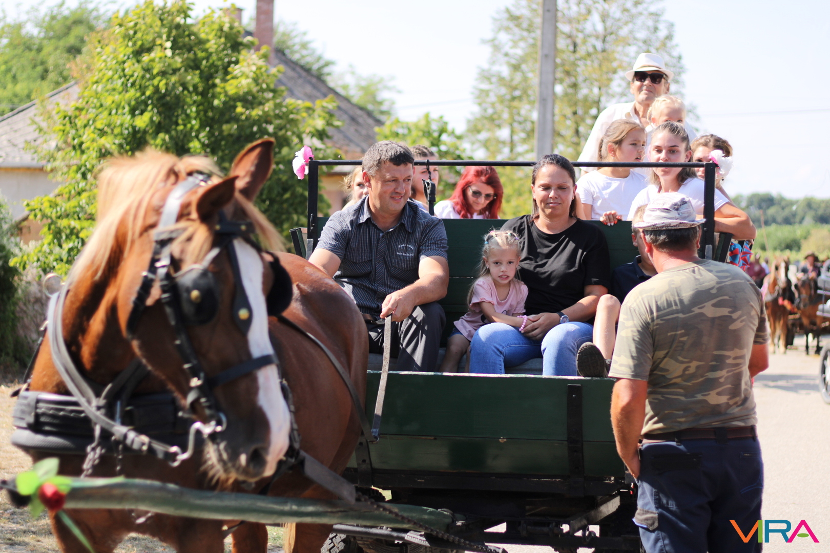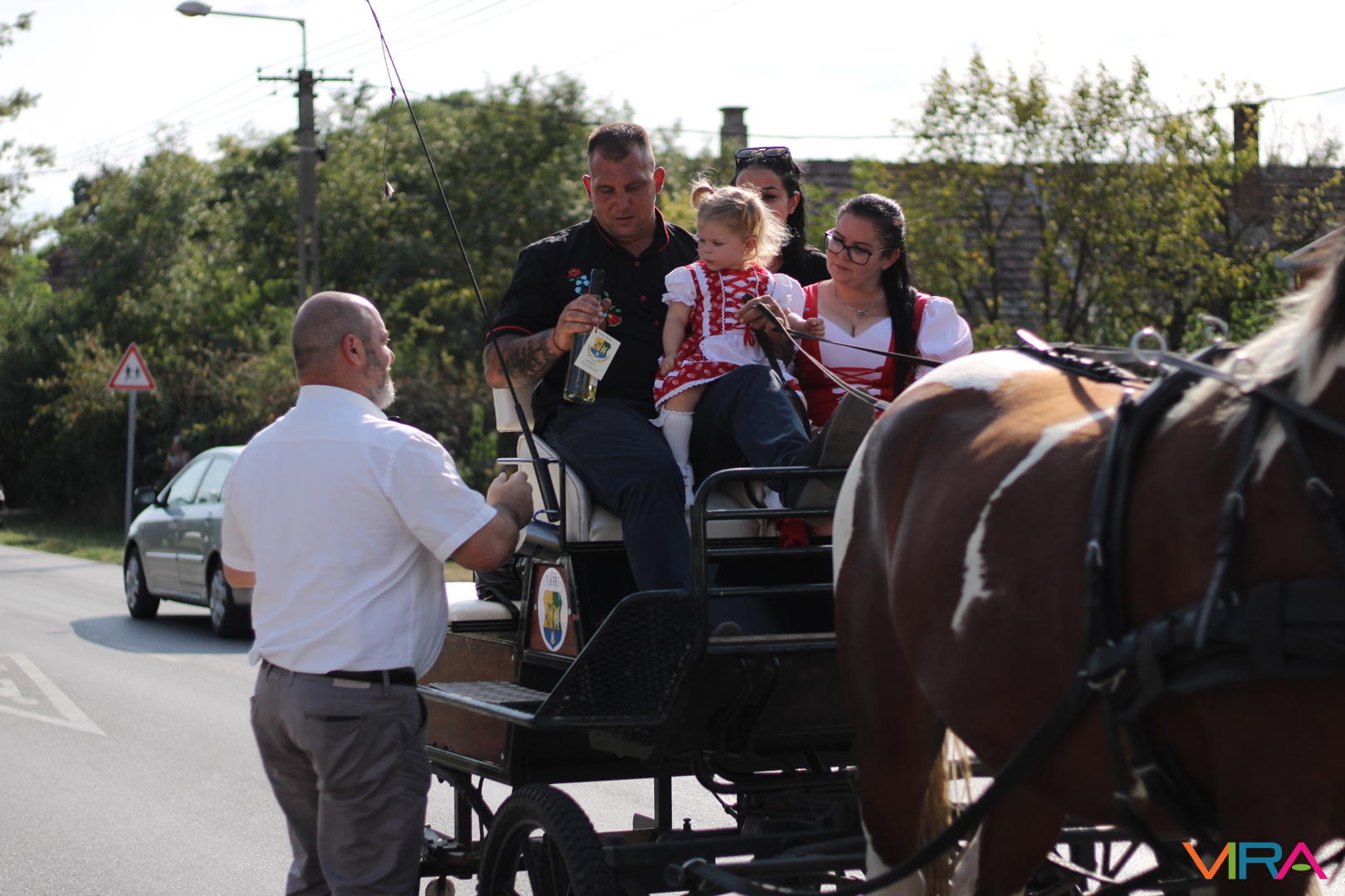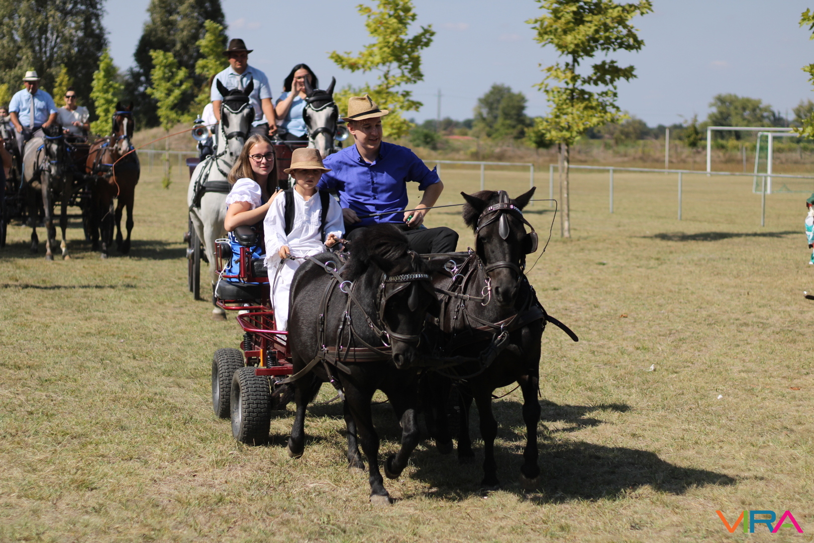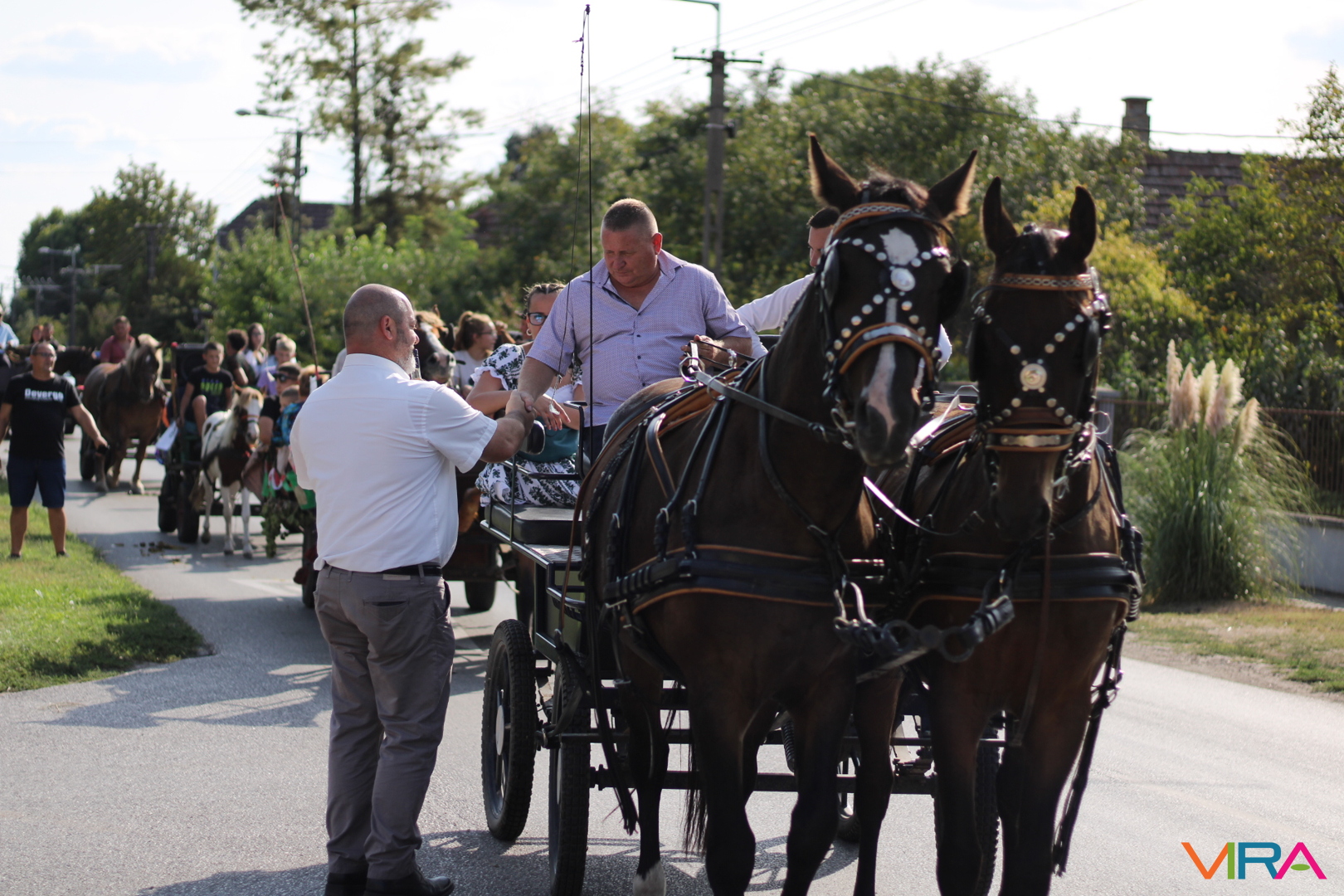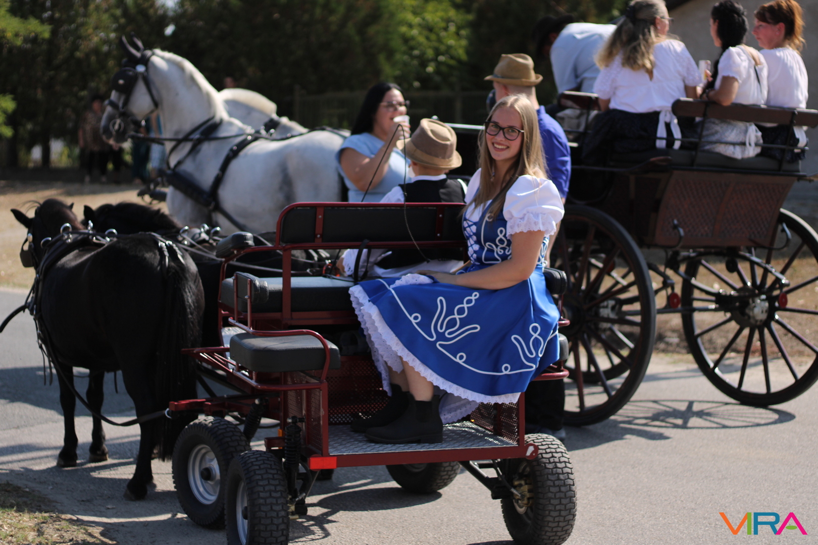 A település focipályáján gyülekeztek a lelkes lovasok, akik szebbnél szebb fogatokkal érkezve várták sorukat a minden évben megrendezésre kerülő szüreti felvonulásra. Szerencsére a menetet kellemes idő kísérte végig, így az útközben megszomjazó lovasokat és barátaikat frissítő pontok várták, ahol finomabbnál finomabb süteményekkel és üdítőkkel vendégelték meg a helyi asszonyok. A menetet a polgárőrség és a rendőrség biztosította, hogy mindenki biztonságban vonulhasson végig a község utcáin. A hangos zeneszó mellett a kisbíró hangja is felcsendült, furfangosan elmesélte az elmúlt év eseményeit, szórakoztatva a falu népét. A körmenet végén minden résztvevő egy-egy üveg bort és emléklapot kapott a szervezők hálájának jeléül.