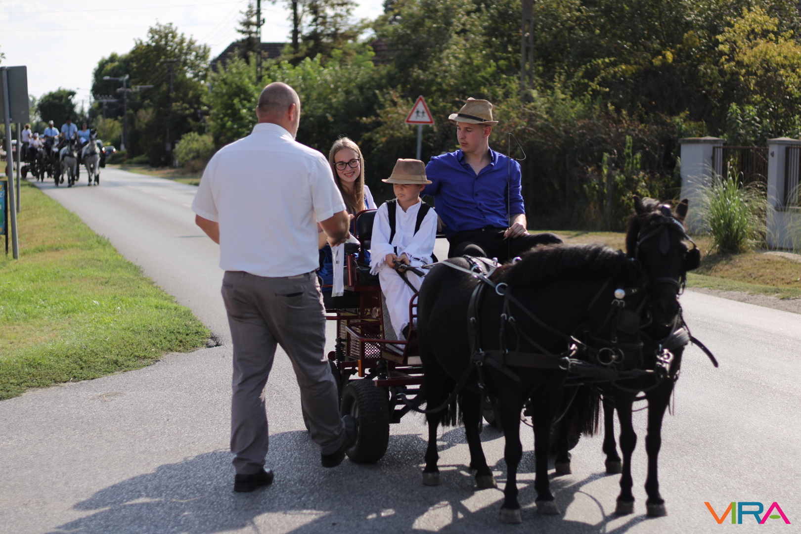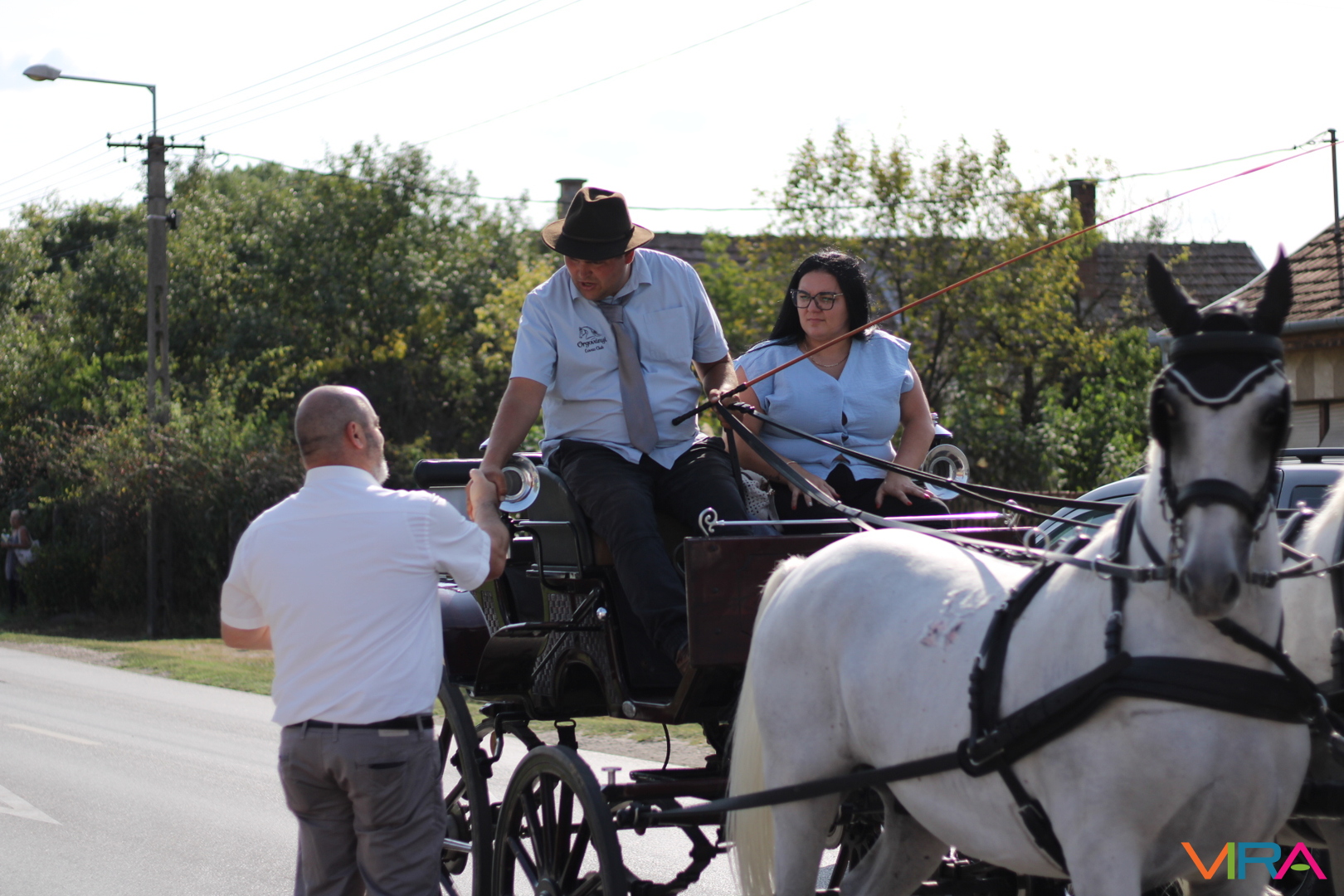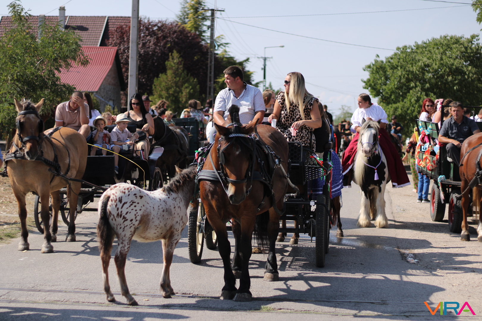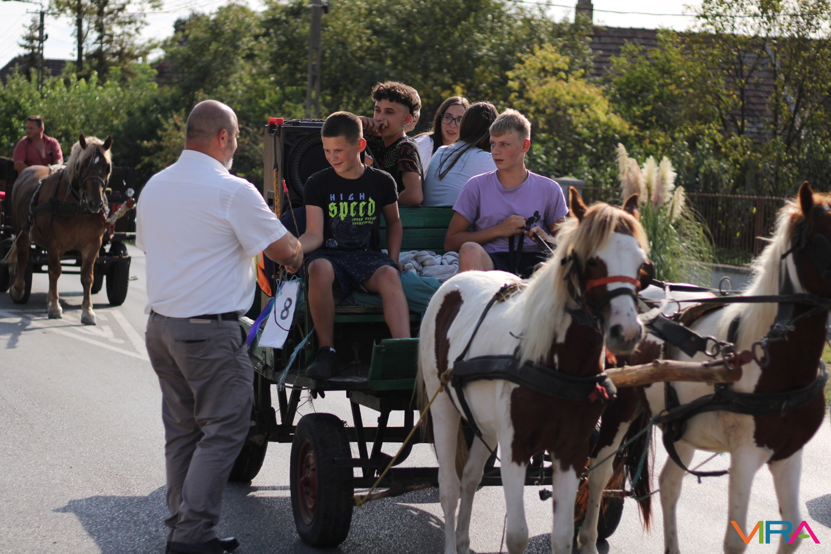 A település focipályáján gyülekeztek a lelkes lovasok, akik szebbnél szebb fogatokkal érkezve várták sorukat a minden évben megrendezésre kerülő szüreti felvonulásra. Szerencsére a menetet kellemes idő kísérte végig, így az útközben megszomjazó lovasokat és barátaikat frissítő pontok várták, ahol finomabbnál finomabb süteményekkel és üdítőkkel vendégelték meg a helyi asszonyok. A menetet a polgárőrség és a rendőrség biztosította, hogy mindenki biztonságban vonulhasson végig a község utcáin. A hangos zeneszó mellett a kisbíró hangja is felcsendült, furfangosan elmesélte az elmúlt év eseményeit, szórakoztatva a falu népét. A körmenet végén minden résztvevő egy-egy üveg bort és emléklapot kapott a szervezők hálájának jeléül.