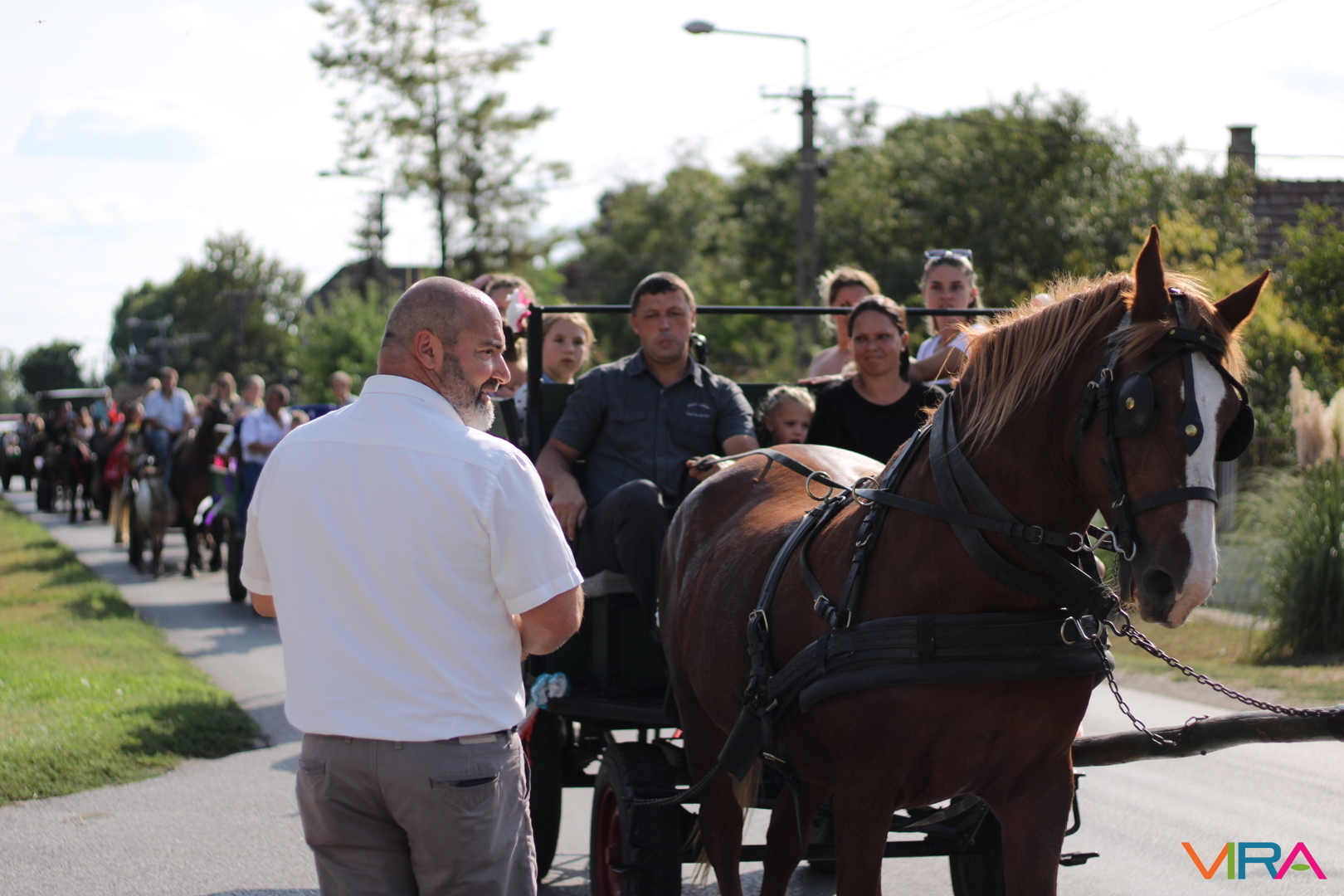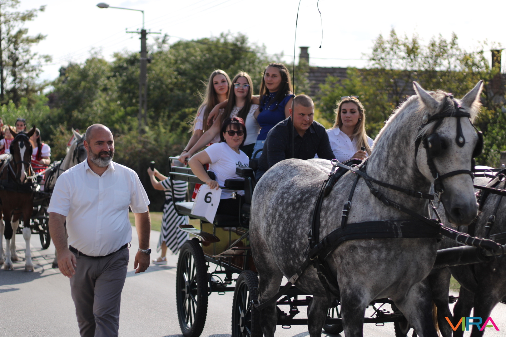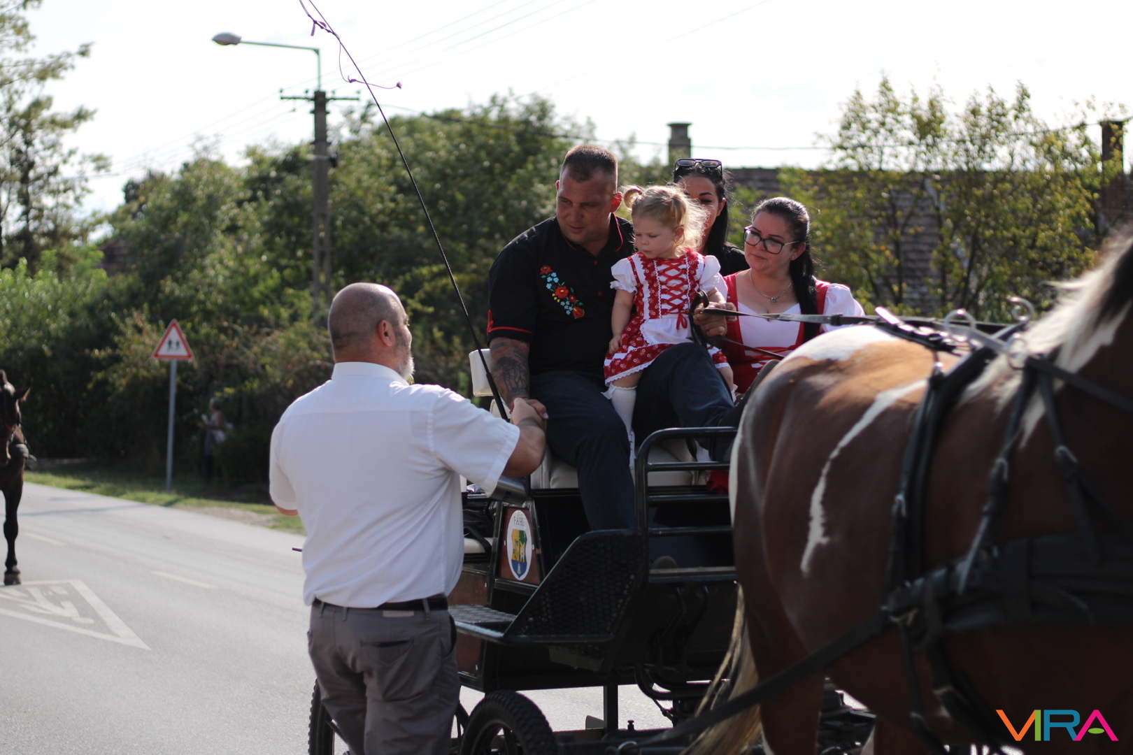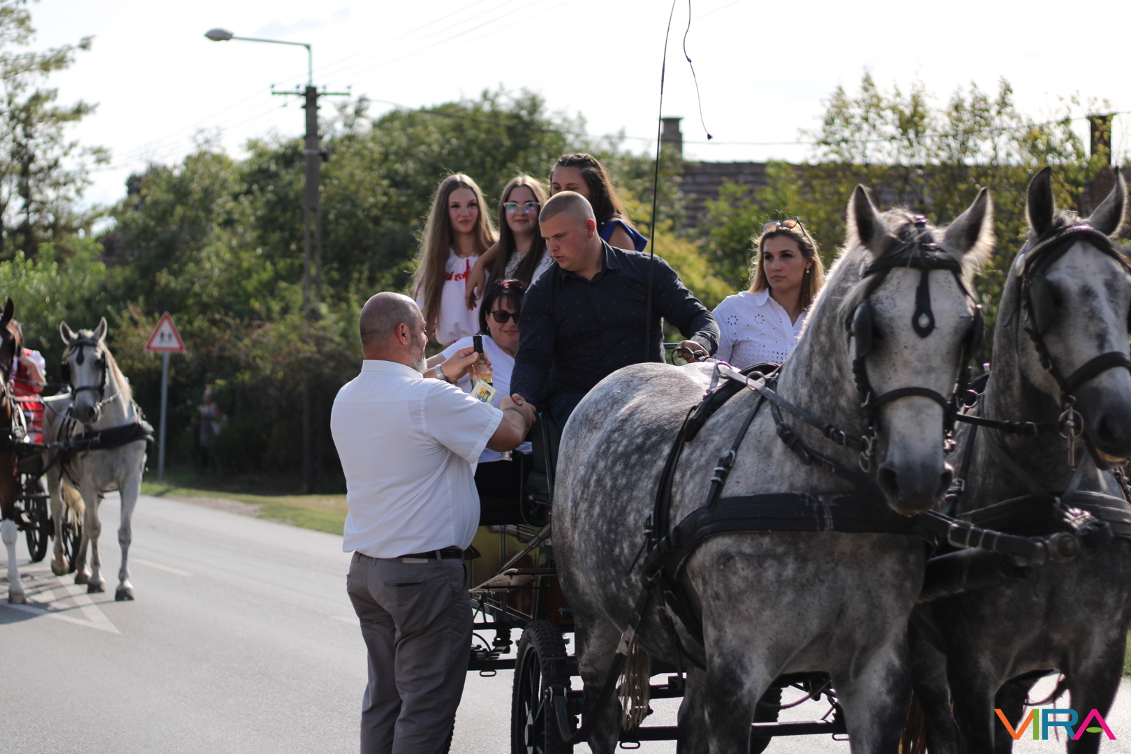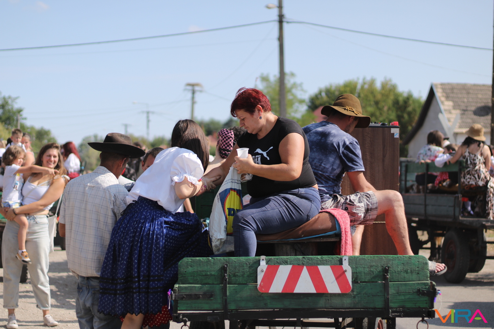 A település focipályáján gyülekeztek a lelkes lovasok, akik szebbnél szebb fogatokkal érkezve várták sorukat a minden évben megrendezésre kerülő szüreti felvonulásra. Szerencsére a menetet kellemes idő kísérte végig, így az útközben megszomjazó lovasokat és barátaikat frissítő pontok várták, ahol finomabbnál finomabb süteményekkel és üdítőkkel vendégelték meg a helyi asszonyok. A menetet a polgárőrség és a rendőrség biztosította, hogy mindenki biztonságban vonulhasson végig a község utcáin. A hangos zeneszó mellett a kisbíró hangja is felcsendült, furfangosan elmesélte az elmúlt év eseményeit, szórakoztatva a falu népét. A körmenet végén minden résztvevő egy-egy üveg bort és emléklapot kapott a szervezők hálájának jeléül.