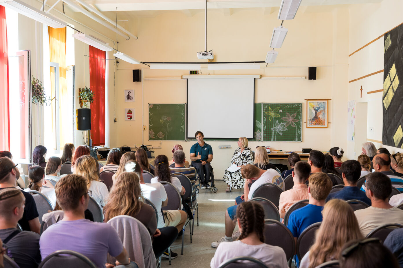 Miután mindenki megjött, egy gyors nyitóáhítat után már érkezett is a legelső élőadónk, az iskola egyik büszkesége, Suba Róbert, paralimpiai sportoló, aki elmesélte nekünk a történetét, azt, hogy mi segítette át őt az első hónapok kezdeti nehézségein, és végül hogyan jutott el odáig, ahol most tart. A szépen megfogalmazott, megérintő előadás után csoportokban dolgoztuk fel a témát, s miután mindenki megosztotta a másikkal az általa levont következtetést, a társaság átvonult a közeli kollégiumba, ahol a szállások elfoglalása után már terített asztal várt rájuk.