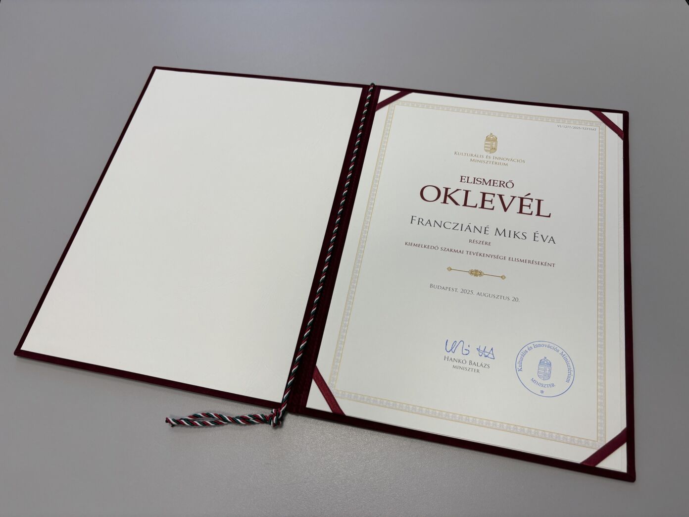 Az elismerést a Kulturális és Innovációs Minisztériumban az augusztus 20-i nemzeti ünnep alkalmából 2025. szeptember 16-án, dr. Pálmai Gergely szakképzésért felelős helyettes államtitkártól vette át Francziáné Miks Éva a Kiskunhalasi SZC Kiskőrösi Wattay Technikum oktatója.