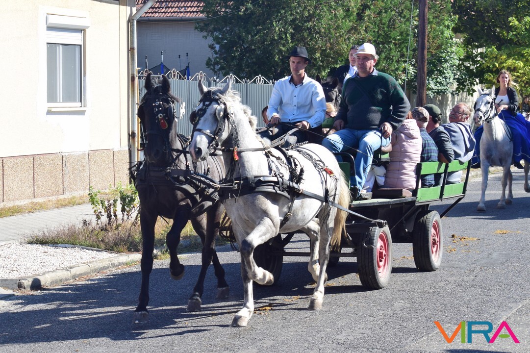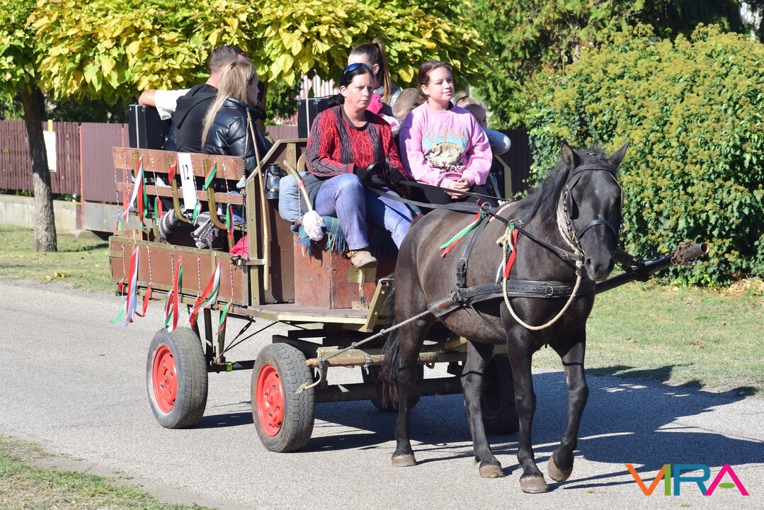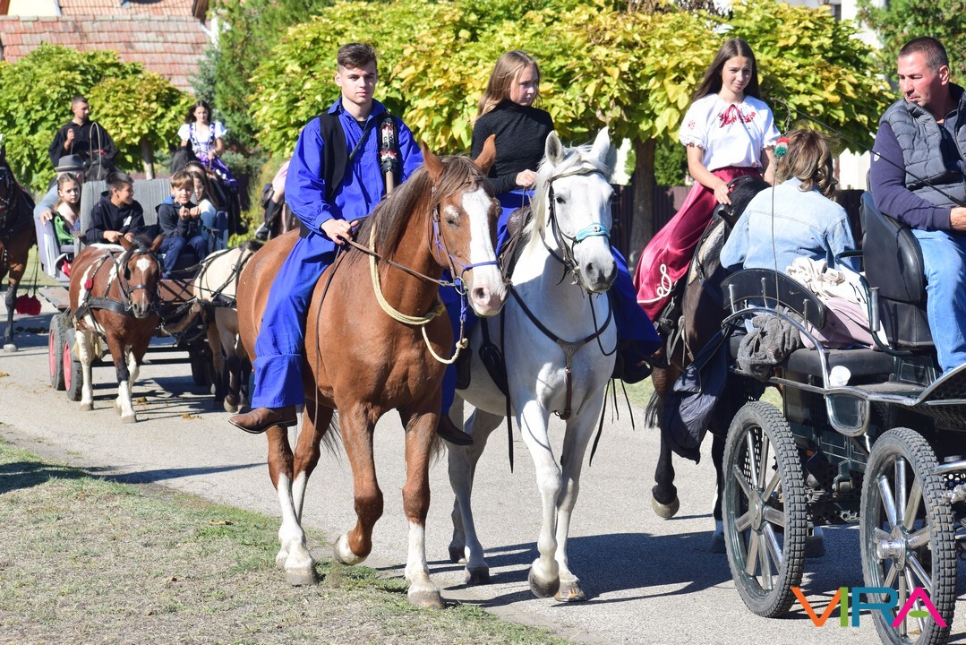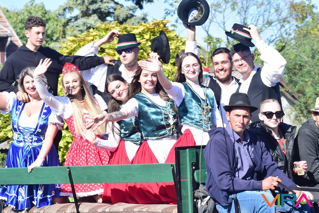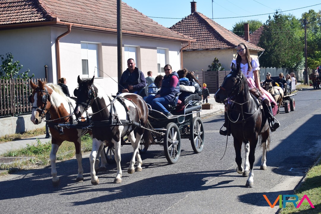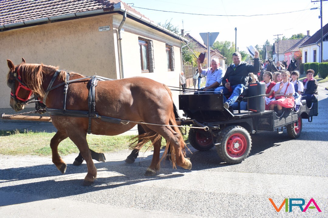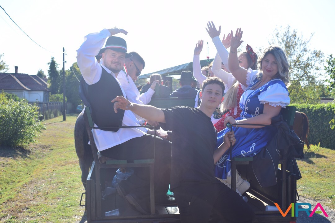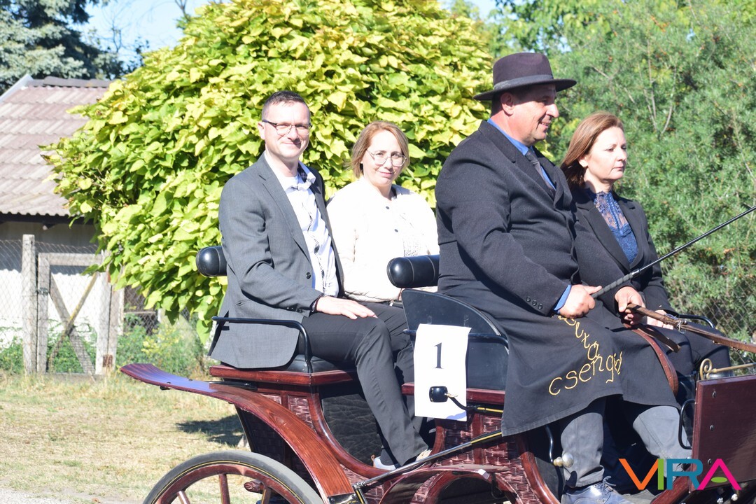 Délután fél kettőkor vette kezdetét a látványos szüreti felvonulás, melyre több településről is érkezetek lovasok, kocsisok és fogatosok. A menet először az IKSZT Dankó Pista Művelődési Ház előtt állt meg ahol külön is köszöntötték és be is mondták a fogatosok, kocsisok nevét. Részükre emléklappal és egy üveg borral köszönték meg a szervezők, hogy idén is ellátogattak Csengődre.