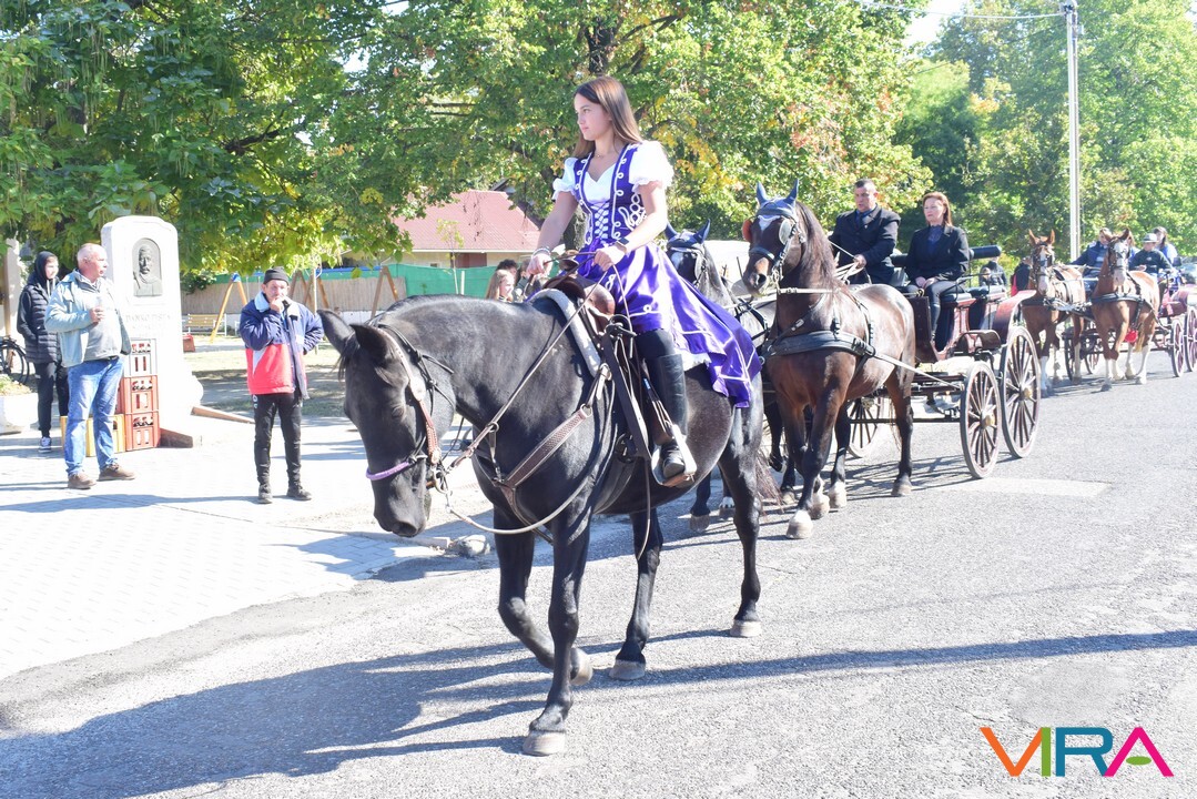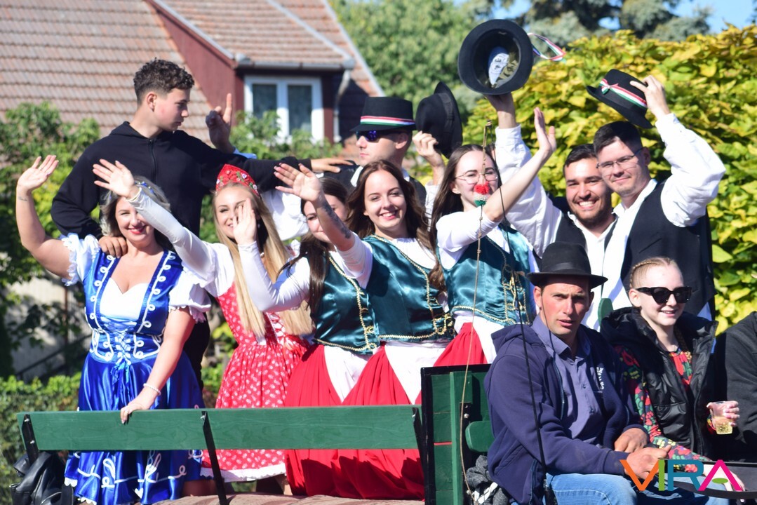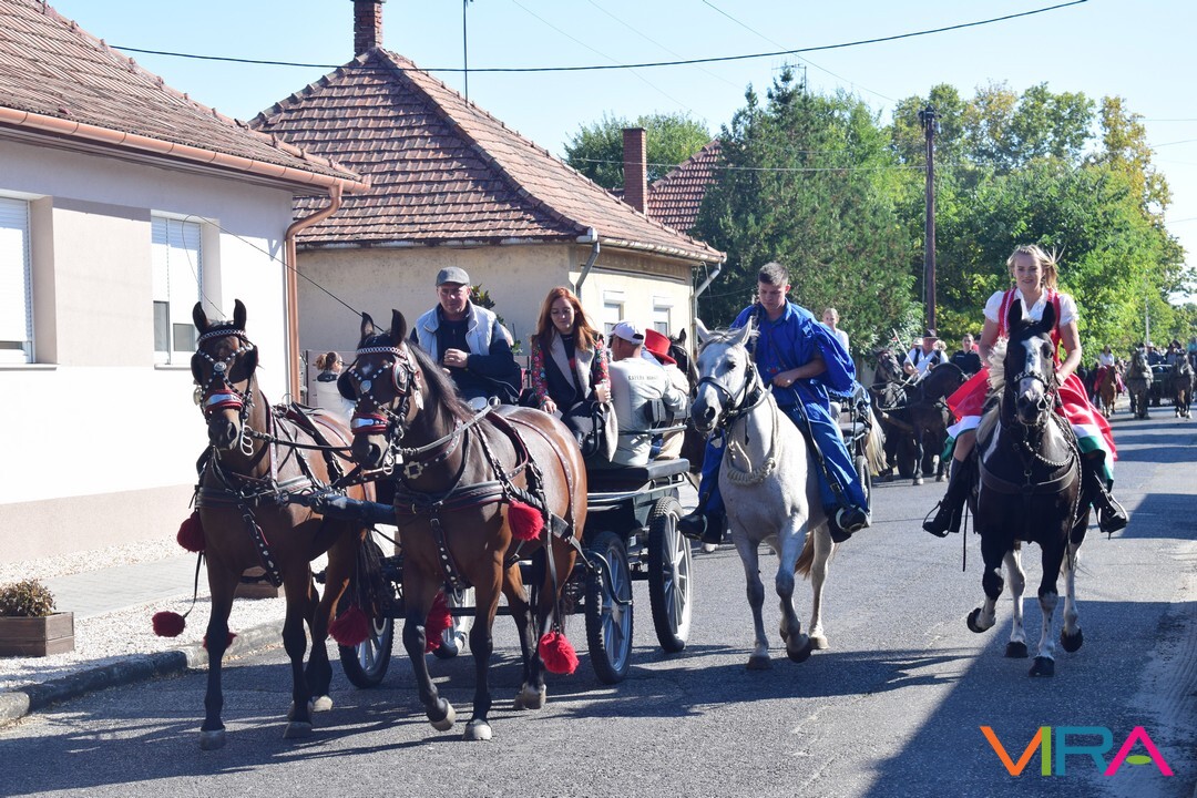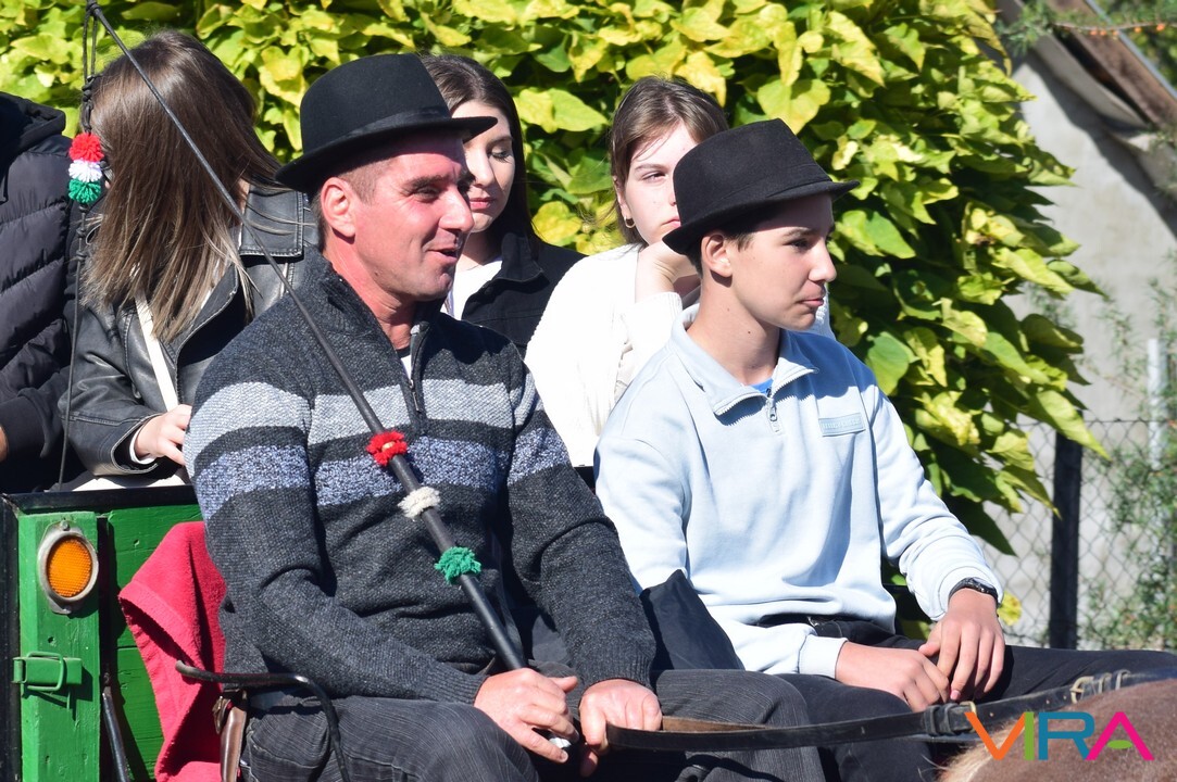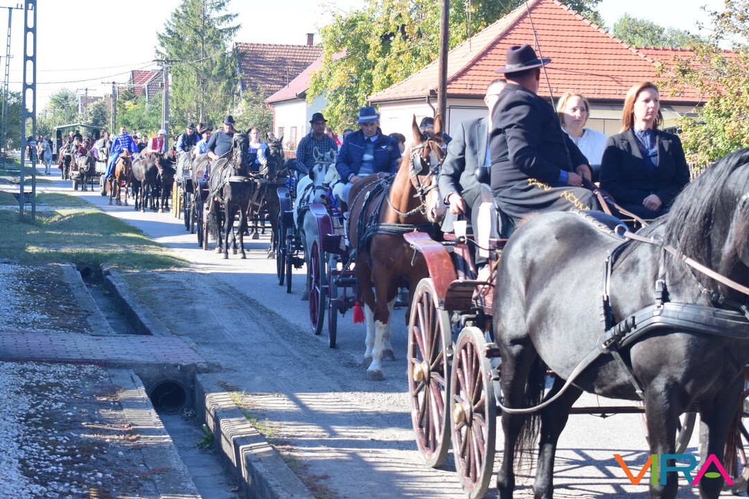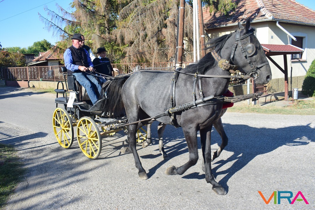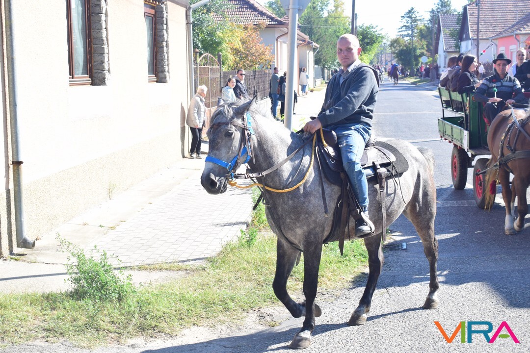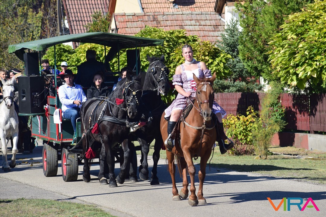 Délután fél kettőkor vette kezdetét a látványos szüreti felvonulás, melyre több településről is érkezetek lovasok, kocsisok és fogatosok. A menet először az IKSZT Dankó Pista Művelődési Ház előtt állt meg ahol külön is köszöntötték és be is mondták a fogatosok, kocsisok nevét. Részükre emléklappal és egy üveg borral köszönték meg a szervezők, hogy idén is ellátogattak Csengődre.