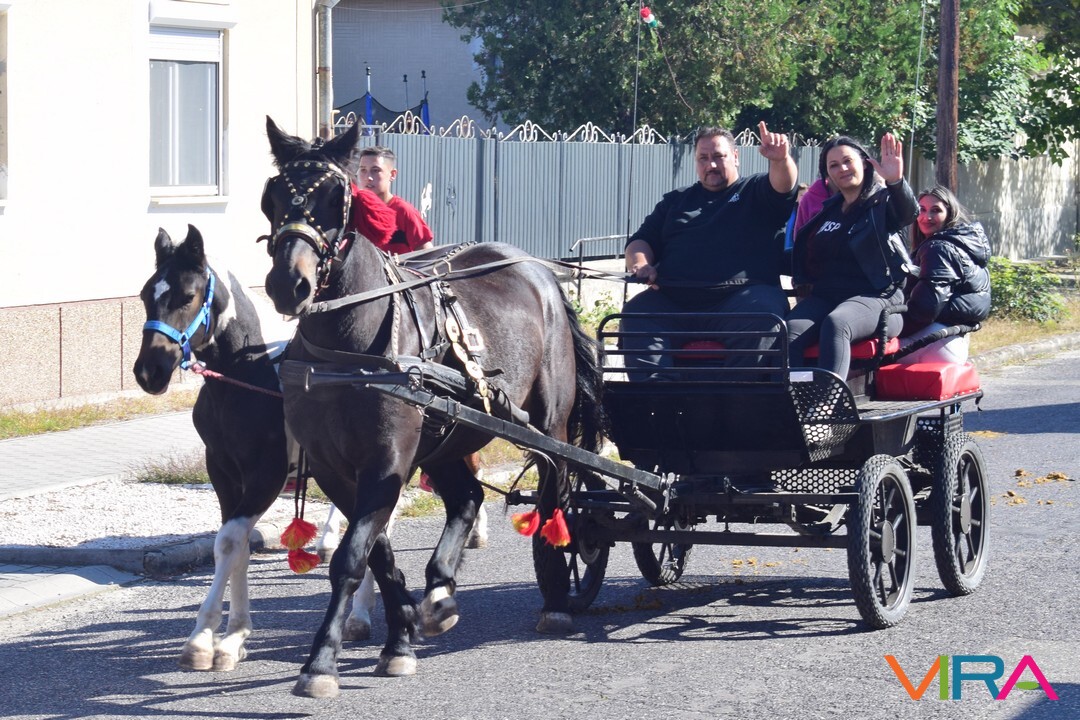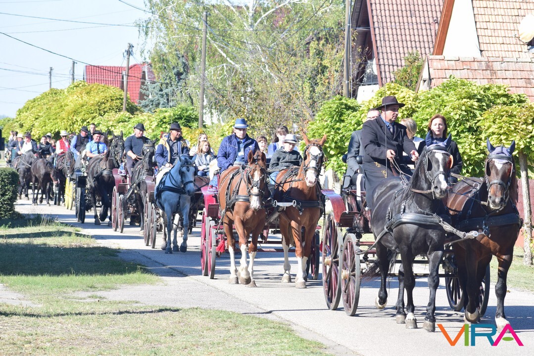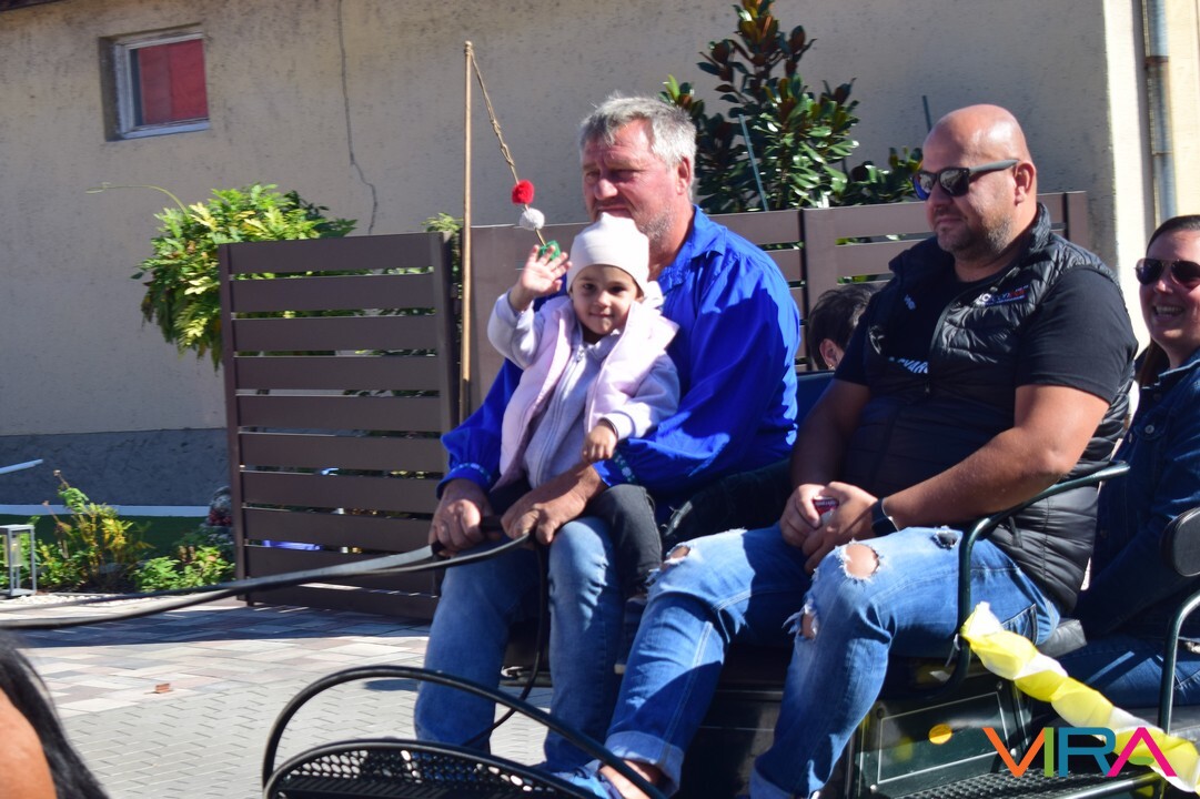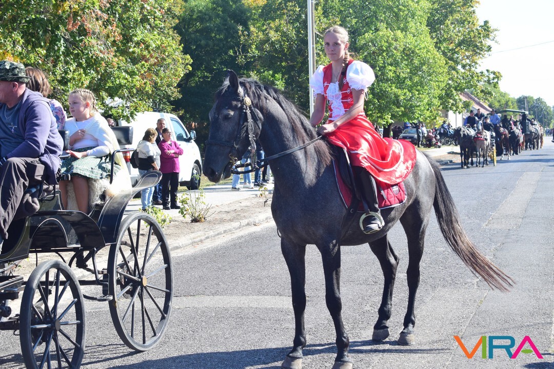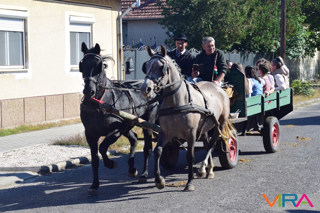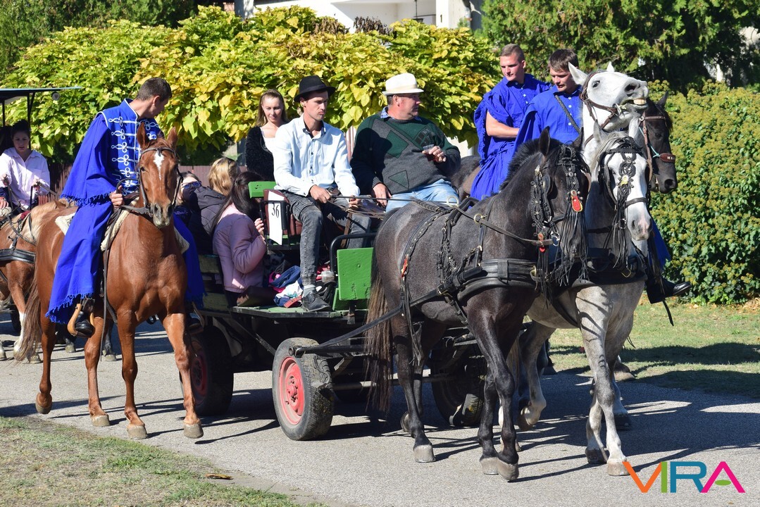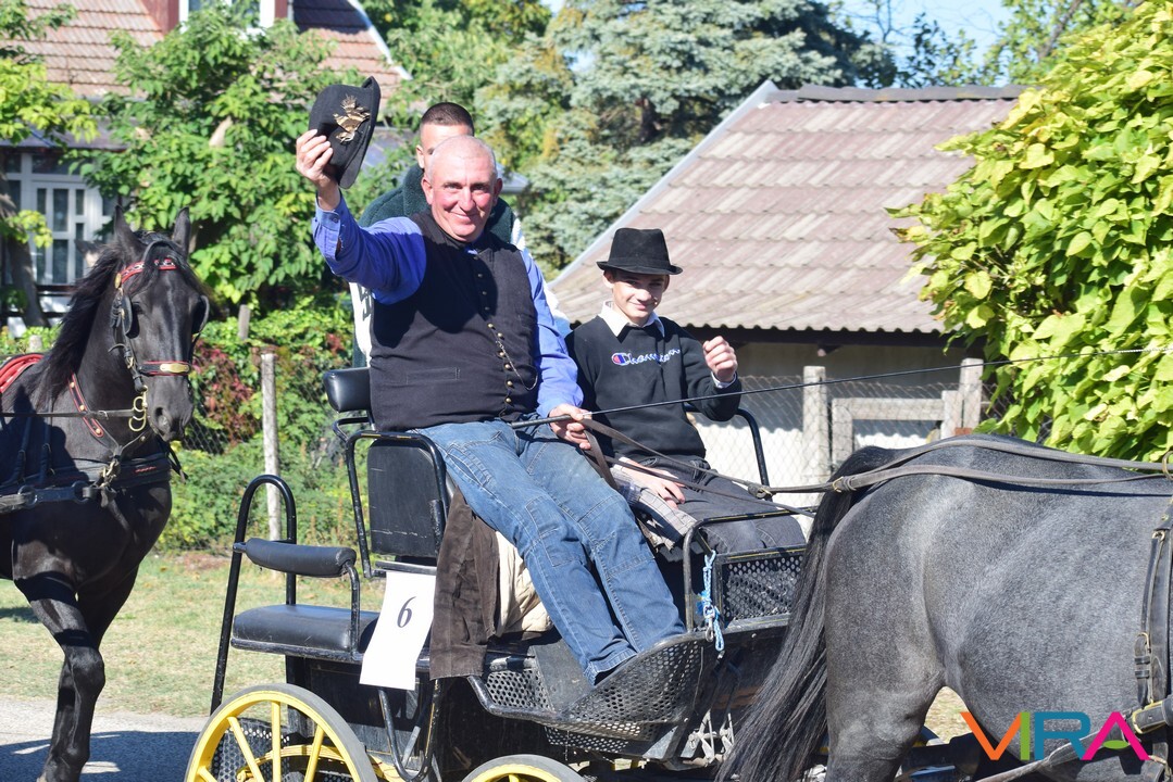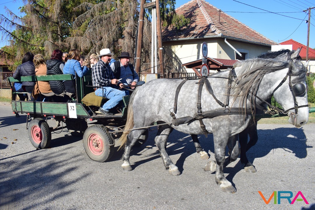 Délután fél kettőkor vette kezdetét a látványos szüreti felvonulás, melyre több településről is érkezetek lovasok, kocsisok és fogatosok. A menet először az IKSZT Dankó Pista Művelődési Ház előtt állt meg ahol külön is köszöntötték és be is mondták a fogatosok, kocsisok nevét. Részükre emléklappal és egy üveg borral köszönték meg a szervezők, hogy idén is ellátogattak Csengődre.
