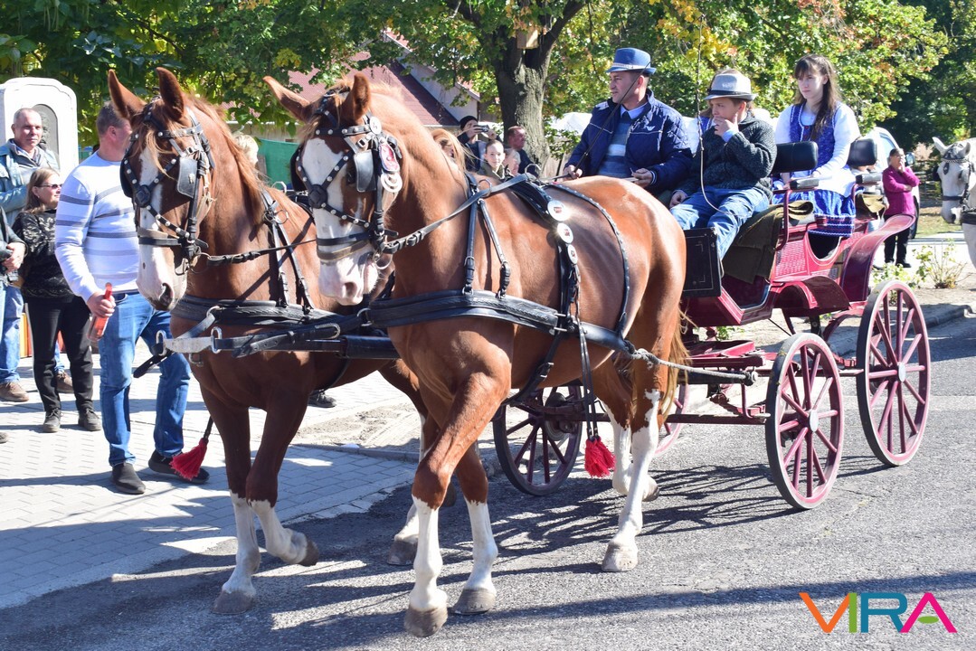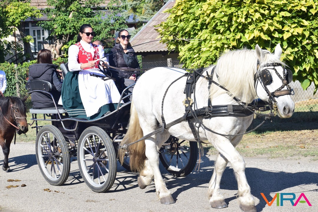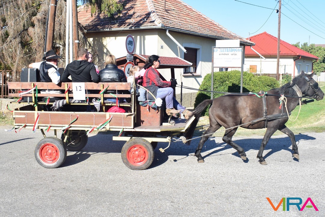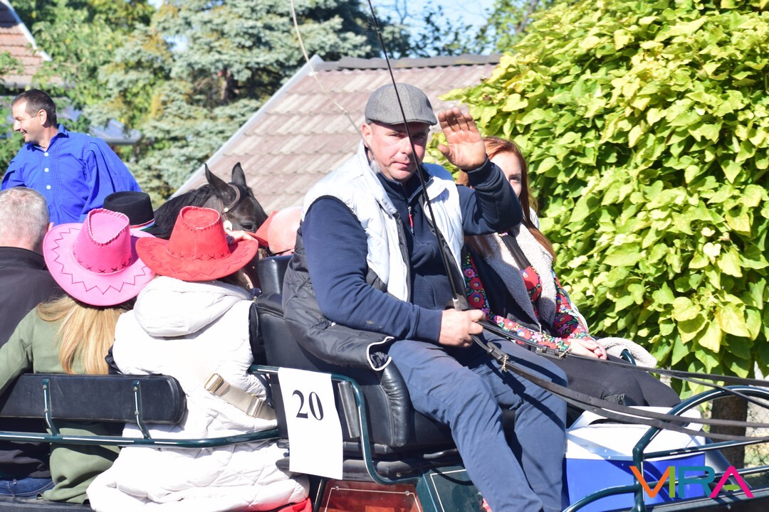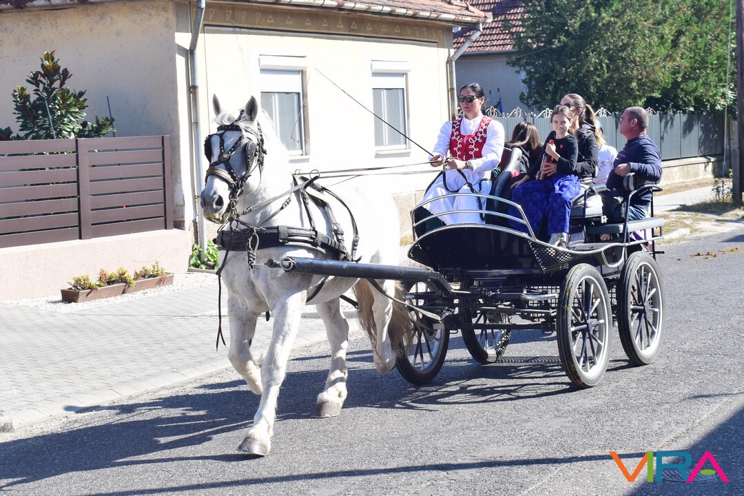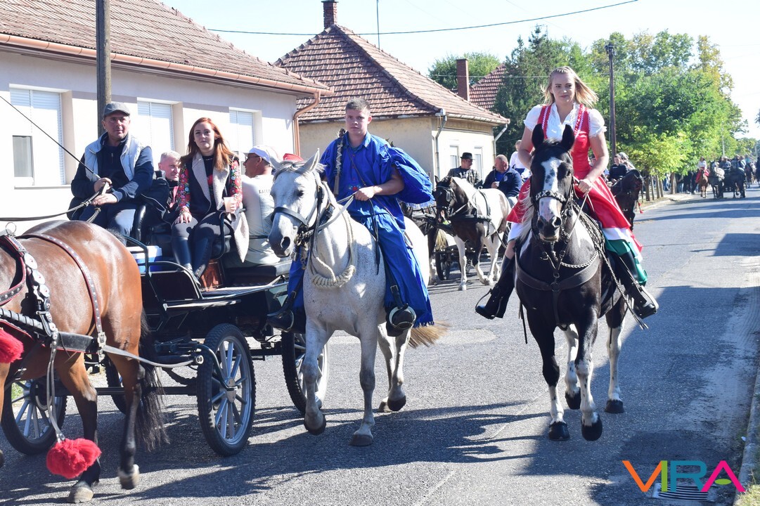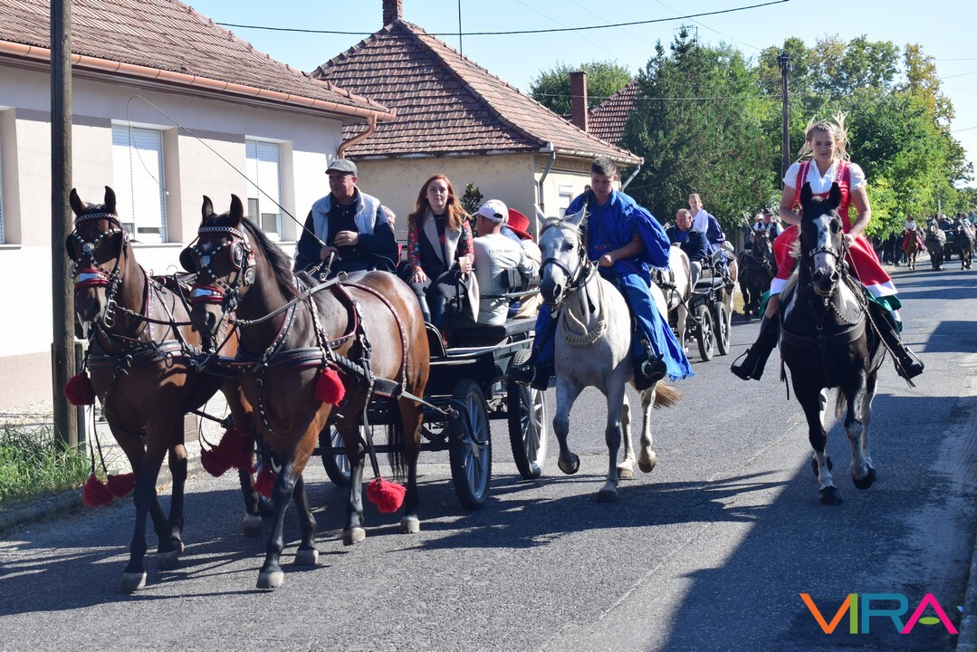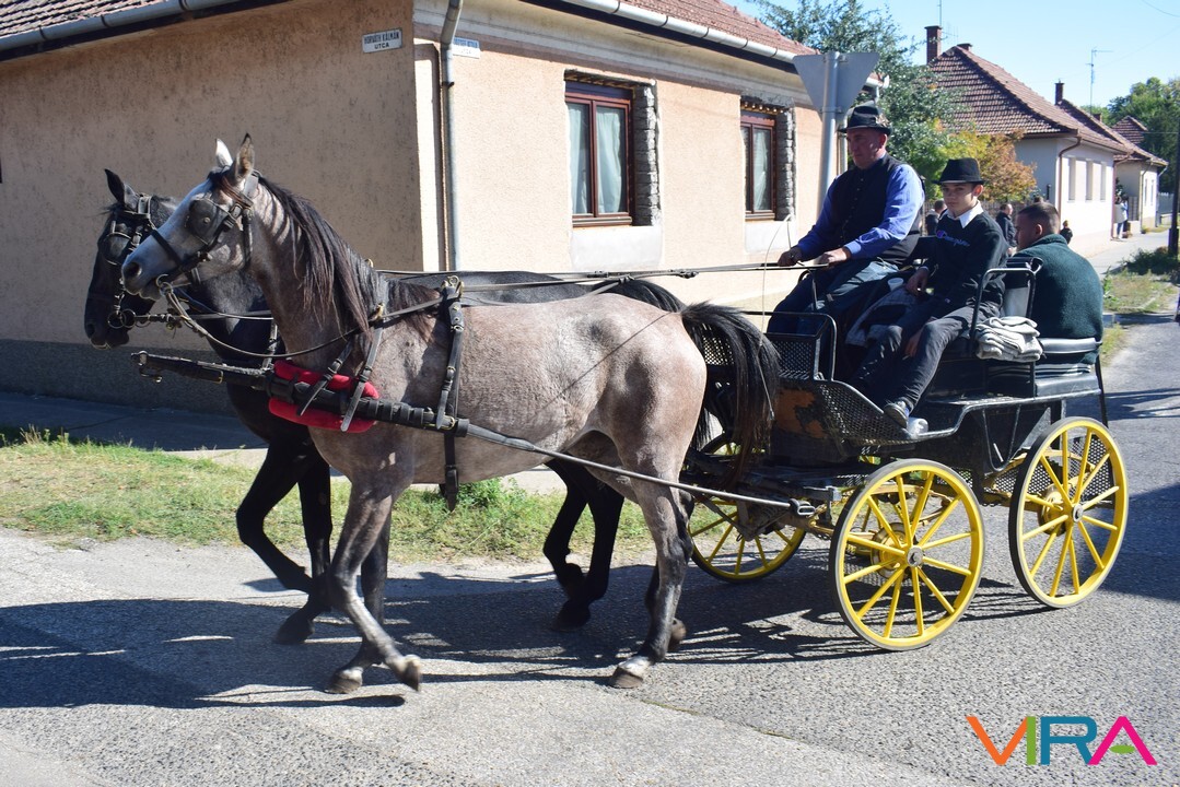 Délután fél kettőkor vette kezdetét a látványos szüreti felvonulás, melyre több településről is érkezetek lovasok, kocsisok és fogatosok. A menet először az IKSZT Dankó Pista Művelődési Ház előtt állt meg ahol külön is köszöntötték és be is mondták a fogatosok, kocsisok nevét. Részükre emléklappal és egy üveg borral köszönték meg a szervezők, hogy idén is ellátogattak Csengődre.