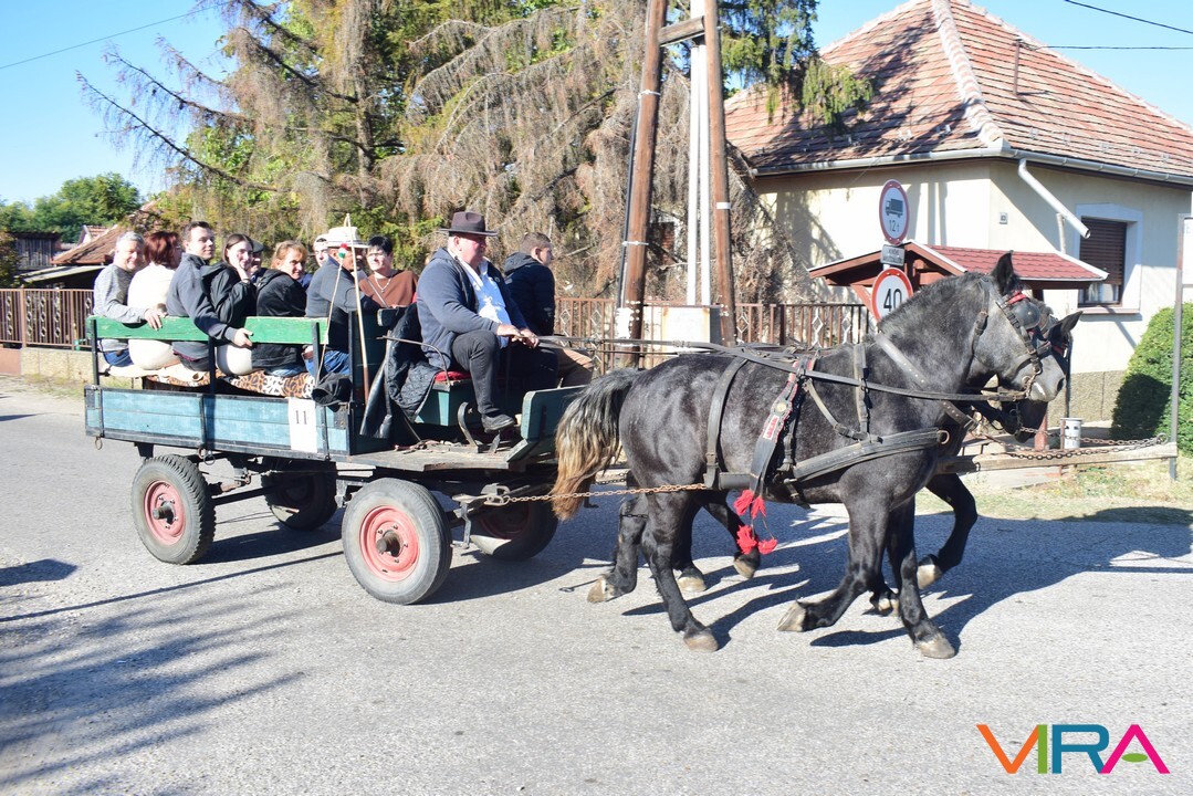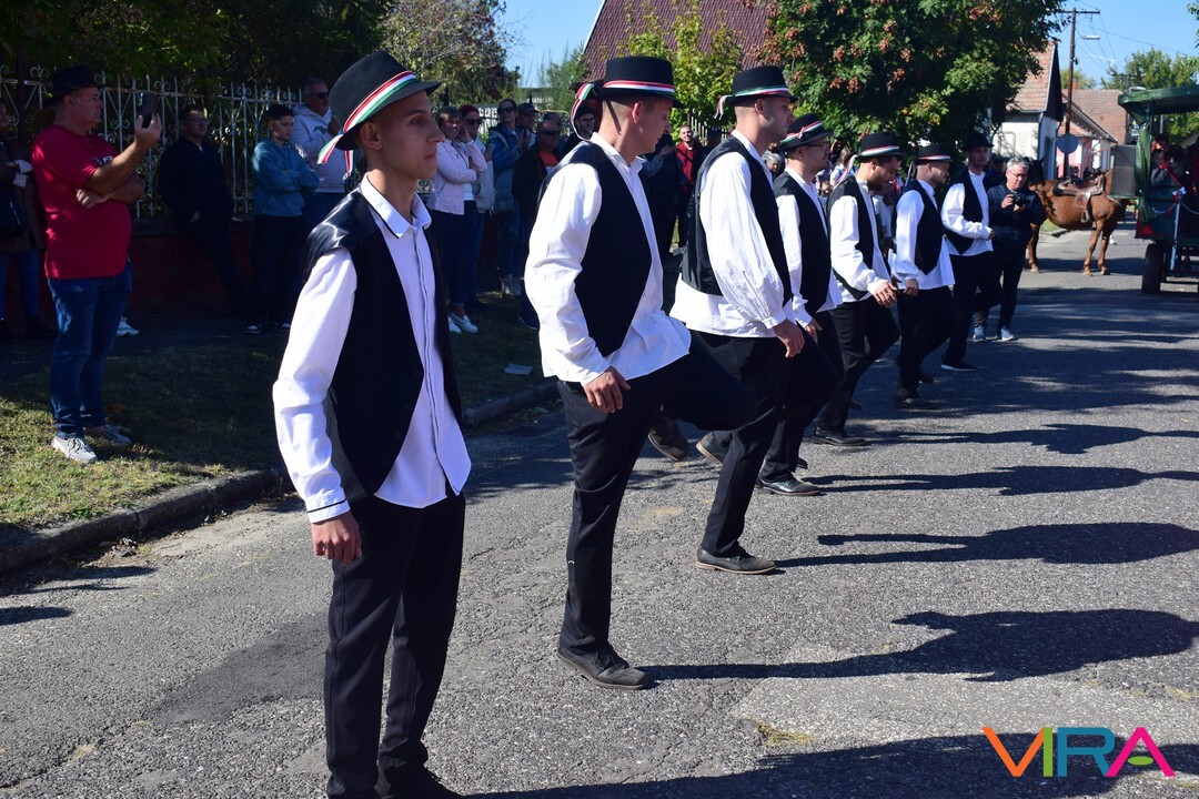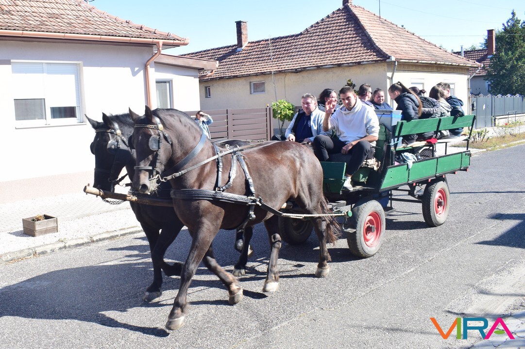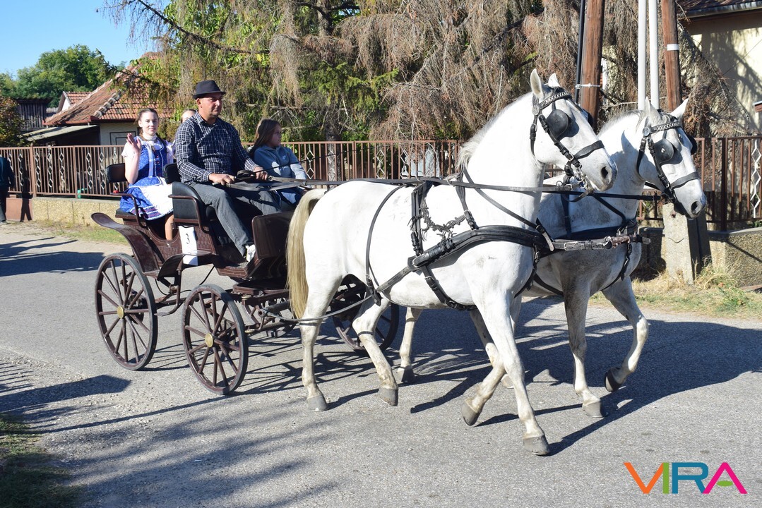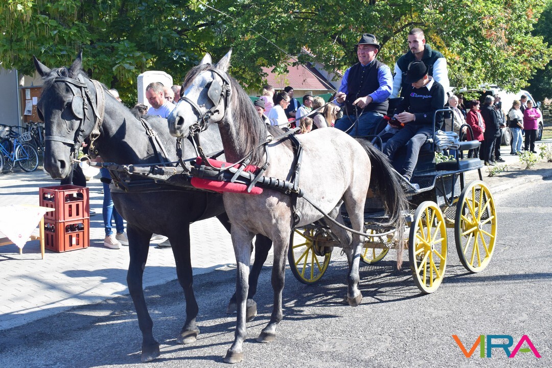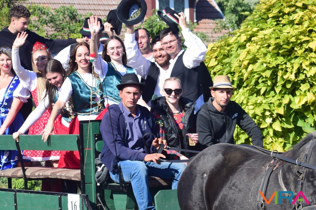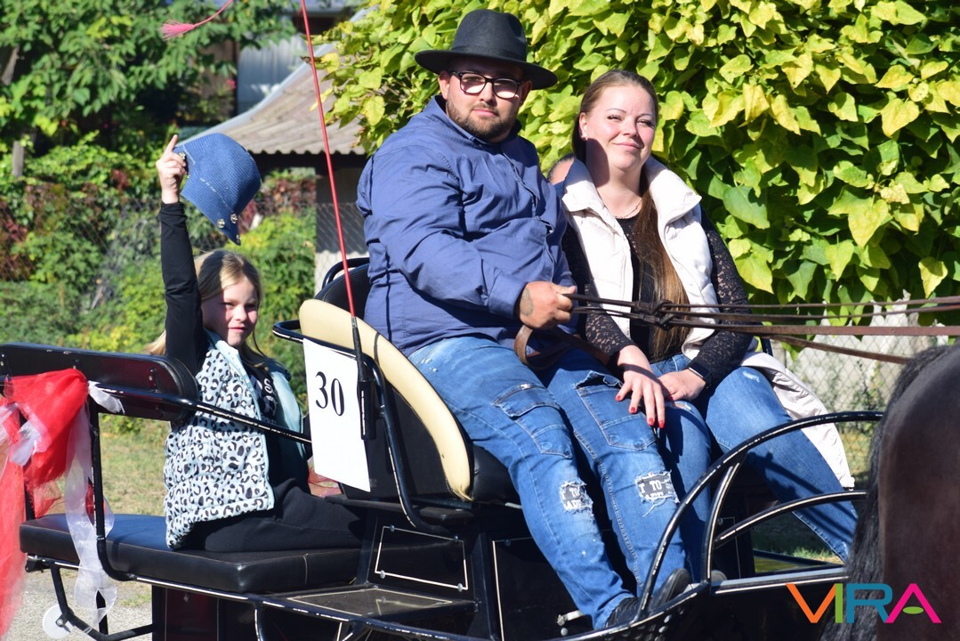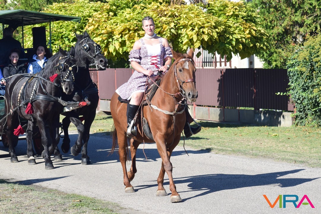 Délután fél kettőkor vette kezdetét a látványos szüreti felvonulás, melyre több településről is érkezetek lovasok, kocsisok és fogatosok. A menet először az IKSZT Dankó Pista Művelődési Ház előtt állt meg ahol külön is köszöntötték és be is mondták a fogatosok, kocsisok nevét. Részükre emléklappal és egy üveg borral köszönték meg a szervezők, hogy idén is ellátogattak Csengődre.