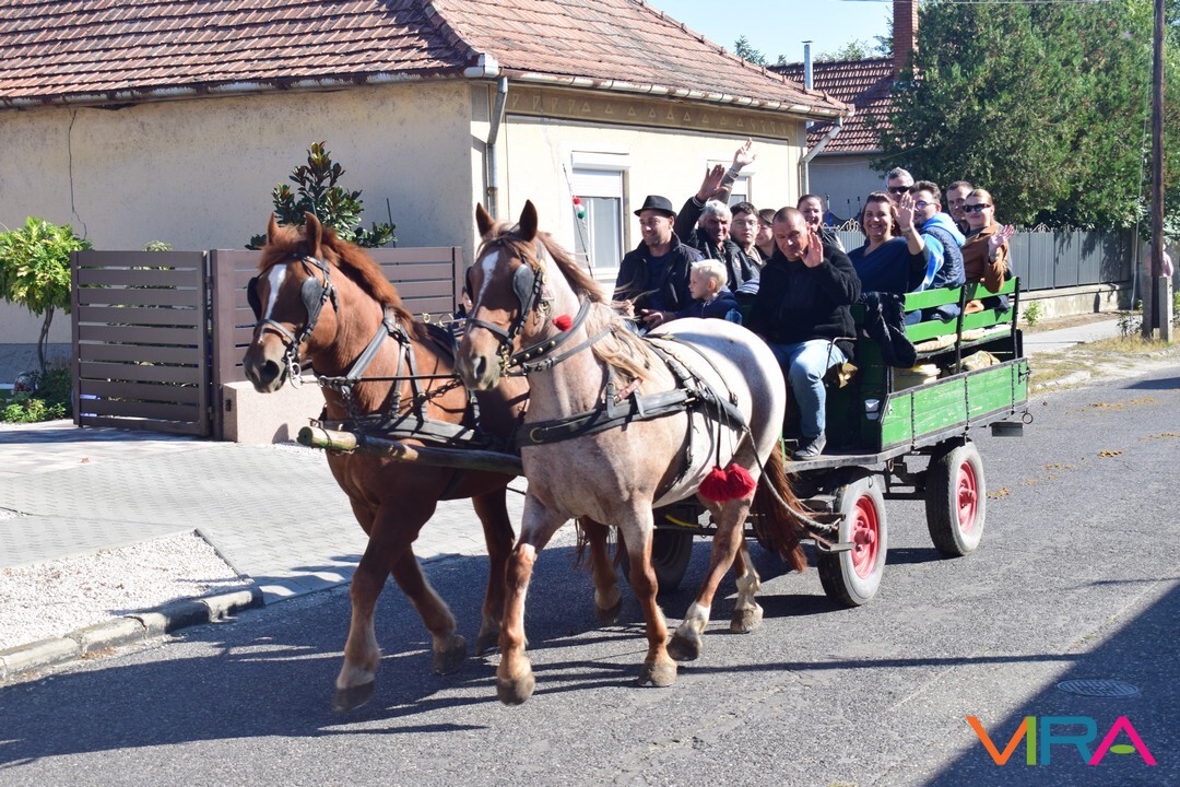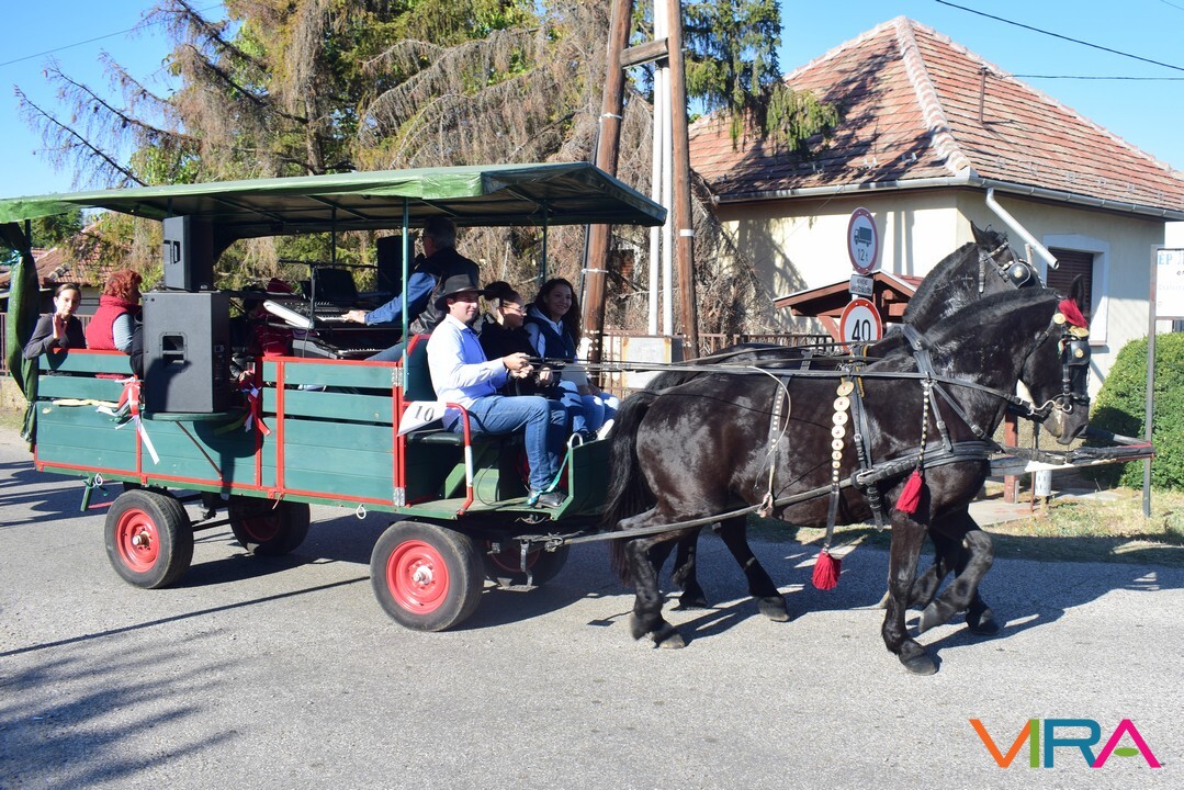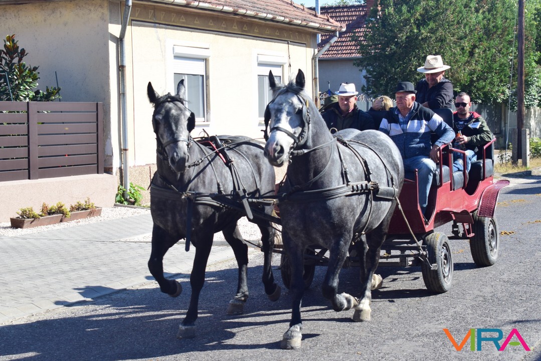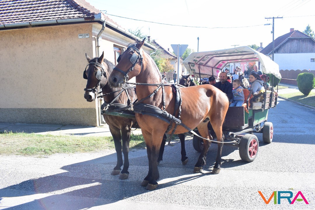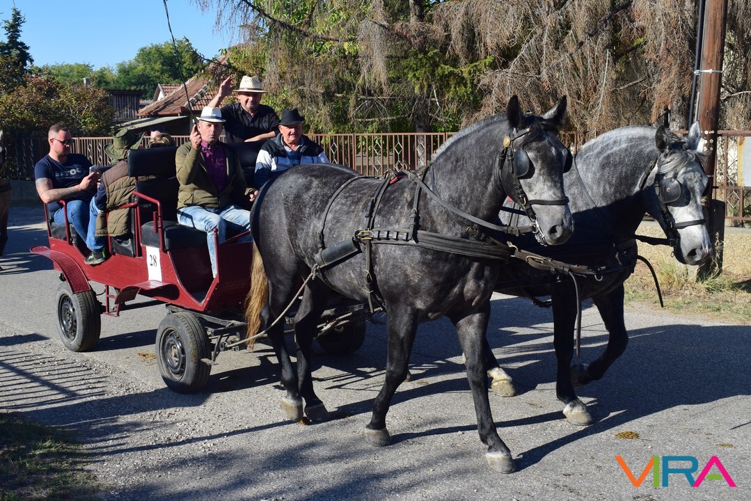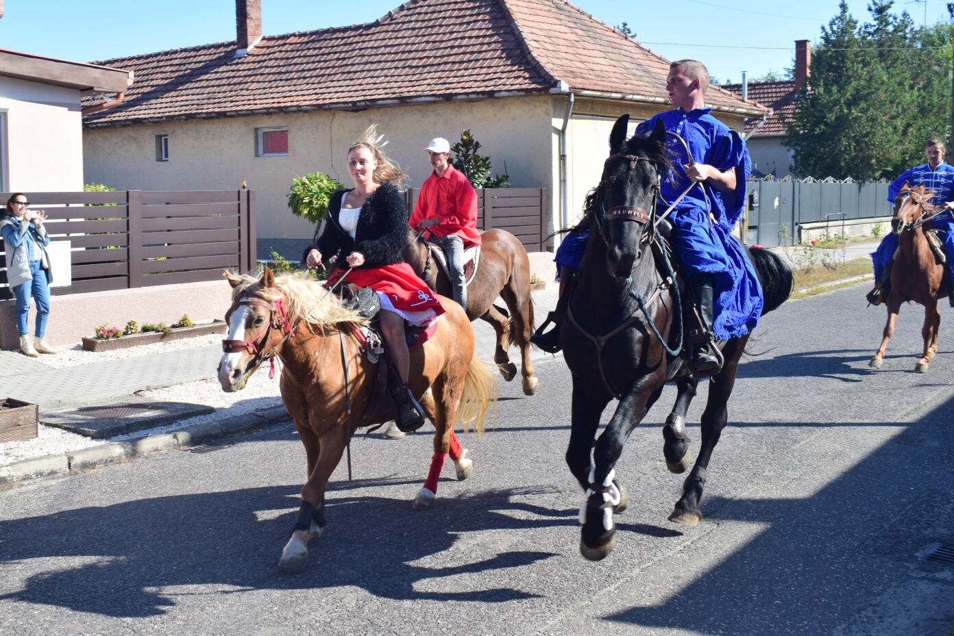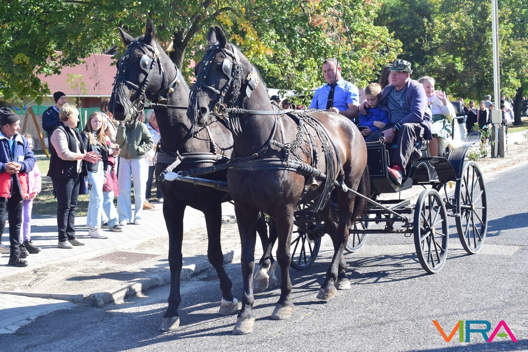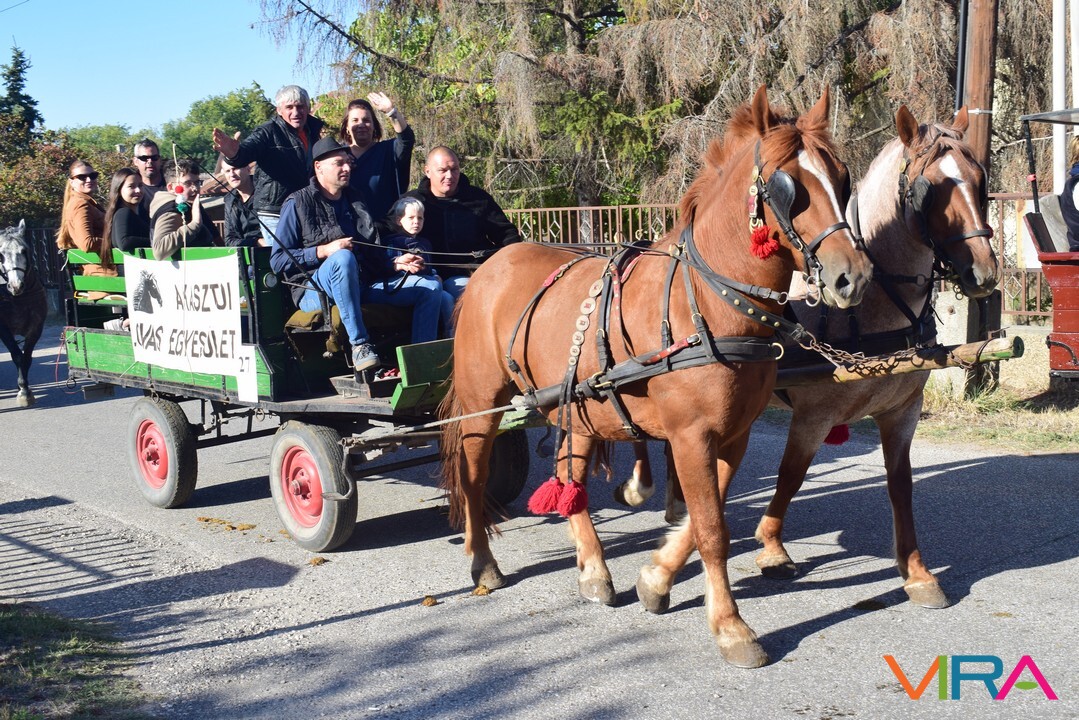 Délután fél kettőkor vette kezdetét a látványos szüreti felvonulás, melyre több településről is érkezetek lovasok, kocsisok és fogatosok. A menet először az IKSZT Dankó Pista Művelődési Ház előtt állt meg ahol külön is köszöntötték és be is mondták a fogatosok, kocsisok nevét. Részükre emléklappal és egy üveg borral köszönték meg a szervezők, hogy idén is ellátogattak Csengődre.