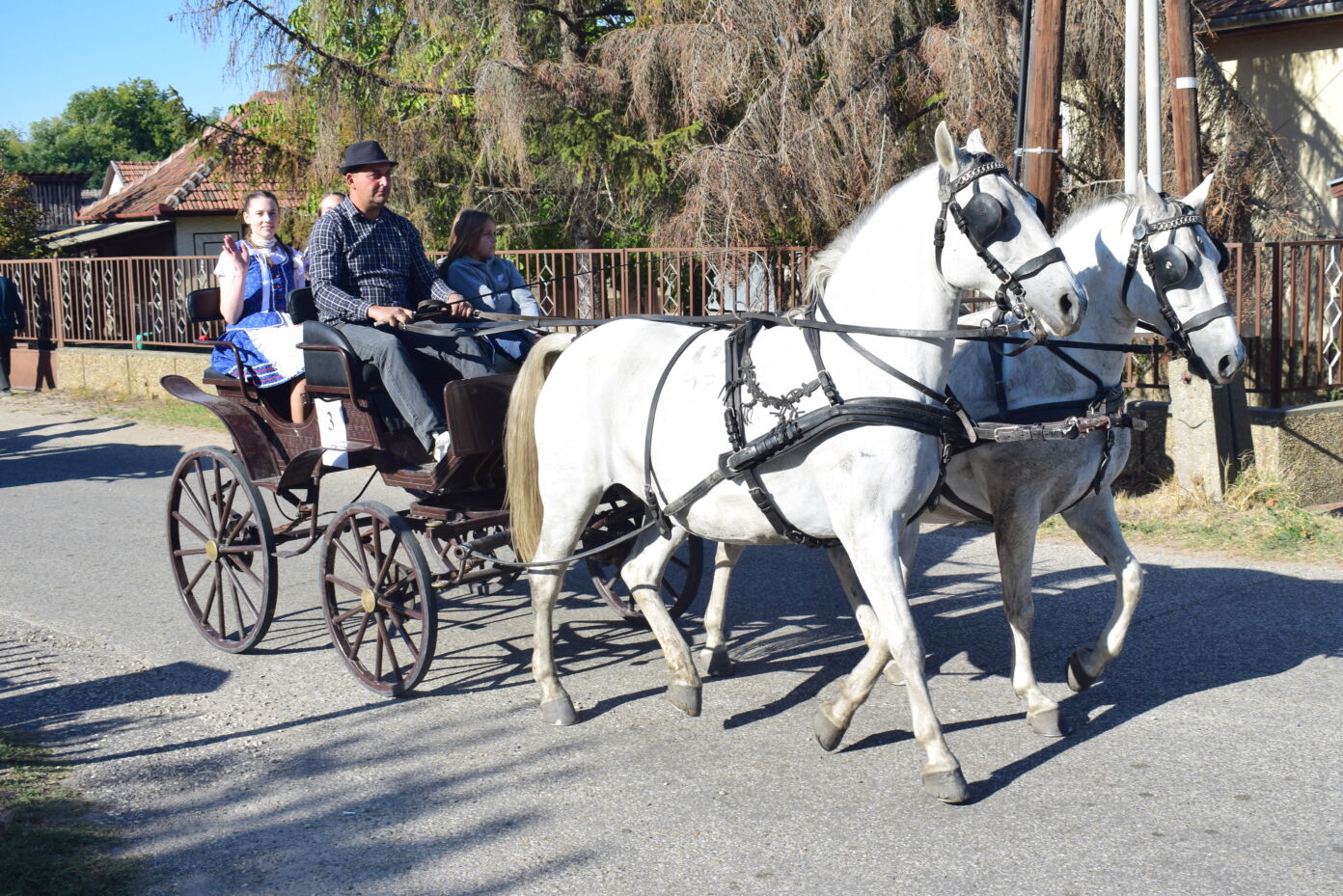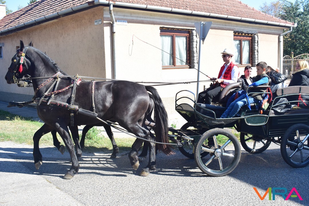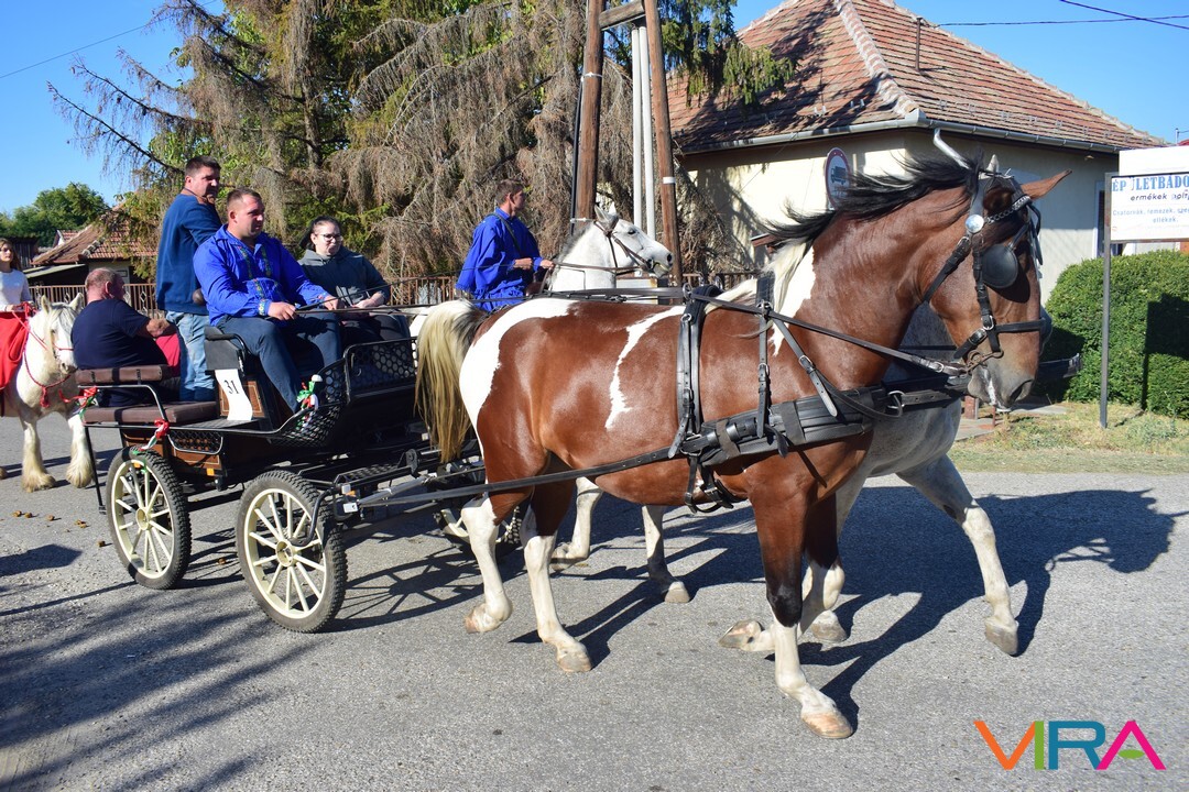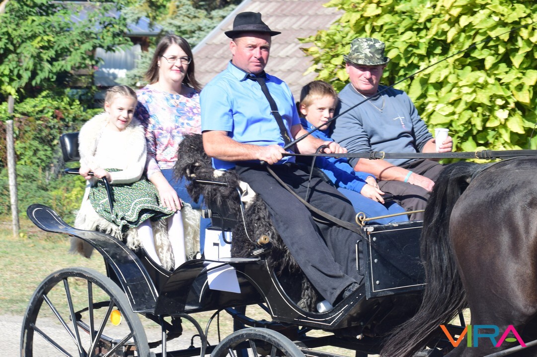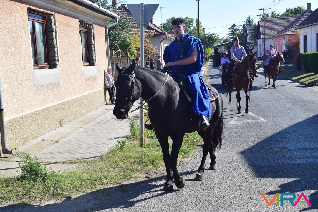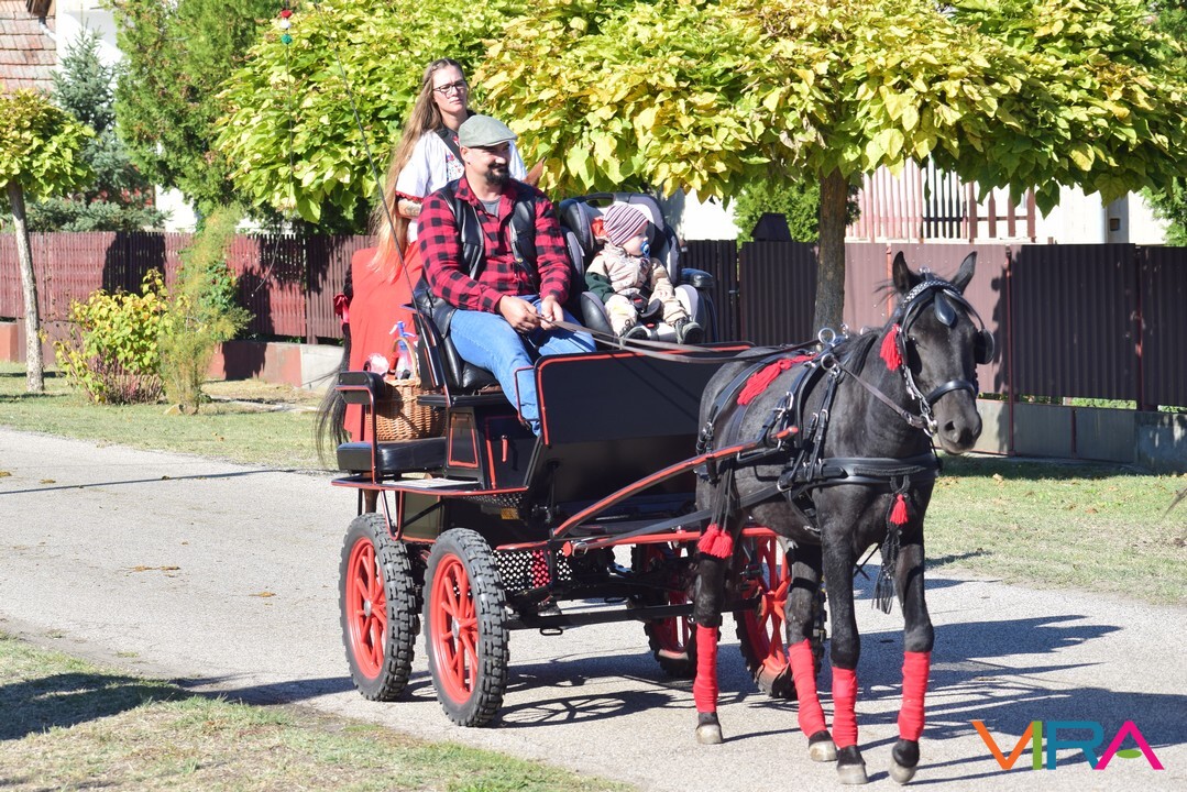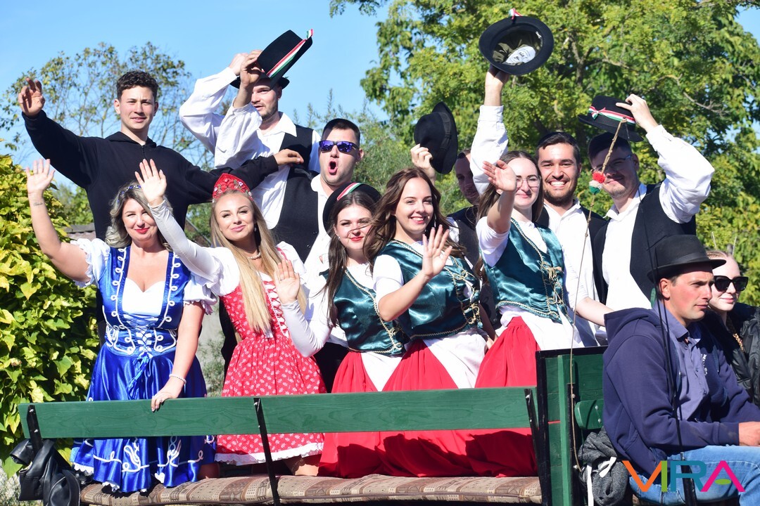 Délután fél kettőkor vette kezdetét a látványos szüreti felvonulás, melyre több településről is érkezetek lovasok, kocsisok és fogatosok. A menet először az IKSZT Dankó Pista Művelődési Ház előtt állt meg ahol külön is köszöntötték és be is mondták a fogatosok, kocsisok nevét. Részükre emléklappal és egy üveg borral köszönték meg a szervezők, hogy idén is ellátogattak Csengődre.