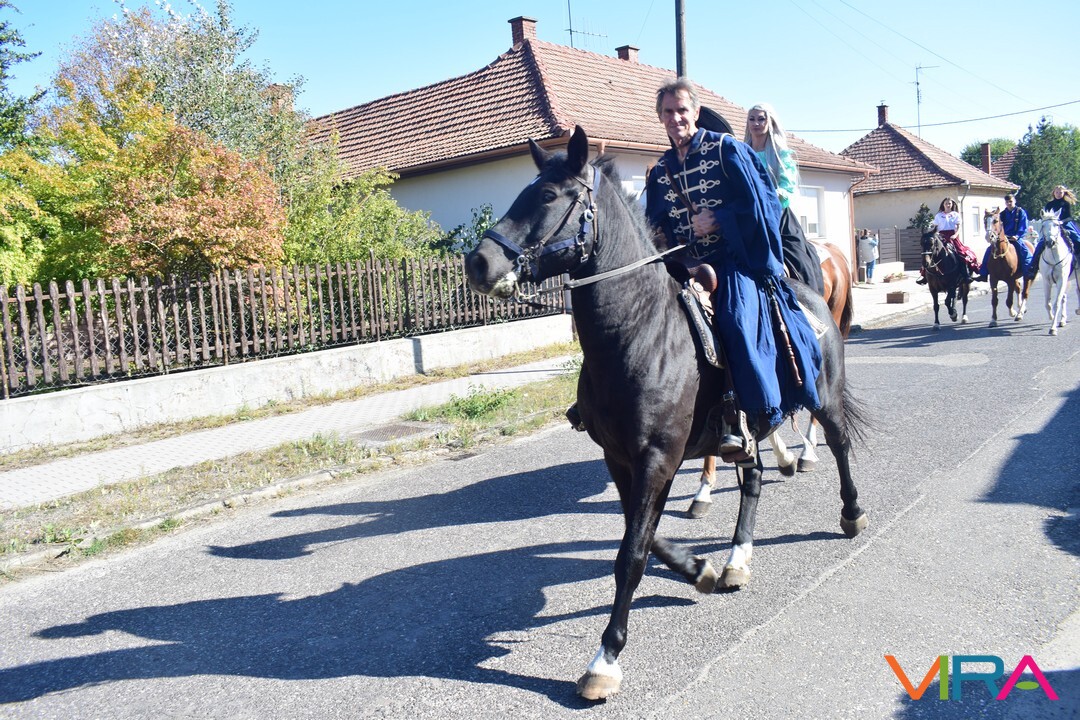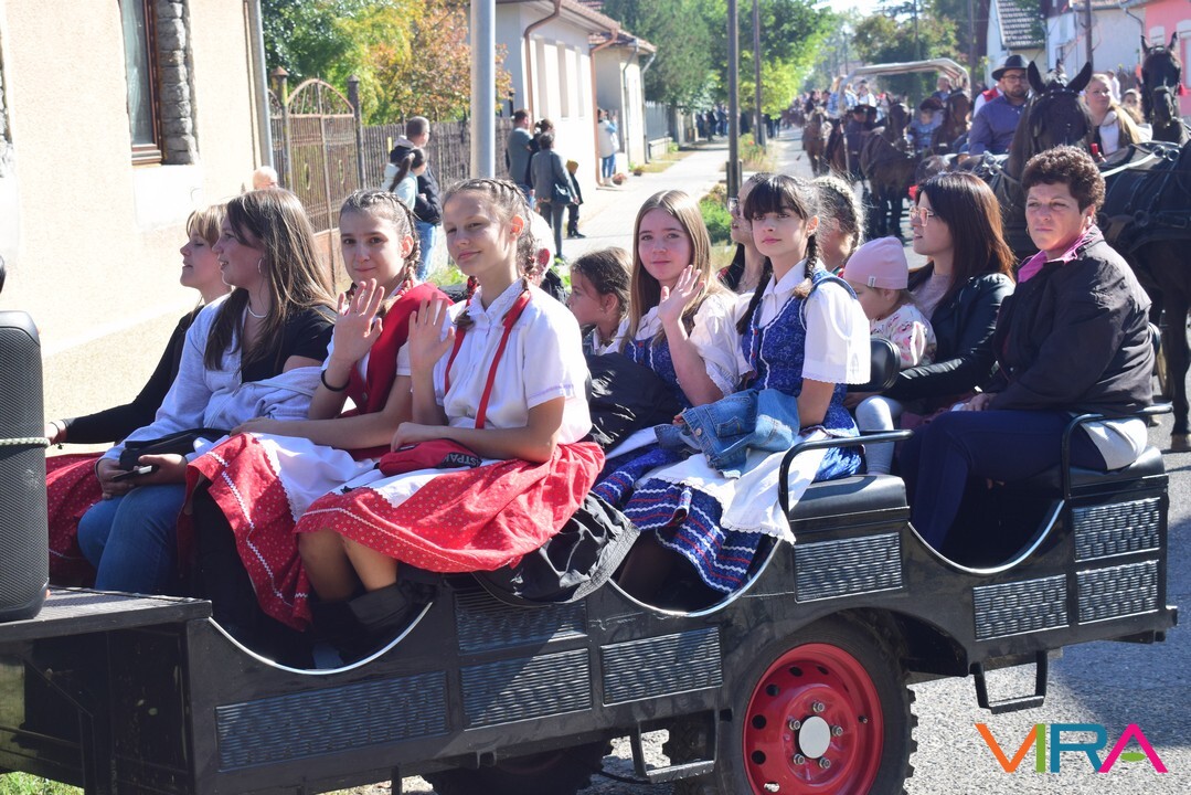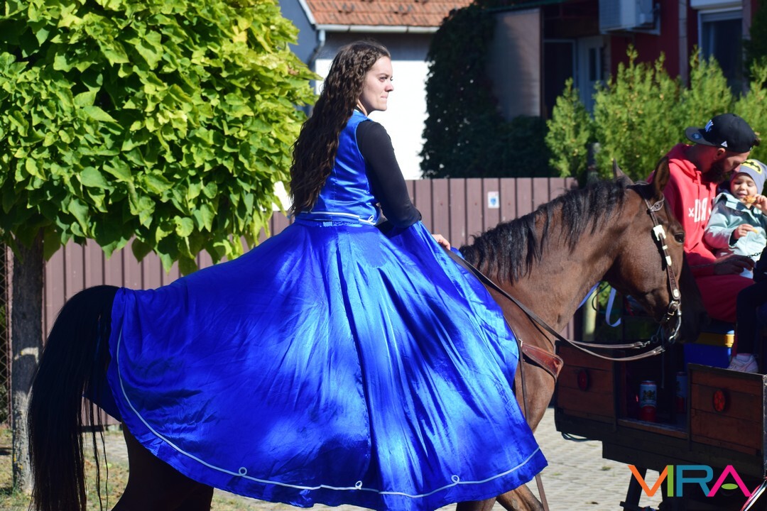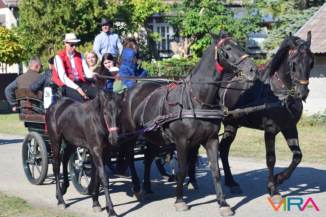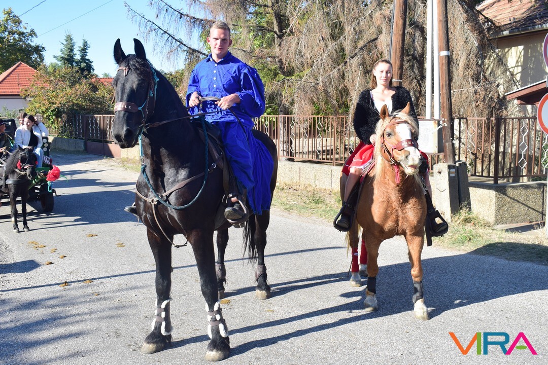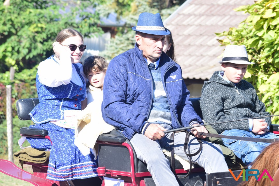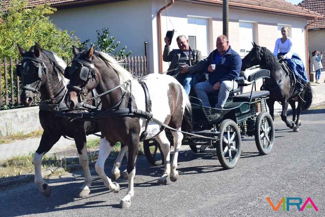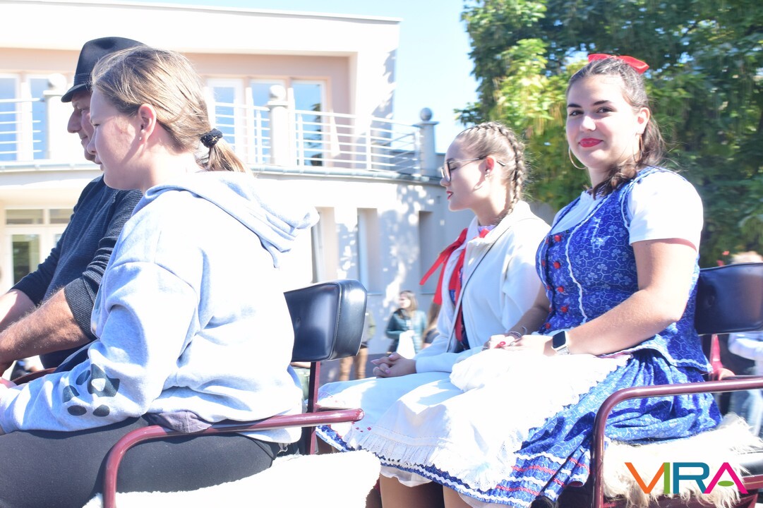 Délután fél kettőkor vette kezdetét a látványos szüreti felvonulás, melyre több településről is érkezetek lovasok, kocsisok és fogatosok. A menet először az IKSZT Dankó Pista Művelődési Ház előtt állt meg ahol külön is köszöntötték és be is mondták a fogatosok, kocsisok nevét. Részükre emléklappal és egy üveg borral köszönték meg a szervezők, hogy idén is ellátogattak Csengődre.
