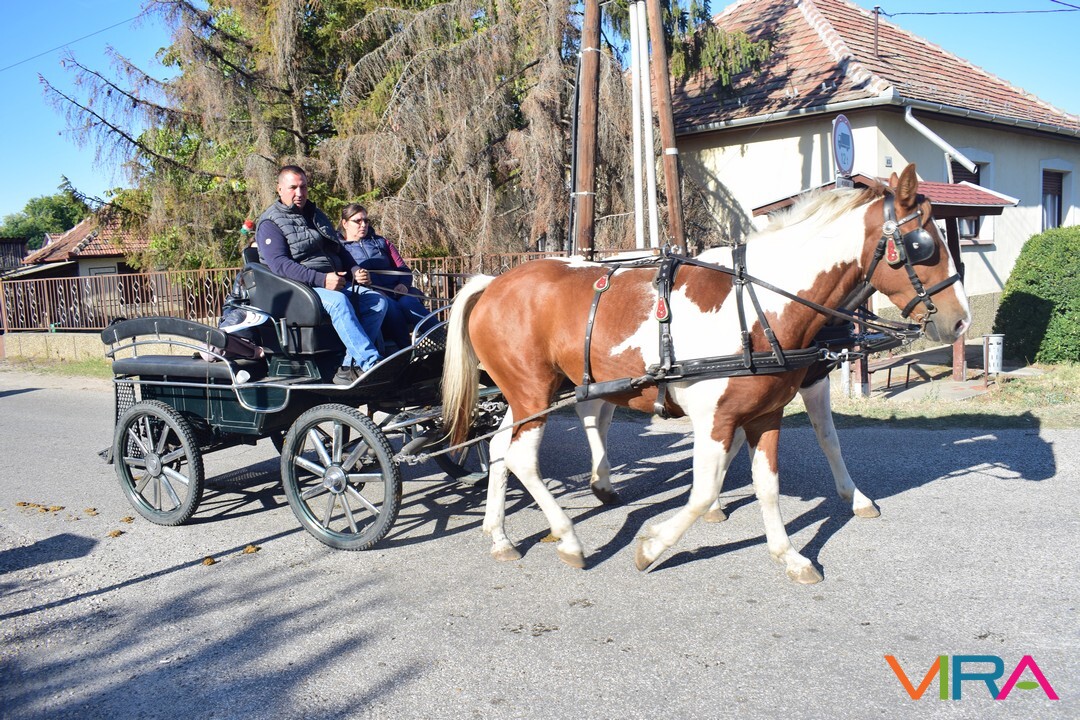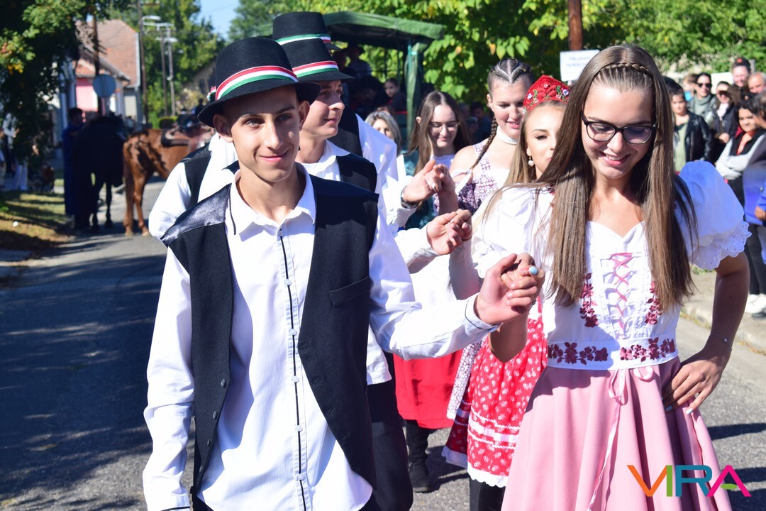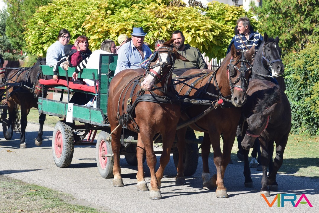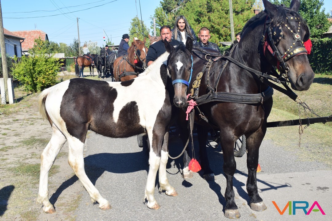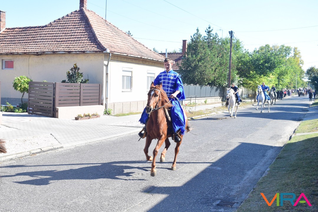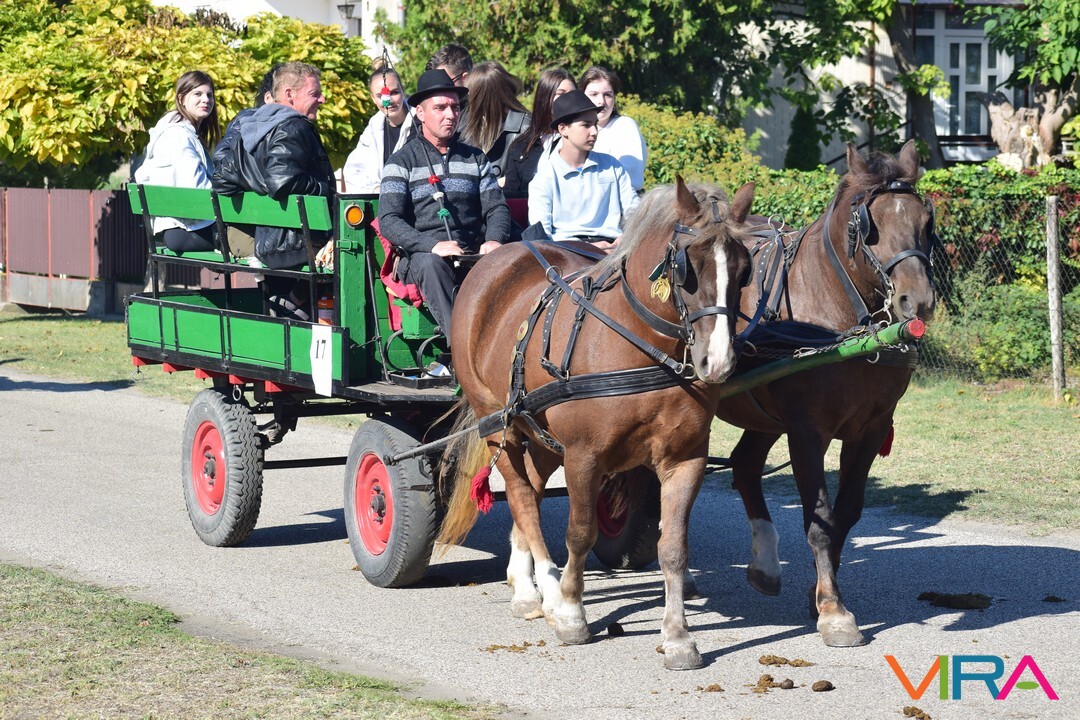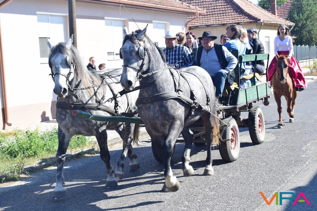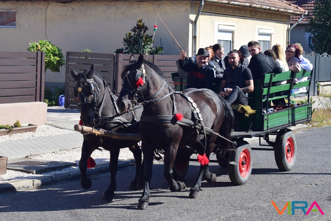 Délután fél kettőkor vette kezdetét a látványos szüreti felvonulás, melyre több településről is érkezetek lovasok, kocsisok és fogatosok. A menet először az IKSZT Dankó Pista Művelődési Ház előtt állt meg ahol külön is köszöntötték és be is mondták a fogatosok, kocsisok nevét. Részükre emléklappal és egy üveg borral köszönték meg a szervezők, hogy idén is ellátogattak Csengődre.
