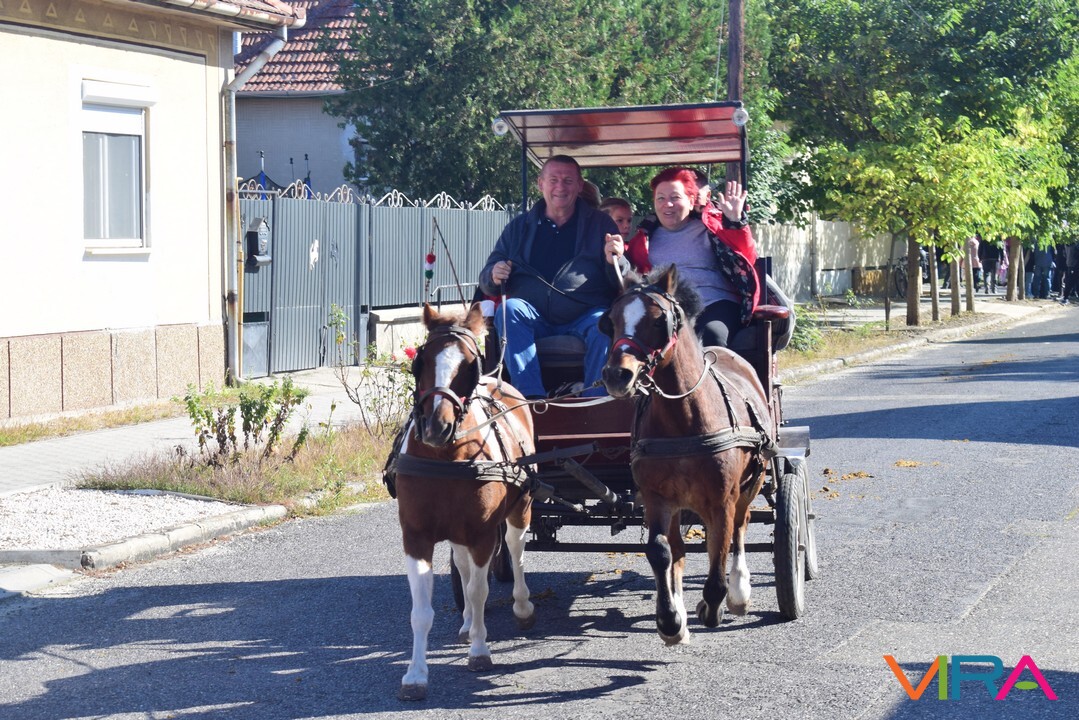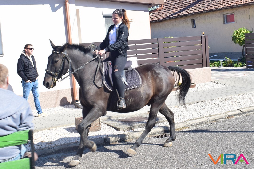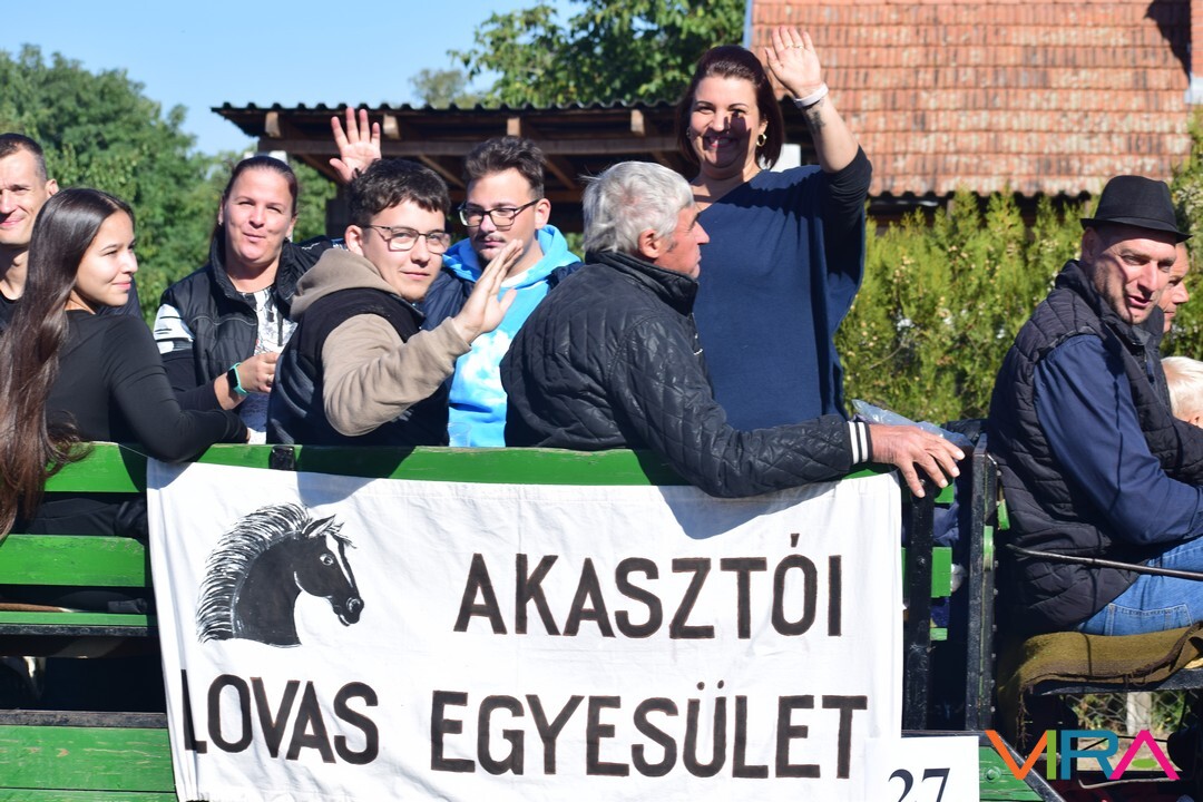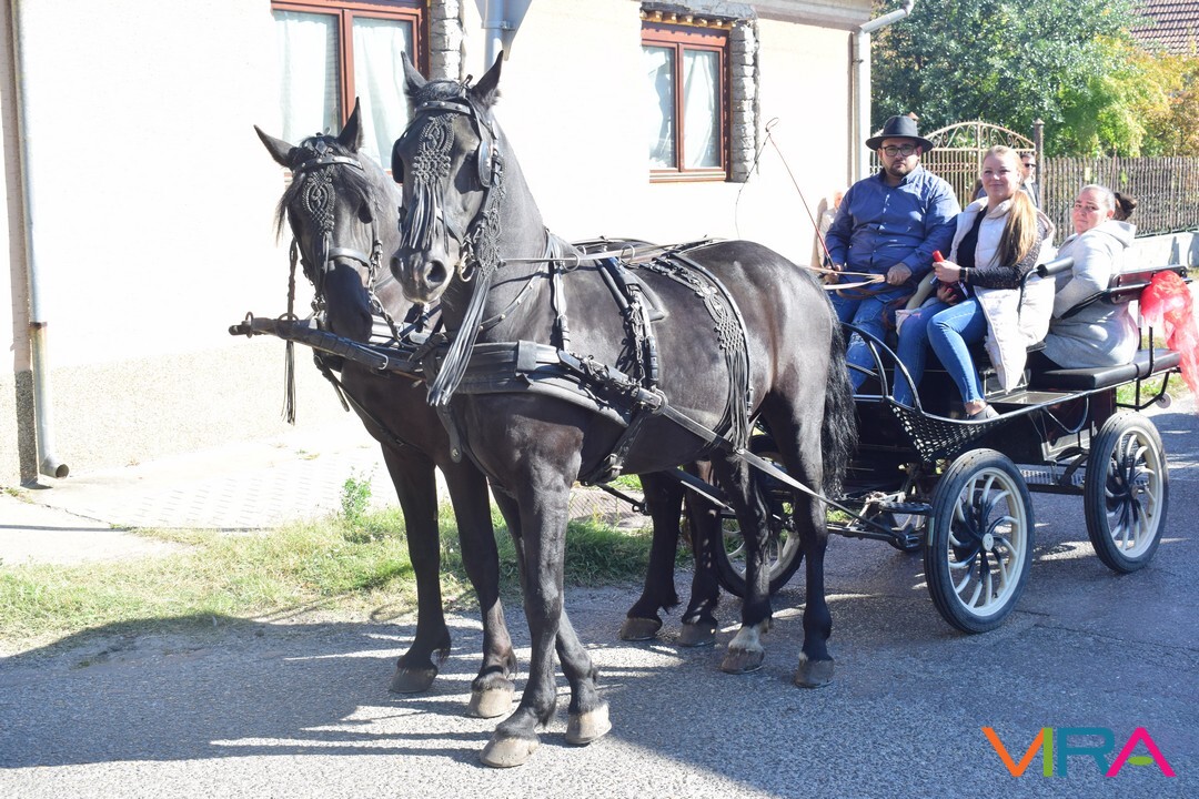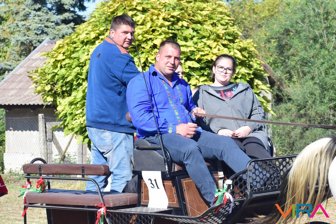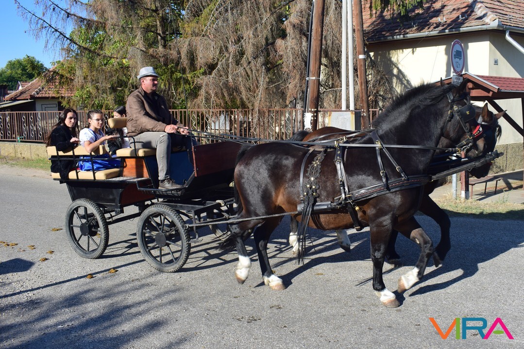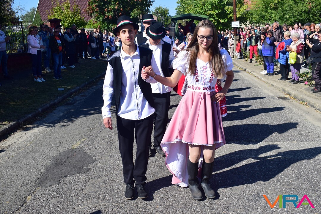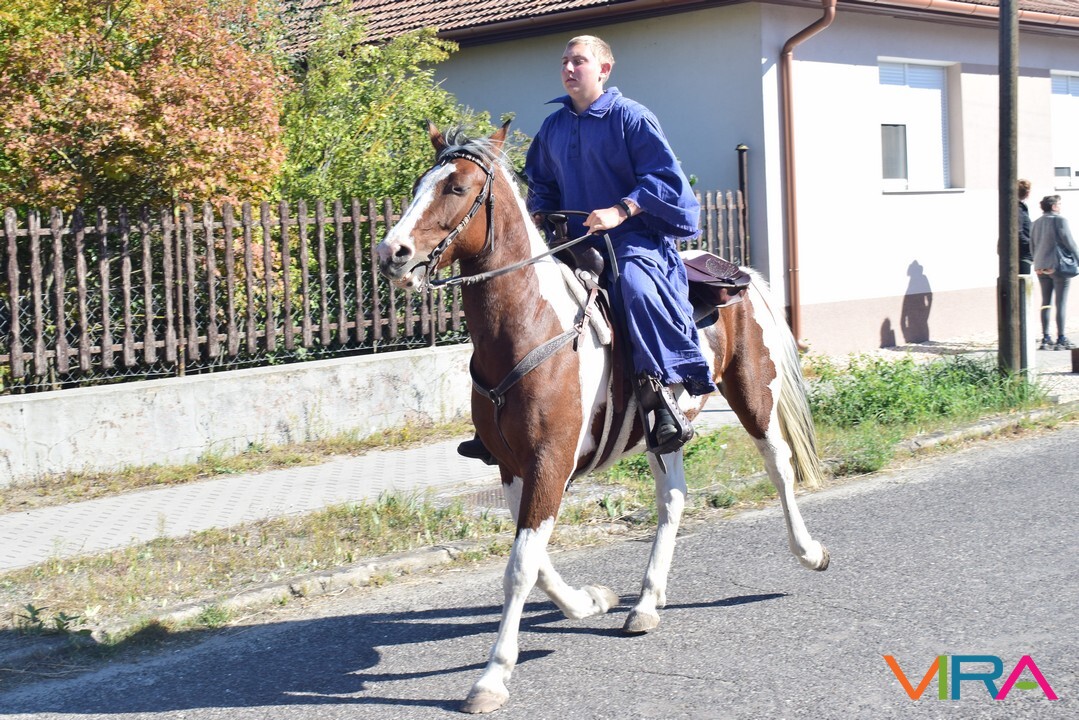 Délután fél kettőkor vette kezdetét a látványos szüreti felvonulás, melyre több településről is érkezetek lovasok, kocsisok és fogatosok. A menet először az IKSZT Dankó Pista Művelődési Ház előtt állt meg ahol külön is köszöntötték és be is mondták a fogatosok, kocsisok nevét. Részükre emléklappal és egy üveg borral köszönték meg a szervezők, hogy idén is ellátogattak Csengődre.