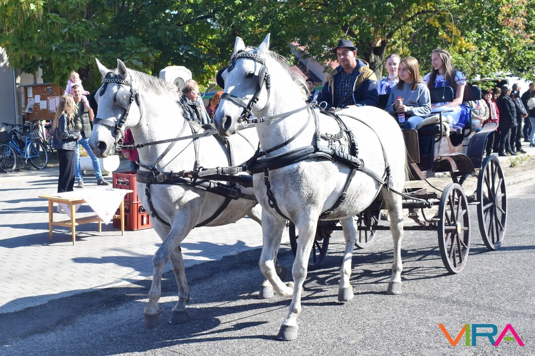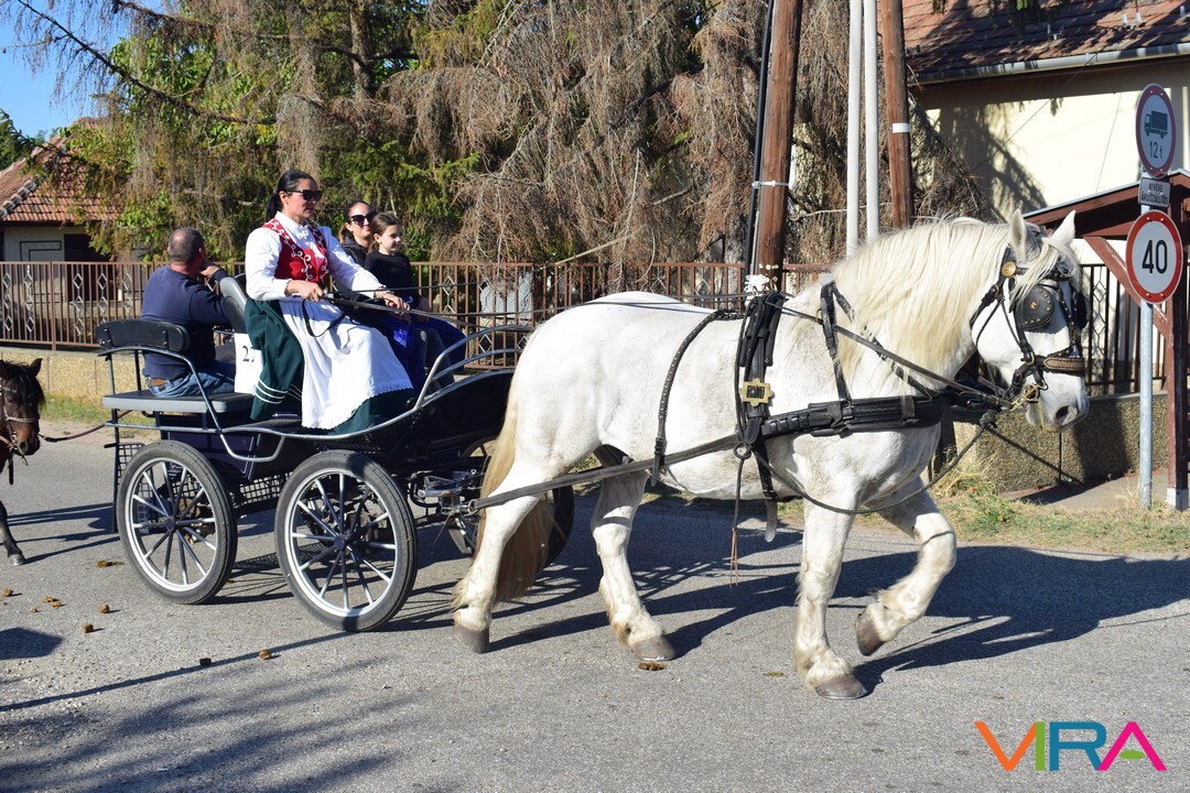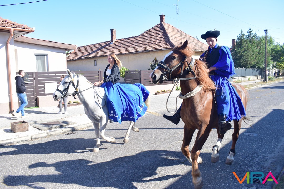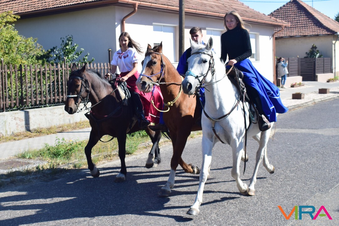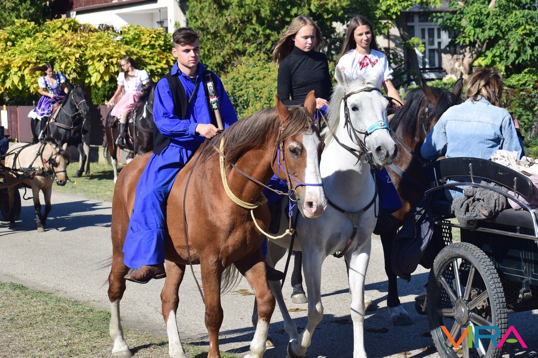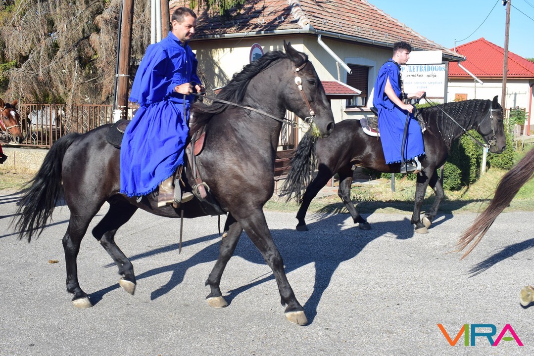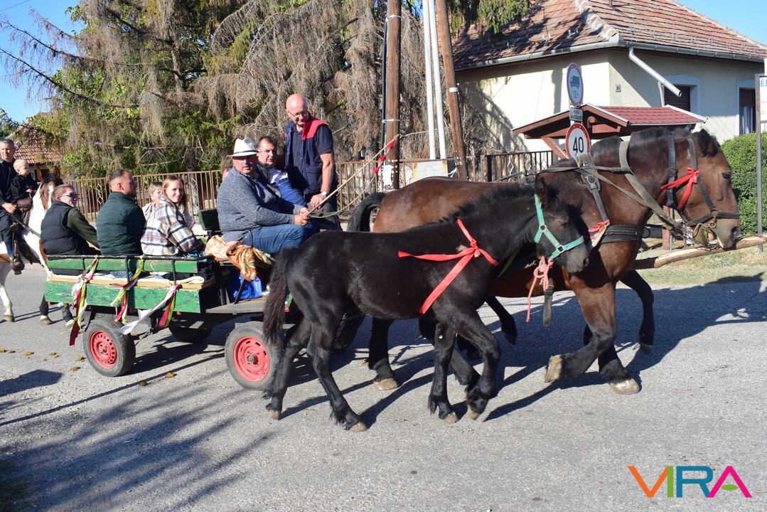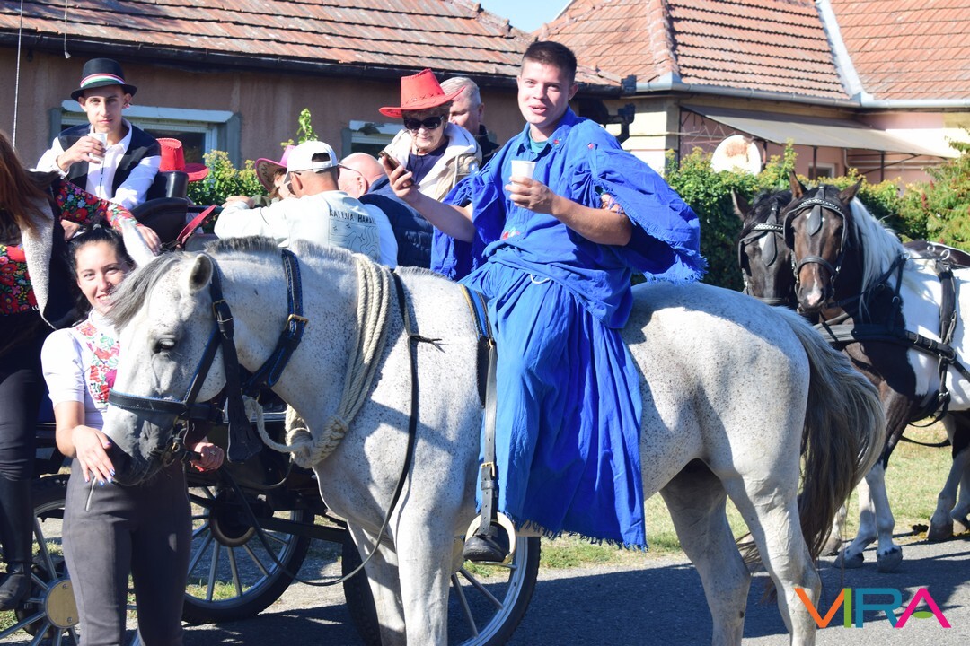Délután fél kettőkor vette kezdetét a látványos szüreti felvonulás, melyre több településről is érkezetek lovasok, kocsisok és fogatosok. A menet először az IKSZT Dankó Pista Művelődési Ház előtt állt meg ahol külön is köszöntötték és be is mondták a fogatosok, kocsisok nevét. Részükre emléklappal és egy üveg borral köszönték meg a szervezők, hogy idén is ellátogattak Csengődre.