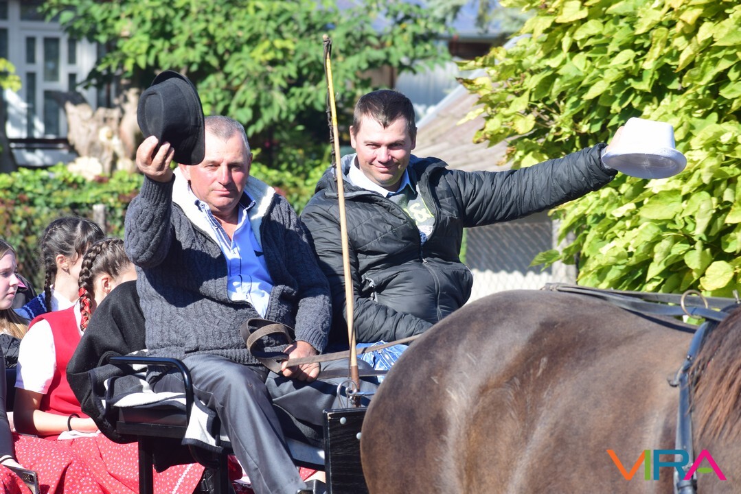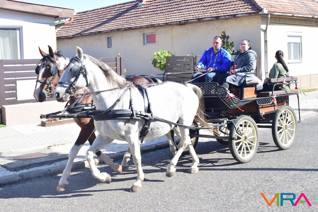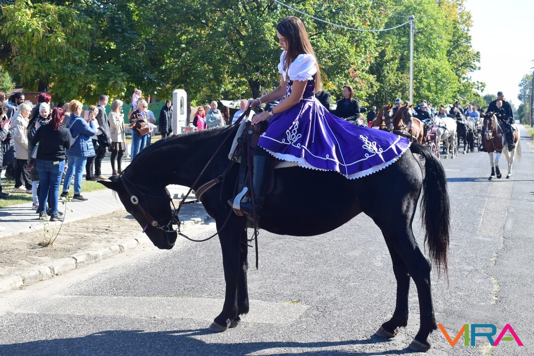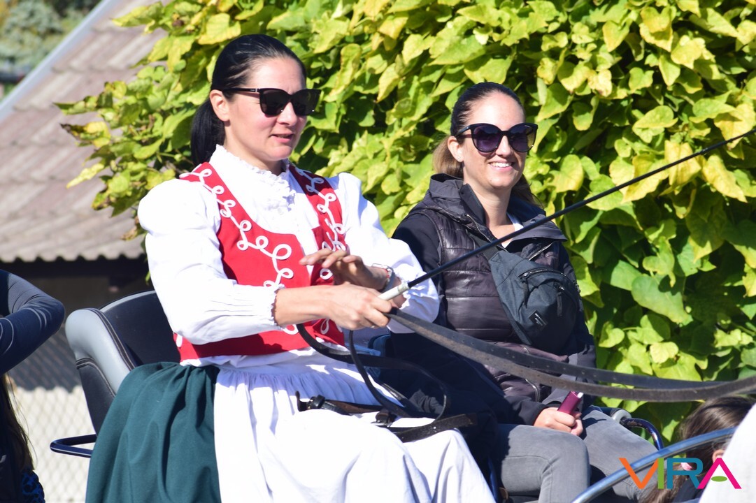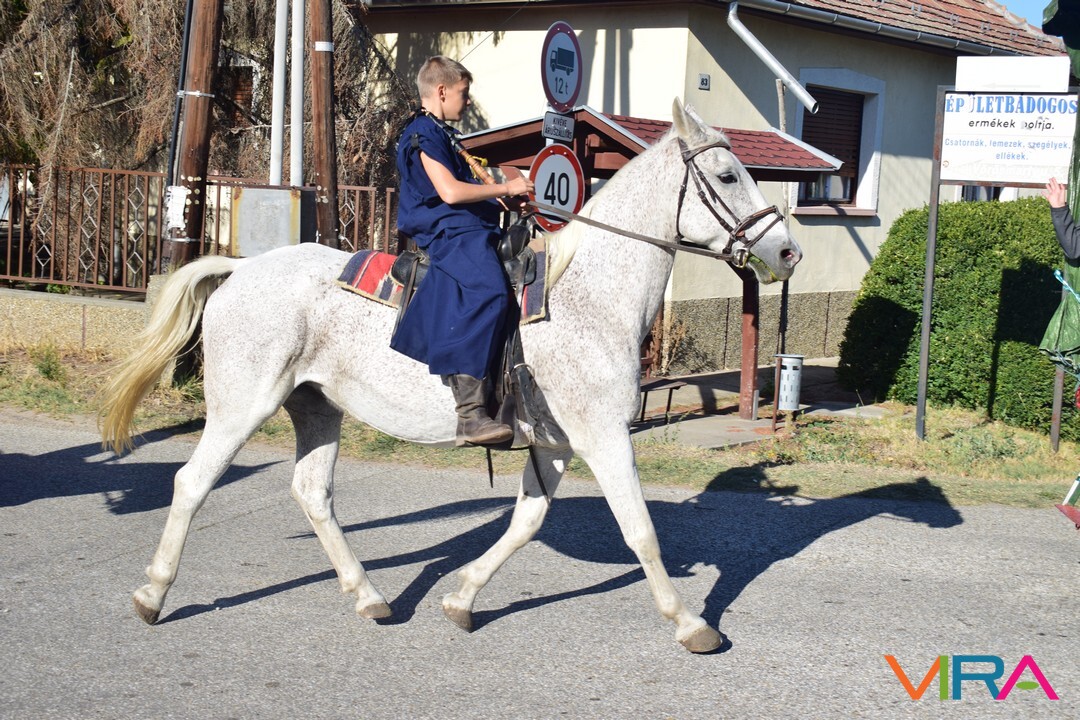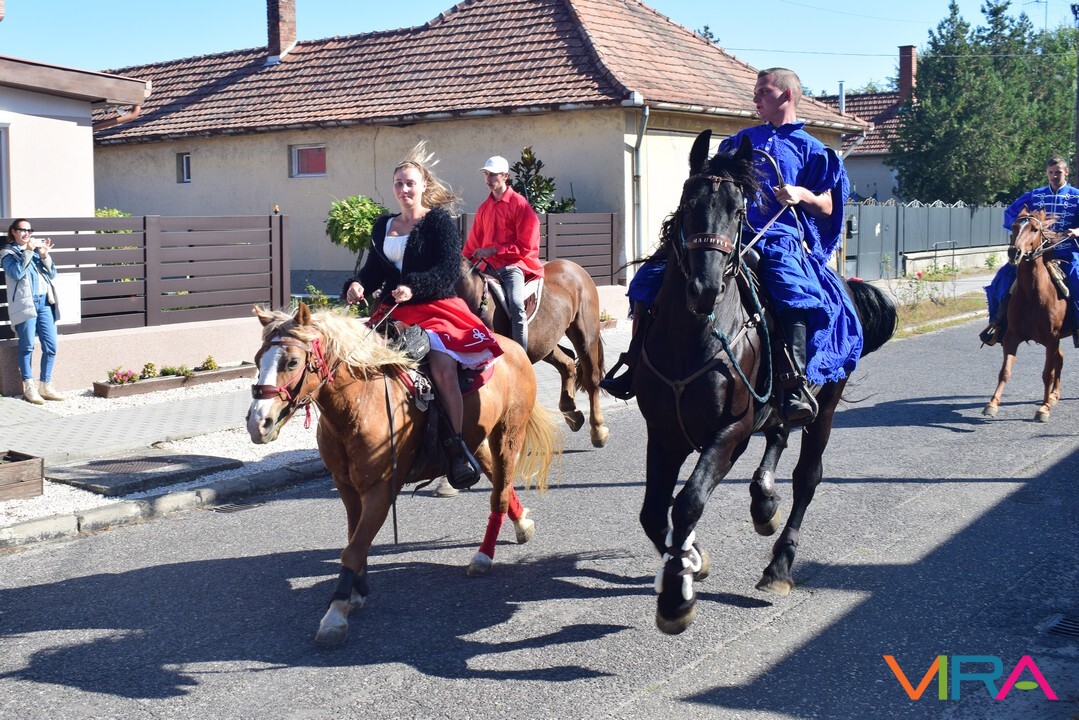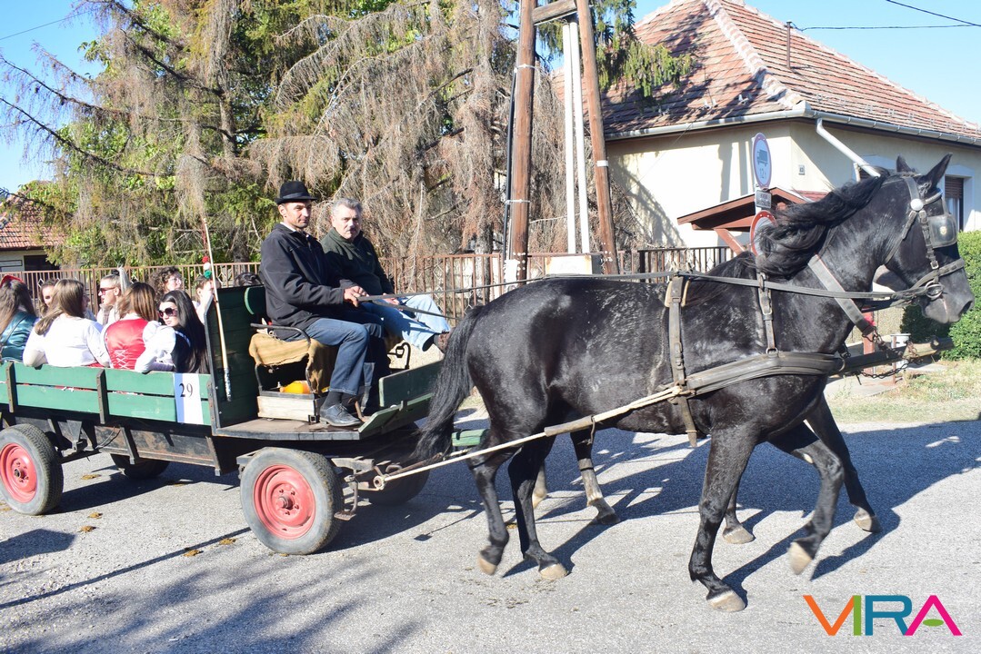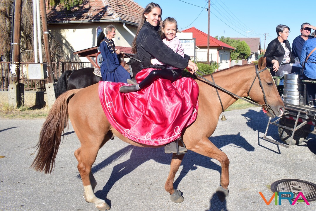 Délután fél kettőkor vette kezdetét a látványos szüreti felvonulás, melyre több településről is érkezetek lovasok, kocsisok és fogatosok. A menet először az IKSZT Dankó Pista Művelődési Ház előtt állt meg ahol külön is köszöntötték és be is mondták a fogatosok, kocsisok nevét. Részükre emléklappal és egy üveg borral köszönték meg a szervezők, hogy idén is ellátogattak Csengődre.