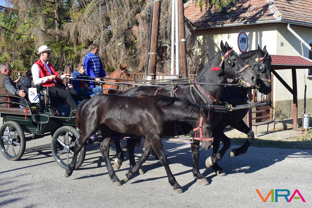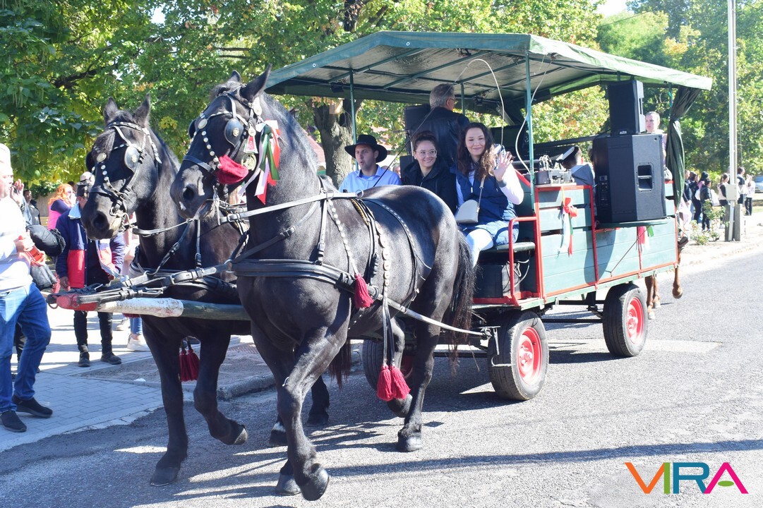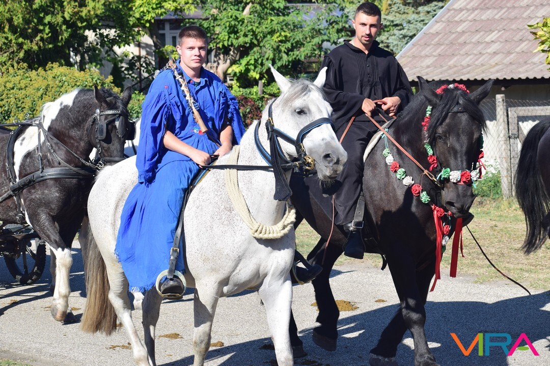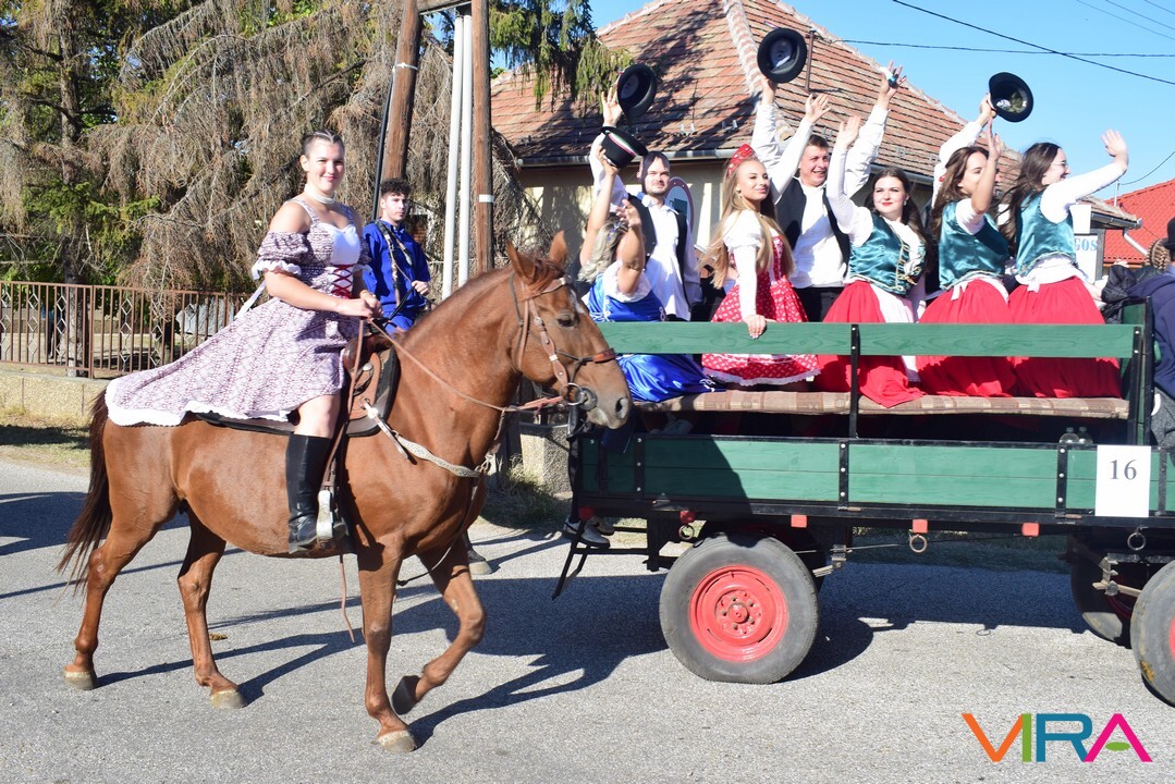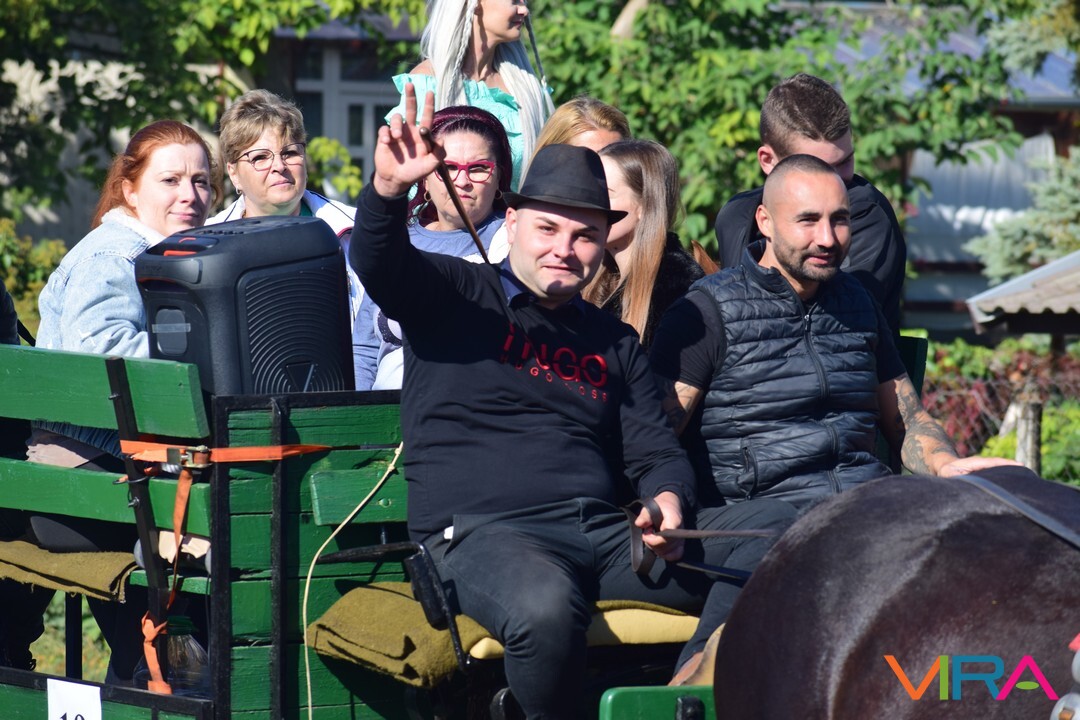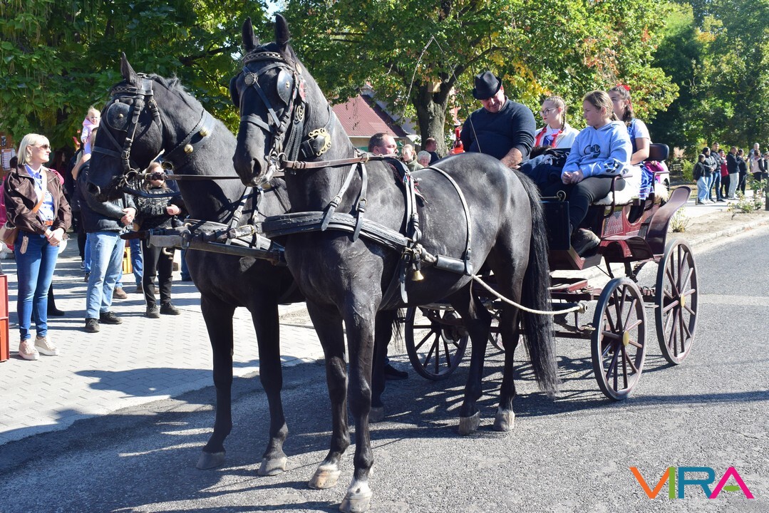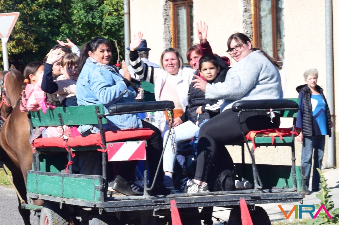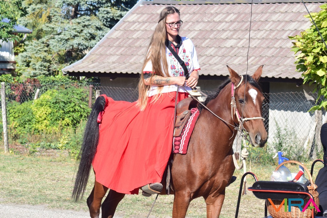 Délután fél kettőkor vette kezdetét a látványos szüreti felvonulás, melyre több településről is érkezetek lovasok, kocsisok és fogatosok. A menet először az IKSZT Dankó Pista Művelődési Ház előtt állt meg ahol külön is köszöntötték és be is mondták a fogatosok, kocsisok nevét. Részükre emléklappal és egy üveg borral köszönték meg a szervezők, hogy idén is ellátogattak Csengődre.