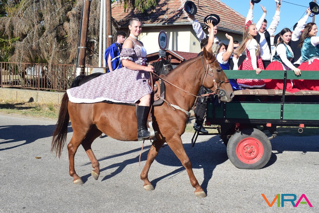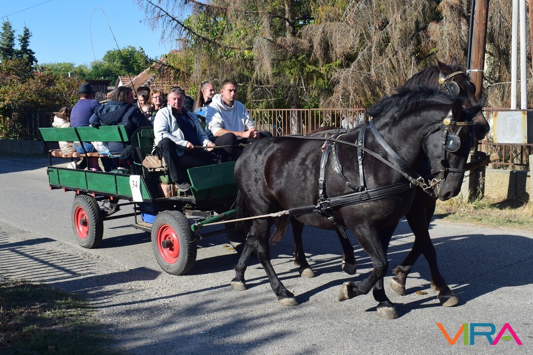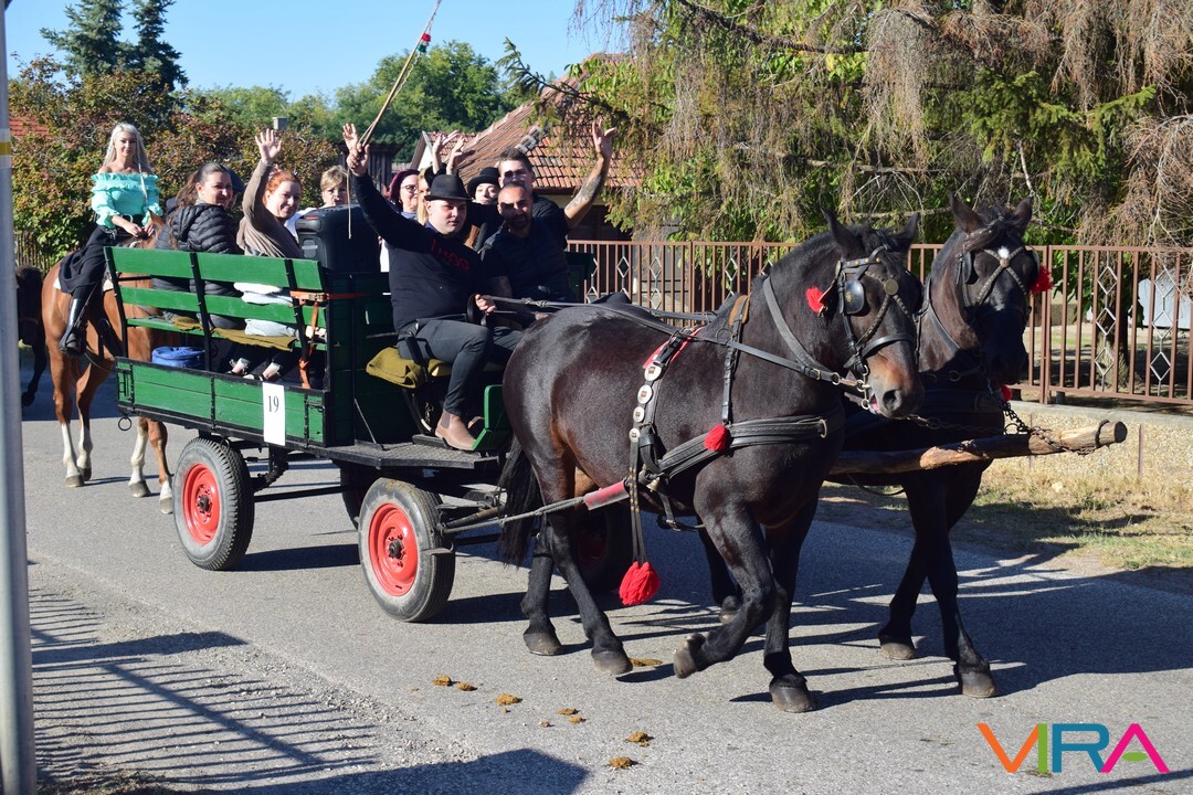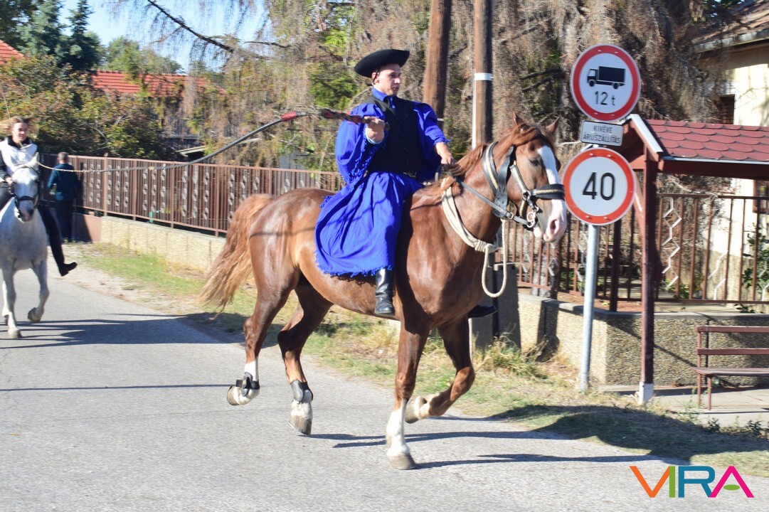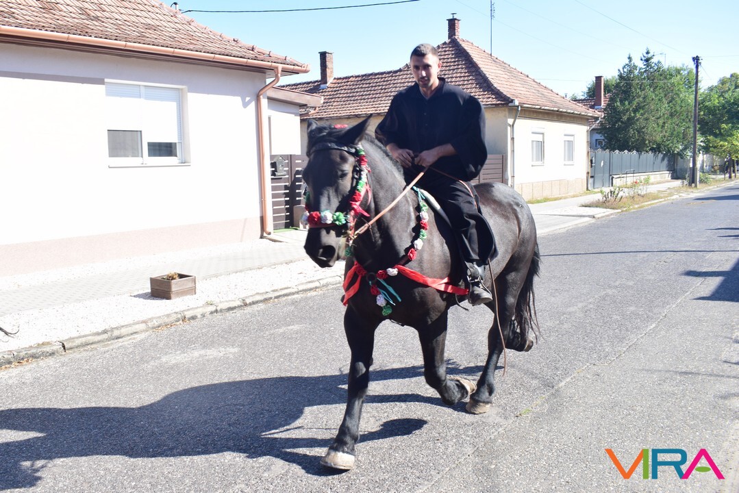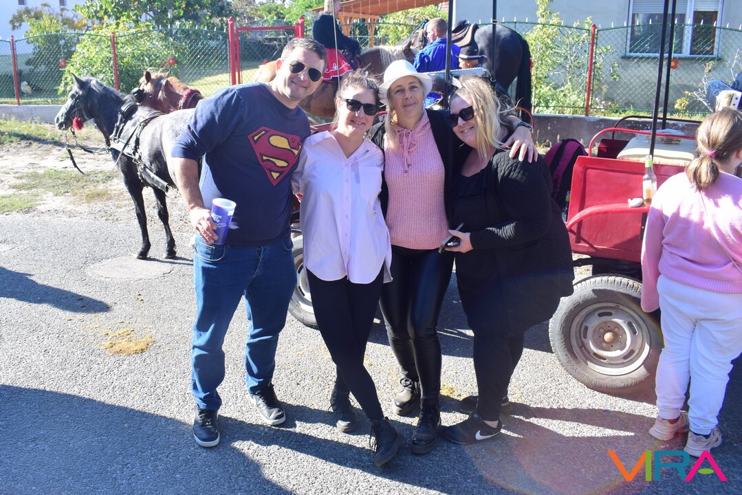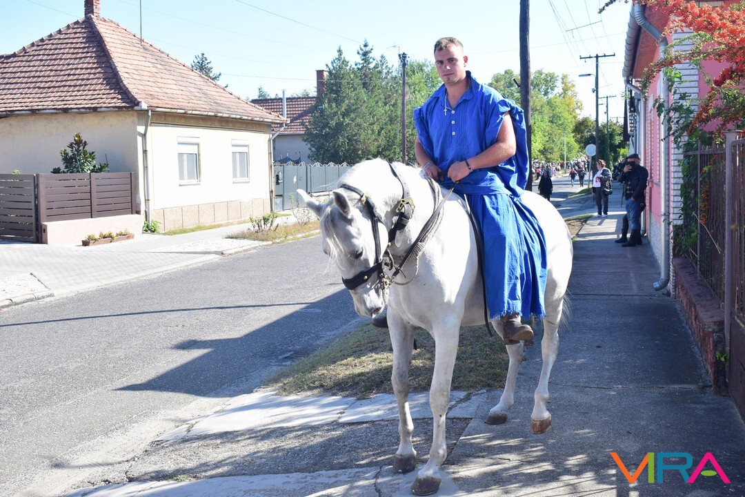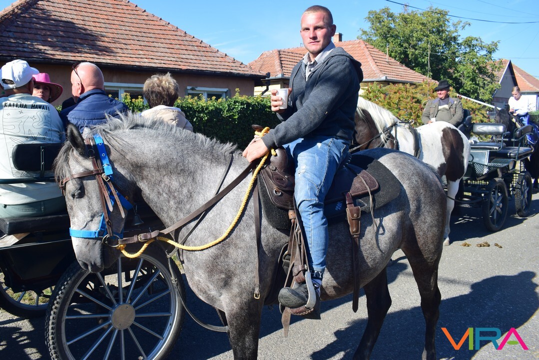 Délután fél kettőkor vette kezdetét a látványos szüreti felvonulás, melyre több településről is érkezetek lovasok, kocsisok és fogatosok. A menet először az IKSZT Dankó Pista Művelődési Ház előtt állt meg ahol külön is köszöntötték és be is mondták a fogatosok, kocsisok nevét. Részükre emléklappal és egy üveg borral köszönték meg a szervezők, hogy idén is ellátogattak Csengődre.