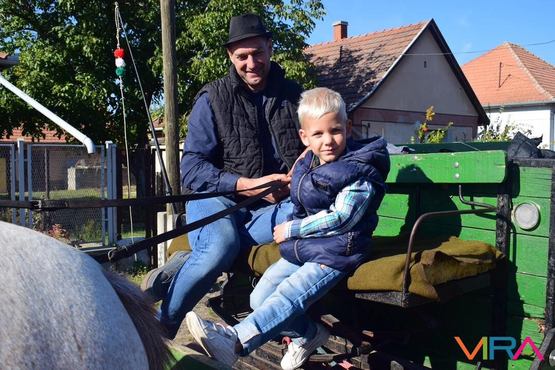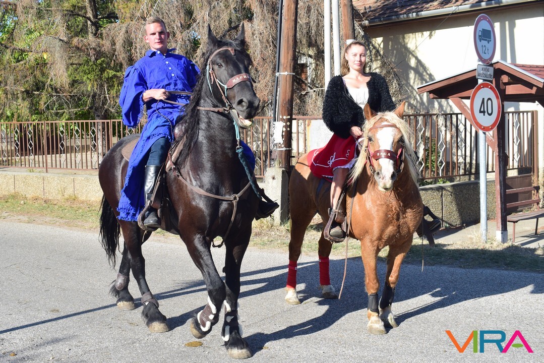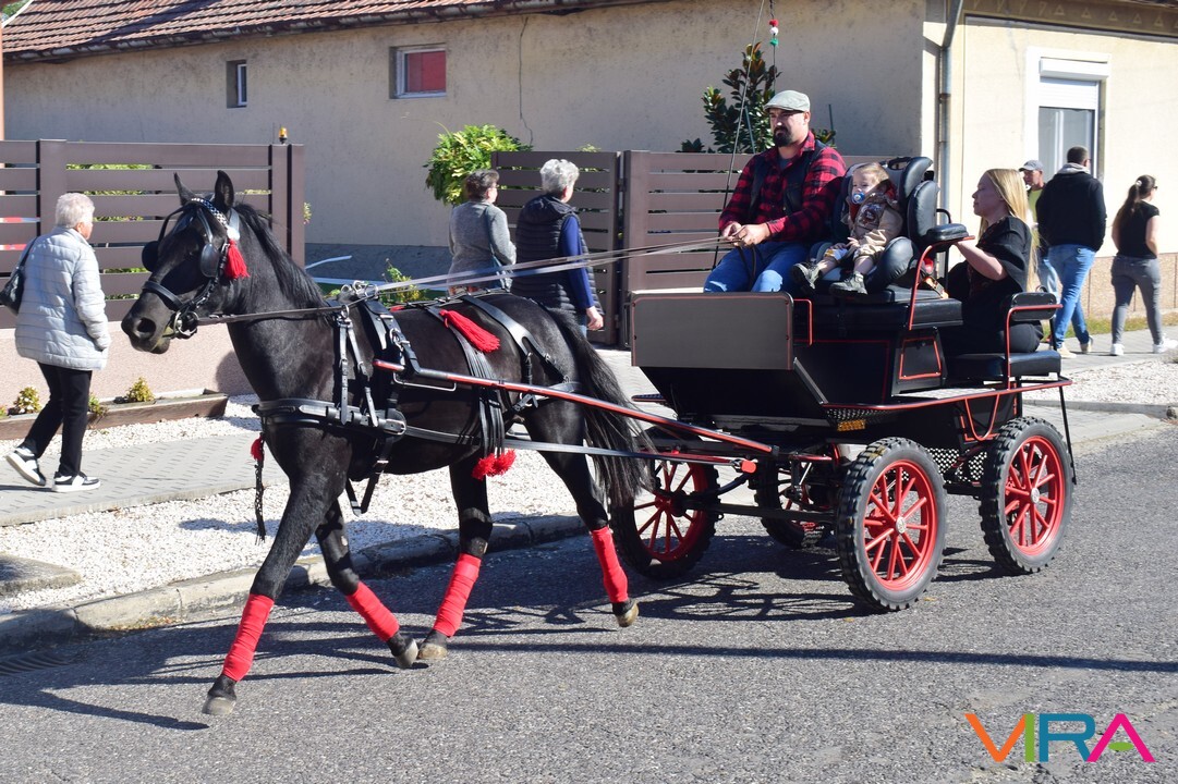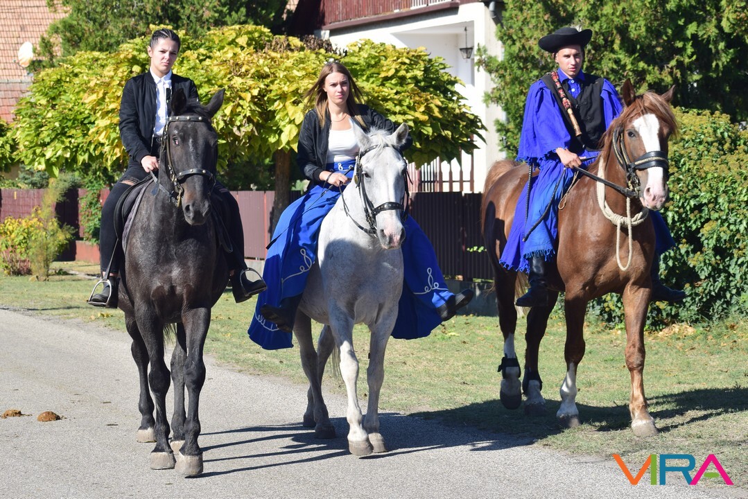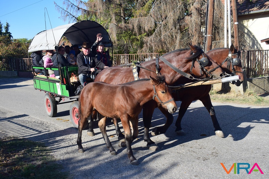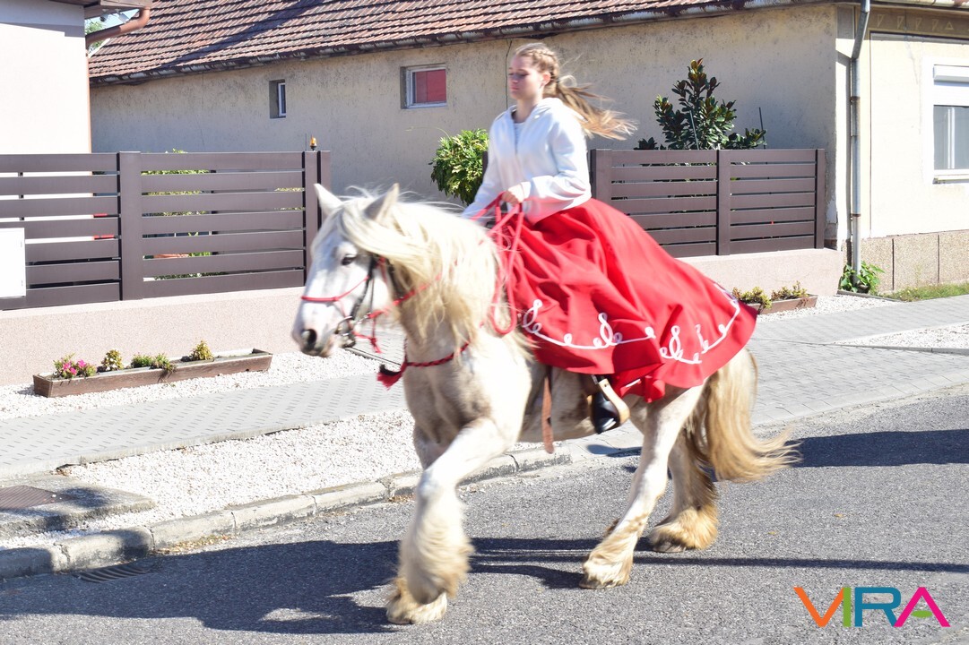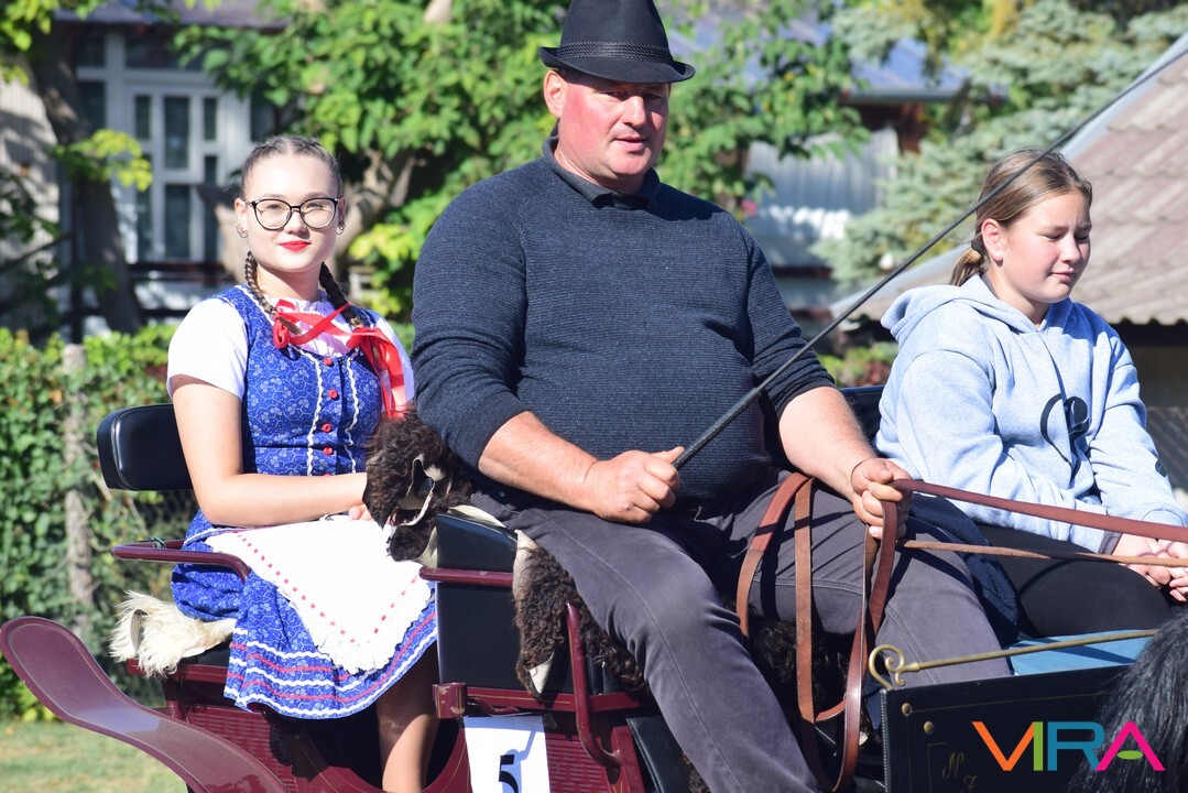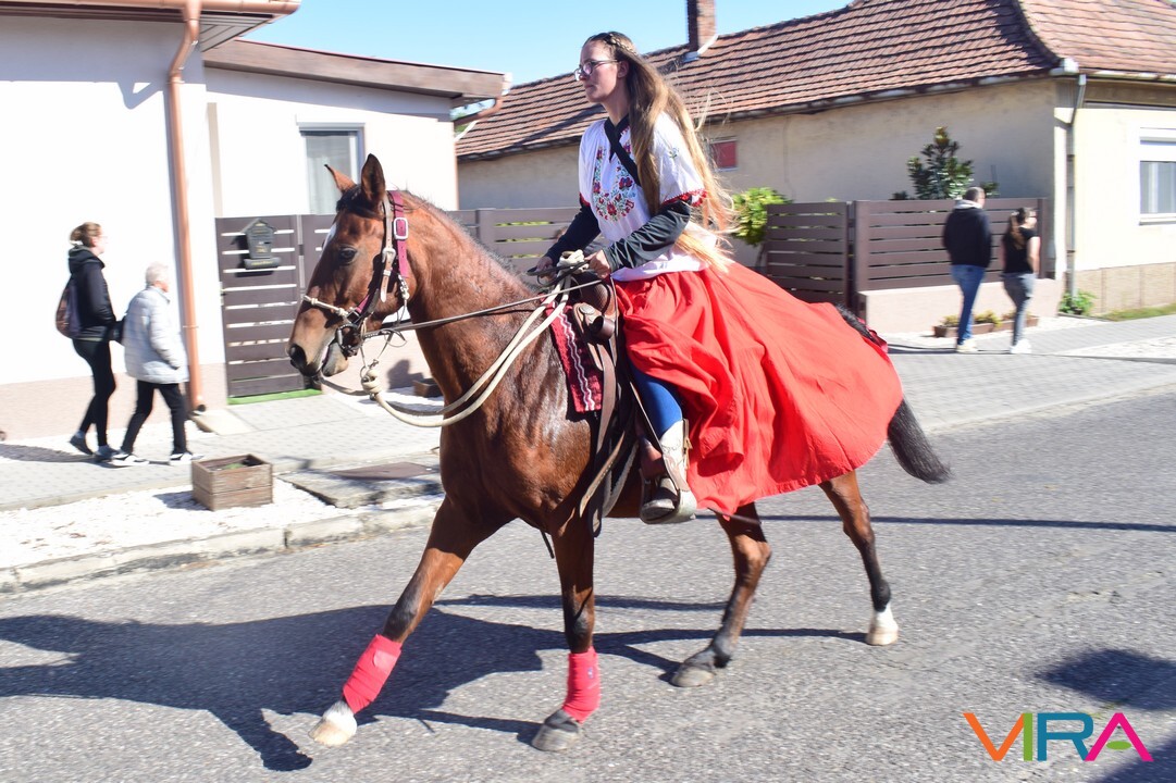 Délután fél kettőkor vette kezdetét a látványos szüreti felvonulás, melyre több településről is érkezetek lovasok, kocsisok és fogatosok. A menet először az IKSZT Dankó Pista Művelődési Ház előtt állt meg ahol külön is köszöntötték és be is mondták a fogatosok, kocsisok nevét. Részükre emléklappal és egy üveg borral köszönték meg a szervezők, hogy idén is ellátogattak Csengődre.