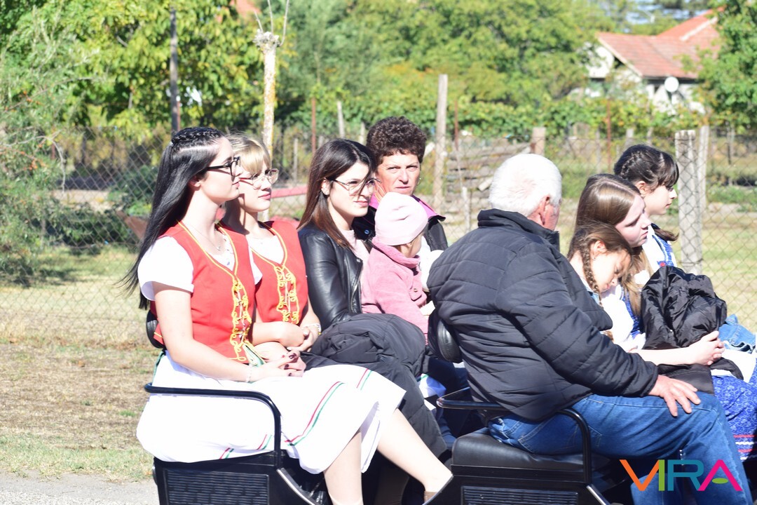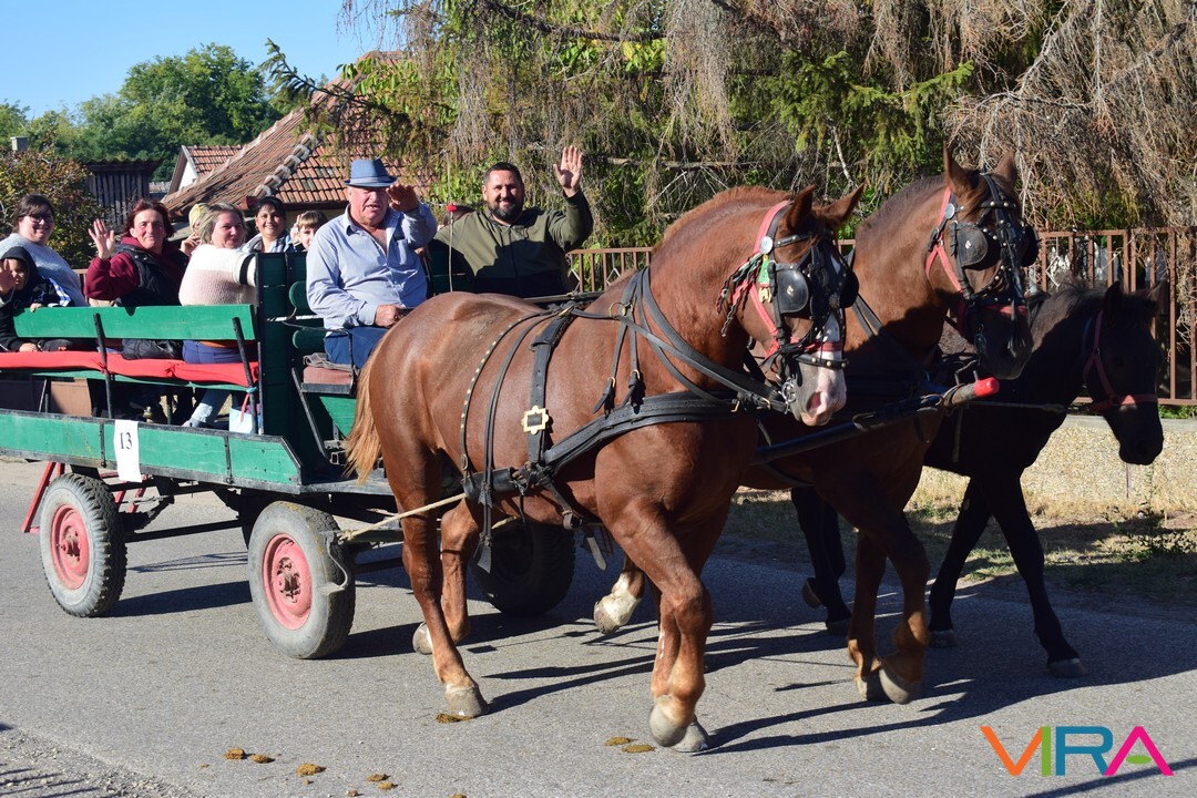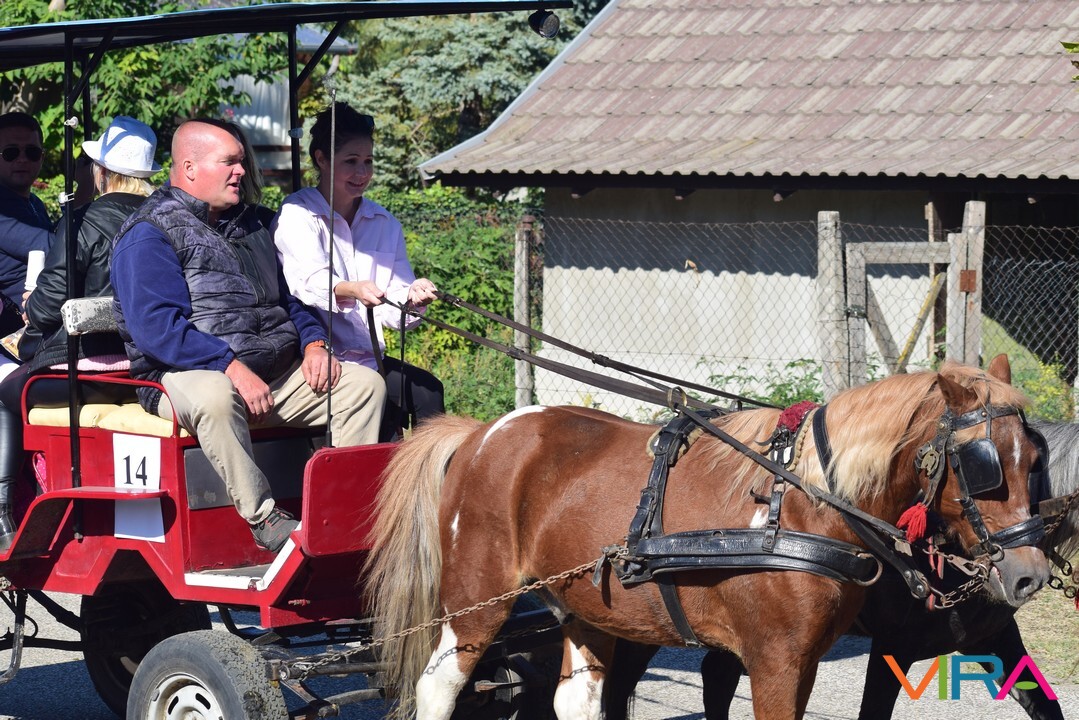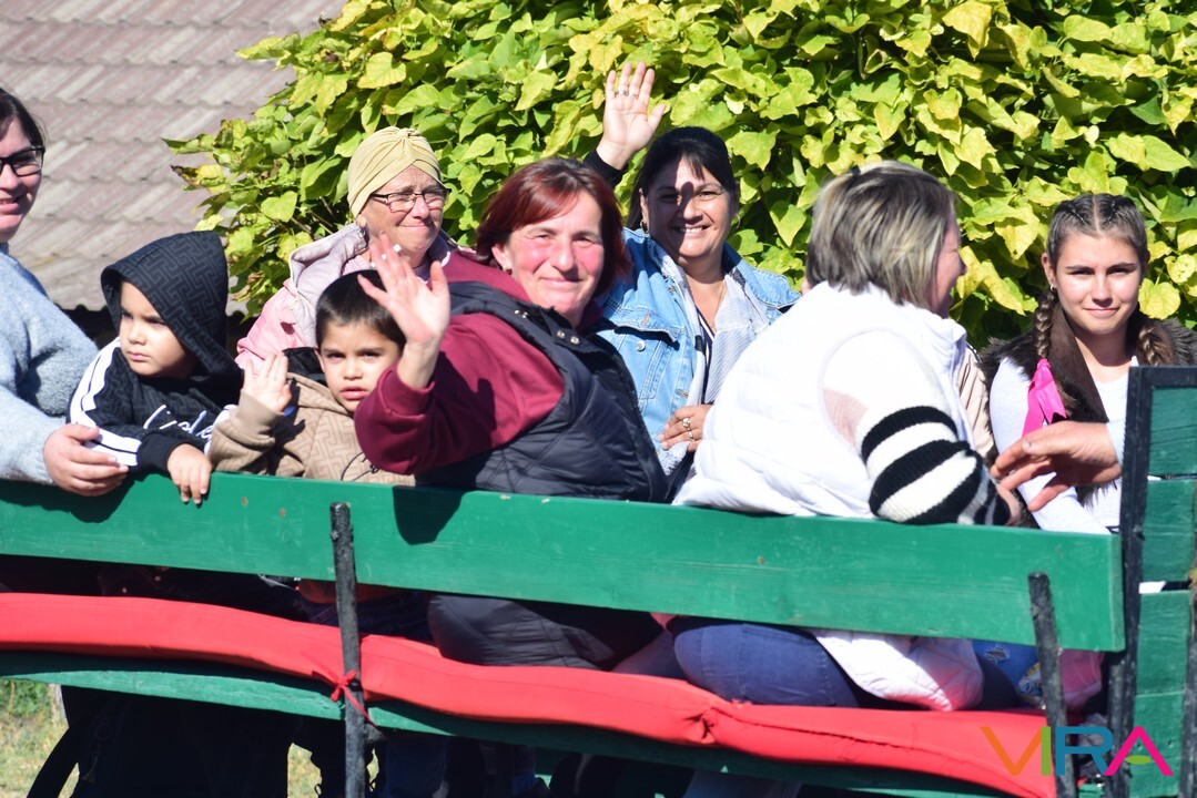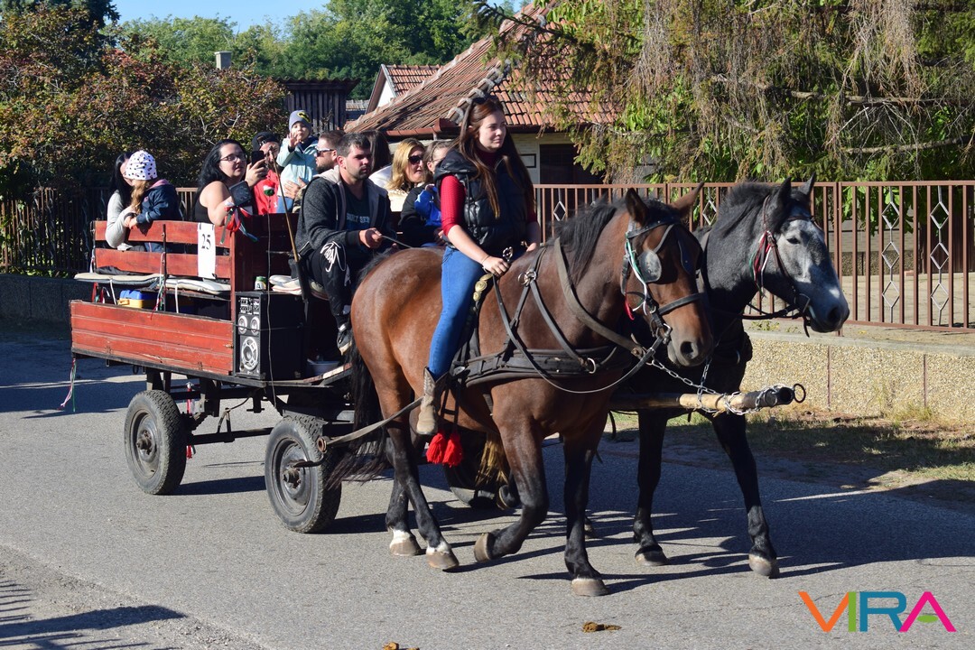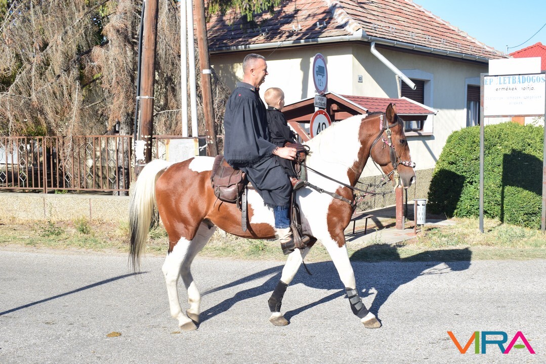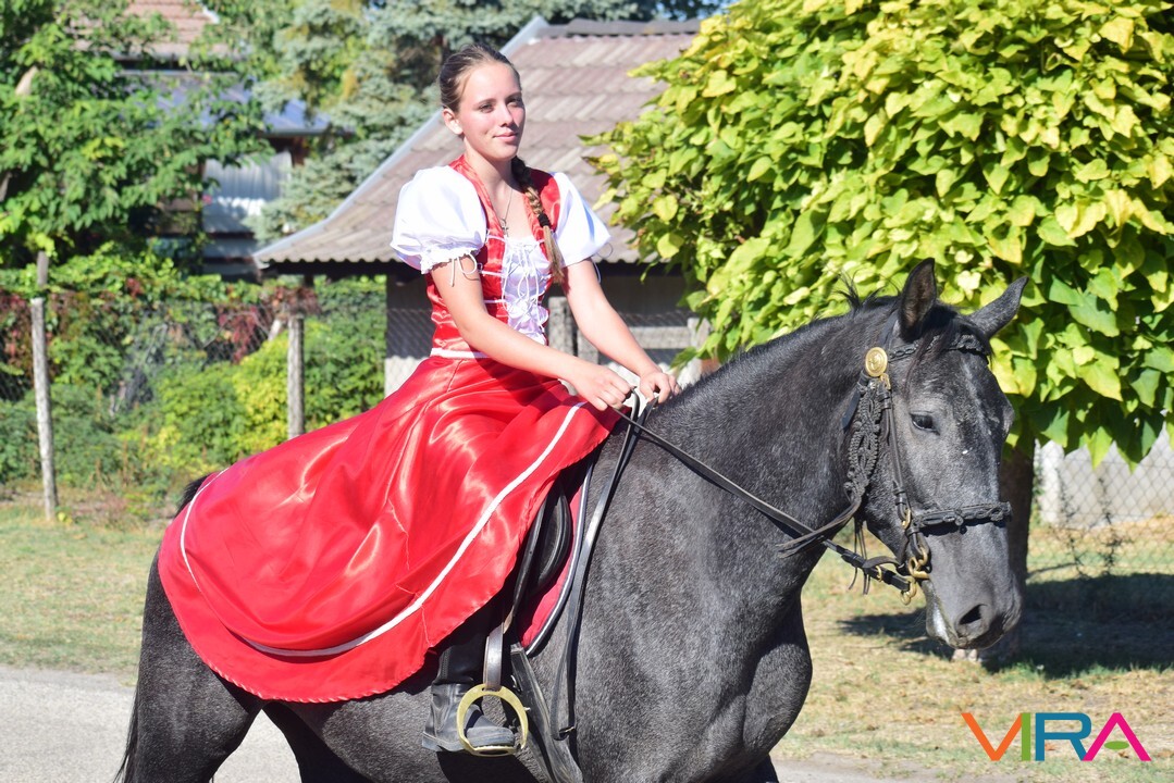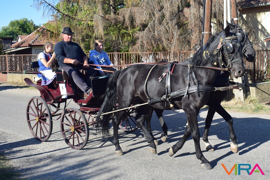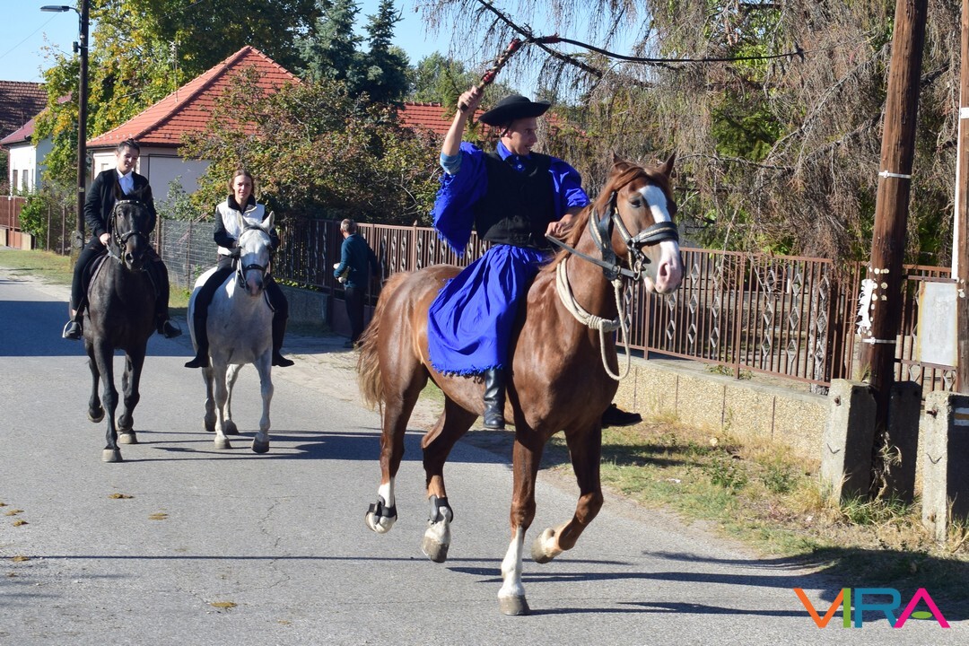 Délután fél kettőkor vette kezdetét a látványos szüreti felvonulás, melyre több településről is érkezetek lovasok, kocsisok és fogatosok. A menet először az IKSZT Dankó Pista Művelődési Ház előtt állt meg ahol külön is köszöntötték és be is mondták a fogatosok, kocsisok nevét. Részükre emléklappal és egy üveg borral köszönték meg a szervezők, hogy idén is ellátogattak Csengődre.