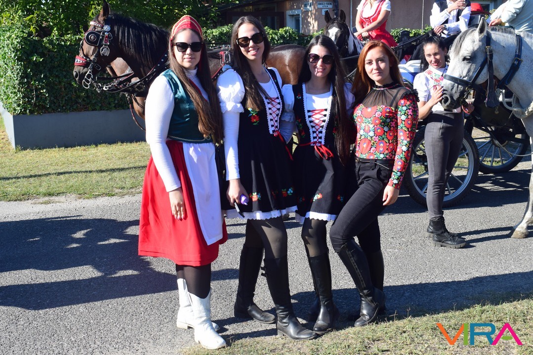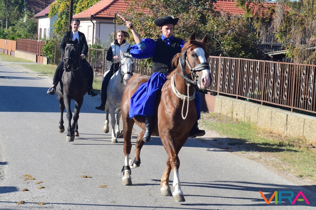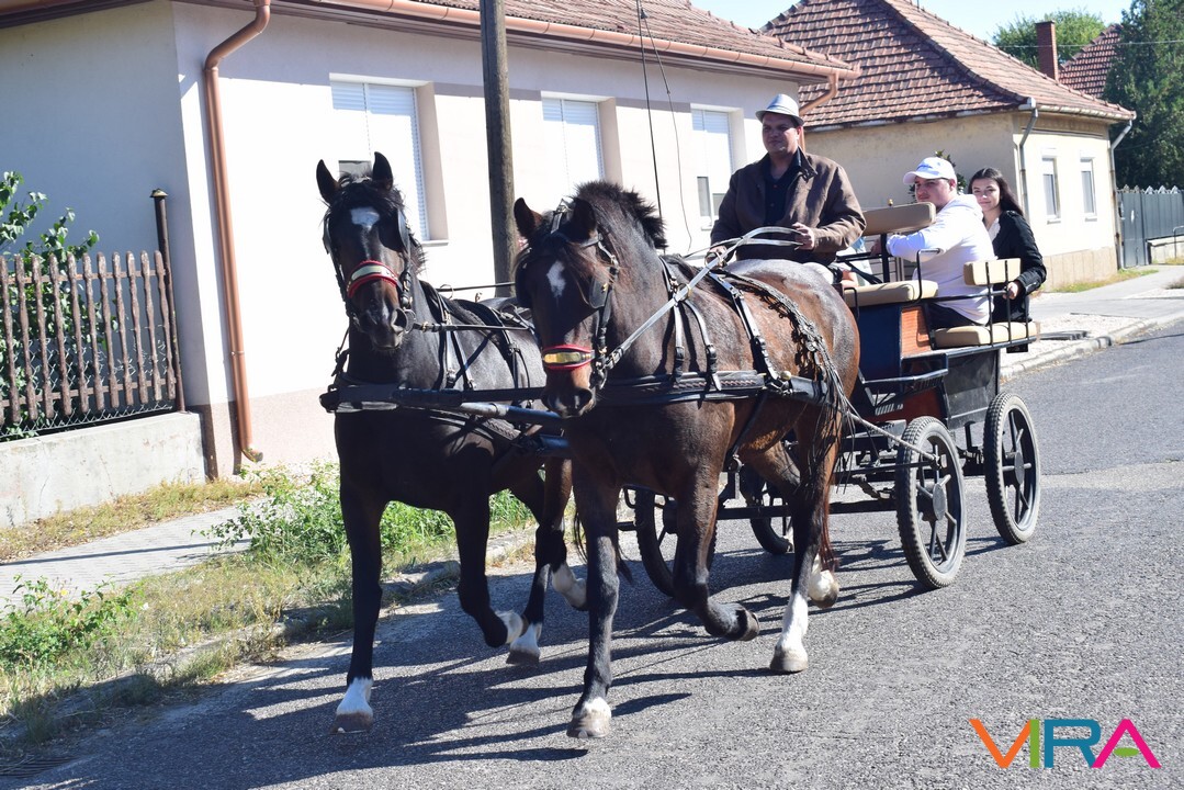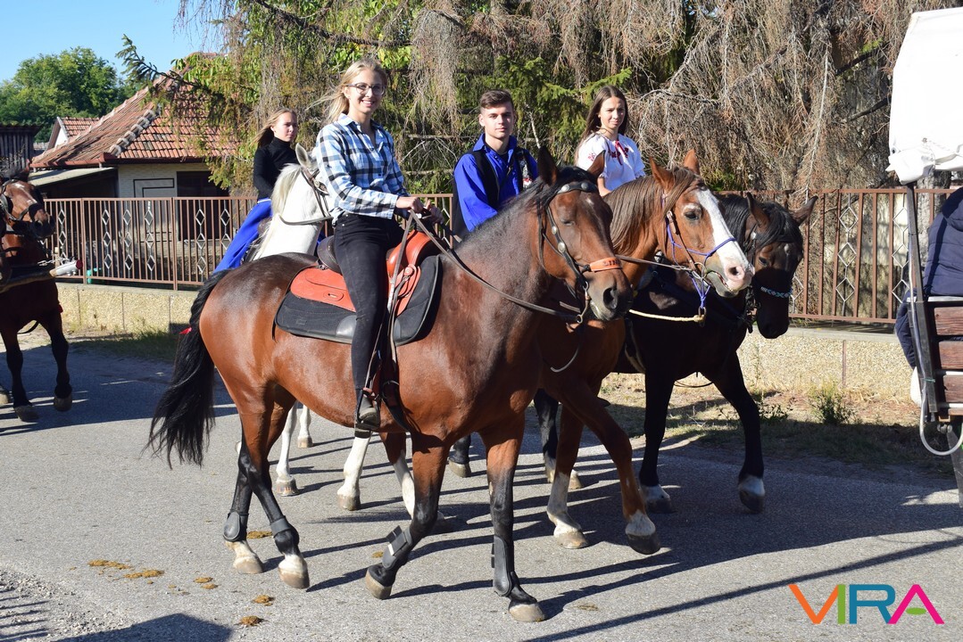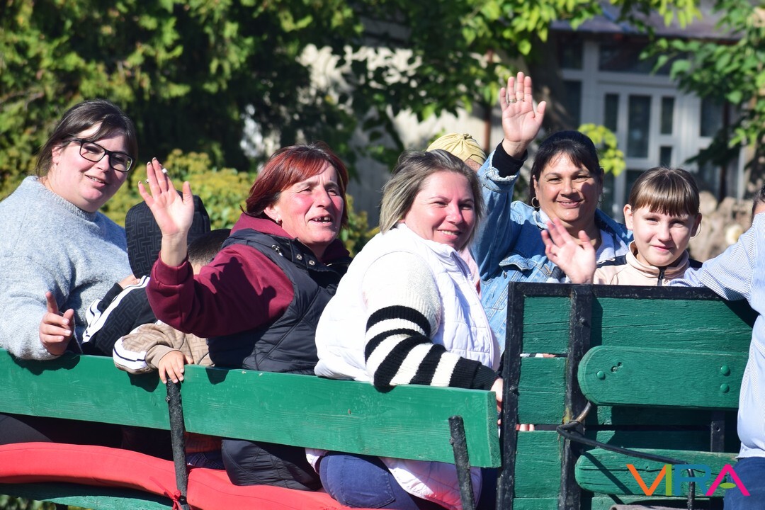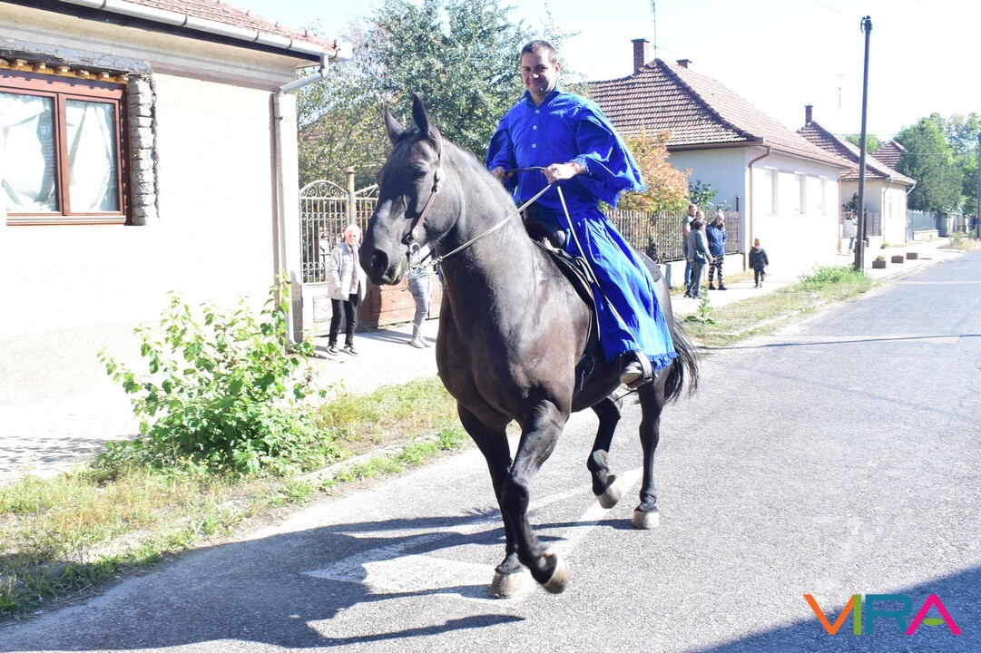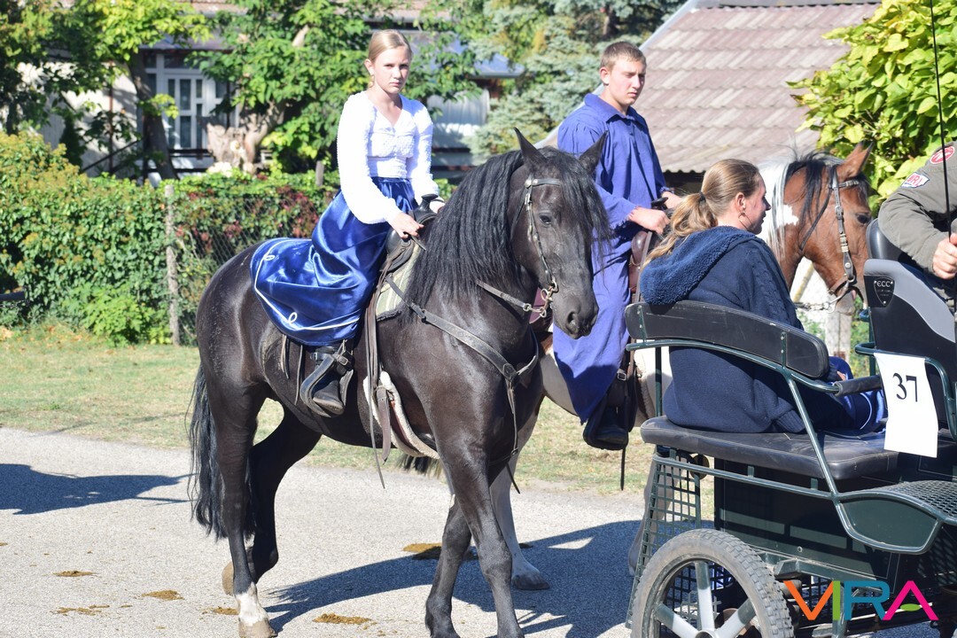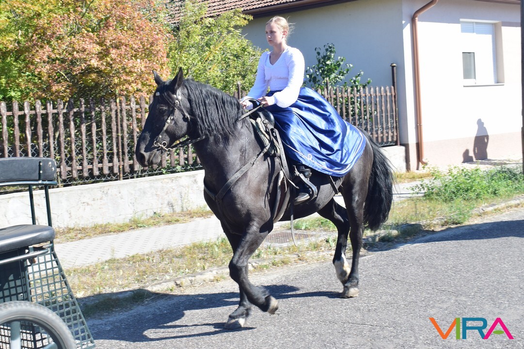Délután fél kettőkor vette kezdetét a látványos szüreti felvonulás, melyre több településről is érkezetek lovasok, kocsisok és fogatosok. A menet először az IKSZT Dankó Pista Művelődési Ház előtt állt meg ahol külön is köszöntötték és be is mondták a fogatosok, kocsisok nevét. Részükre emléklappal és egy üveg borral köszönték meg a szervezők, hogy idén is ellátogattak Csengődre.