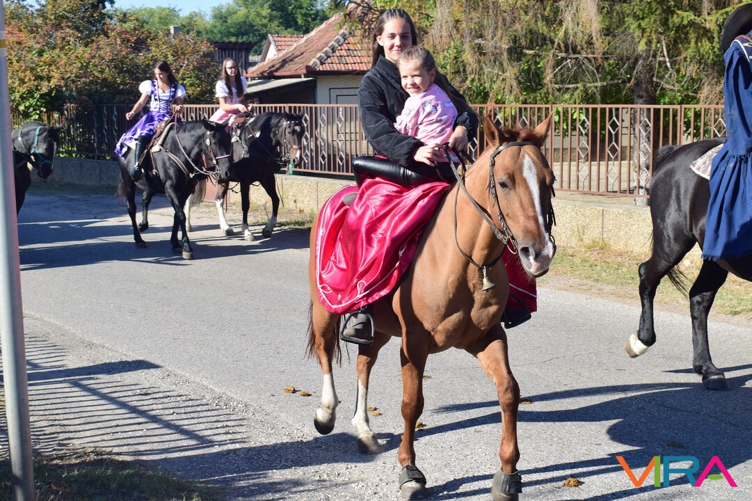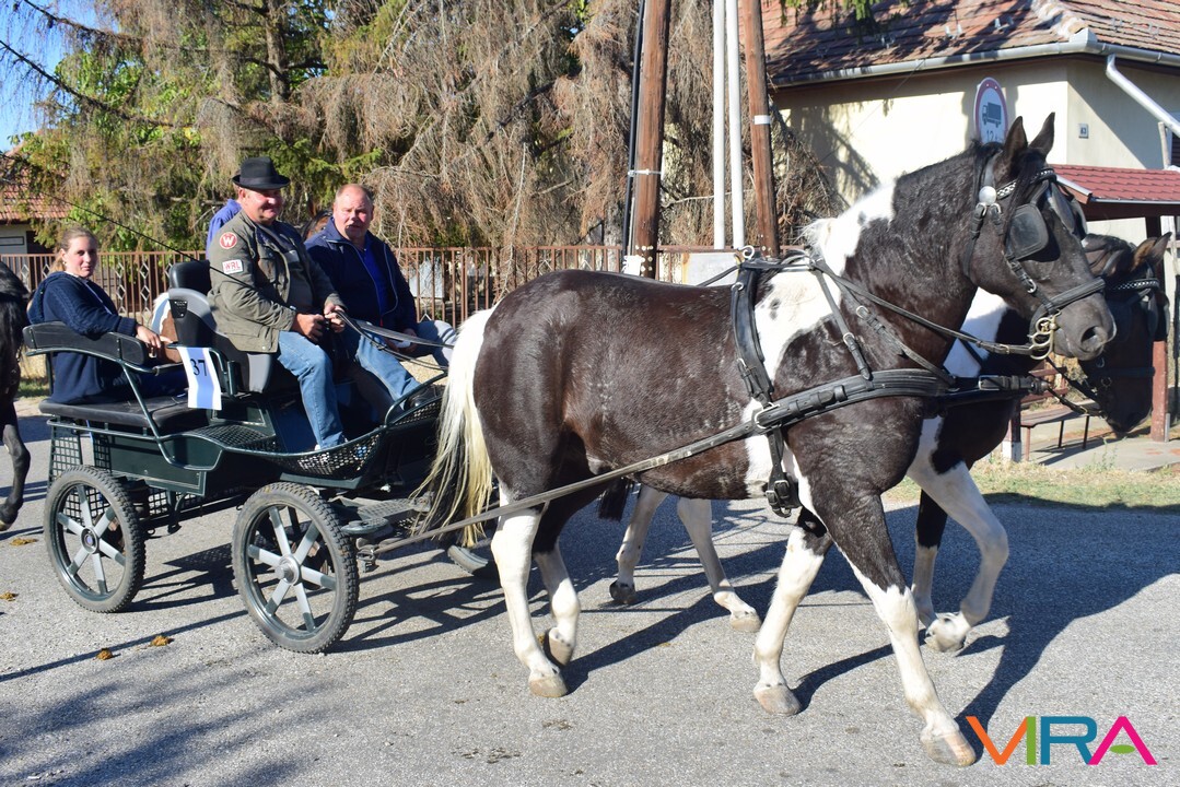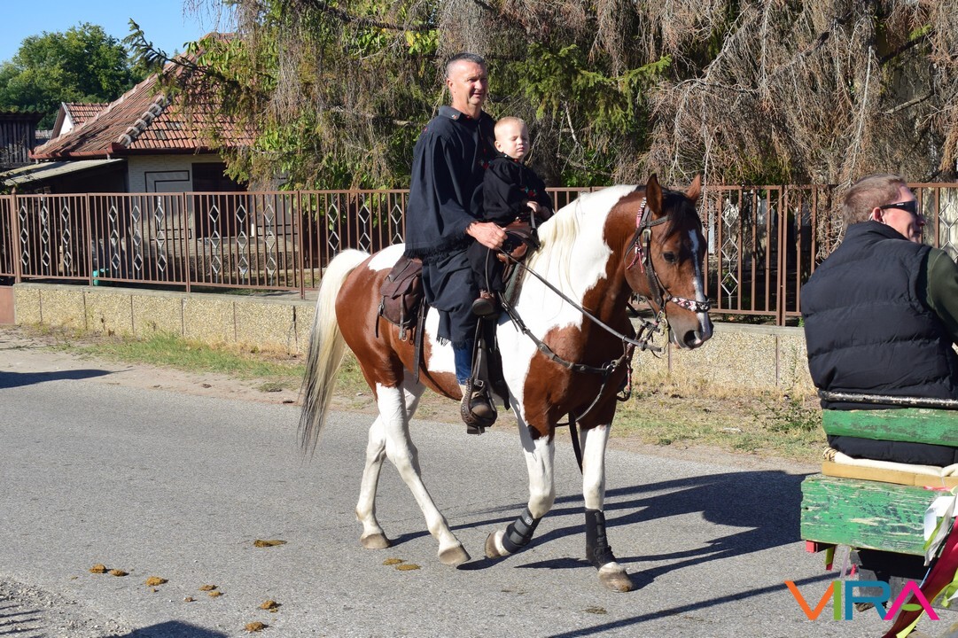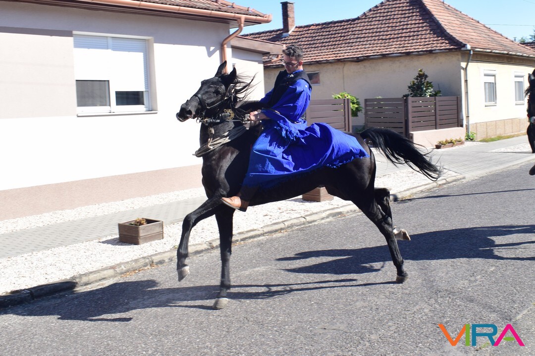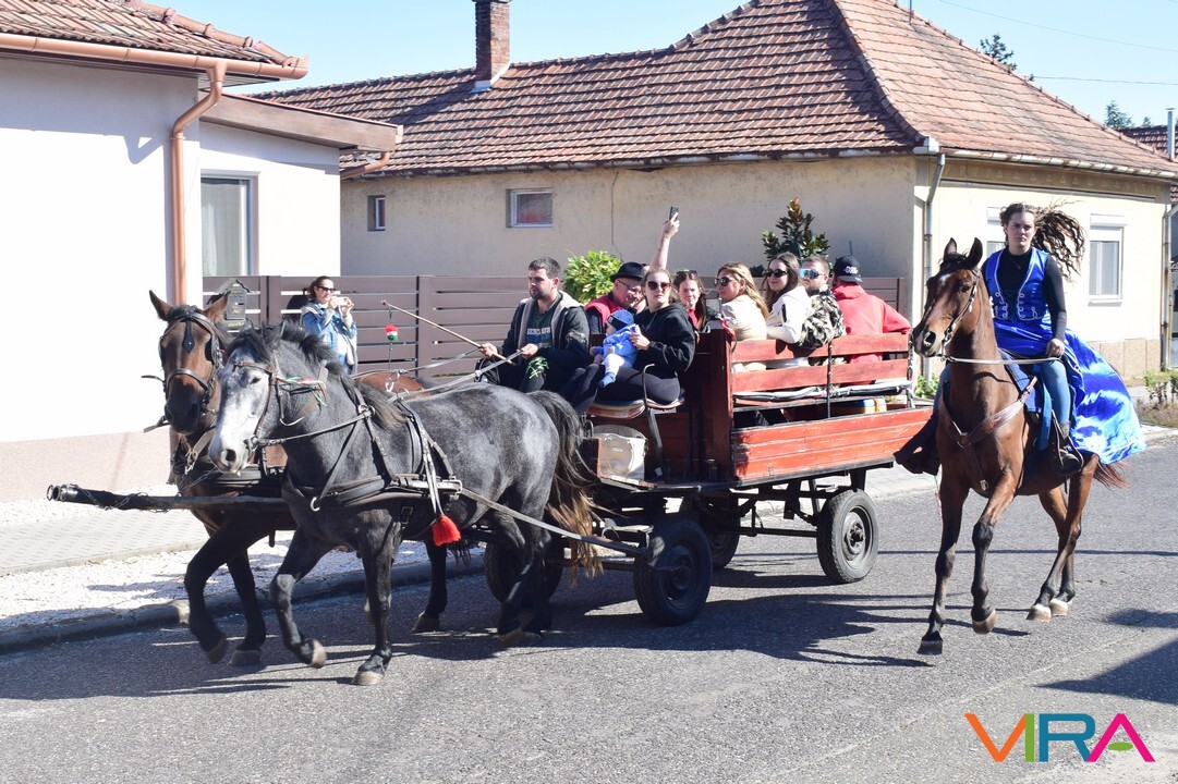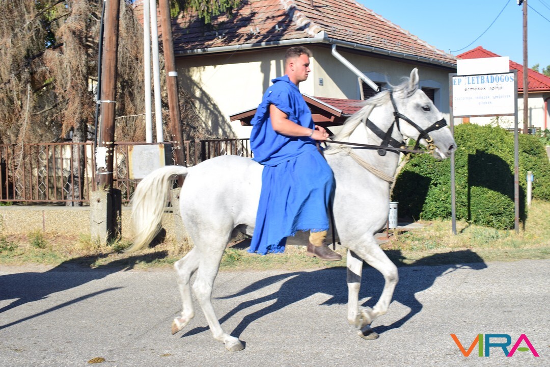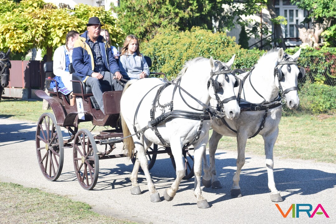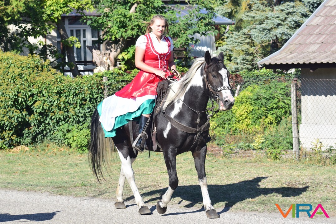 Délután fél kettőkor vette kezdetét a látványos szüreti felvonulás, melyre több településről is érkezetek lovasok, kocsisok és fogatosok. A menet először az IKSZT Dankó Pista Művelődési Ház előtt állt meg ahol külön is köszöntötték és be is mondták a fogatosok, kocsisok nevét. Részükre emléklappal és egy üveg borral köszönték meg a szervezők, hogy idén is ellátogattak Csengődre.