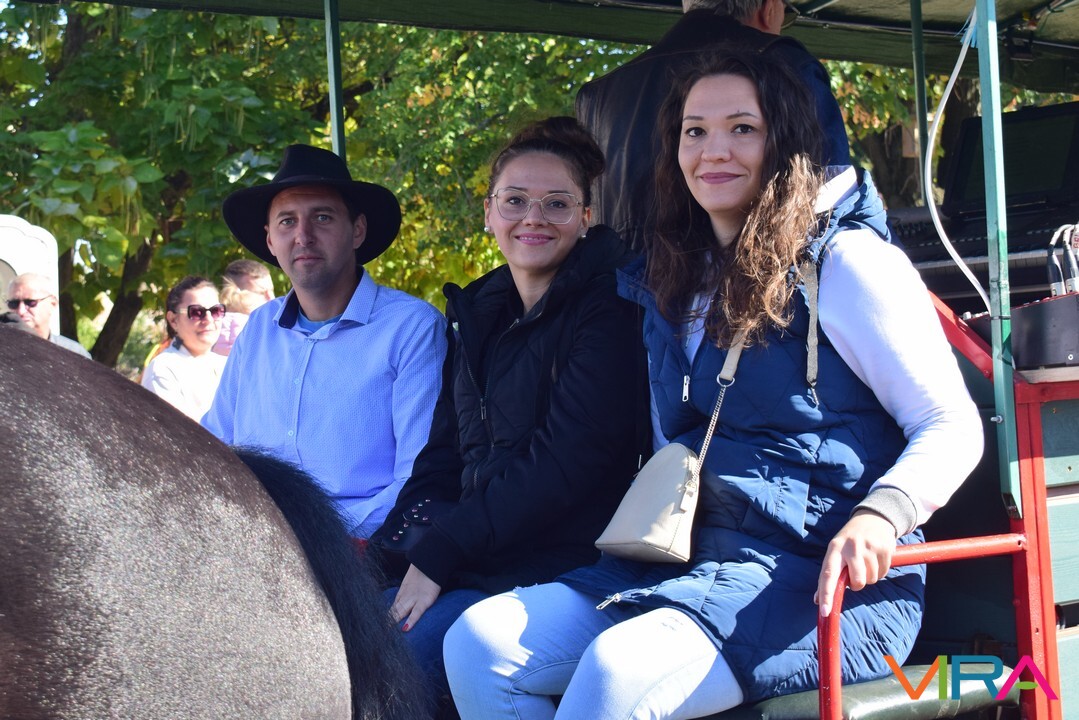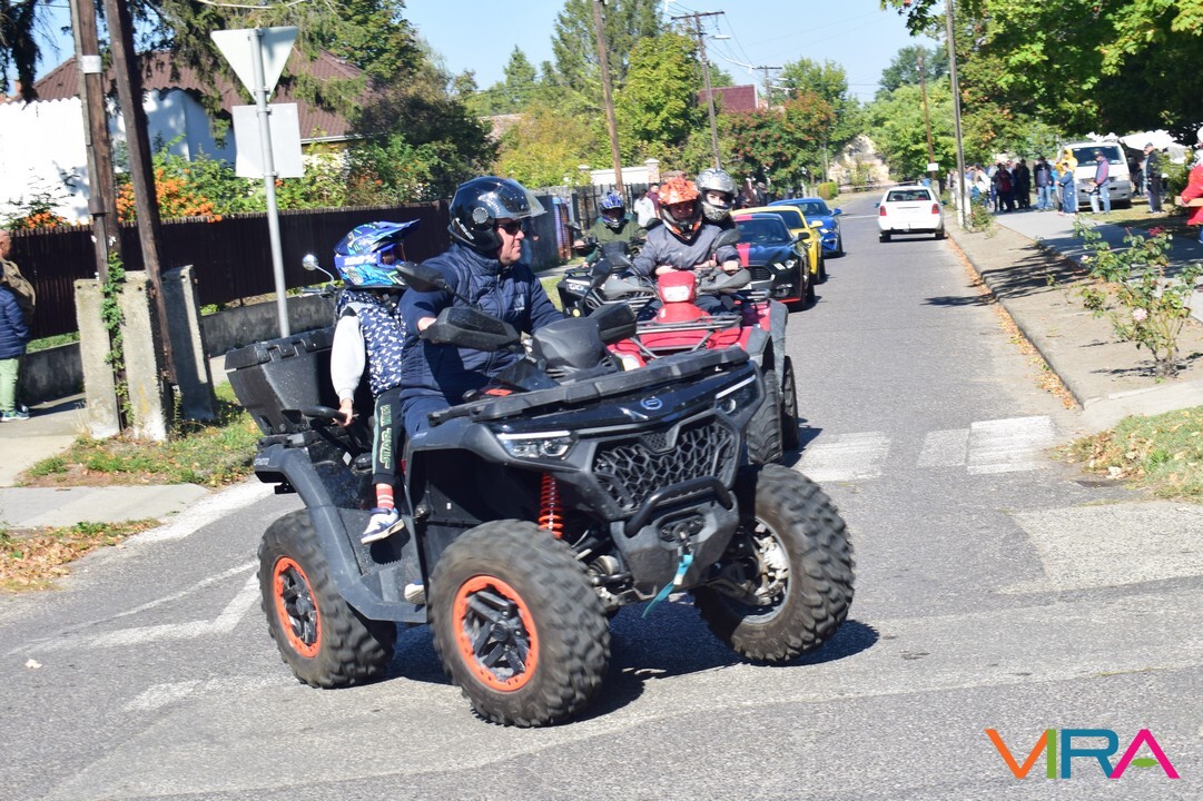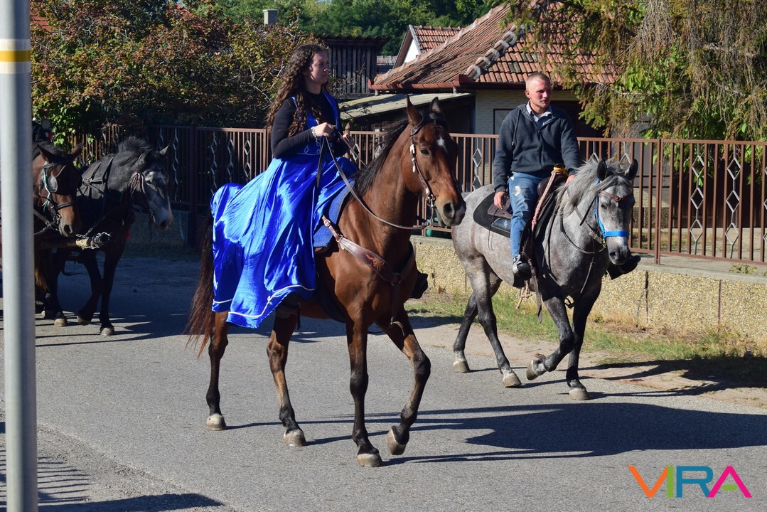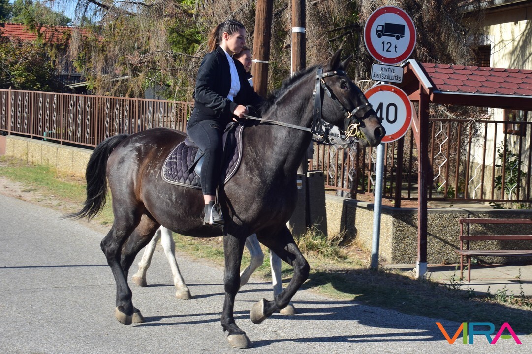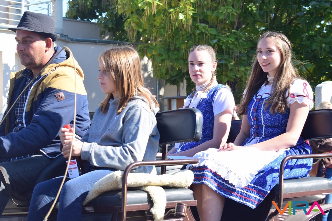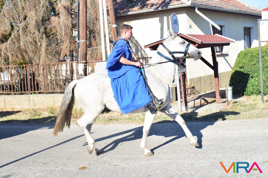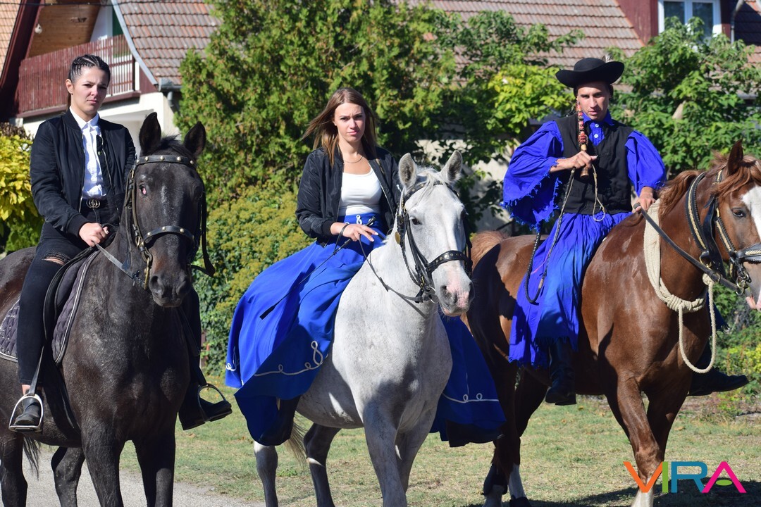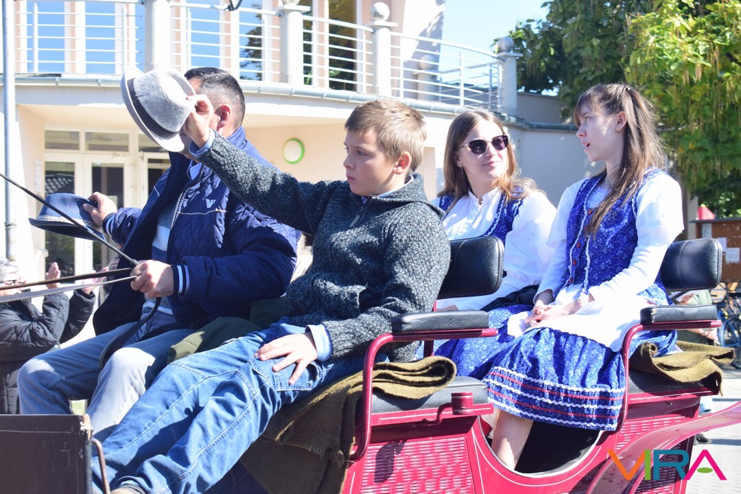Délután fél kettőkor vette kezdetét a látványos szüreti felvonulás, melyre több településről is érkezetek lovasok, kocsisok és fogatosok. A menet először az IKSZT Dankó Pista Művelődési Ház előtt állt meg ahol külön is köszöntötték és be is mondták a fogatosok, kocsisok nevét. Részükre emléklappal és egy üveg borral köszönték meg a szervezők, hogy idén is ellátogattak Csengődre.