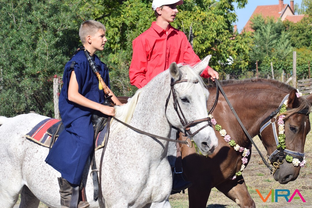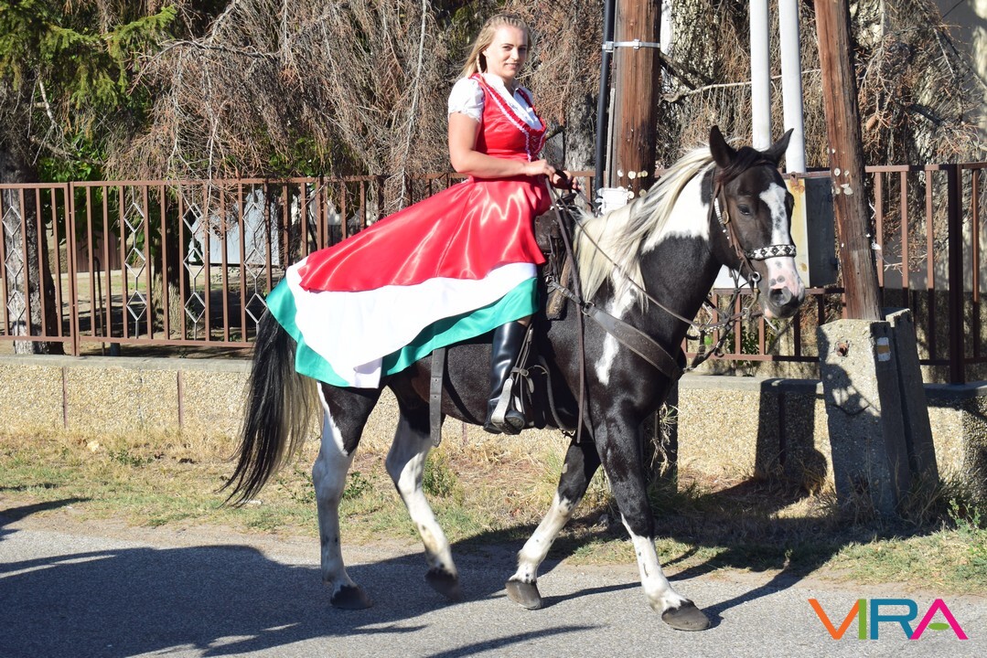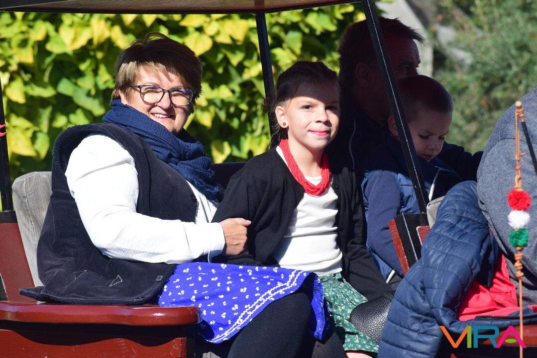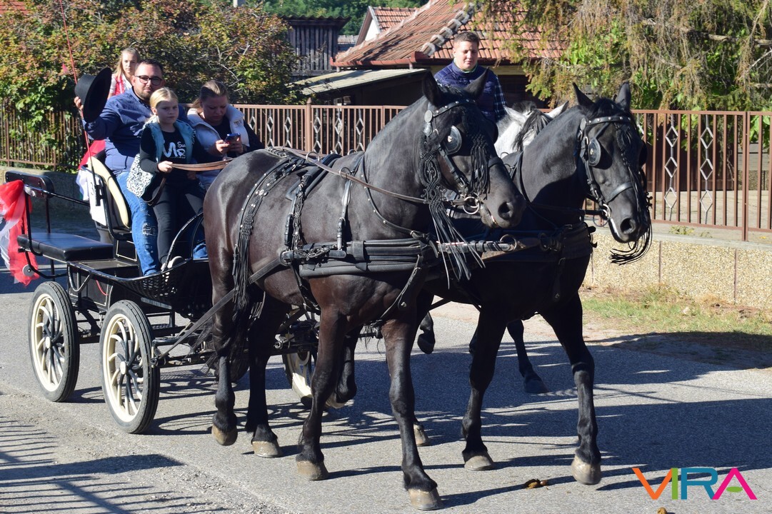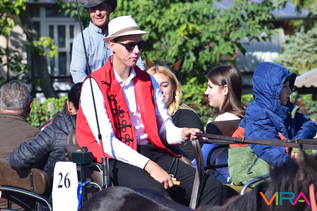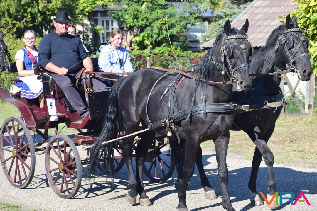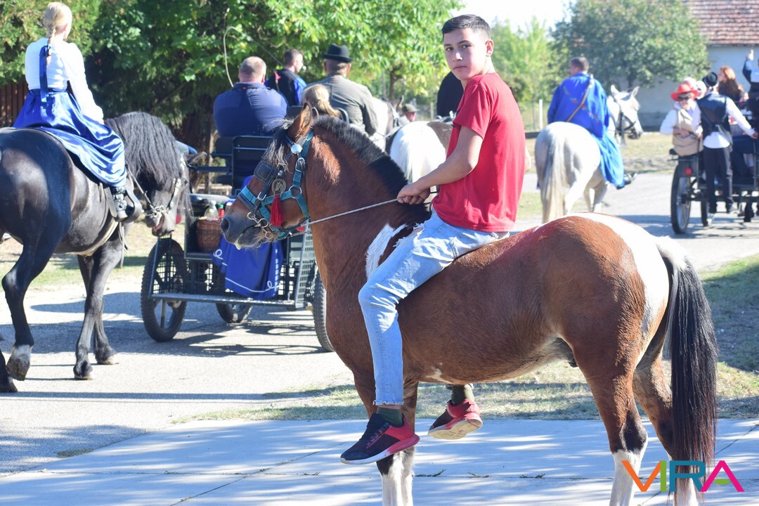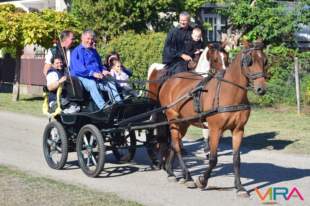 Délután fél kettőkor vette kezdetét a látványos szüreti felvonulás, melyre több településről is érkezetek lovasok, kocsisok és fogatosok. A menet először az IKSZT Dankó Pista Művelődési Ház előtt állt meg ahol külön is köszöntötték és be is mondták a fogatosok, kocsisok nevét. Részükre emléklappal és egy üveg borral köszönték meg a szervezők, hogy idén is ellátogattak Csengődre.