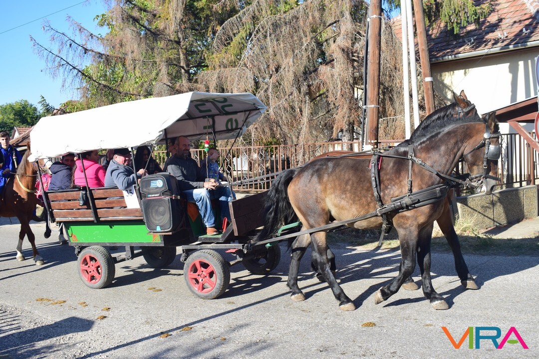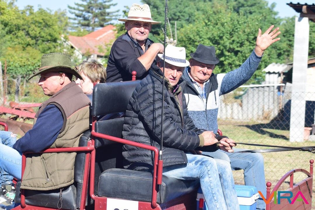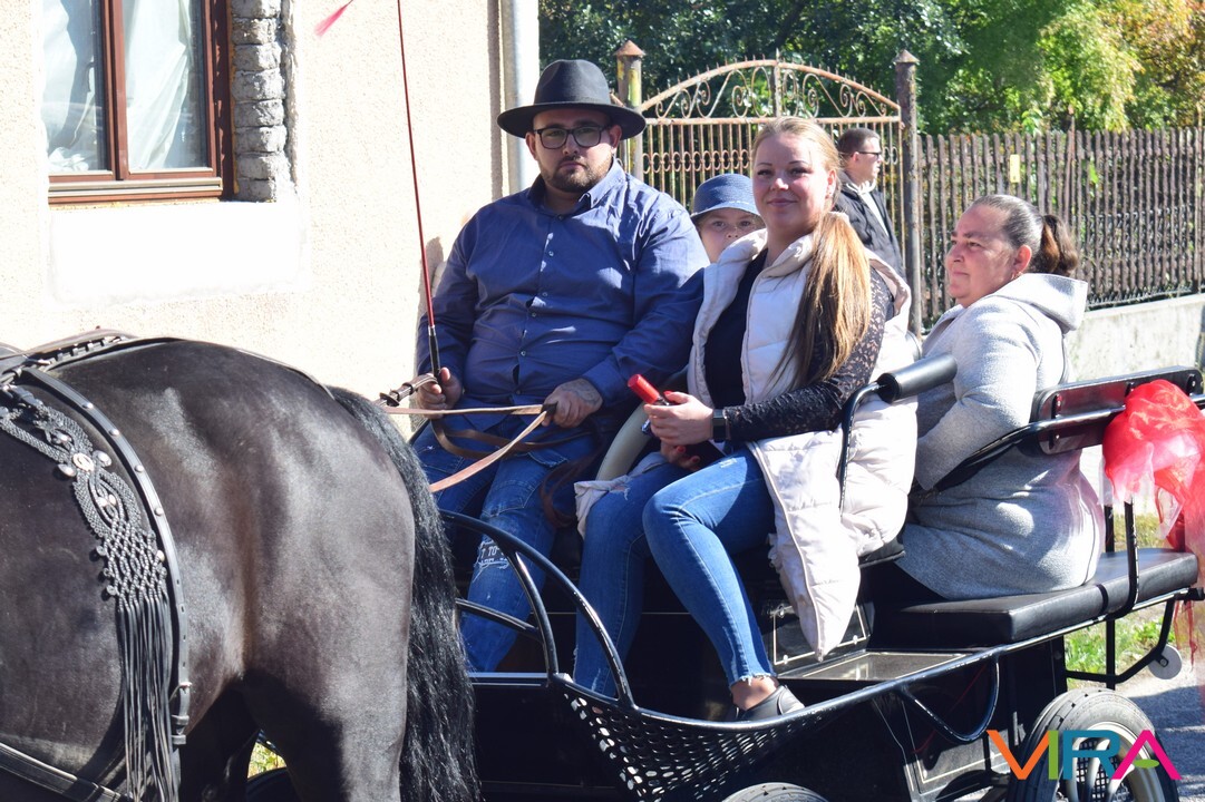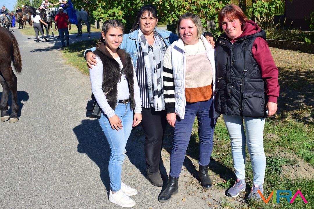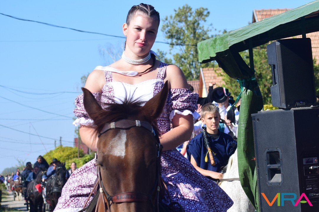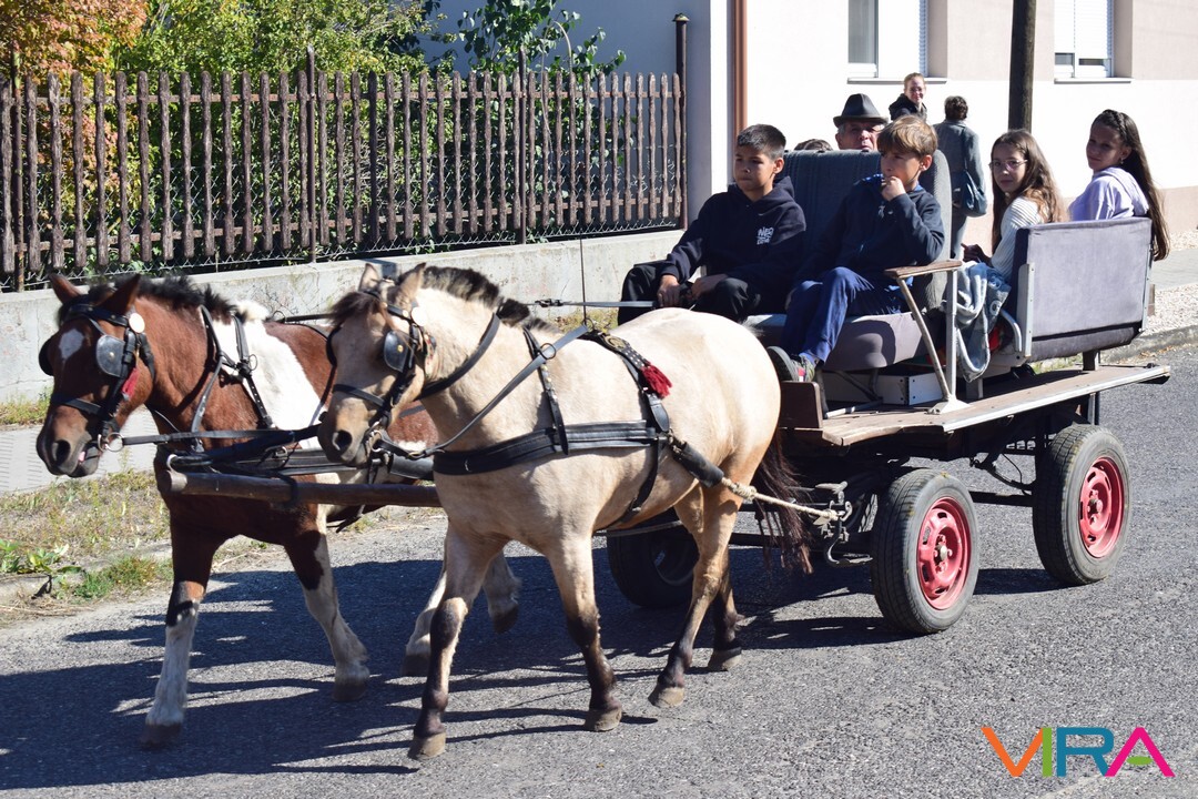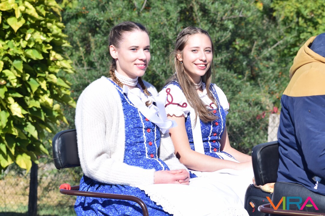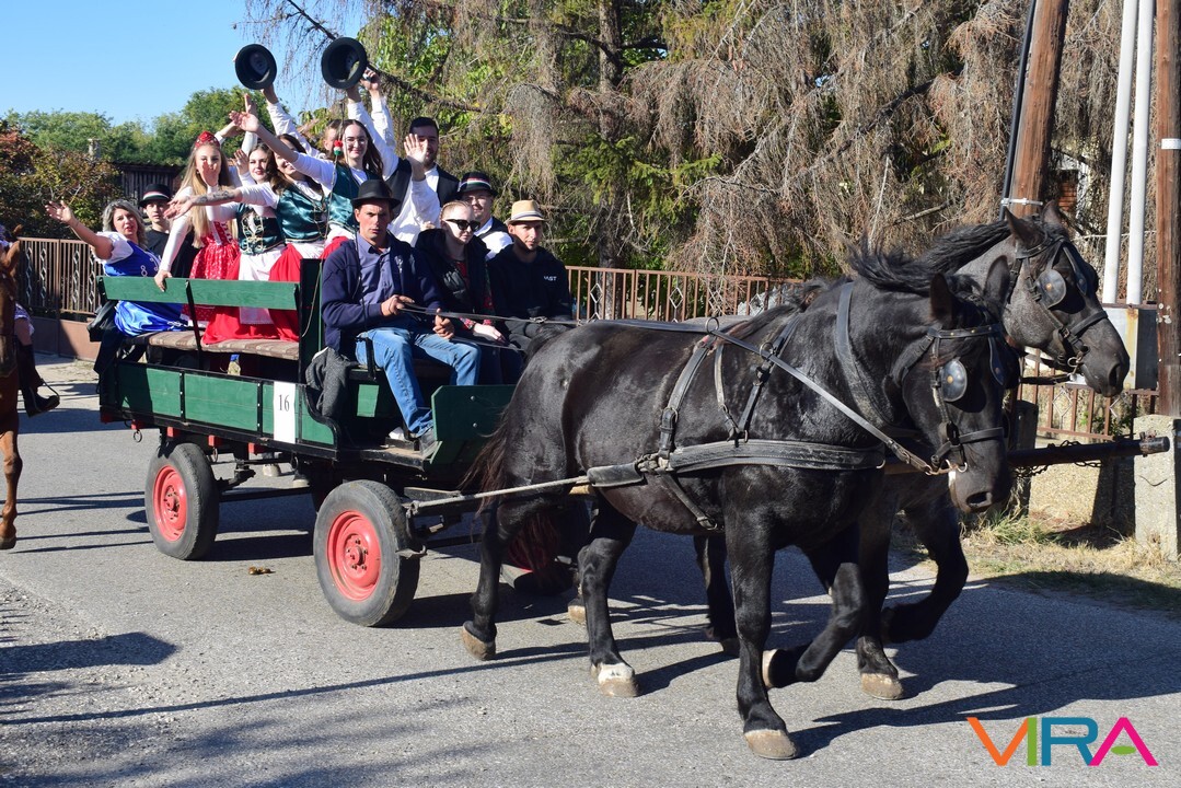Délután fél kettőkor vette kezdetét a látványos szüreti felvonulás, melyre több településről is érkezetek lovasok, kocsisok és fogatosok. A menet először az IKSZT Dankó Pista Művelődési Ház előtt állt meg ahol külön is köszöntötték és be is mondták a fogatosok, kocsisok nevét. Részükre emléklappal és egy üveg borral köszönték meg a szervezők, hogy idén is ellátogattak Csengődre.