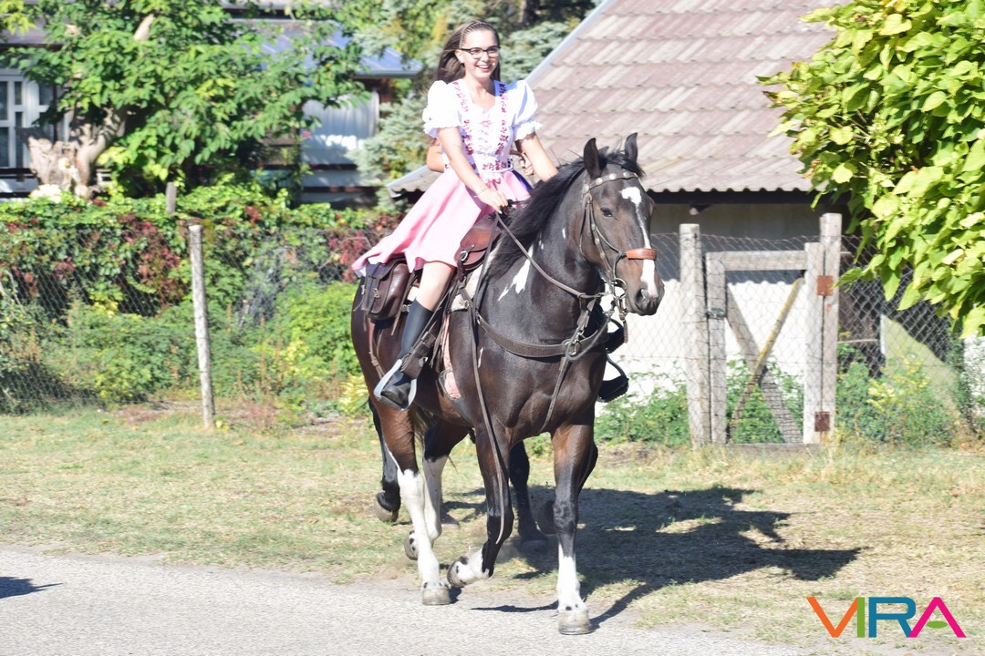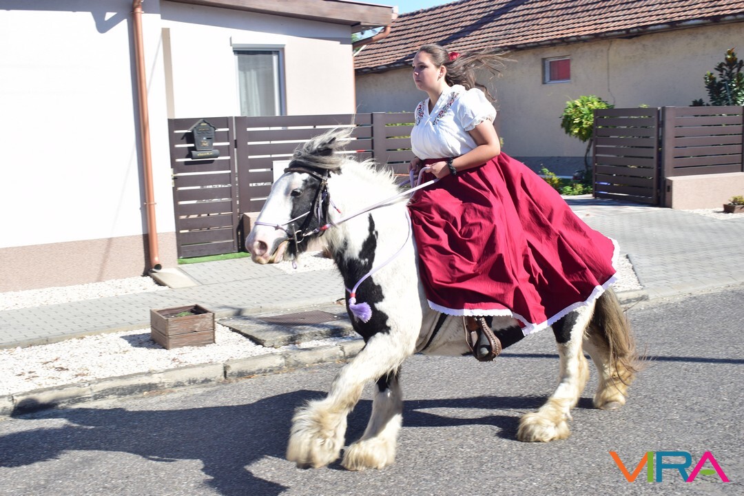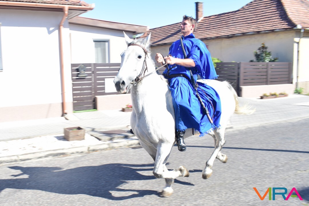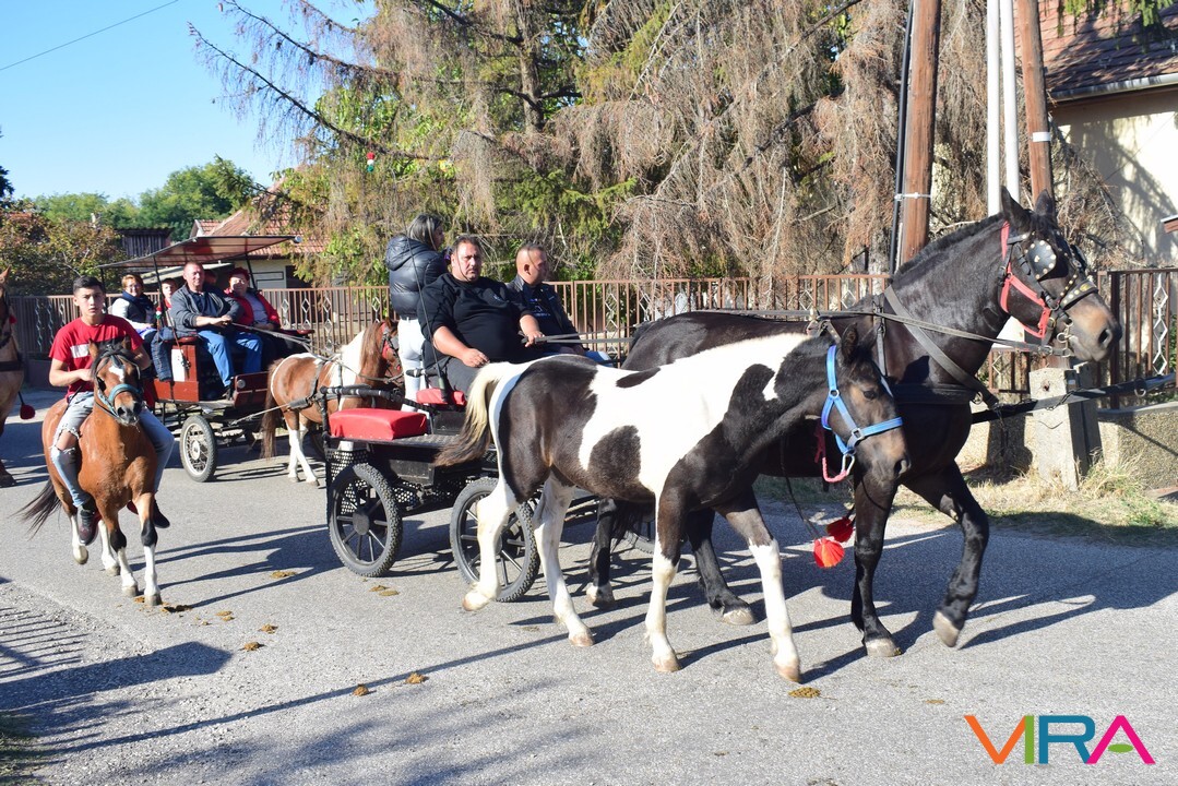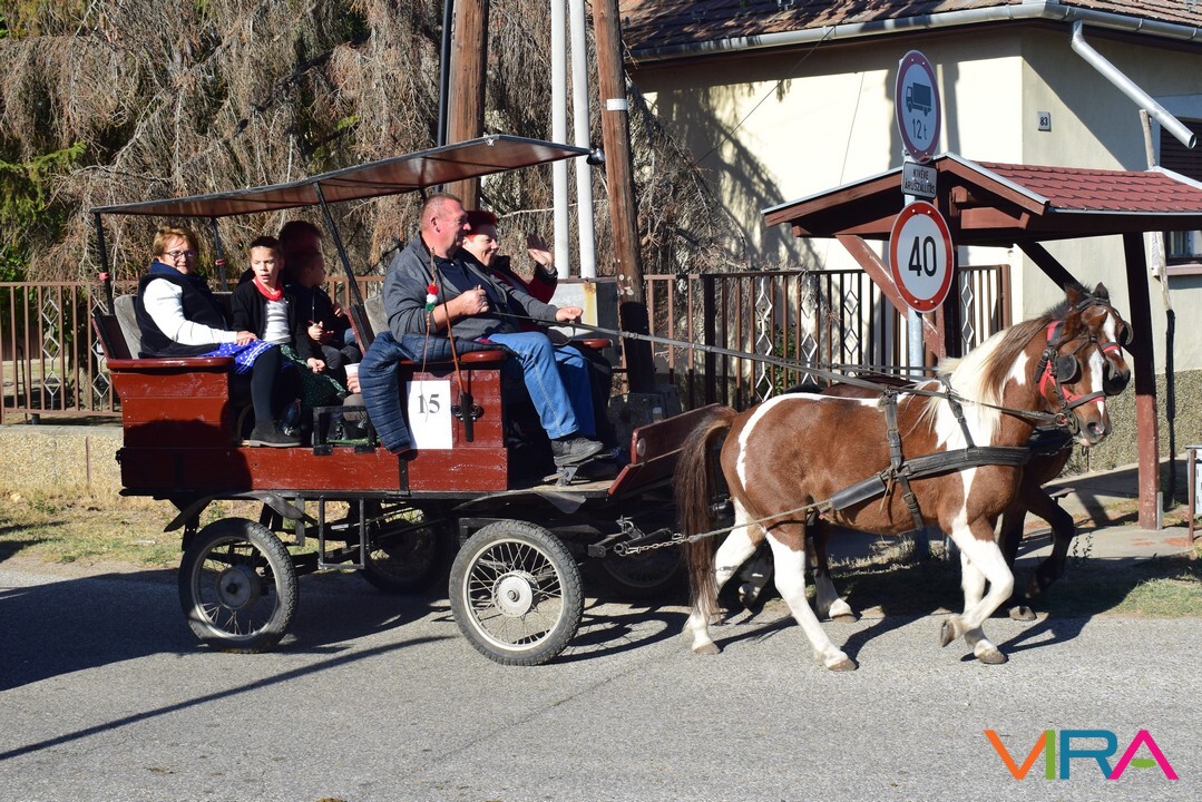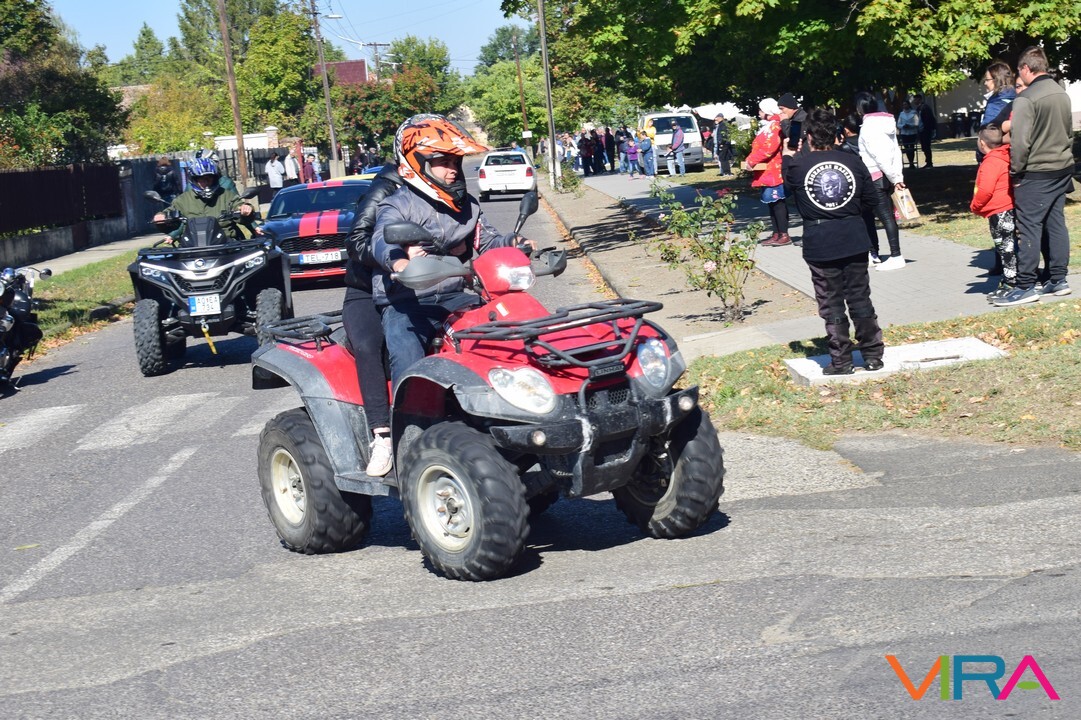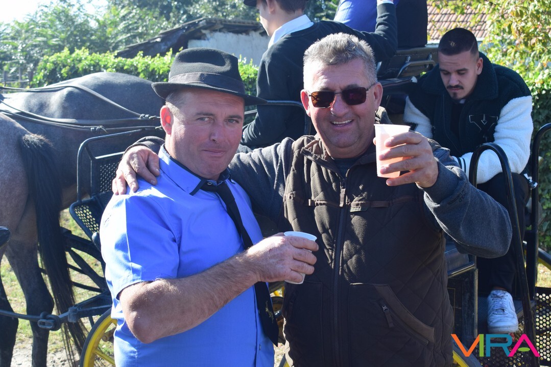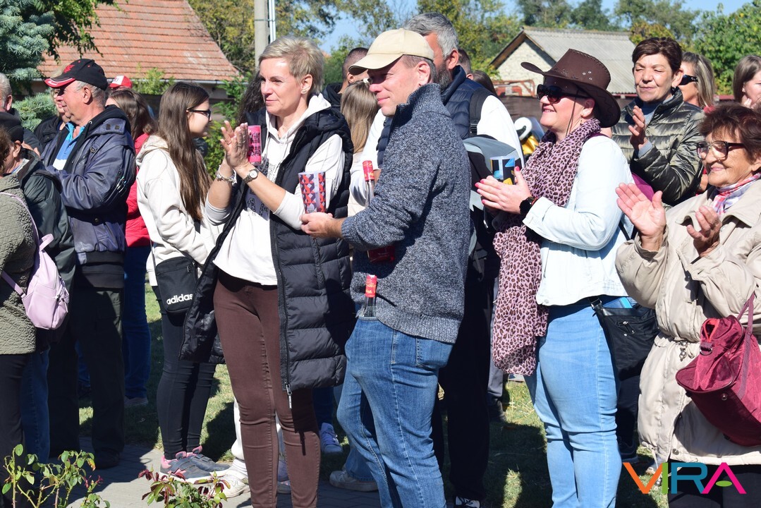 Délután fél kettőkor vette kezdetét a látványos szüreti felvonulás, melyre több településről is érkezetek lovasok, kocsisok és fogatosok. A menet először az IKSZT Dankó Pista Művelődési Ház előtt állt meg ahol külön is köszöntötték és be is mondták a fogatosok, kocsisok nevét. Részükre emléklappal és egy üveg borral köszönték meg a szervezők, hogy idén is ellátogattak Csengődre.