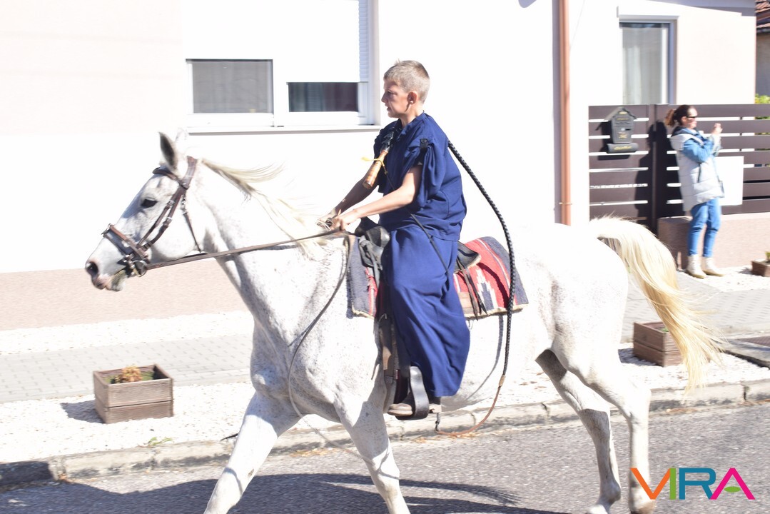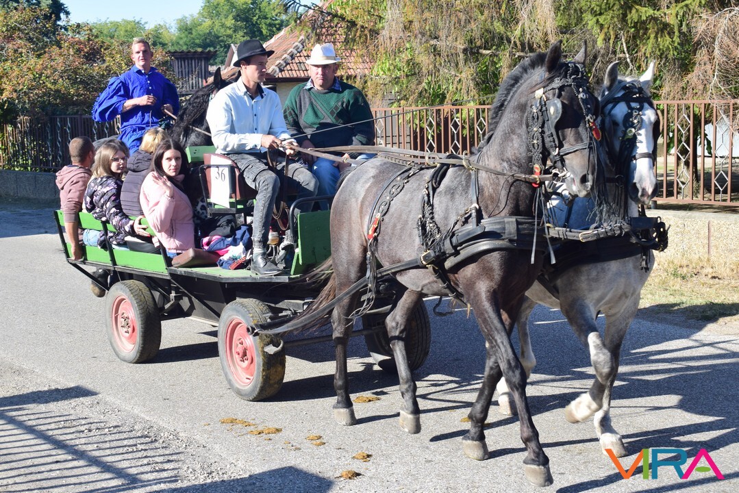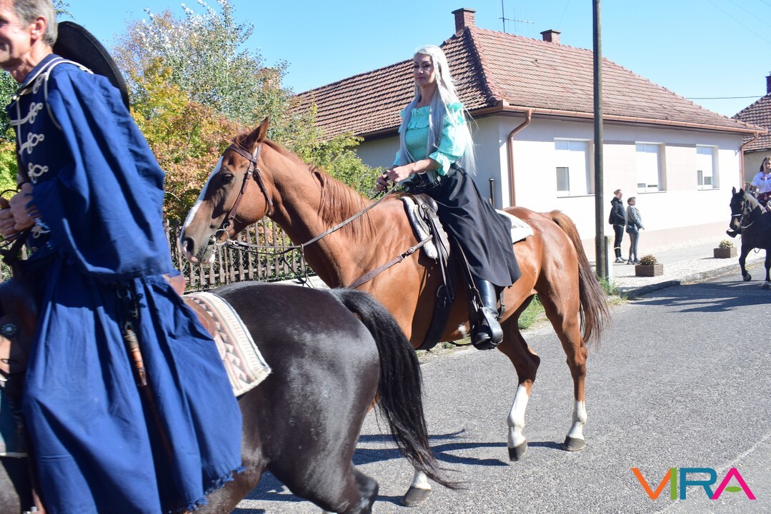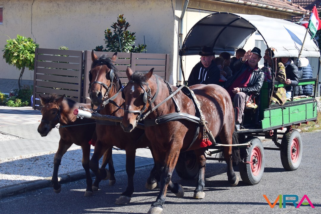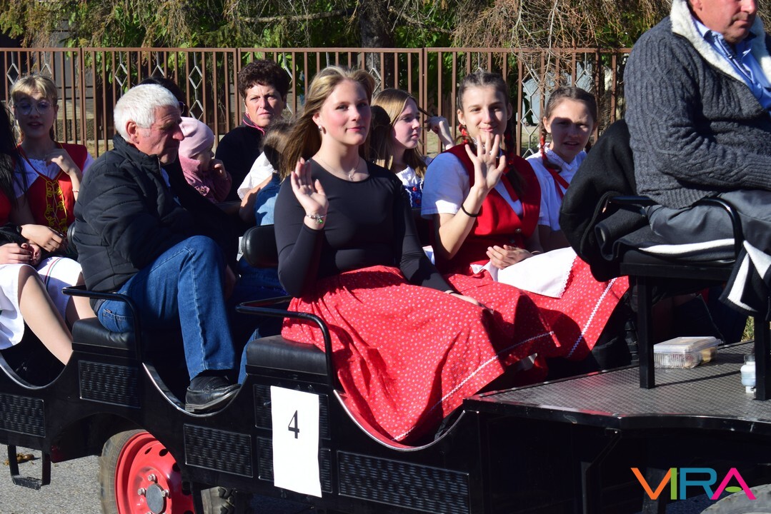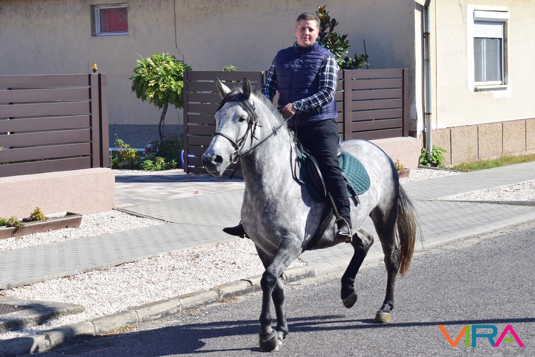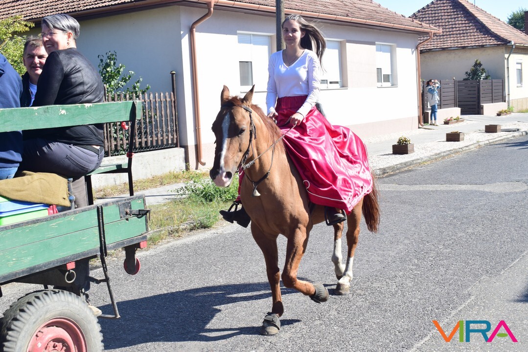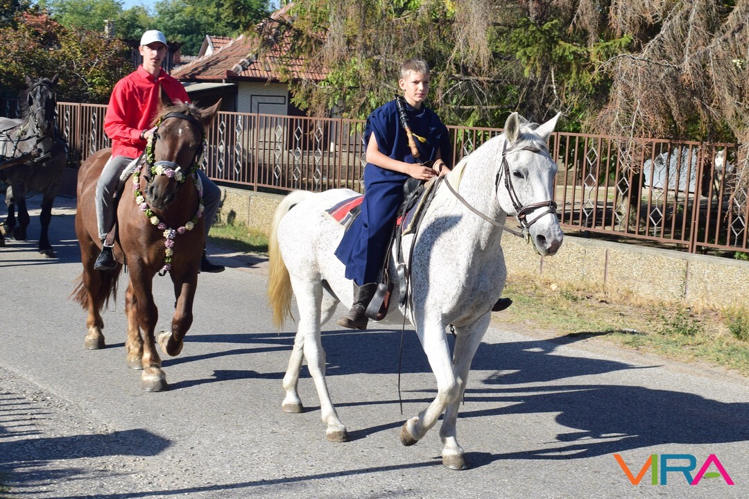 Délután fél kettőkor vette kezdetét a látványos szüreti felvonulás, melyre több településről is érkezetek lovasok, kocsisok és fogatosok. A menet először az IKSZT Dankó Pista Művelődési Ház előtt állt meg ahol külön is köszöntötték és be is mondták a fogatosok, kocsisok nevét. Részükre emléklappal és egy üveg borral köszönték meg a szervezők, hogy idén is ellátogattak Csengődre.