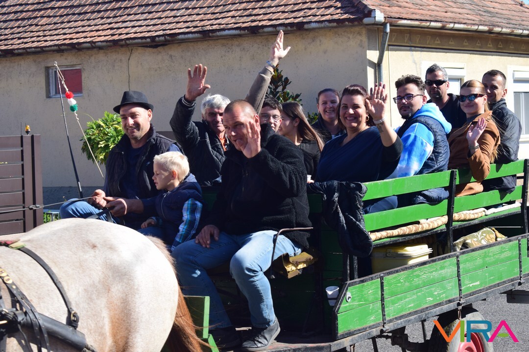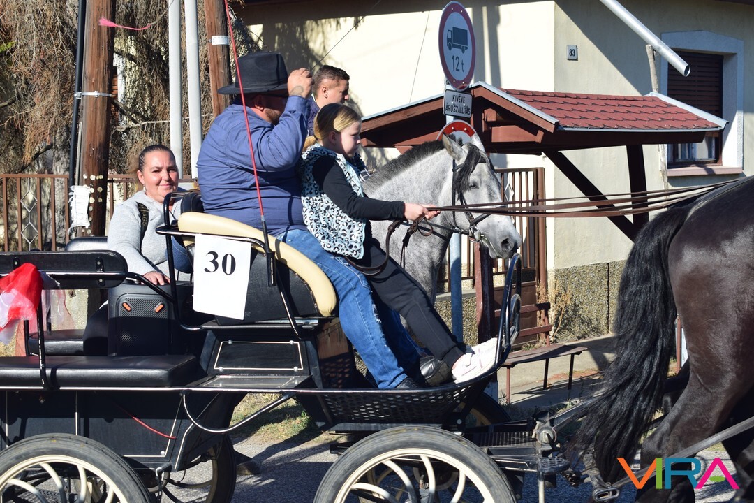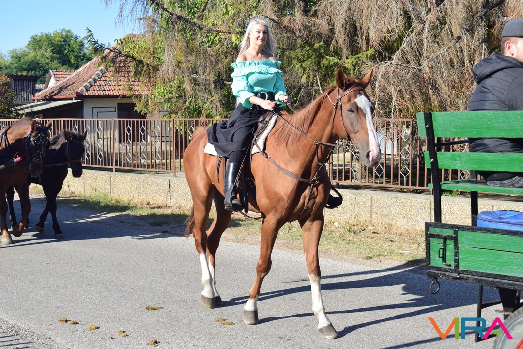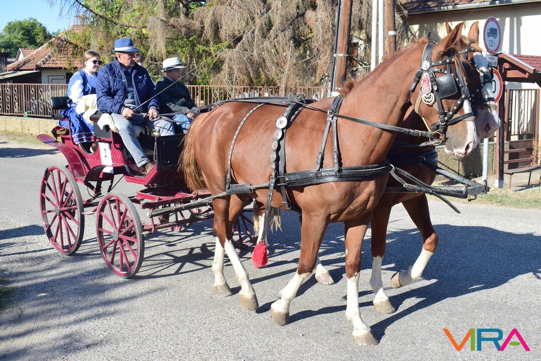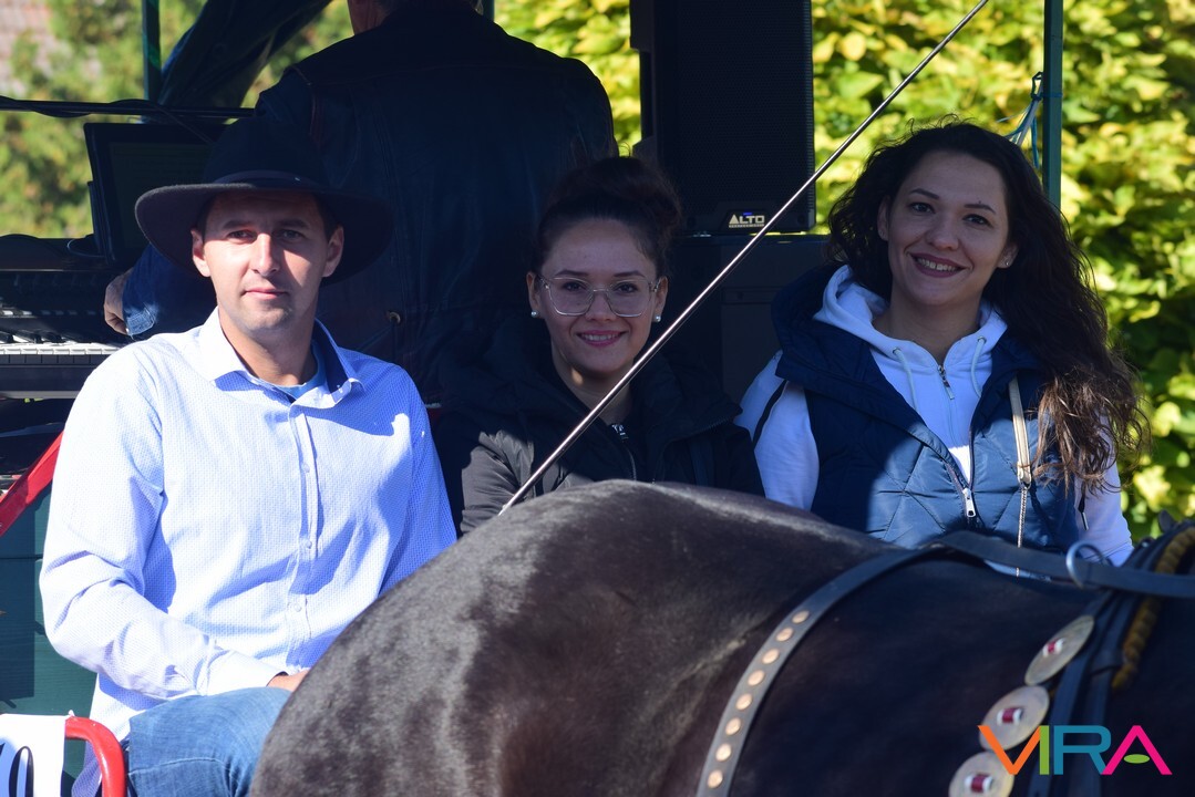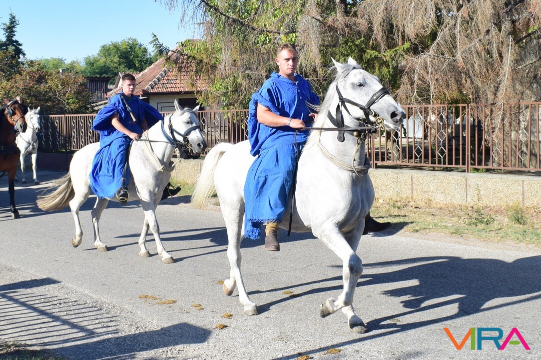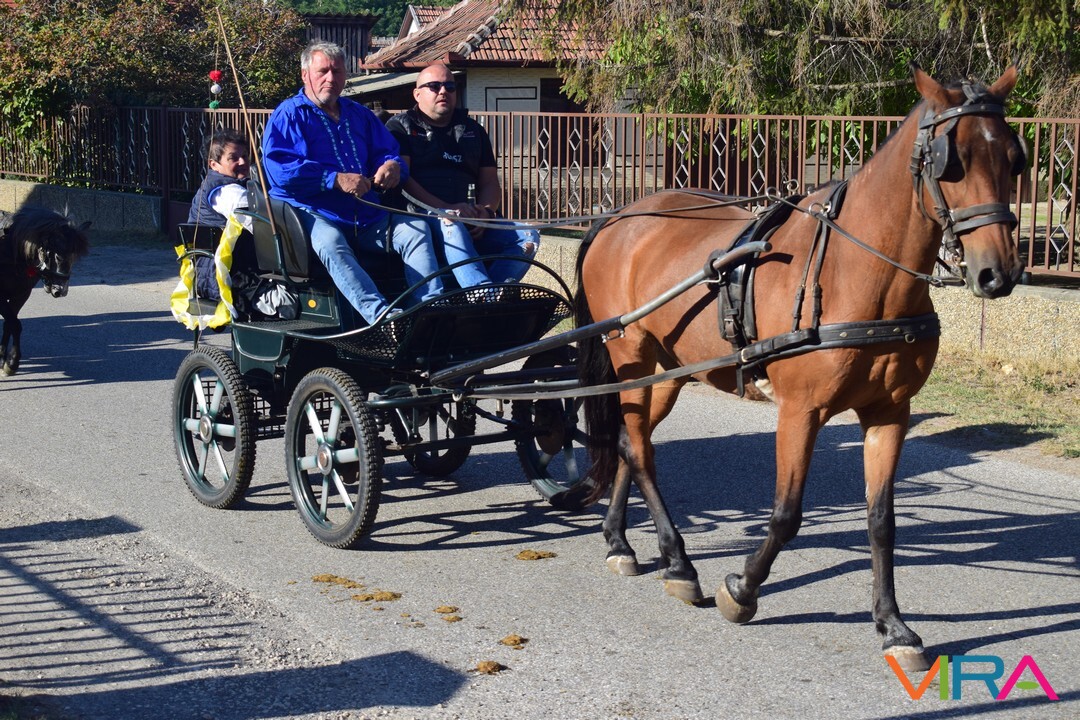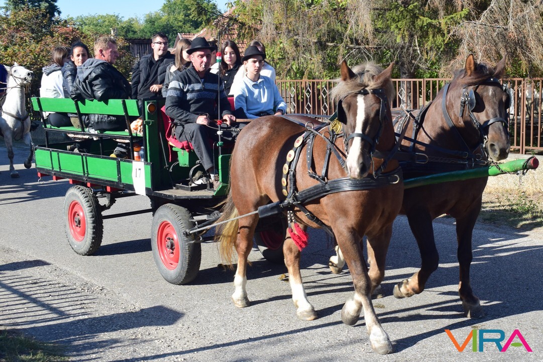 Délután fél kettőkor vette kezdetét a látványos szüreti felvonulás, melyre több településről is érkezetek lovasok, kocsisok és fogatosok. A menet először az IKSZT Dankó Pista Művelődési Ház előtt állt meg ahol külön is köszöntötték és be is mondták a fogatosok, kocsisok nevét. Részükre emléklappal és egy üveg borral köszönték meg a szervezők, hogy idén is ellátogattak Csengődre.