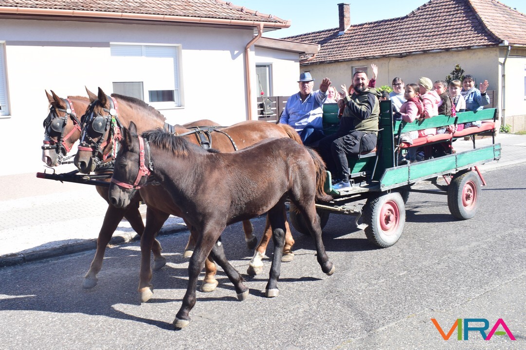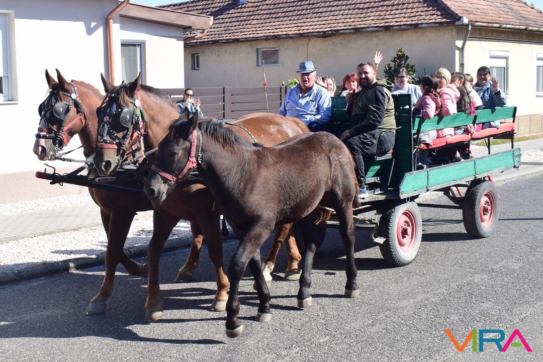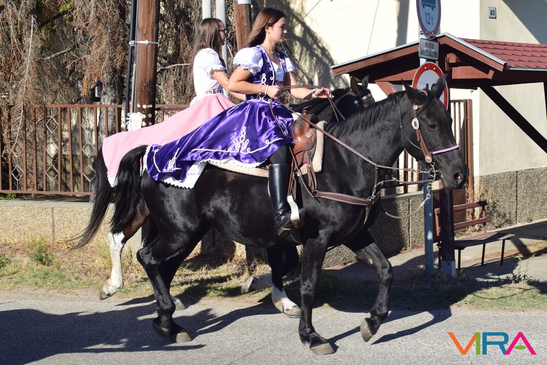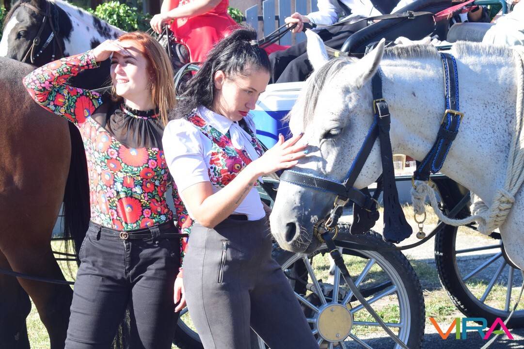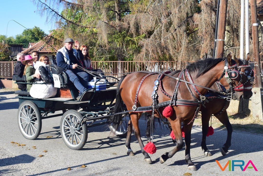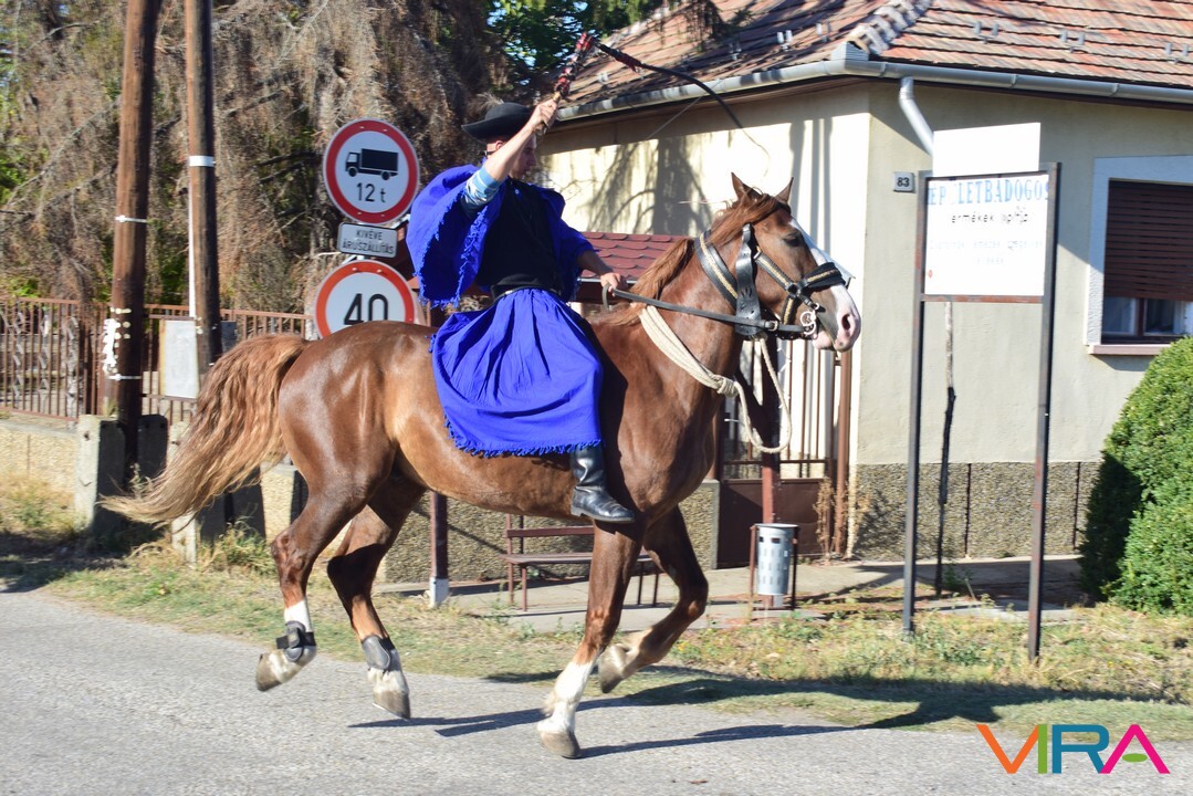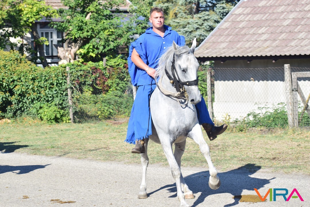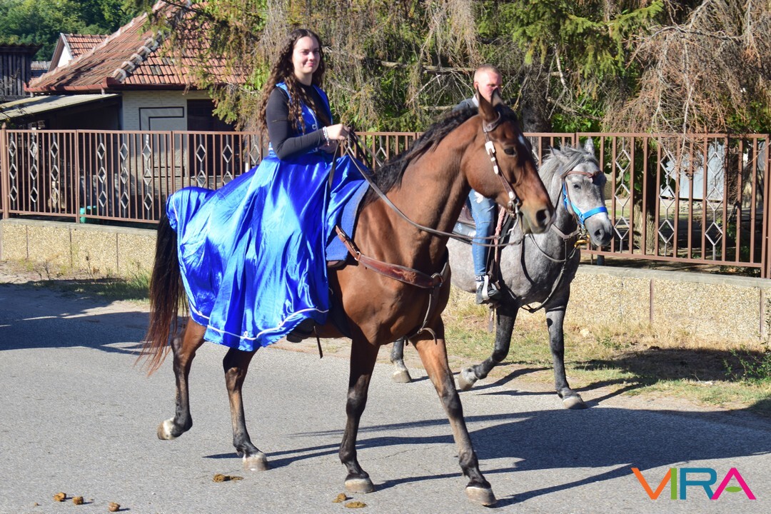 Délután fél kettőkor vette kezdetét a látványos szüreti felvonulás, melyre több településről is érkezetek lovasok, kocsisok és fogatosok. A menet először az IKSZT Dankó Pista Művelődési Ház előtt állt meg ahol külön is köszöntötték és be is mondták a fogatosok, kocsisok nevét. Részükre emléklappal és egy üveg borral köszönték meg a szervezők, hogy idén is ellátogattak Csengődre.