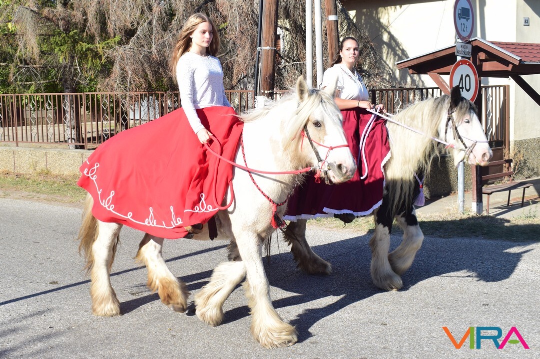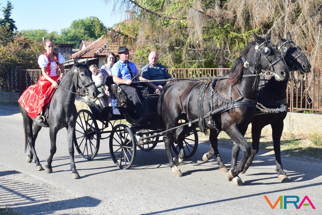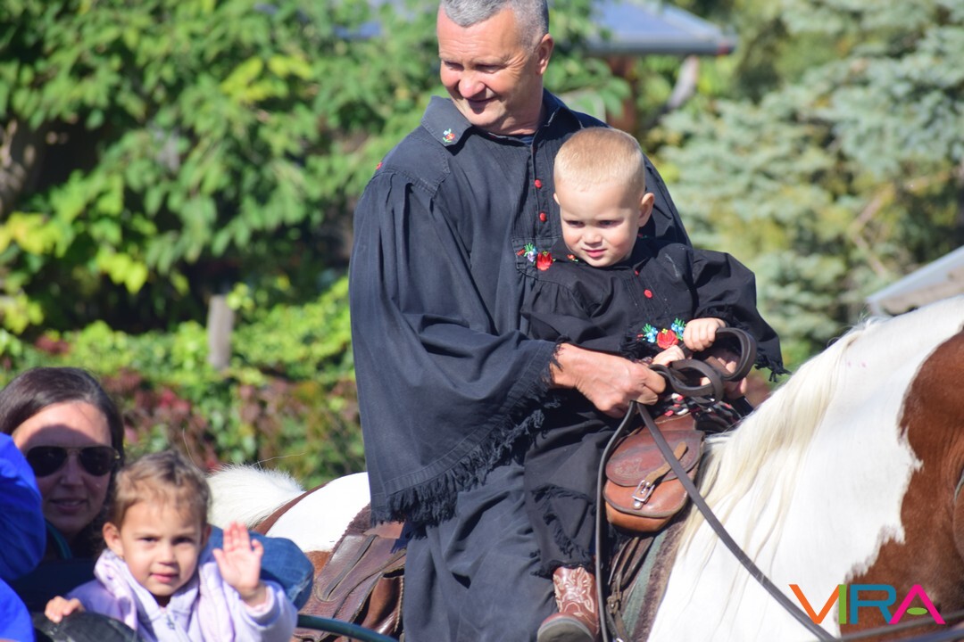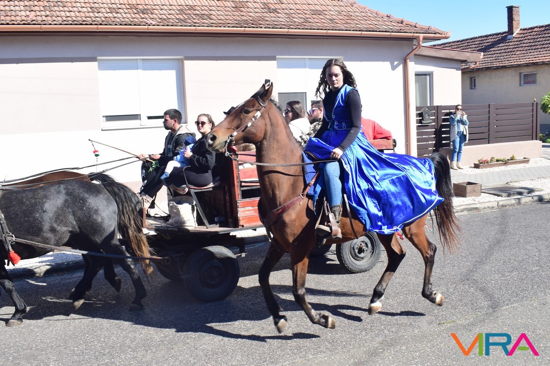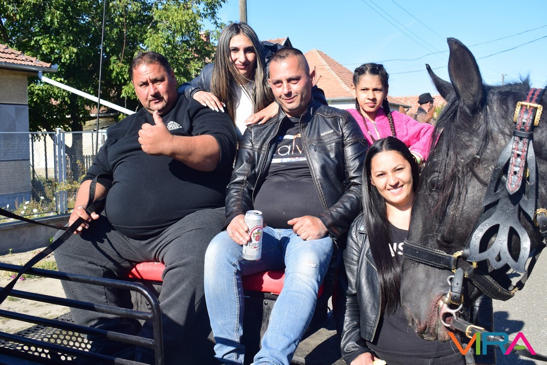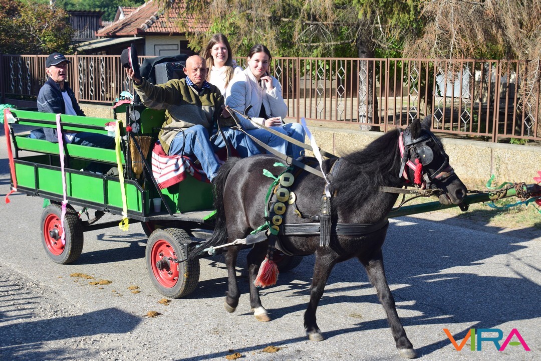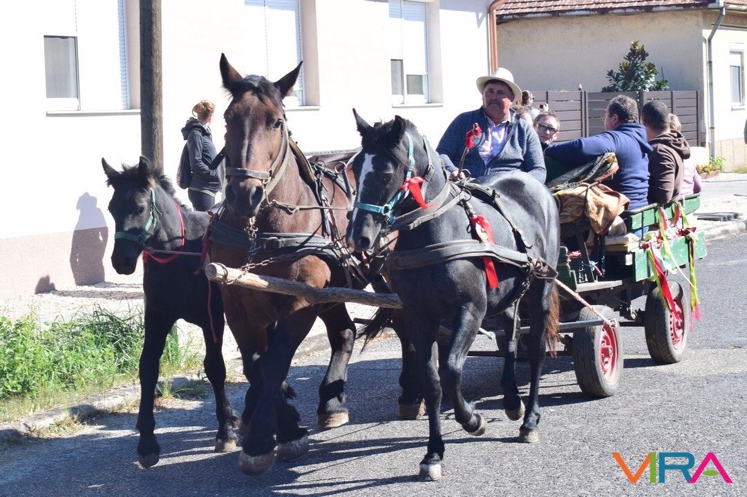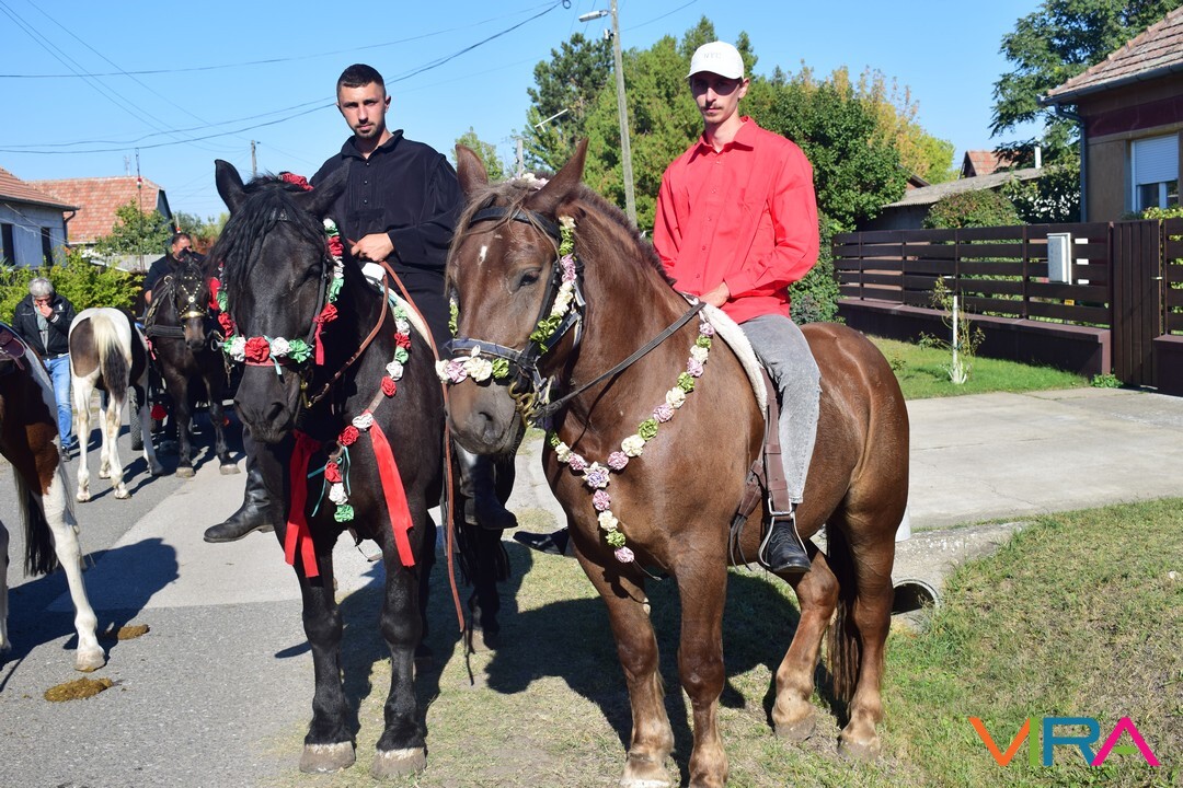 Délután fél kettőkor vette kezdetét a látványos szüreti felvonulás, melyre több településről is érkezetek lovasok, kocsisok és fogatosok. A menet először az IKSZT Dankó Pista Művelődési Ház előtt állt meg ahol külön is köszöntötték és be is mondták a fogatosok, kocsisok nevét. Részükre emléklappal és egy üveg borral köszönték meg a szervezők, hogy idén is ellátogattak Csengődre.