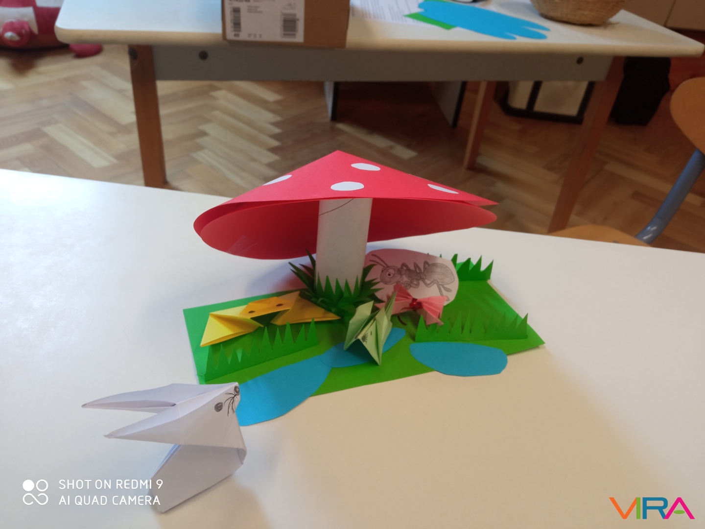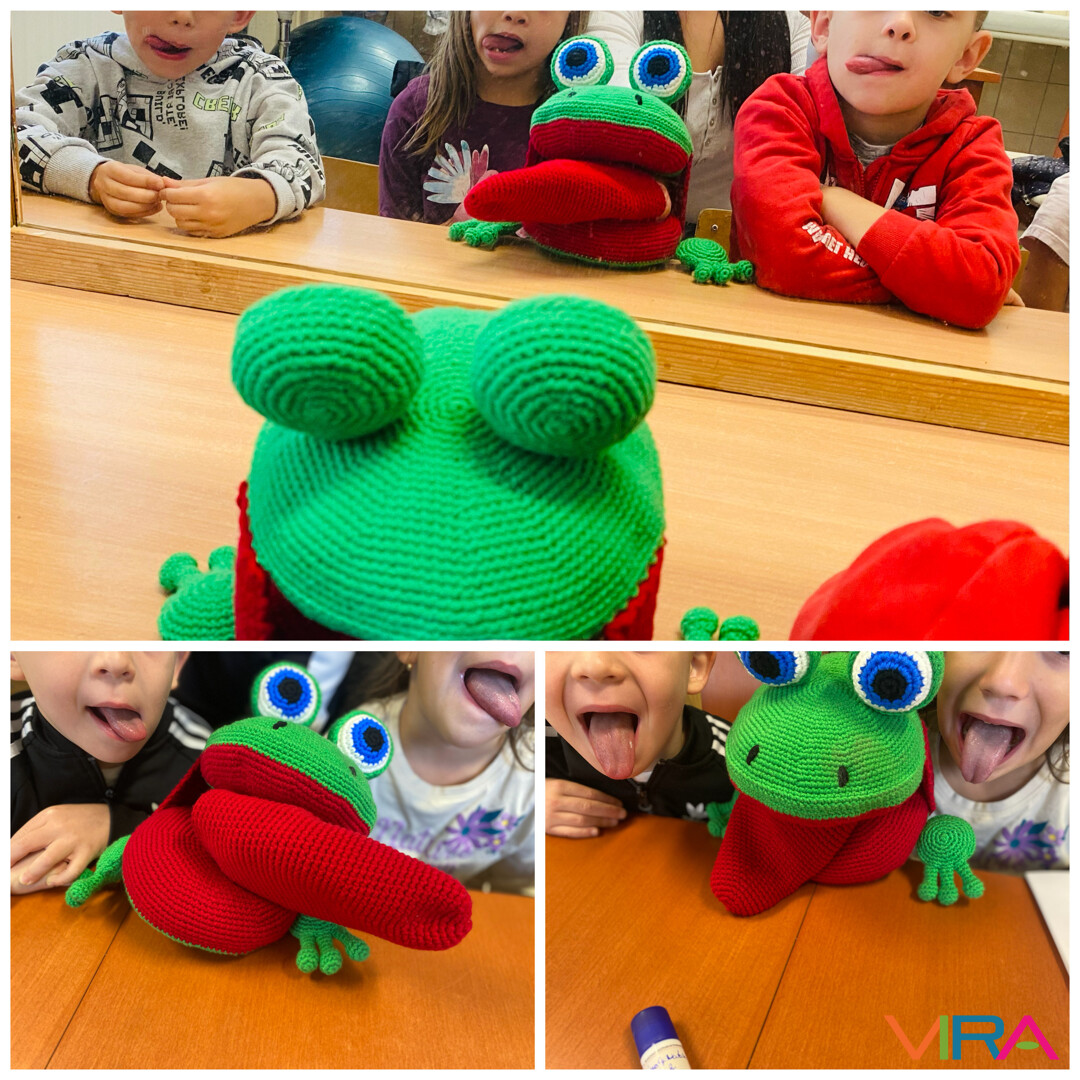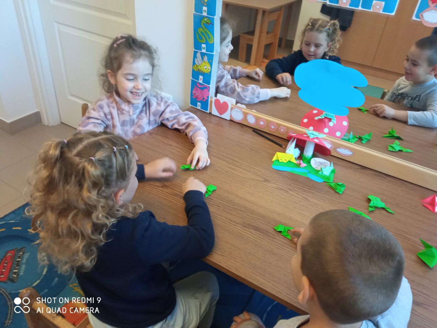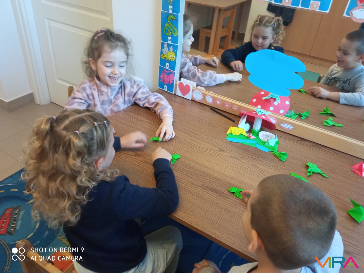 Az Állatvédelmi Témahét keretén belül logopédiai munkaközösségünk az állatokról való gondoskodás fontosságát Szutyejev: A gomba alatt című meséjén keresztül vitte közelebb a gyermekekhez. A közös mesefeldolgozás után origami technikát felhasználva mindenki meghajtogatta a mese hiányzó szereplőjét, az ugráló békát. Békaugráltatás után beszélgettünk a gyerekekkel a békák hasznosságáról, védelmük fontosságáról, és a lehetőségekről, amivel mindnyájan segíthetjük ezeknek az apró állatoknak a túlélését. Az ismeretszerzés nyelvi eszköze mellett a gyerekek kézügyessége, kreativitása is előtérbe került. Olyannyira élvezték az általuk hajtogatott békákkal való játékot, hogy a csoportszobába visszatérve is folytatták a velük való foglalkozást.
