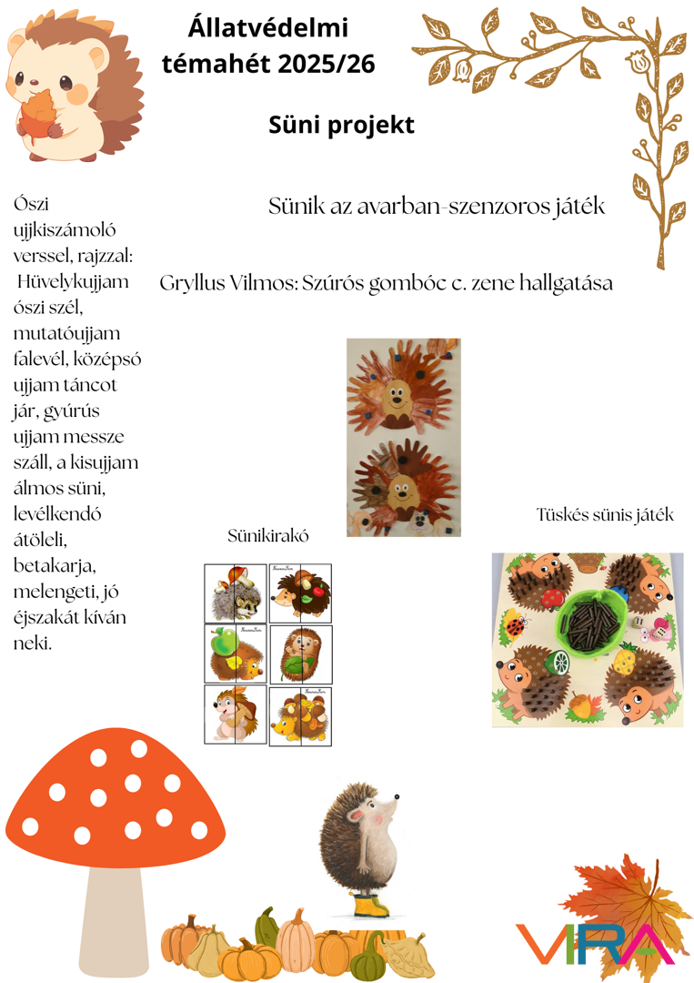 A korai munkacsoport a sünt választotta az idei témahét központi szereplőjének. Csatlakozásra kértük a járás bölcsődéit, ahol kollégáink korai fejlesztést folytatnak. Játék, vers, kiszámoló, dalgyűjteményt és kézműves tevékenységekről szóló ötletlistát ajánlottunk fel, valamint számítottunk a kisgyermeknevelők kreativitására is.