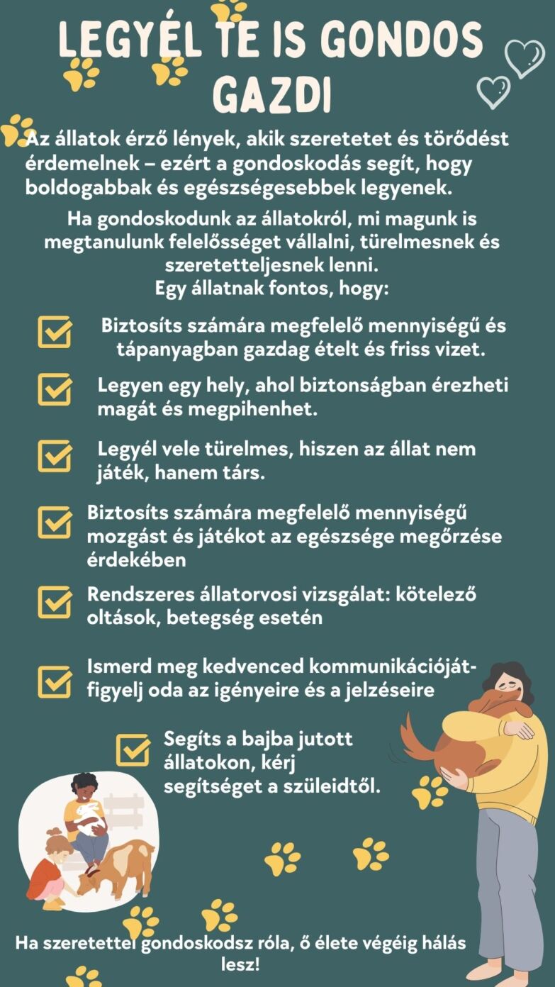 Az állatvédelmi témahét programjaihoz intézményünk pszichológusai is aktívan csatlakoztak, ezzel gazdagítva az intézmény szemléletformáló tevékenységeit. Két pszichoedukációs plakát került elkészítésre, amelyek a felelős állattartás jelentőségét, valamint a gondos gazdivá válás lépéseit, illetve Magyarország védett állatait mutatták be, fejlesztve a tanulók természettudományos ismereteit. Továbbá a gyermekek számára szókereső és befejezetlen mondatokat helyeztünk el az intézmény folyosóján, amelyek játékos formában ösztönzik az állatokkal kapcsolatos tudás és érzékenység fejlődését. Fontosnak tartjuk, hogy az állatokkal létrejövő kapcsolat támogatja az empátia, a felelősségtudat fejlődését és a környezettudatos szemlélet elmélyülését.