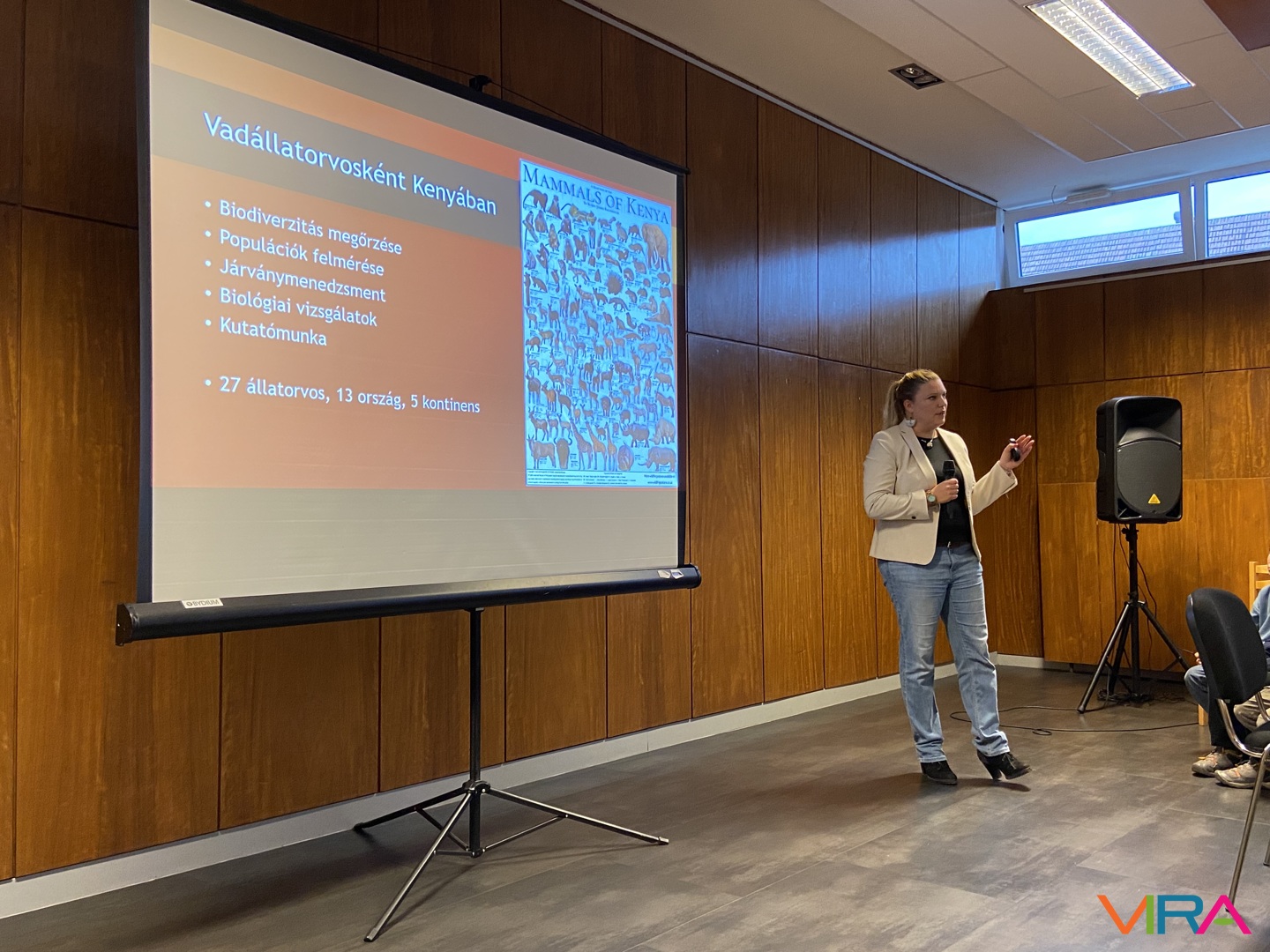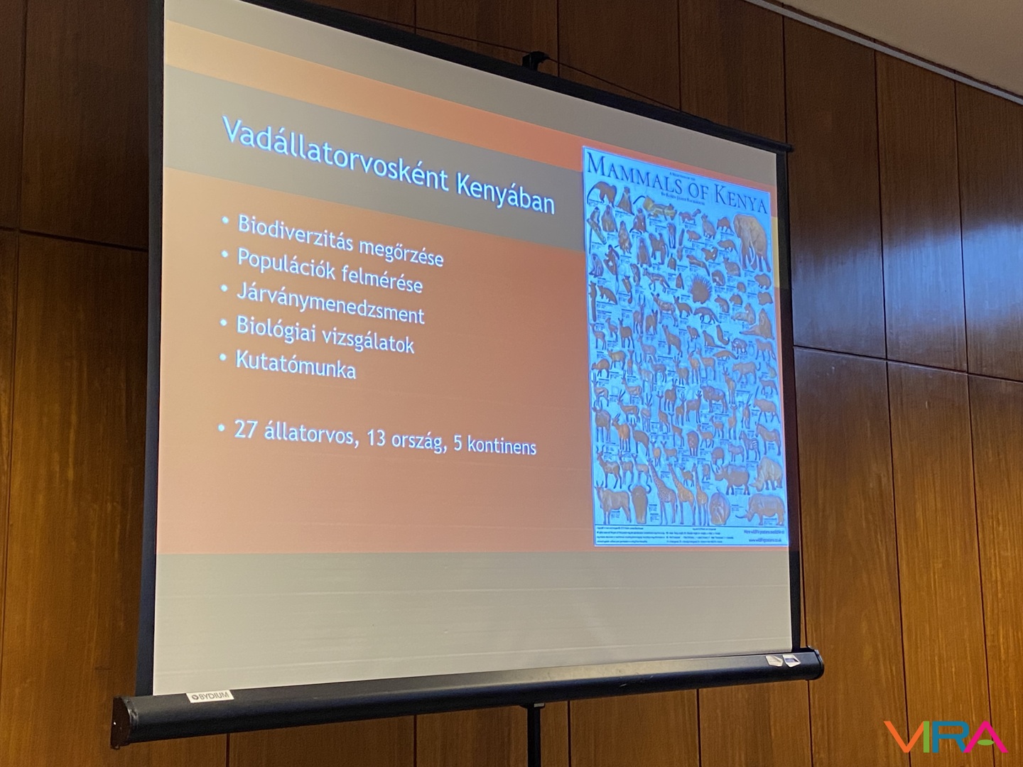 „Az előadásomat az emberi túlszaporodás miatti járványokból tartottam. Itthon most foglalkozom az orrszarvúakat érintő lóherpeszvírussal, Kenyában pedig a zebrák és a szamarak keveredésével foglalkoztam. Erre már vannak adatok, 2020-ban láttak először ilyen hibridet. Nyilván ez egy bizonyíték arra, hogy a lófélék – mint a zebra és a szamár – tudnak keveredni, és ezzel vírust is át tudnak adni. Ez nagyon komoly problémát jelent, hiszen innen már csak egy lépés, hogy ez az orrszarvúakhoz is kijusson, ha már a zebrák között van a betegség.”