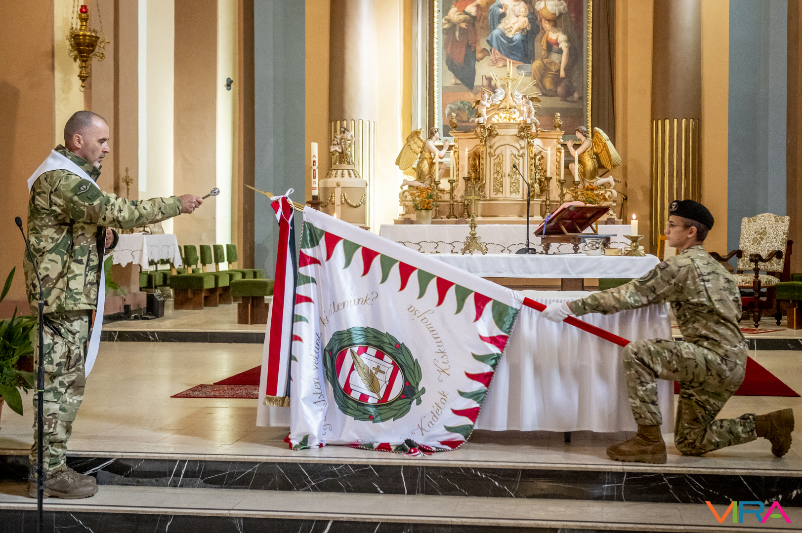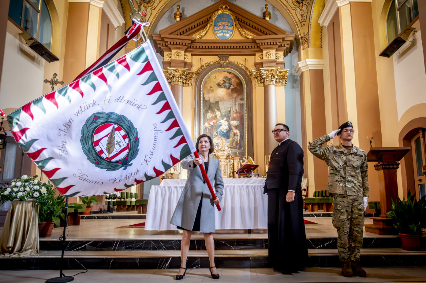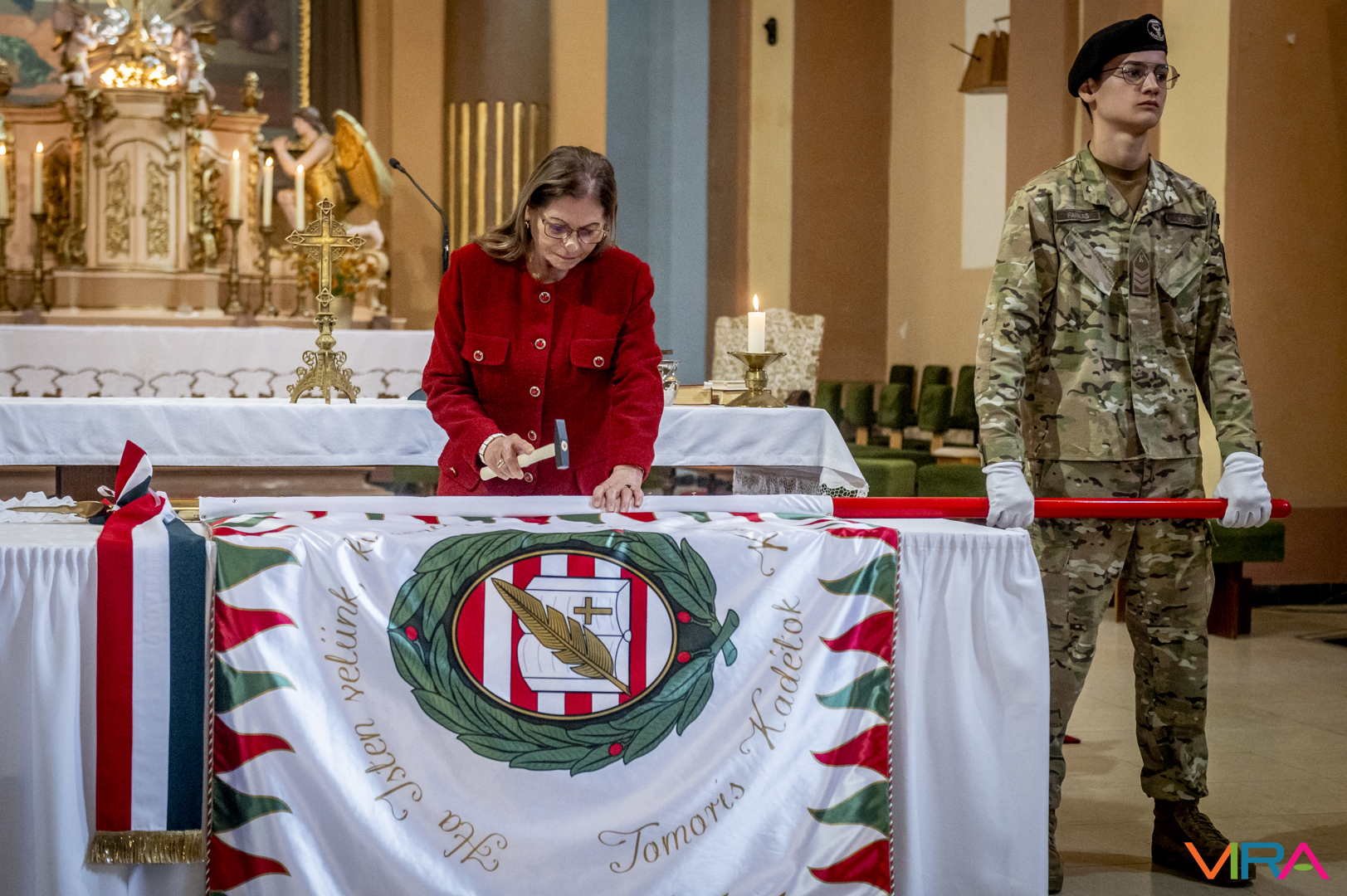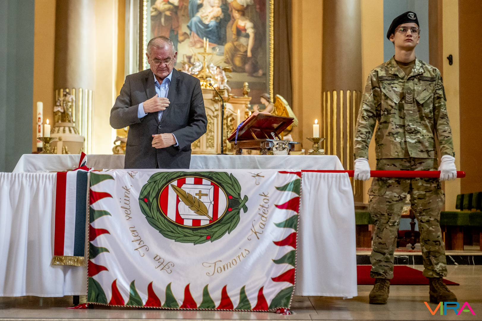 A szentmisét és a zászló megáldását Főtisztelendő Takács Tamás ezredes, a Magyar Katolikus Tábori Lelkészi Kar vezetője celebrálta. Az adományozó beszédet Főtisztelendő Kullai Attila atya mondta el, aki volt iskolalelkészként adományozta a zászlót a kadétoknak. A rendezvényen jelen volt Czifrik Ágnes, a Tomori Pál Katolikus Gimnázium, Technikum és Kollégium főigazgatója, Huszár Ferenc ezredes, a Magyar Honvédség Dombay Miksa 4. Területvédelmi Ezred parancsnoka, valamint Gramantik Zoltán, a Honvédelmi Minisztérium Honvédelmi Oktatási, Kulturális és Tudományszervező Főosztályának osztályvezetője.
