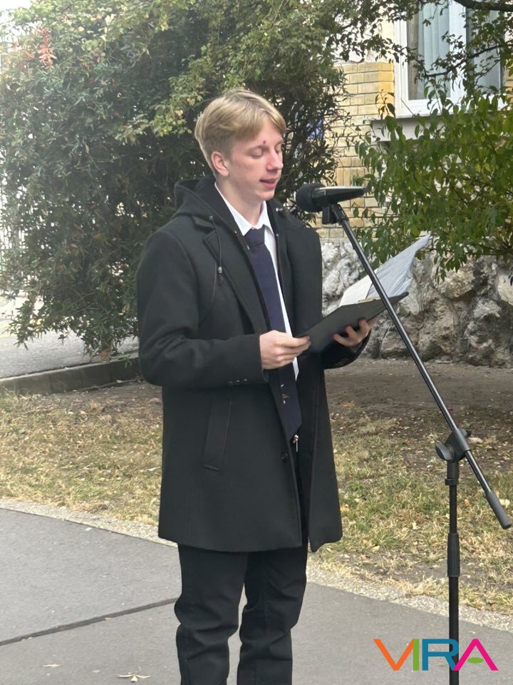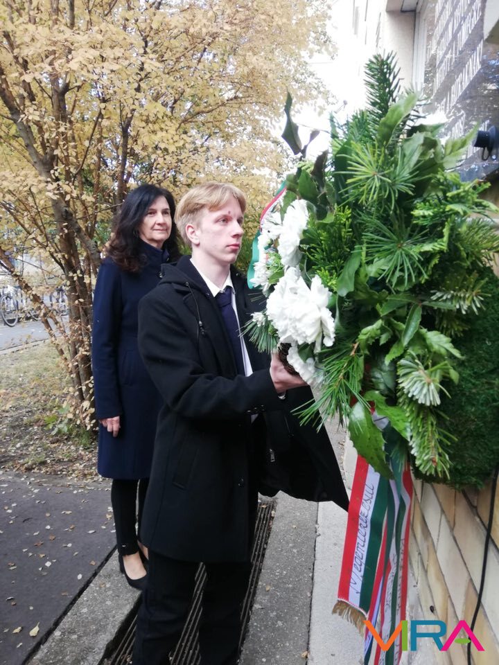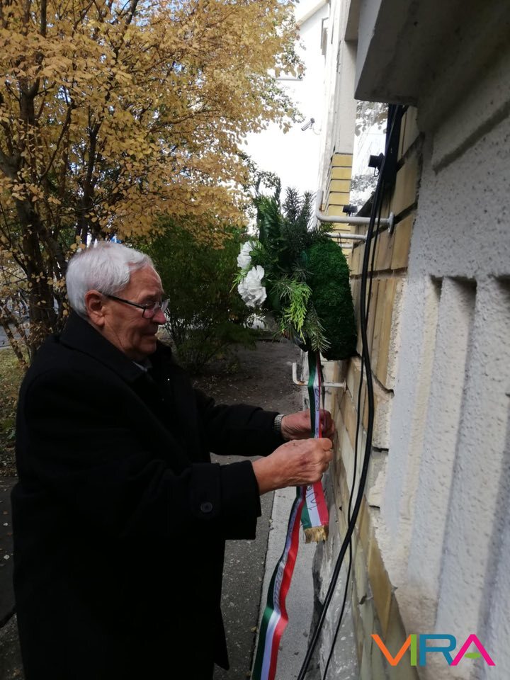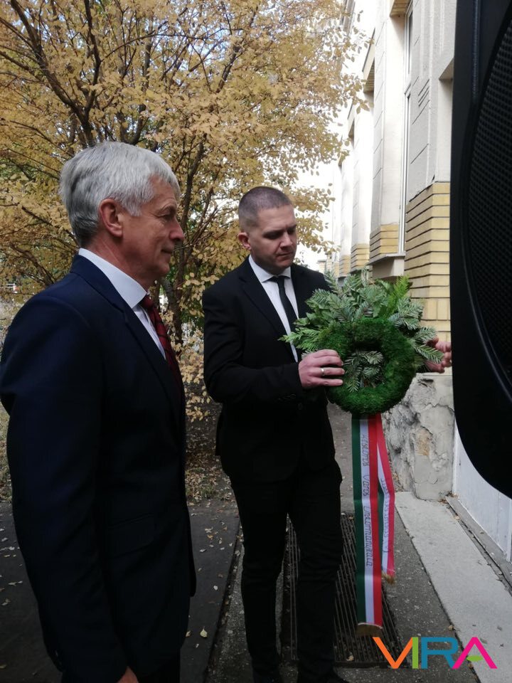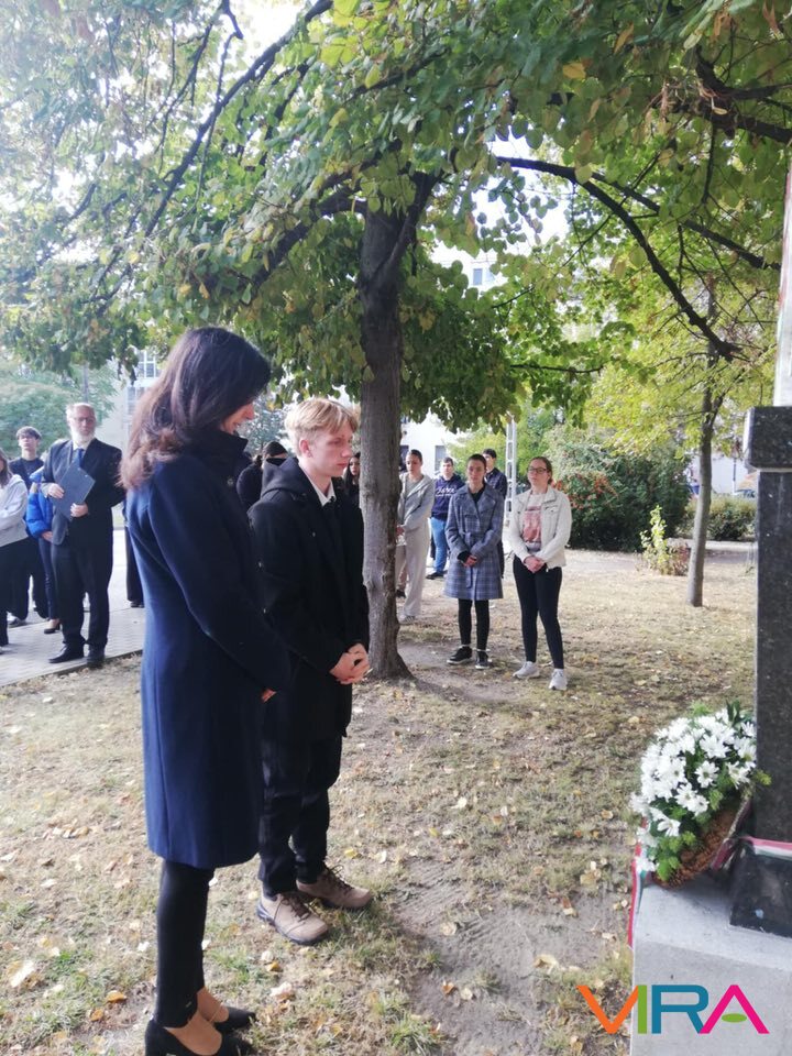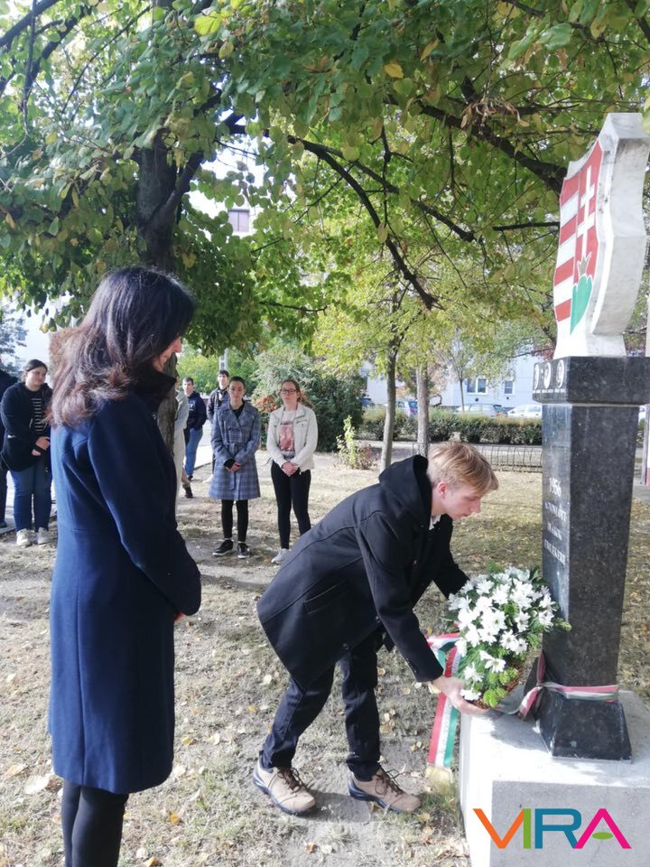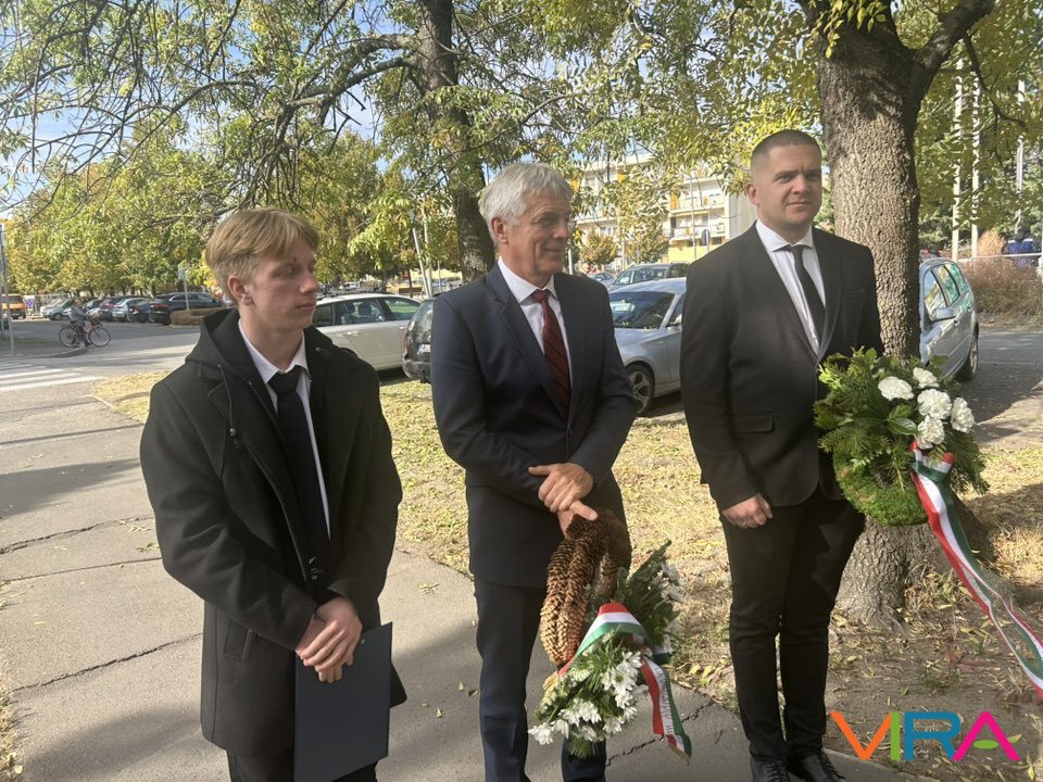 A Ralovichné Mészáros Ildikó tanárnő által összeállított rádiós műsor után Mester Máté diákpolgármester osztotta meg ünnepi gondolatait, majd az 56-os emléktáblánál koszorút helyezett el Faragó Imre, 56-os forradalmár; a városvezetés nevében ifj. Gmoser István alpolgármester és Horváth János tanár úr; valamint az iskola nevében Mester Máté diákpolgármester és Szentgyörgyiné Szlovák Mária főigazgató.