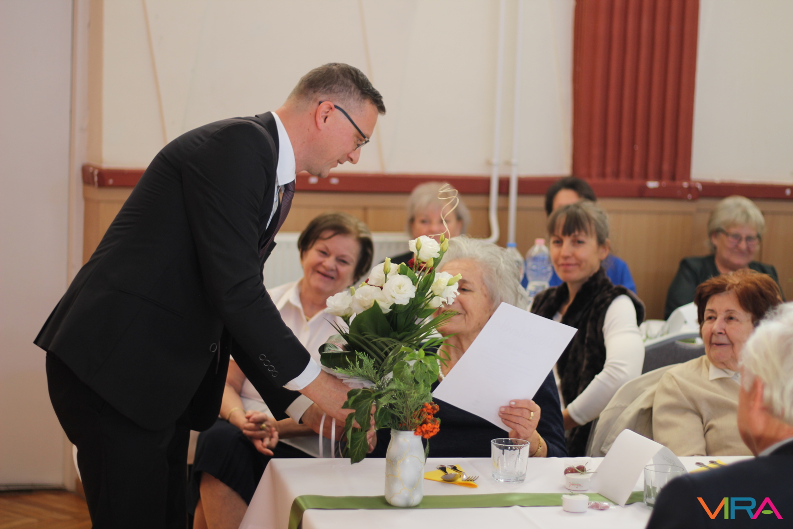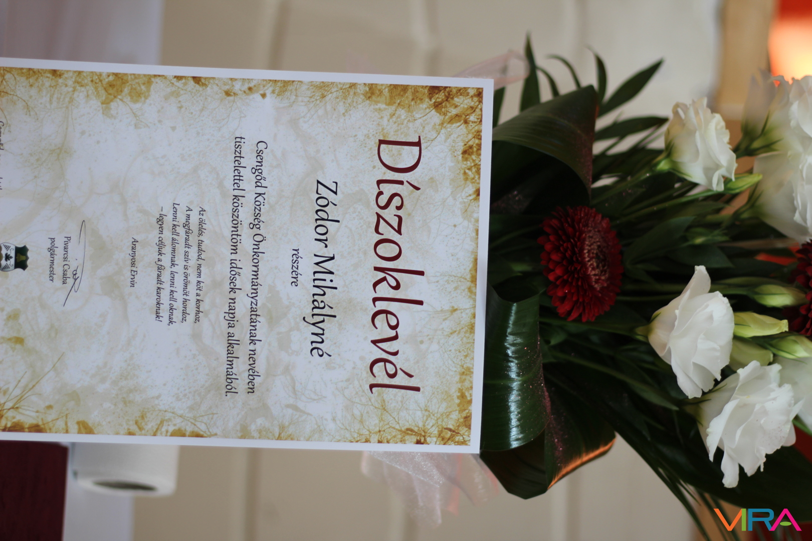 Külön öröm volt, hogy Zódor Mihályné Irma néni személyesen is jelen volt, így díszoklevélben és virágban részesülhetett, hatalmas örömére.