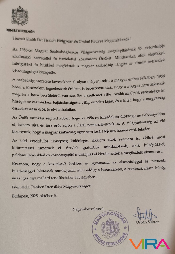 A találkozó végén Orbán Viktor levelét hallgatták meg, melyben köszönő és elismerő szavai mellett buzdít az 1956-os forradalom örökségének továbbadására a fiatalok felé, mert ez örök feladat.