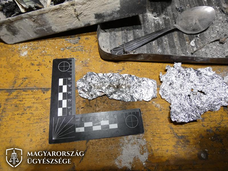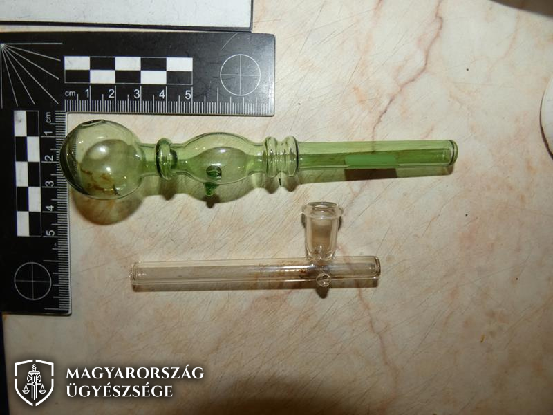 A csatolt, a rendőrség által a helyszíni szemle során készített fényképeken a nőtől lefoglalt, az új pszichoaktív anyag fogyasztásához használt pipa és az alufóliába csomagolt anyag látható.